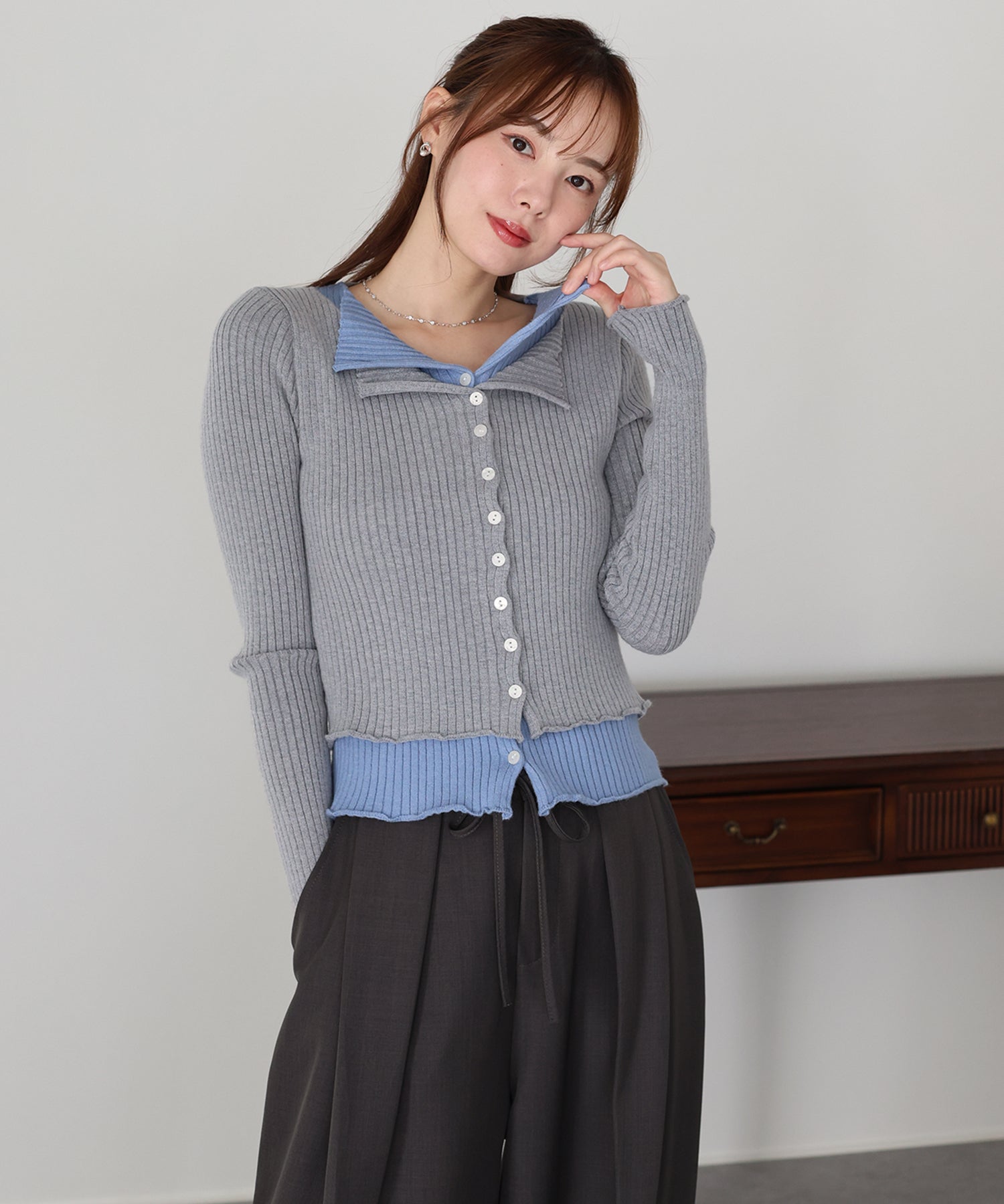 トレンドライクな配色レイヤード風のニットトップス ?POINT 色違いのニットをレイヤードしたようなデザインがトレンドライクなニットトップス。 ネックと裾から見えるバイカラーのニットで、いつものボトムスに合わせるだけで旬なコーデに。 身体にフィットするシルエットと伸縮性のあるリブ編みで華奢見せ効果も期待できます。 開閉可能のボタンが大人カジュアルなポイントをプラス。 デイリーに着まわしやすいロングシーズン大活躍するオススメのアイテムです。
