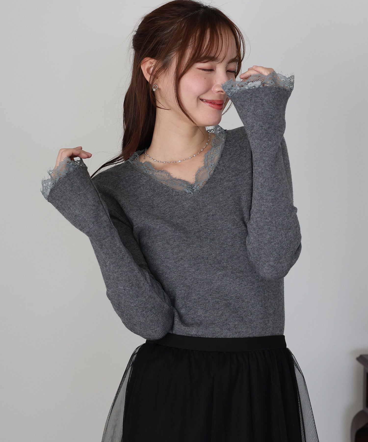 トレンドライクなレースドッキングがフェミニンなニットトップス