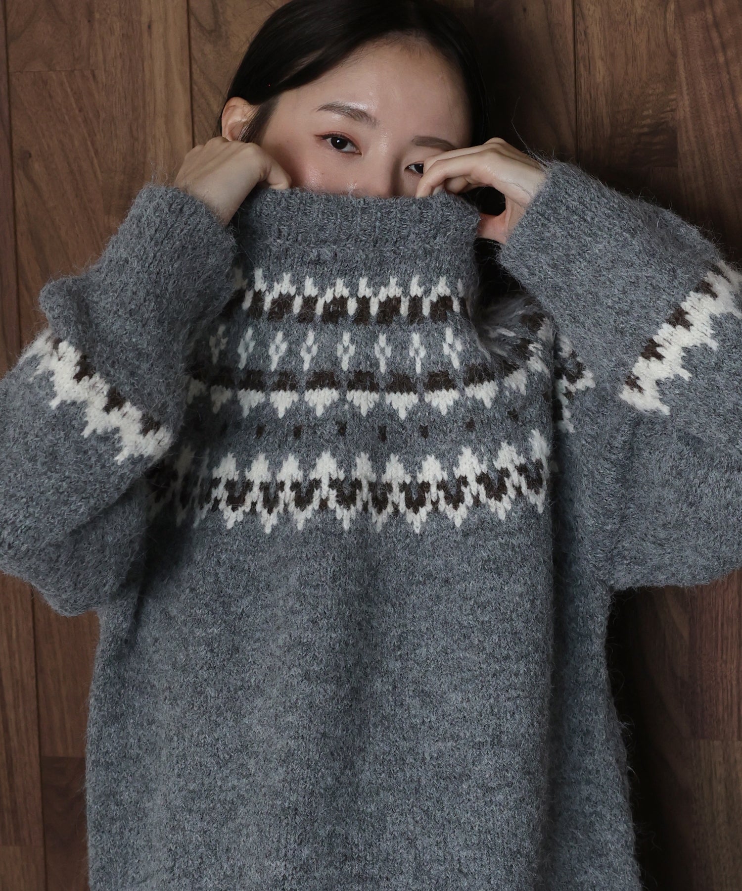 顔周りを明るく見せてくれるグレーベースに、赤やブラウンを効かせた編み込み柄がコーデの主役に。