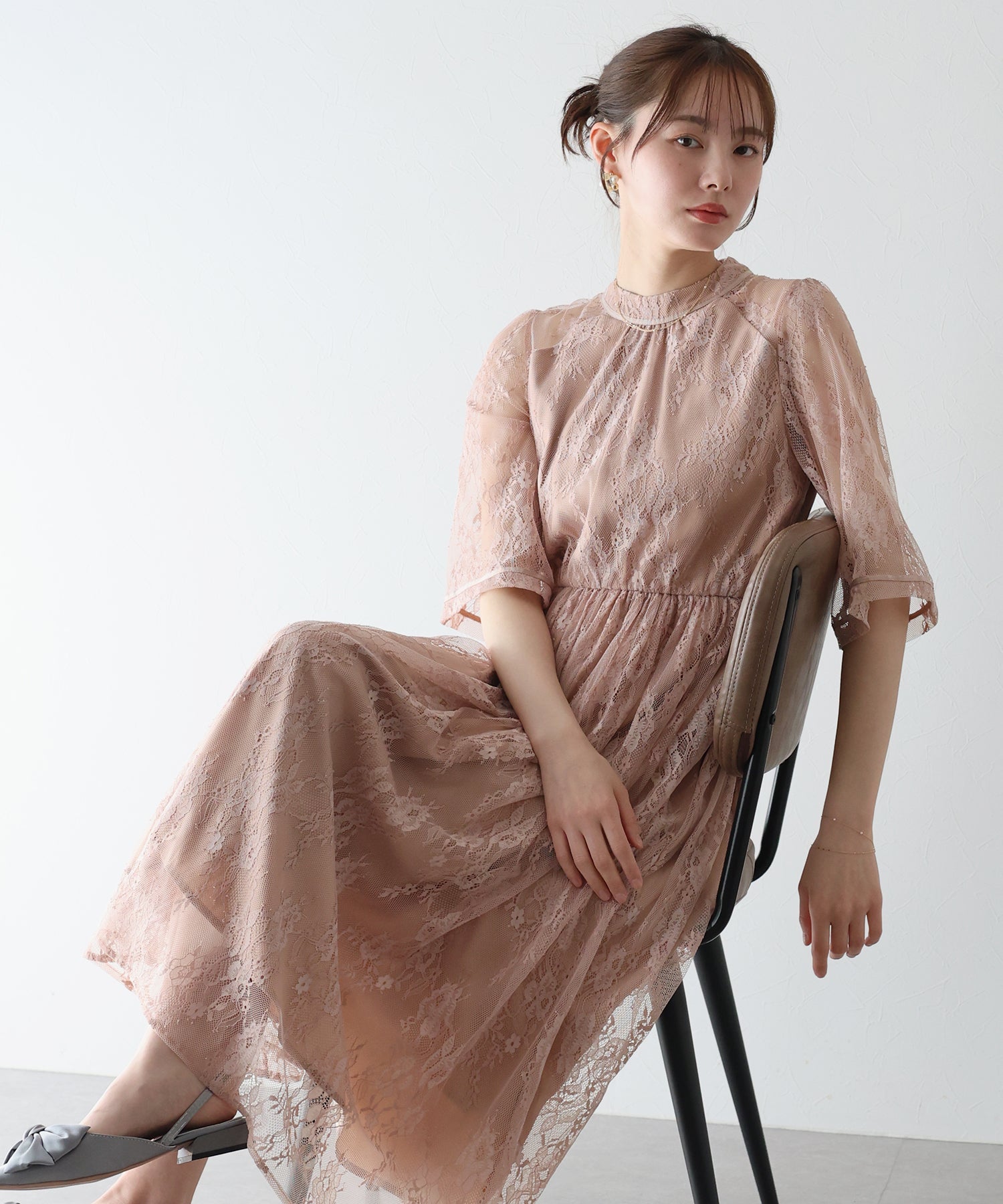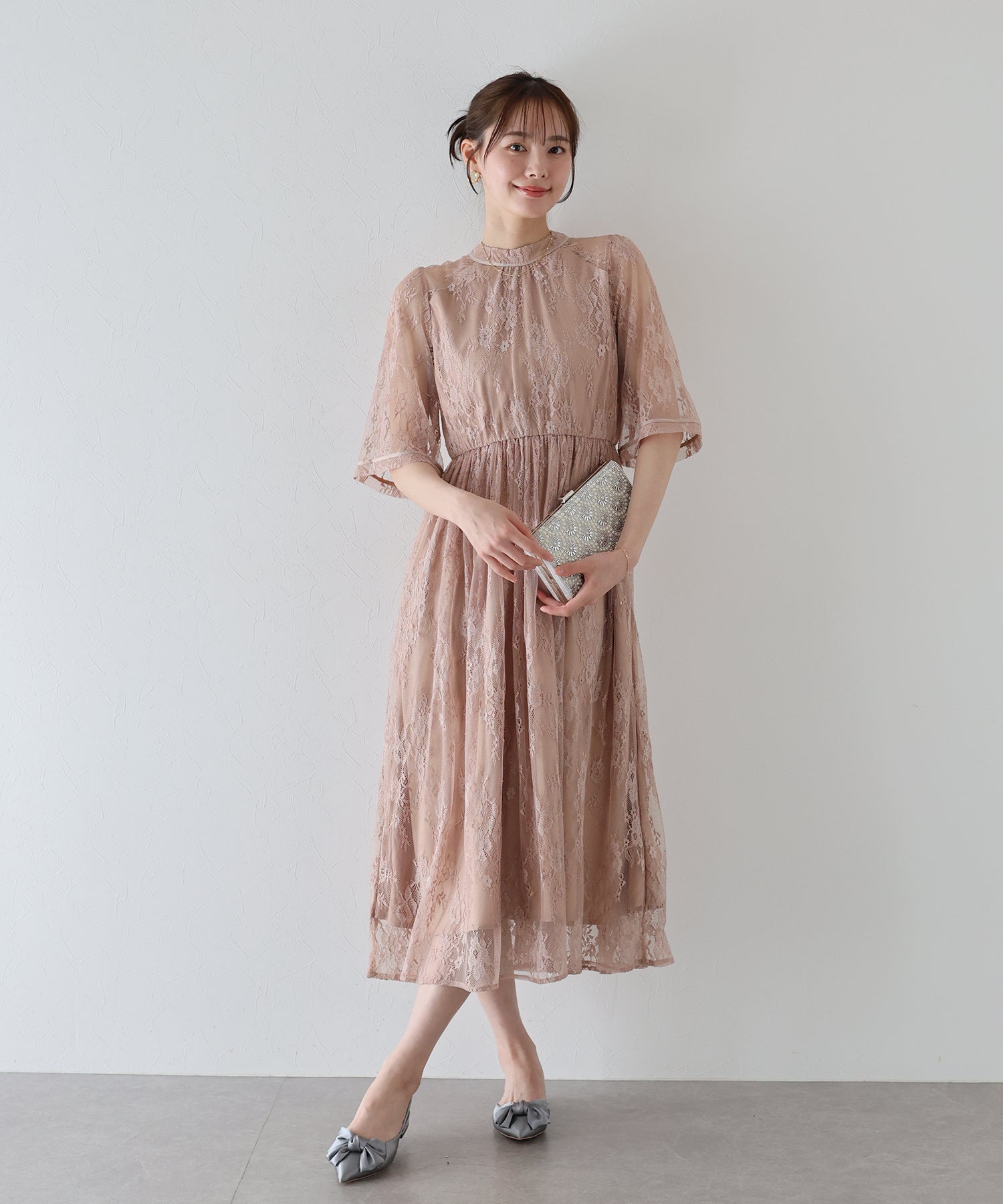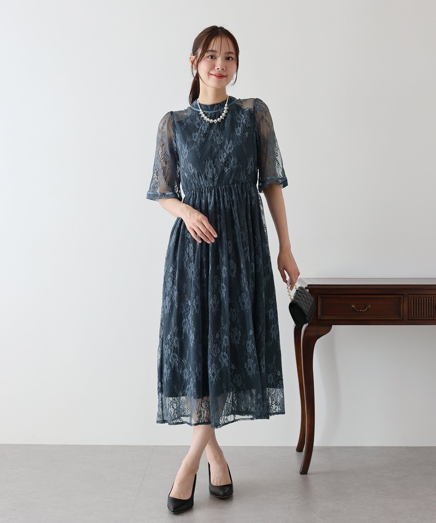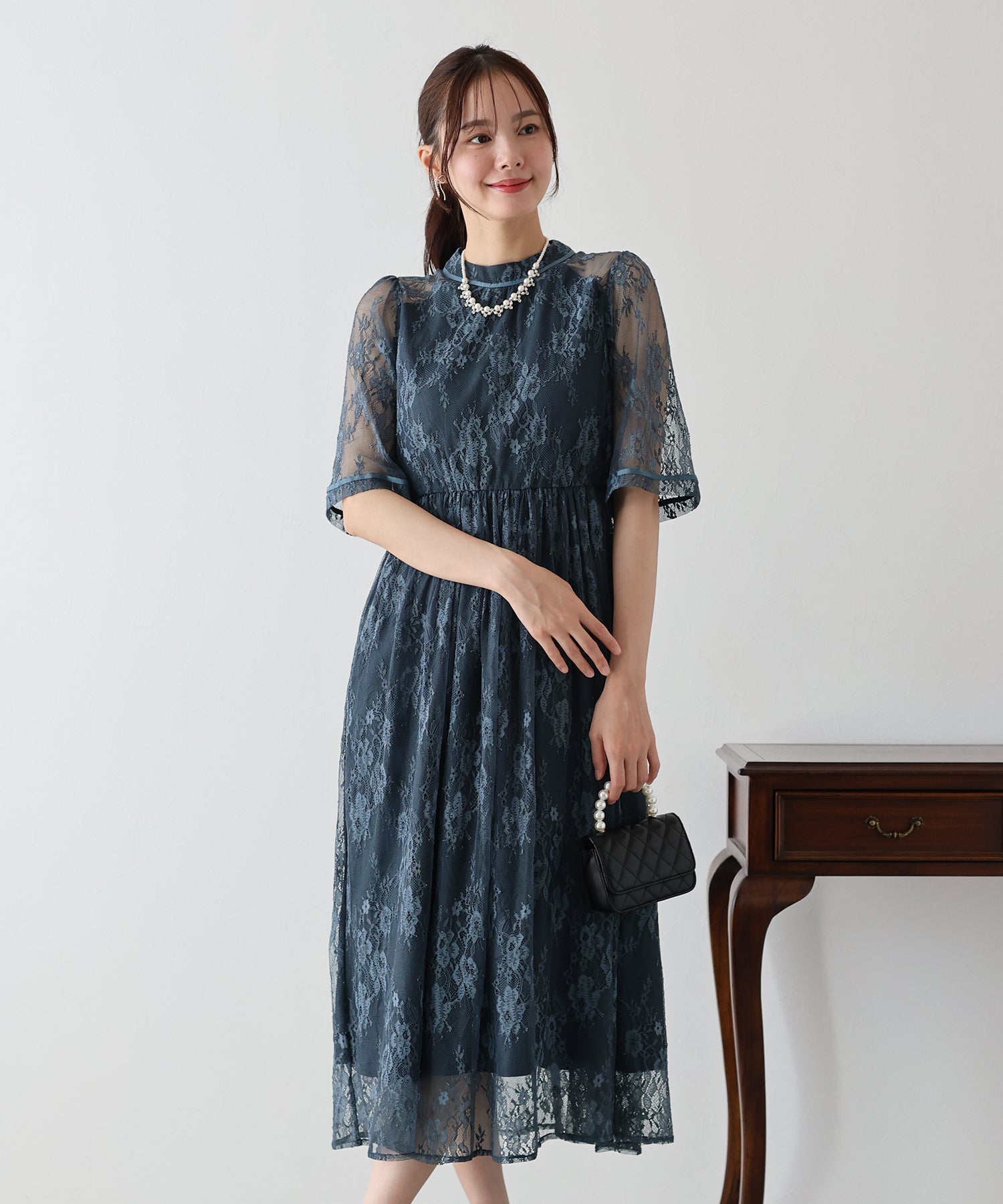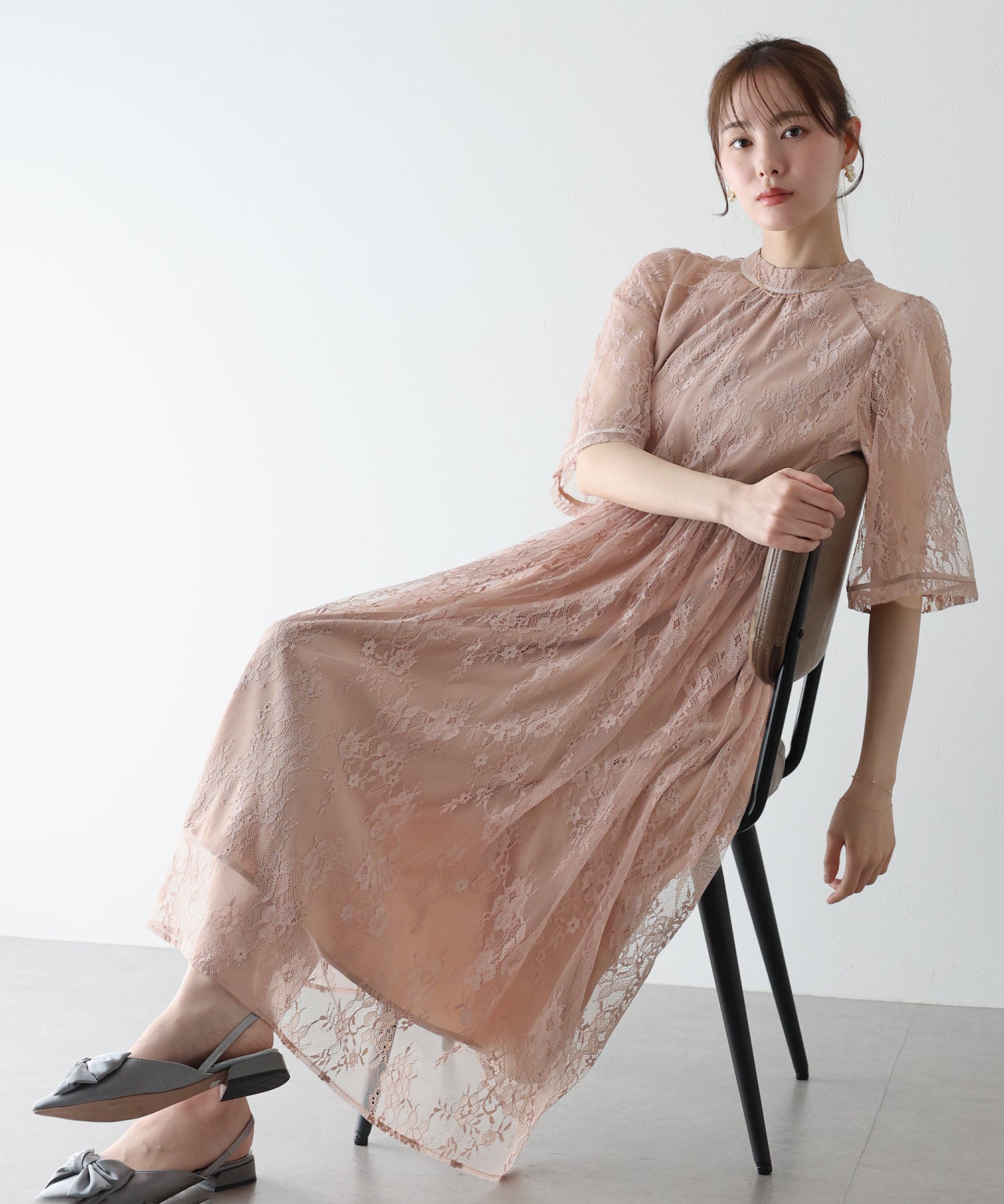 繊細な配色レースを使用し、総レースなのに甘すぎないハイネックデザインのパーティーワンピース?結婚式ワンピース