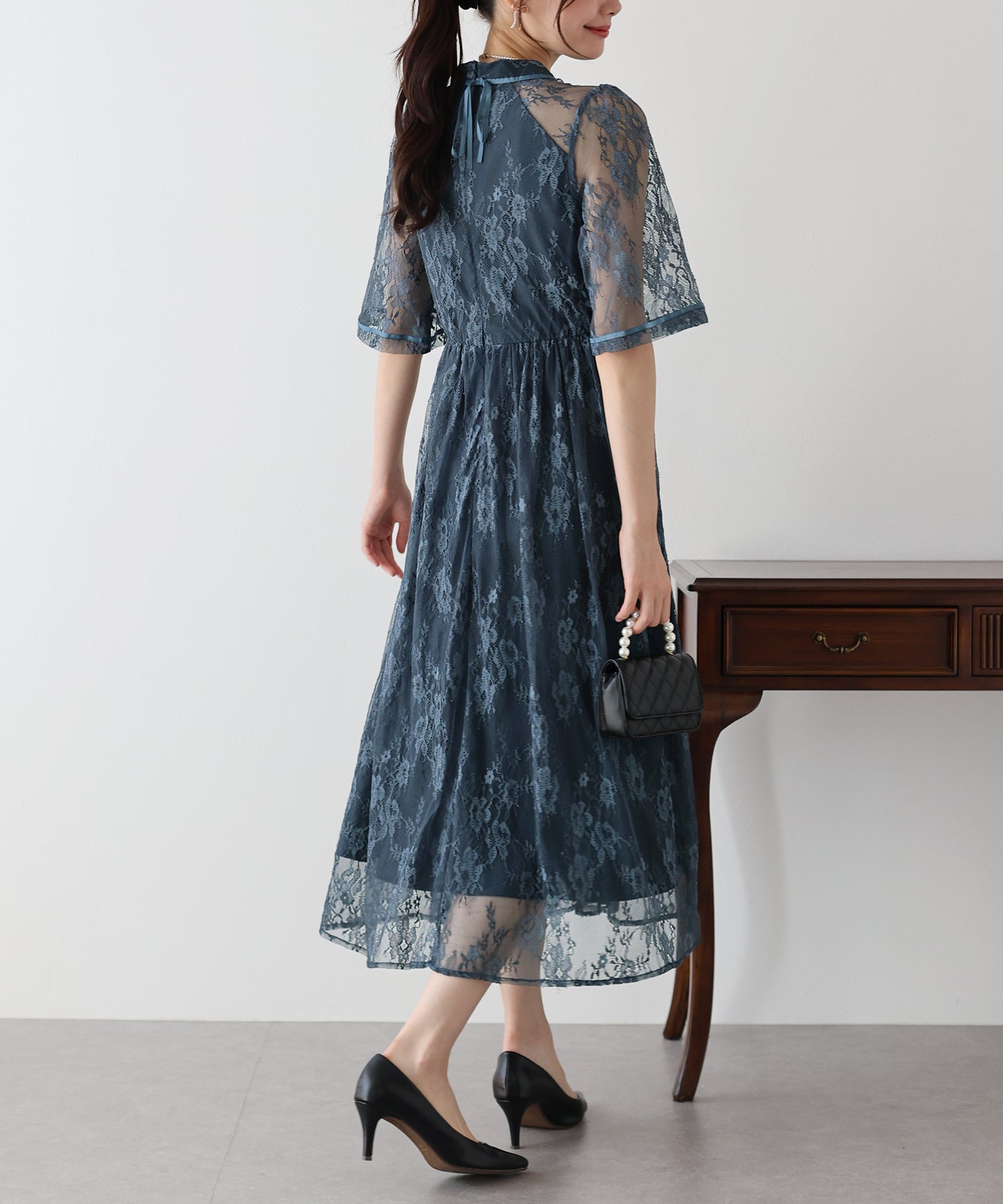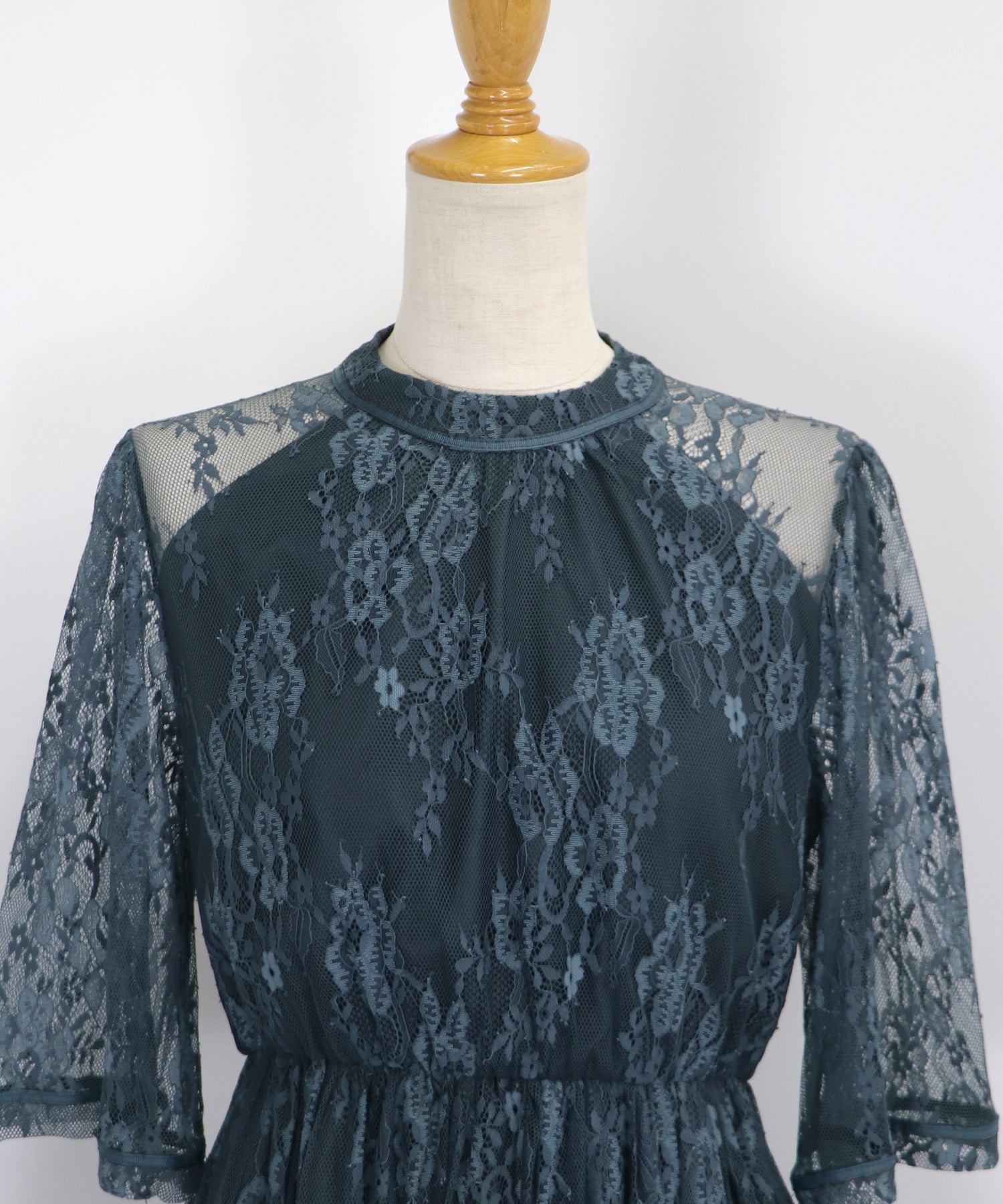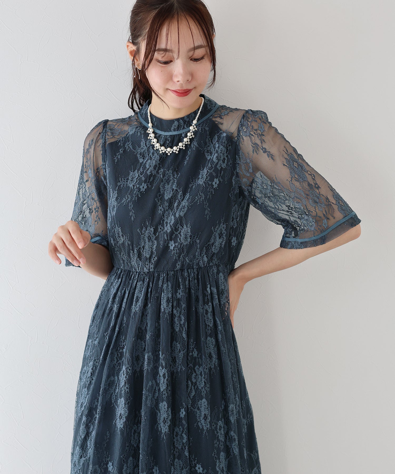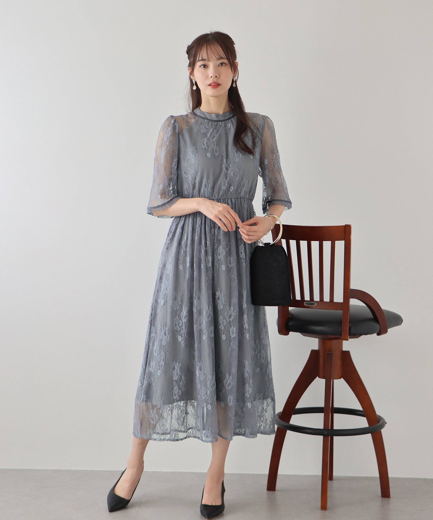 繊細な配色レースを使用し、総レースなのに甘すぎないハイネックデザインのパーティーワンピース?結婚式ワンピース