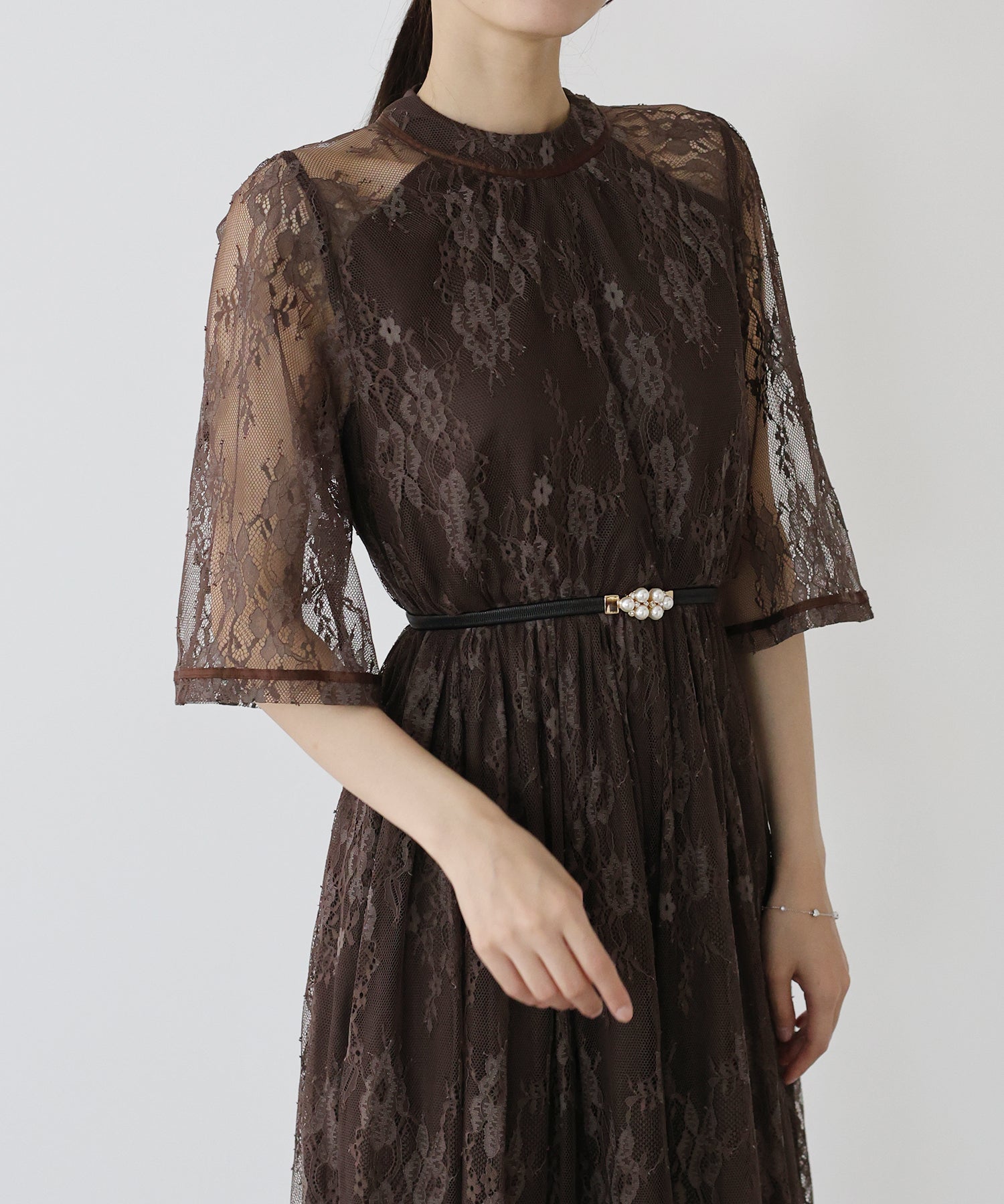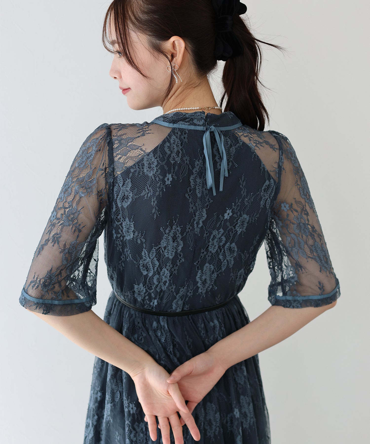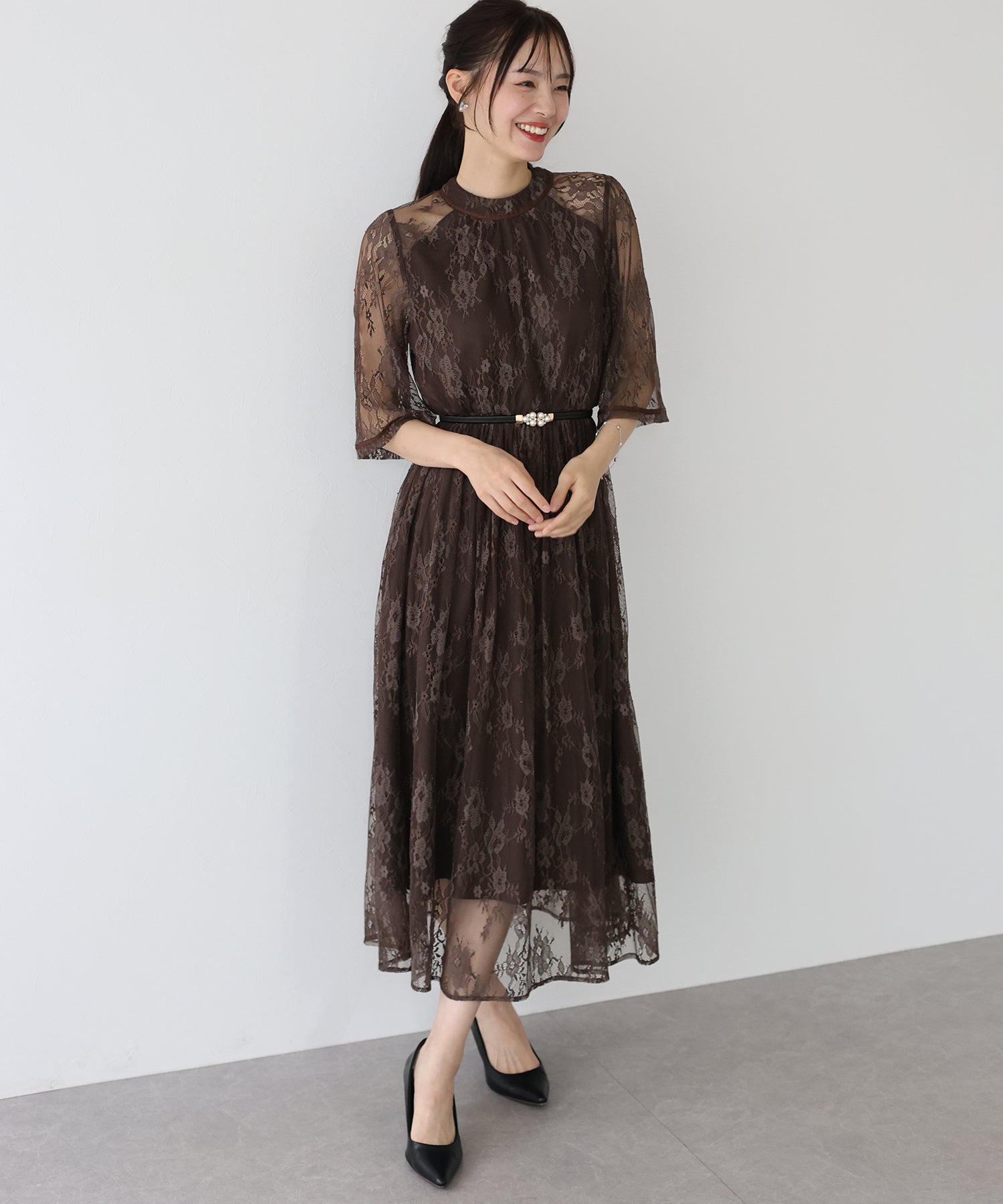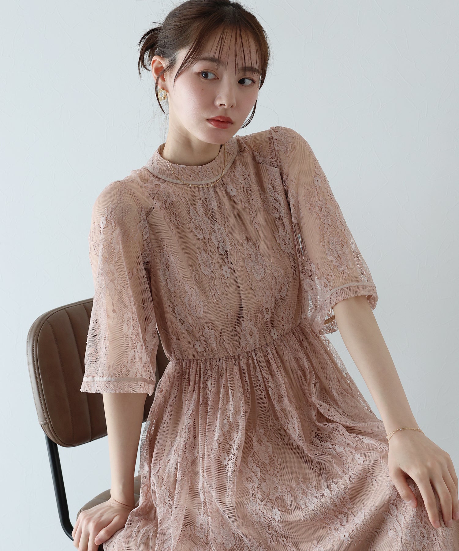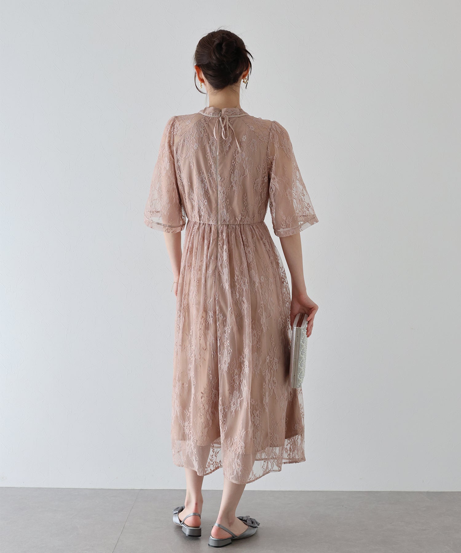 繊細な配色レースを使用し、総レースなのに甘すぎないハイネックデザインのパーティーワンピース?結婚式ワンピース
