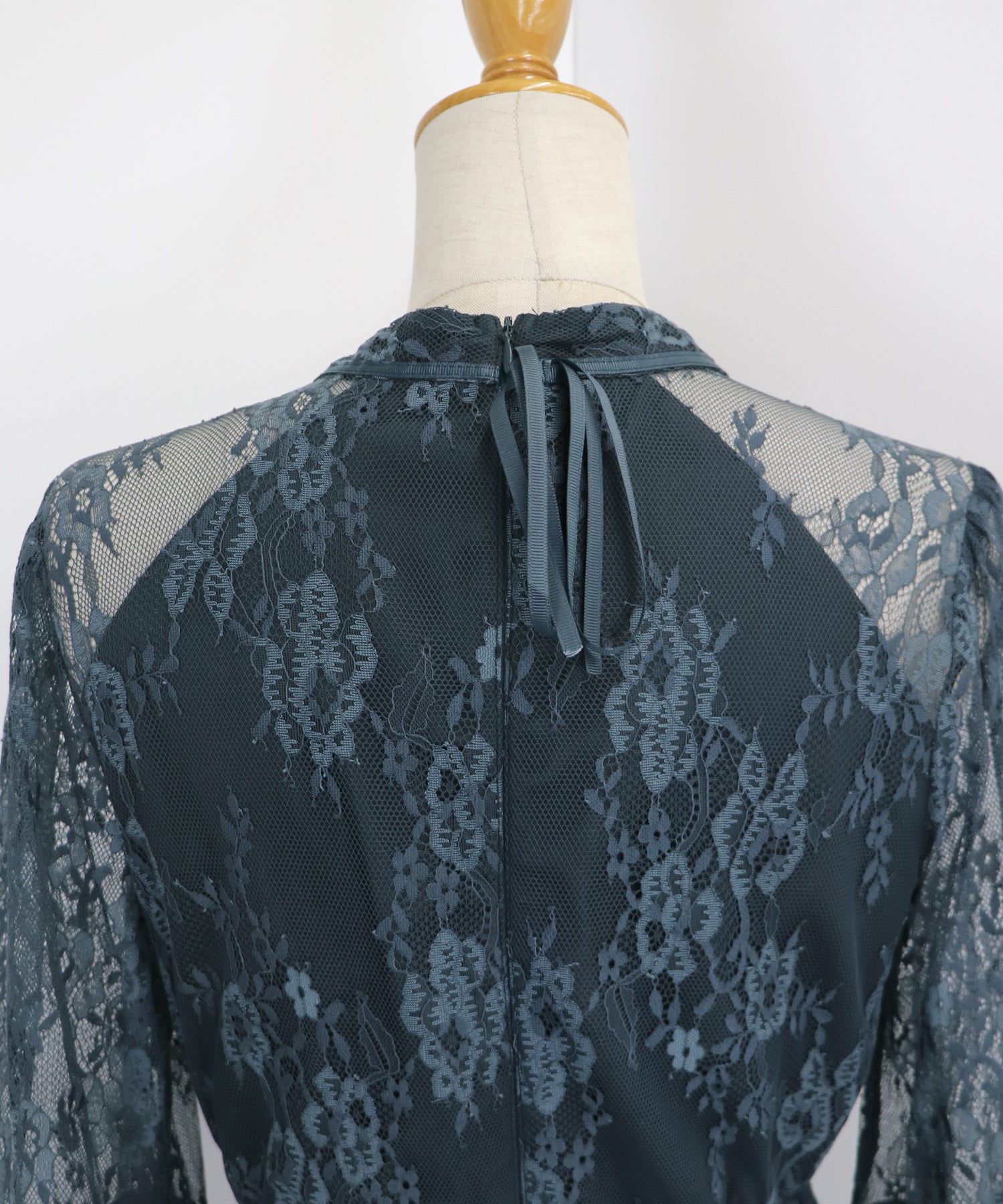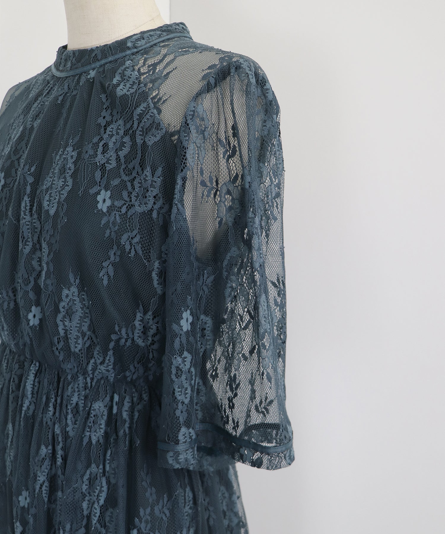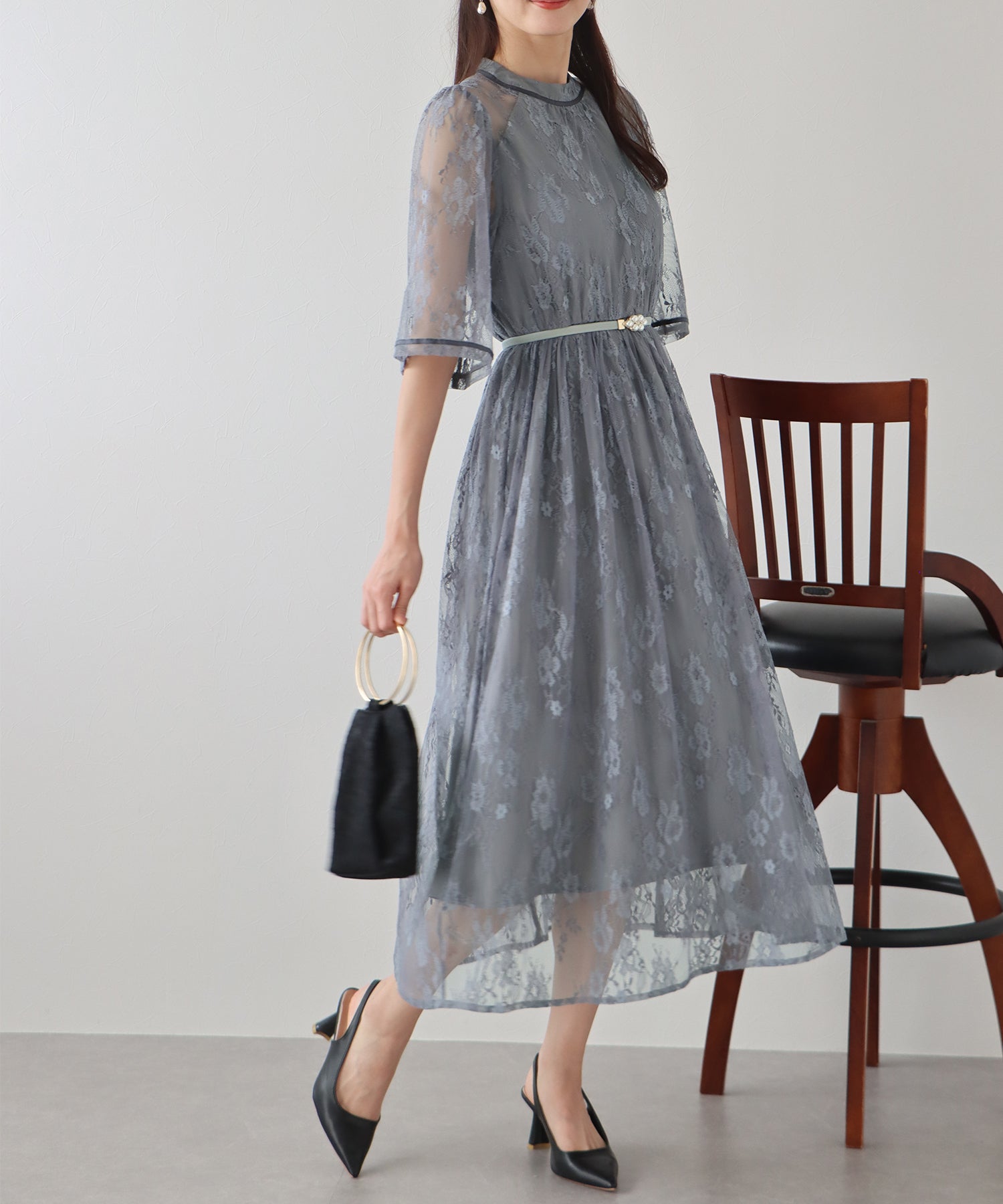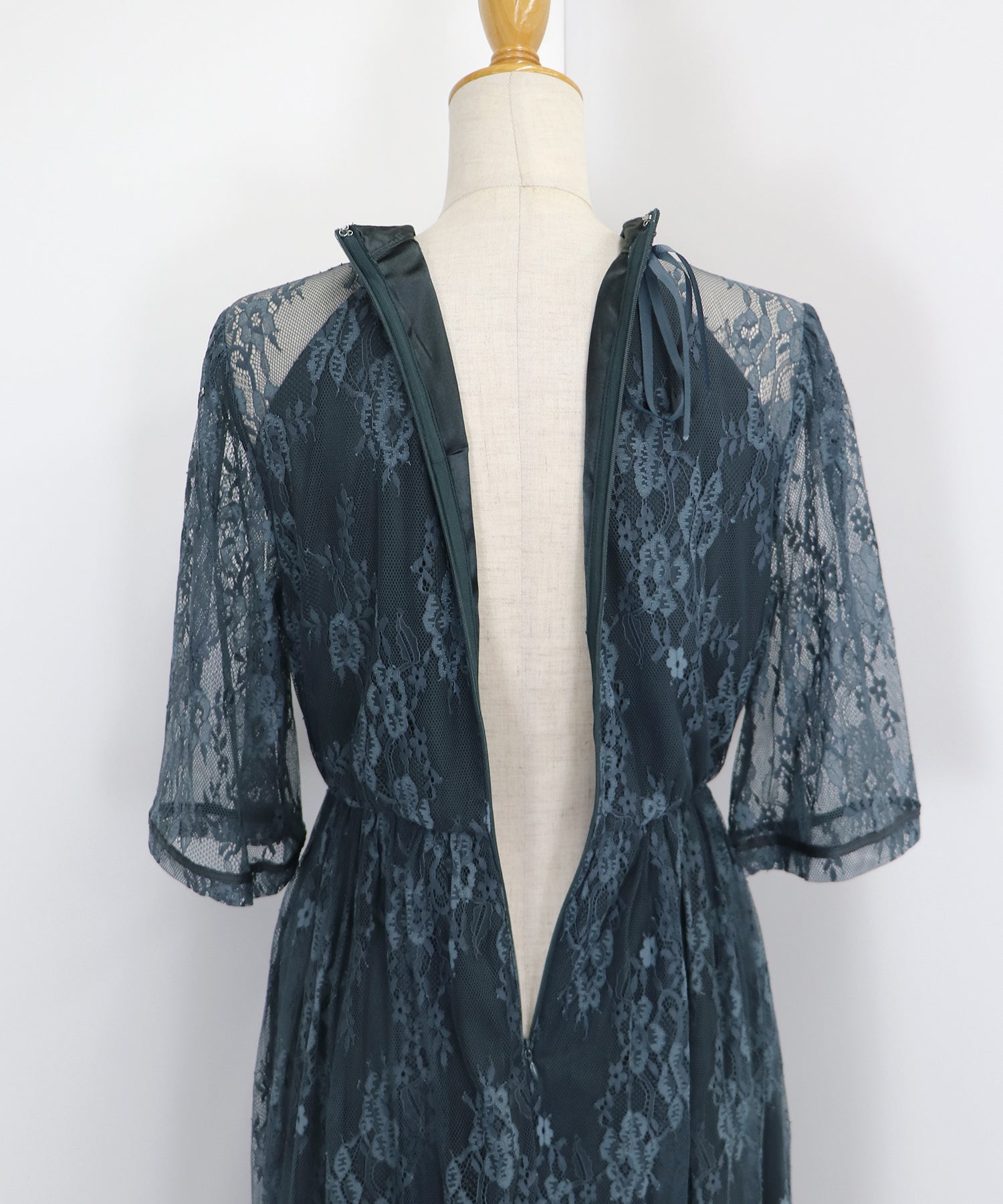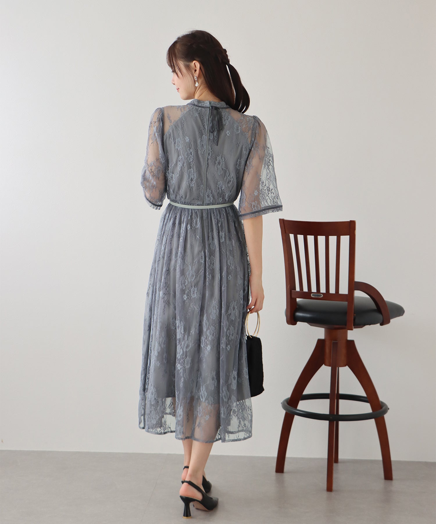 繊細な配色レースを使用し、総レースなのに甘すぎないハイネックデザインのパーティーワンピース?結婚式ワンピース