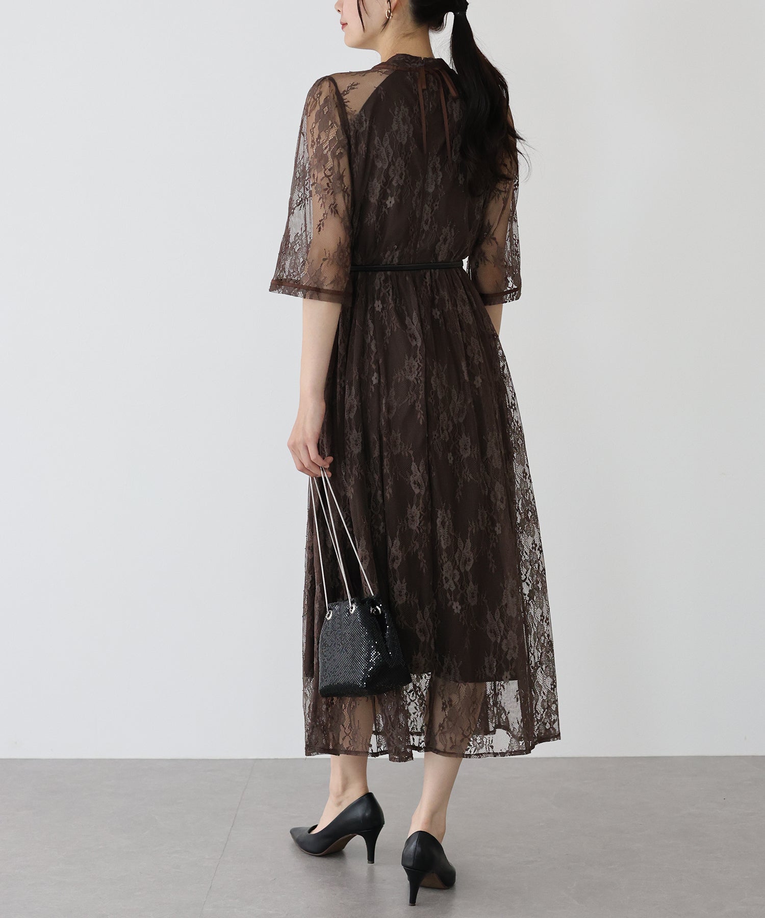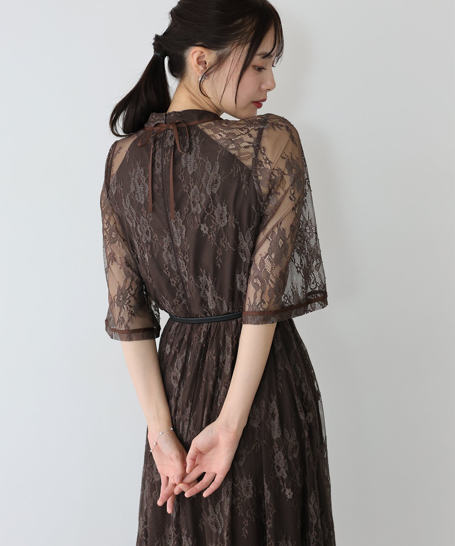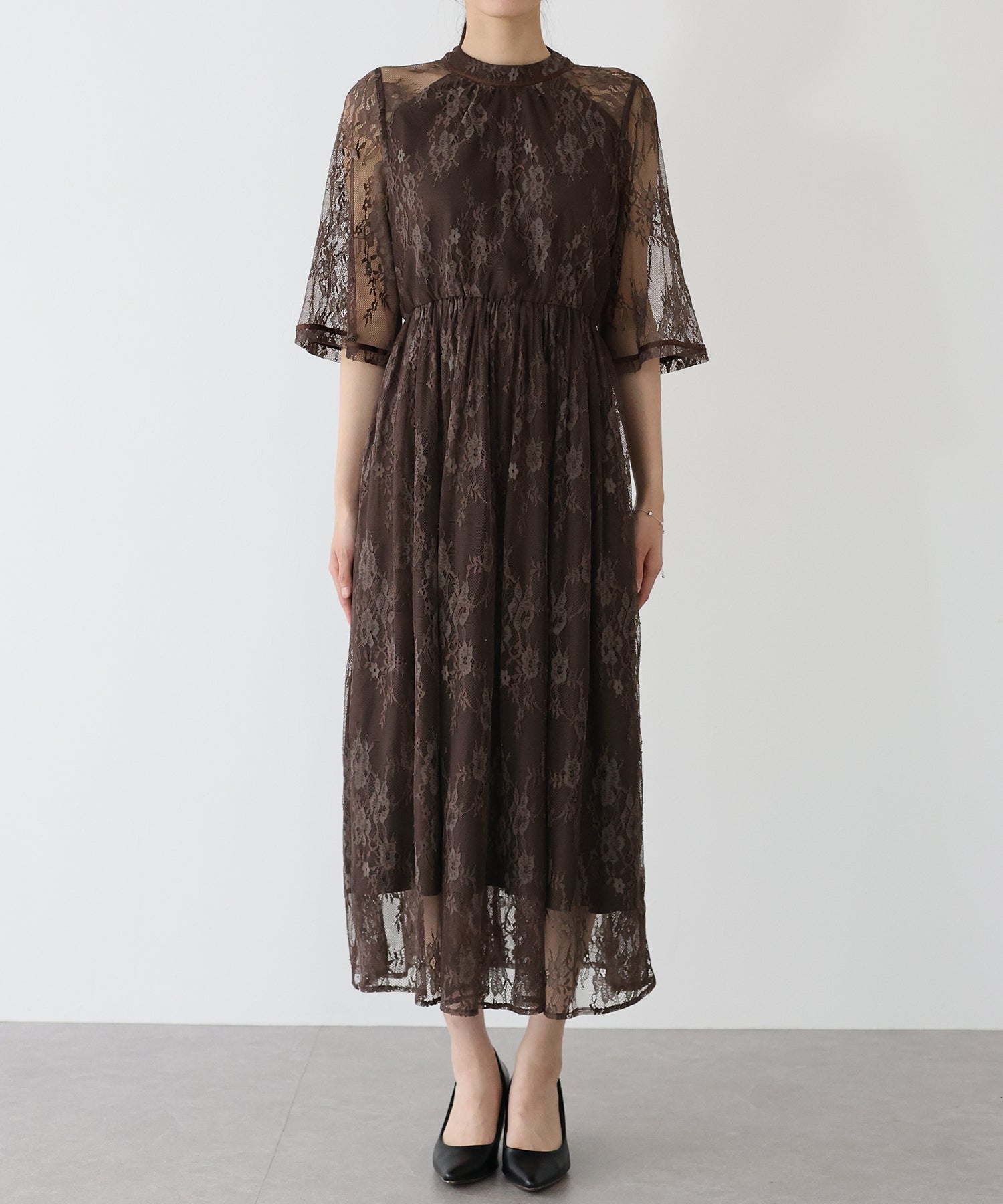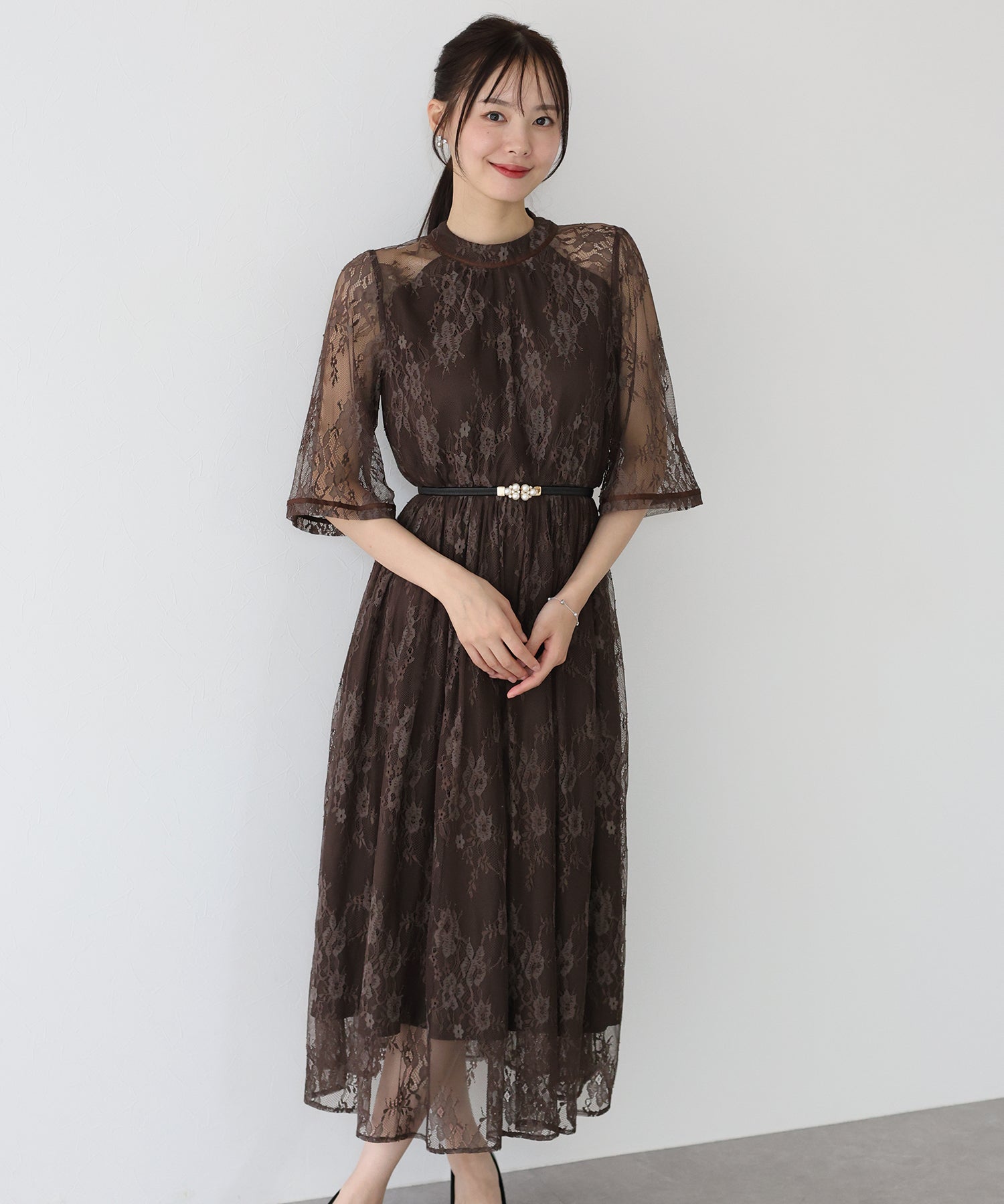 繊細な配色レースを使用し、総レースなのに甘すぎないハイネックデザインのパーティーワンピース?結婚式ワンピース