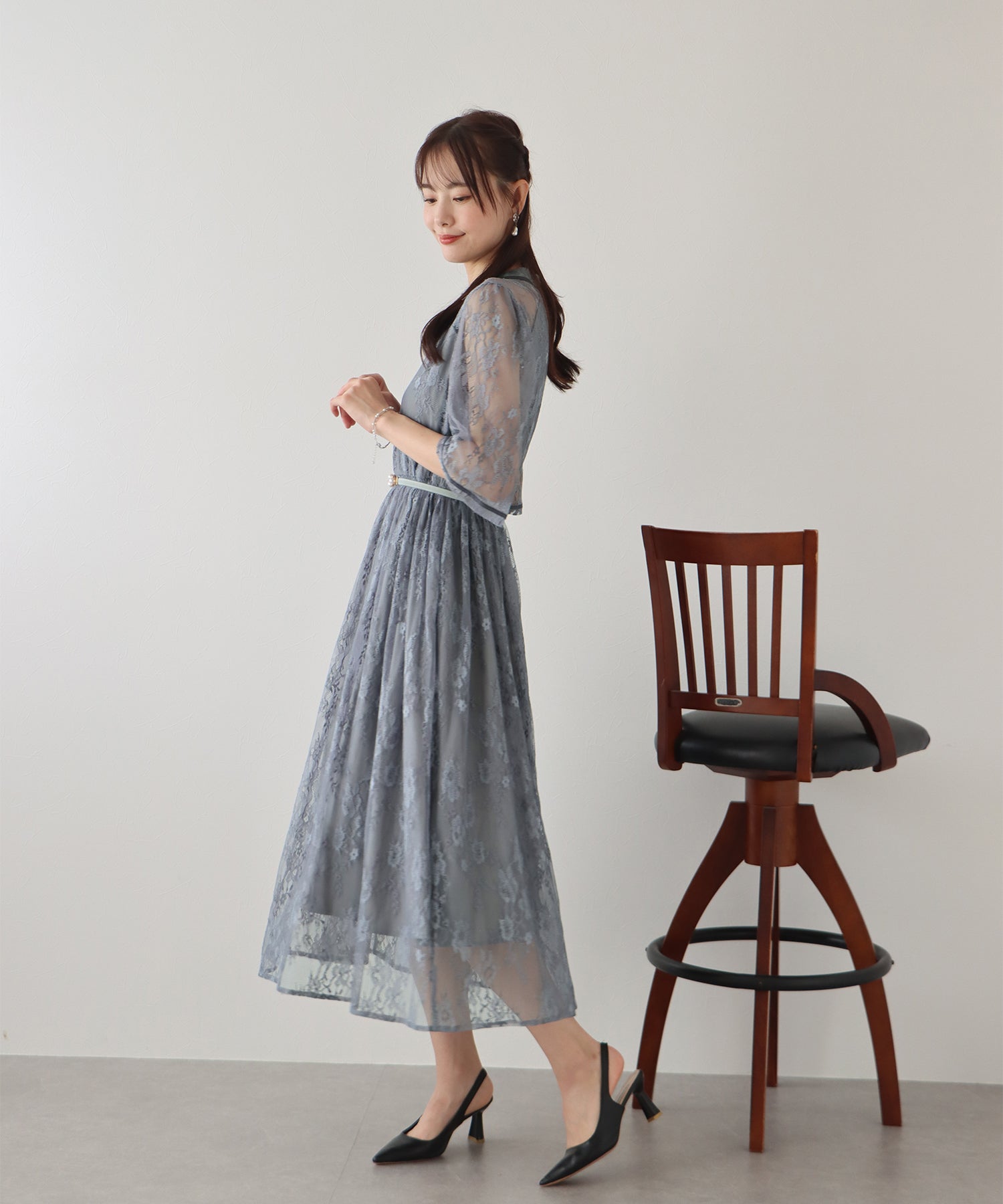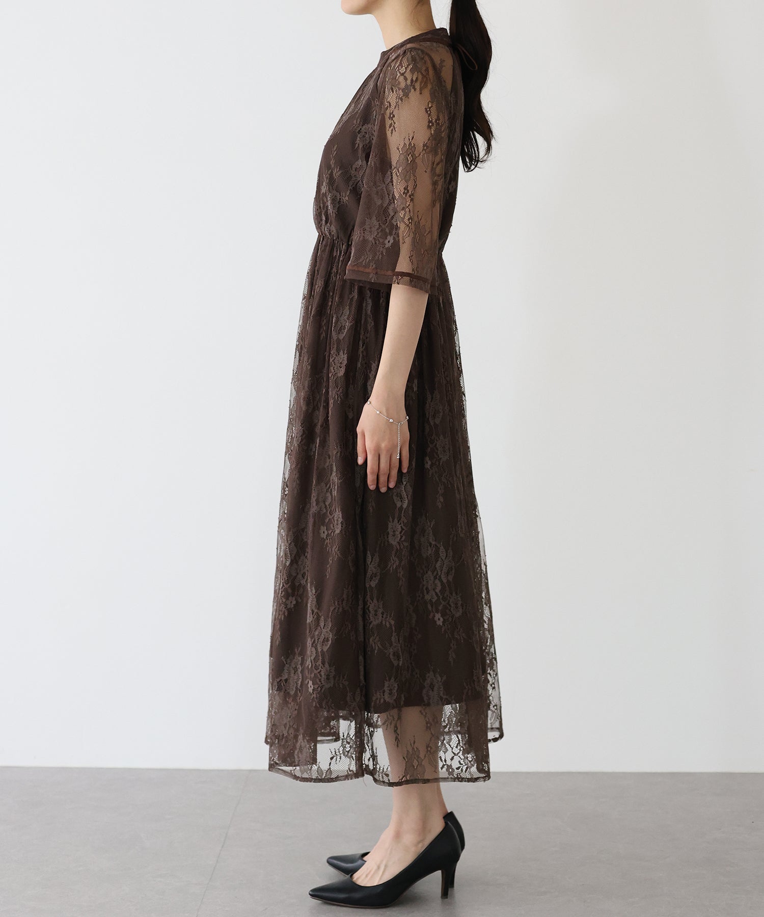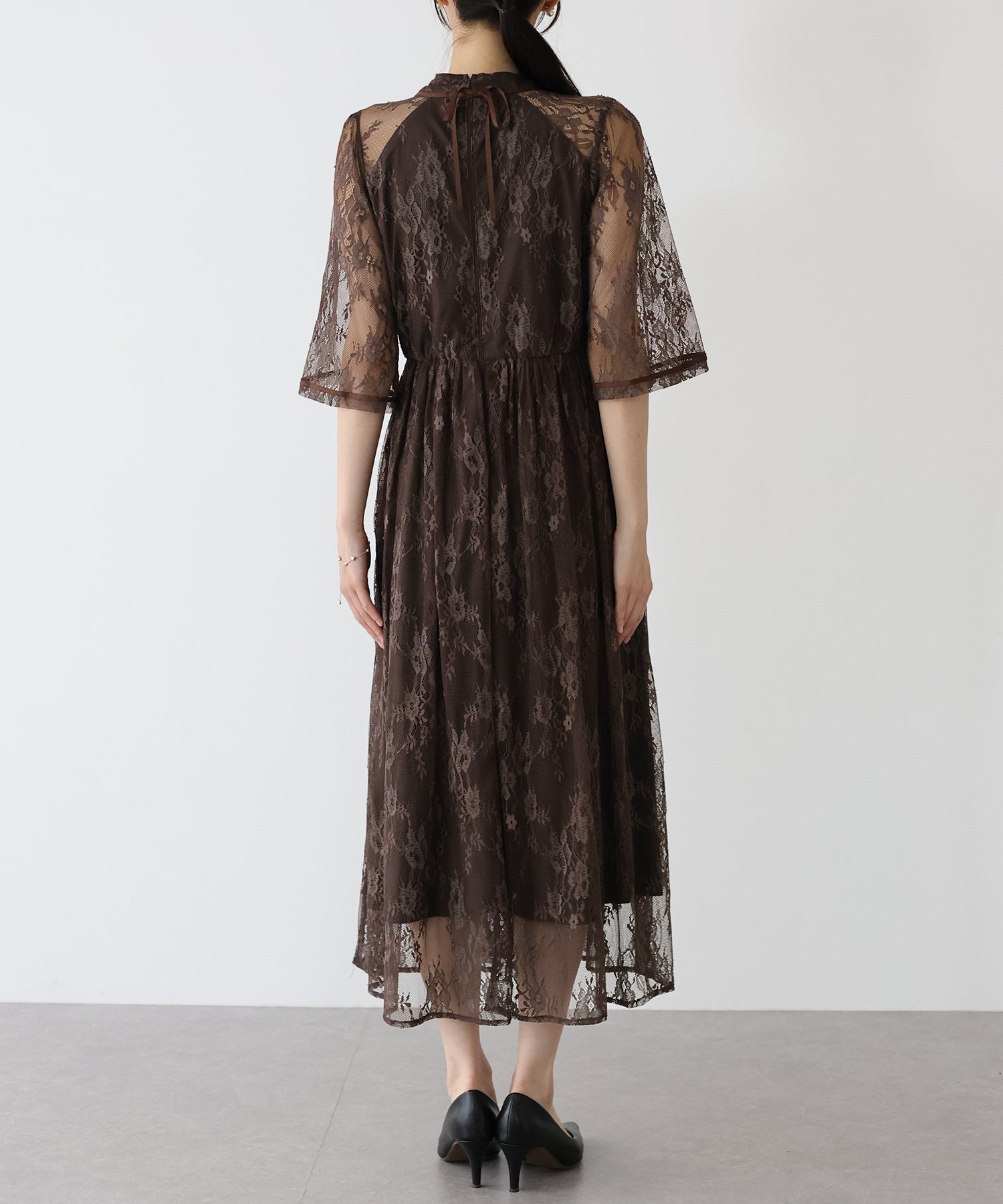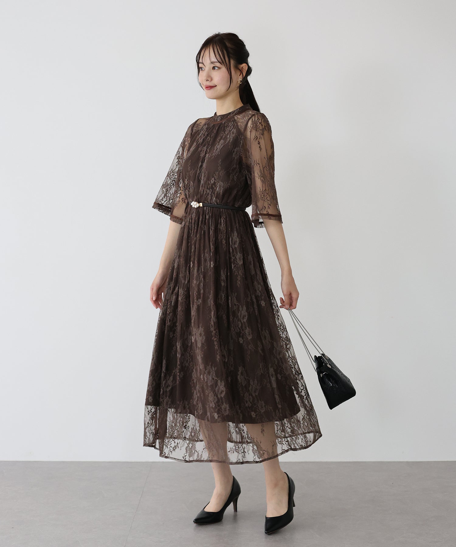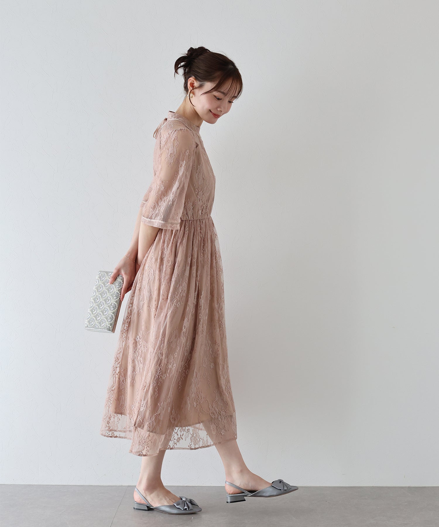 繊細な配色レースを使用し、総レースなのに甘すぎないハイネックデザインのパーティーワンピース?結婚式ワンピース
