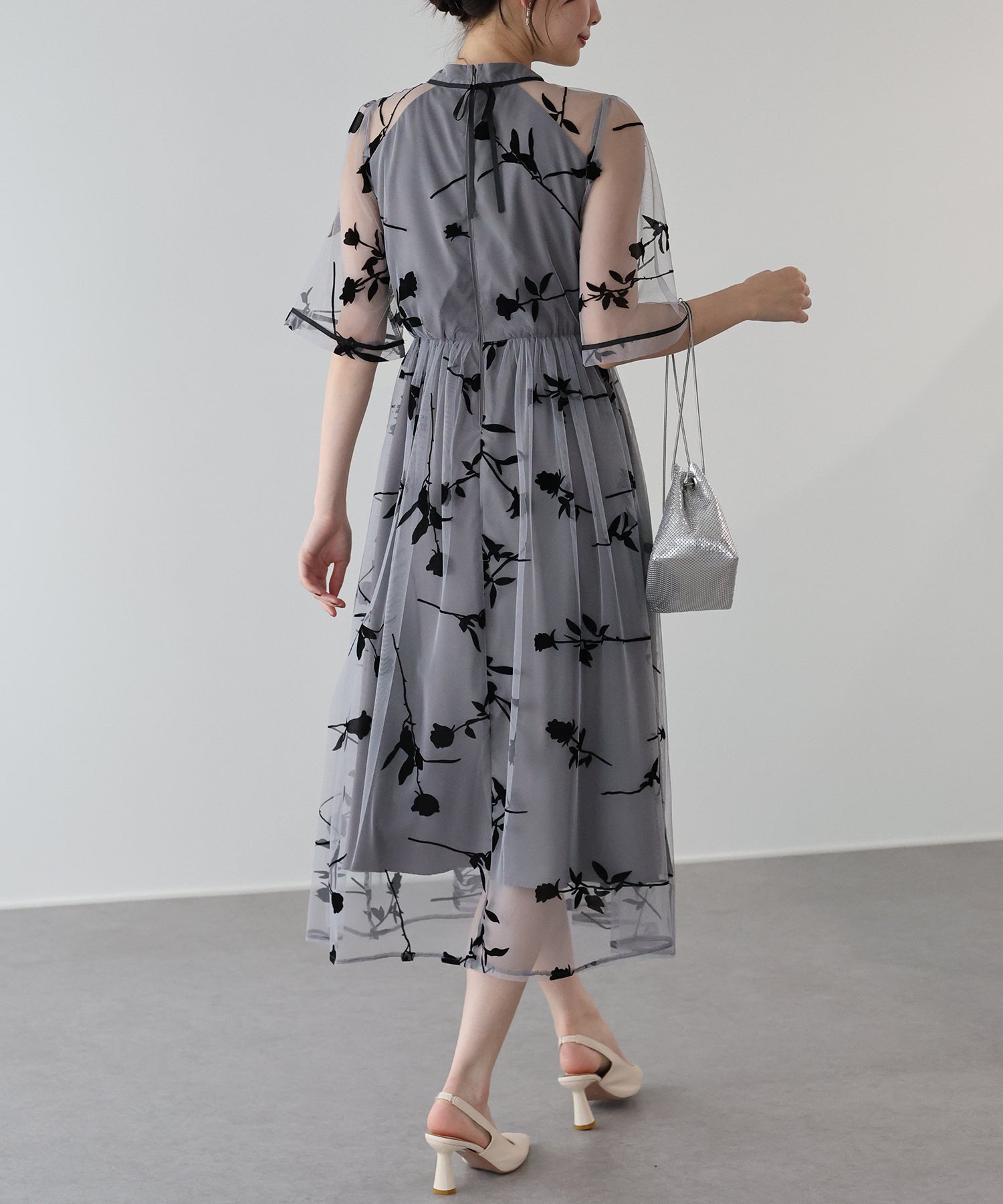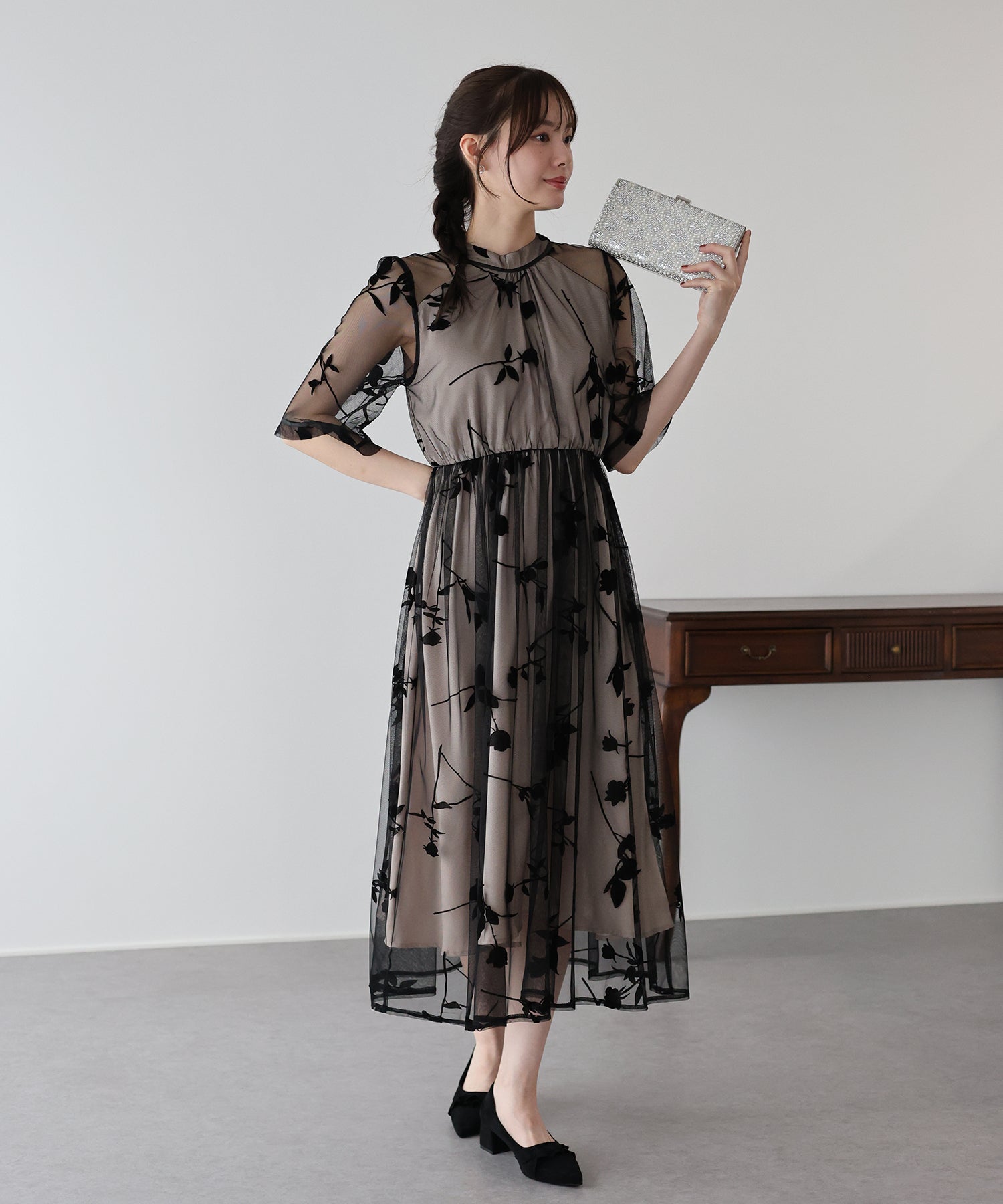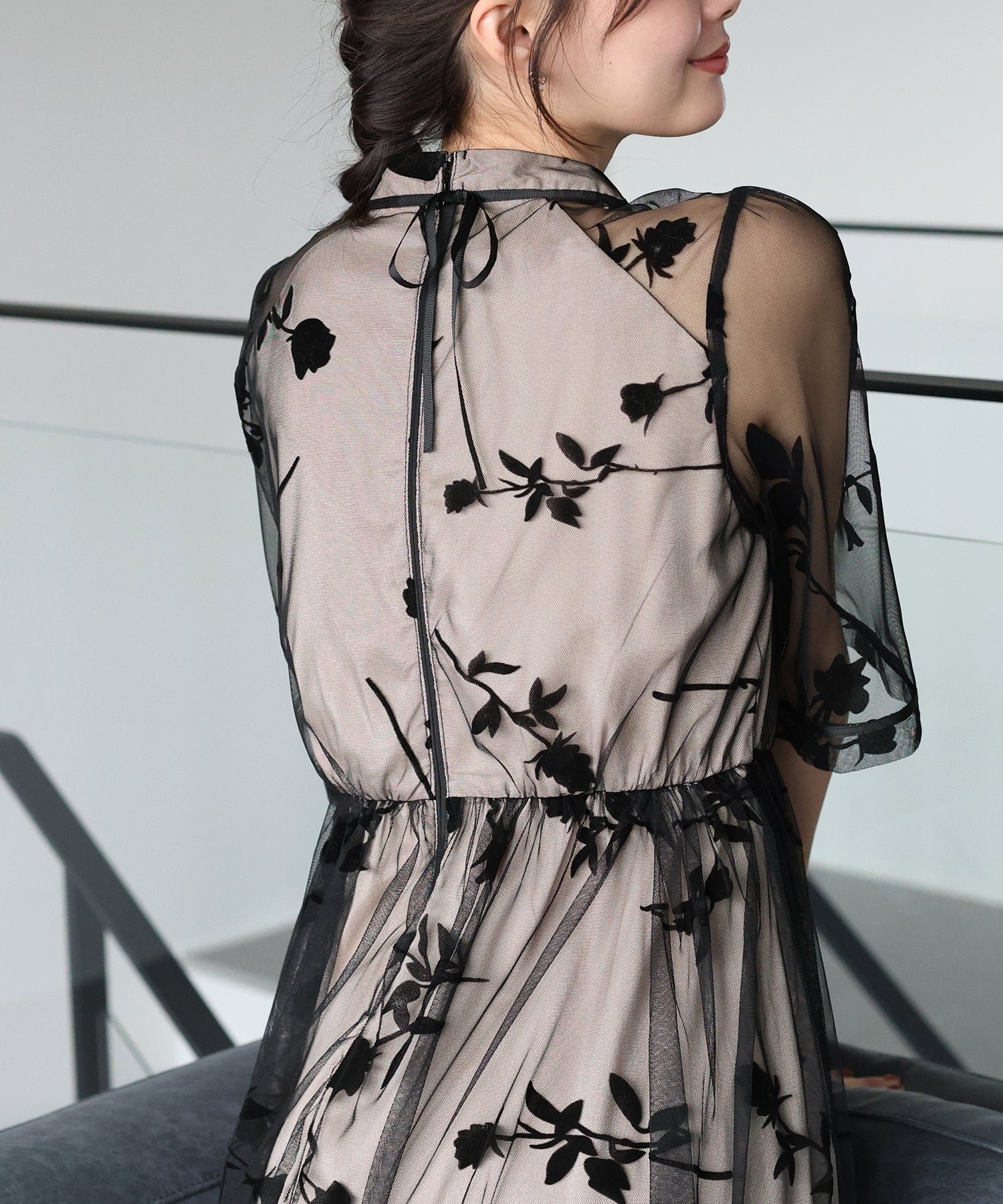 シアーな透け感は保ちつつ、あえて首元はハイネックに仕上げたことで上品でクラシカルな雰囲気。