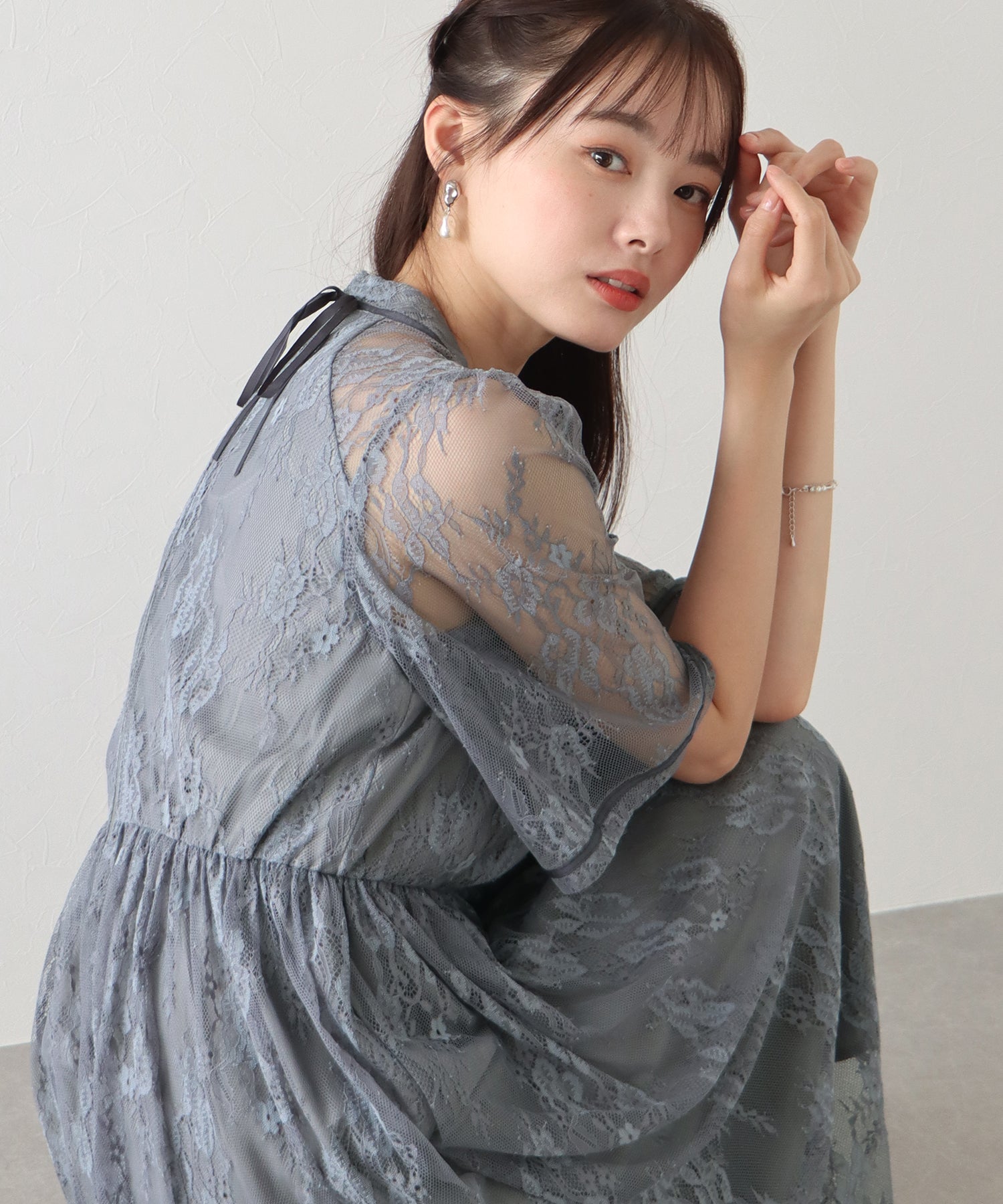 ネック後ろ部分にはリボンテープがアップスタイルにしたヘアスタイルのポイントに。