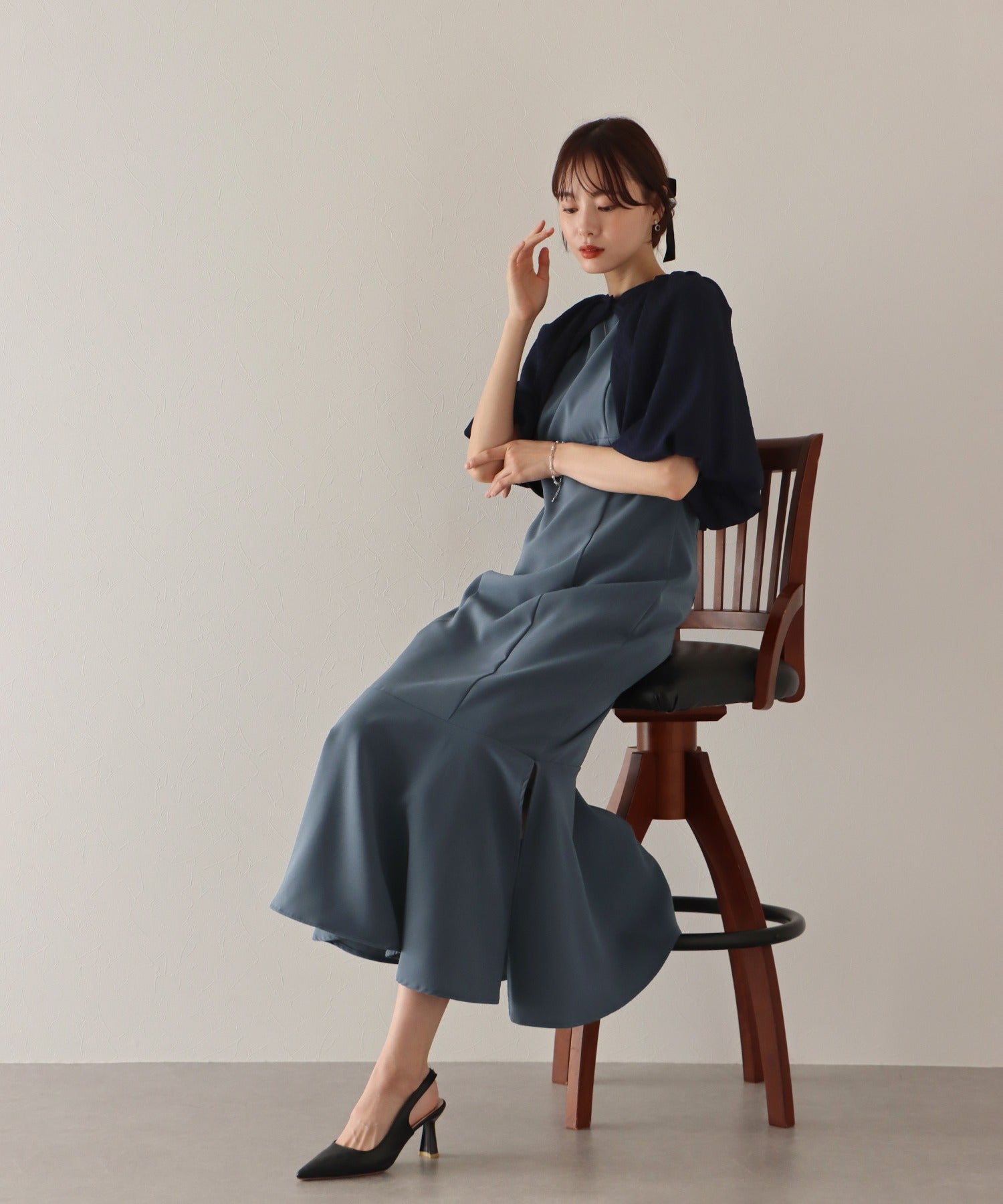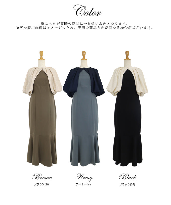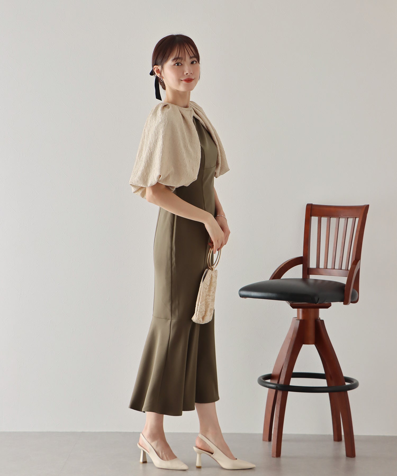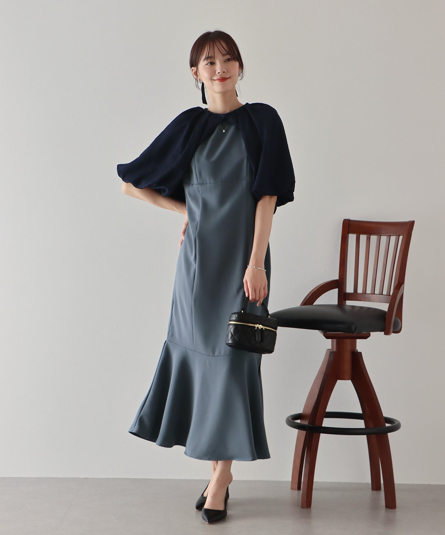 ボレロはたっぷりギャザーのボリューム感が美しいバルーンシルエットでふんわりと仕上げました。 カーディガンのように袖を通して羽織り、フロントボタンで留めることでずり落ちることを気にせず着用していただけます。 ワンピースはタイトすぎないマーメイドシルエットなので着るだけで女性らしい印象を与えてくれます。 背中に並べたパールボタンがポイントになり、1枚で着ても上品で華やかな印象に。 セットでの着用はもちろん、セパレート使いでデイリーにもオケージョンにも様々なシーンで活躍するセットアイテムです。