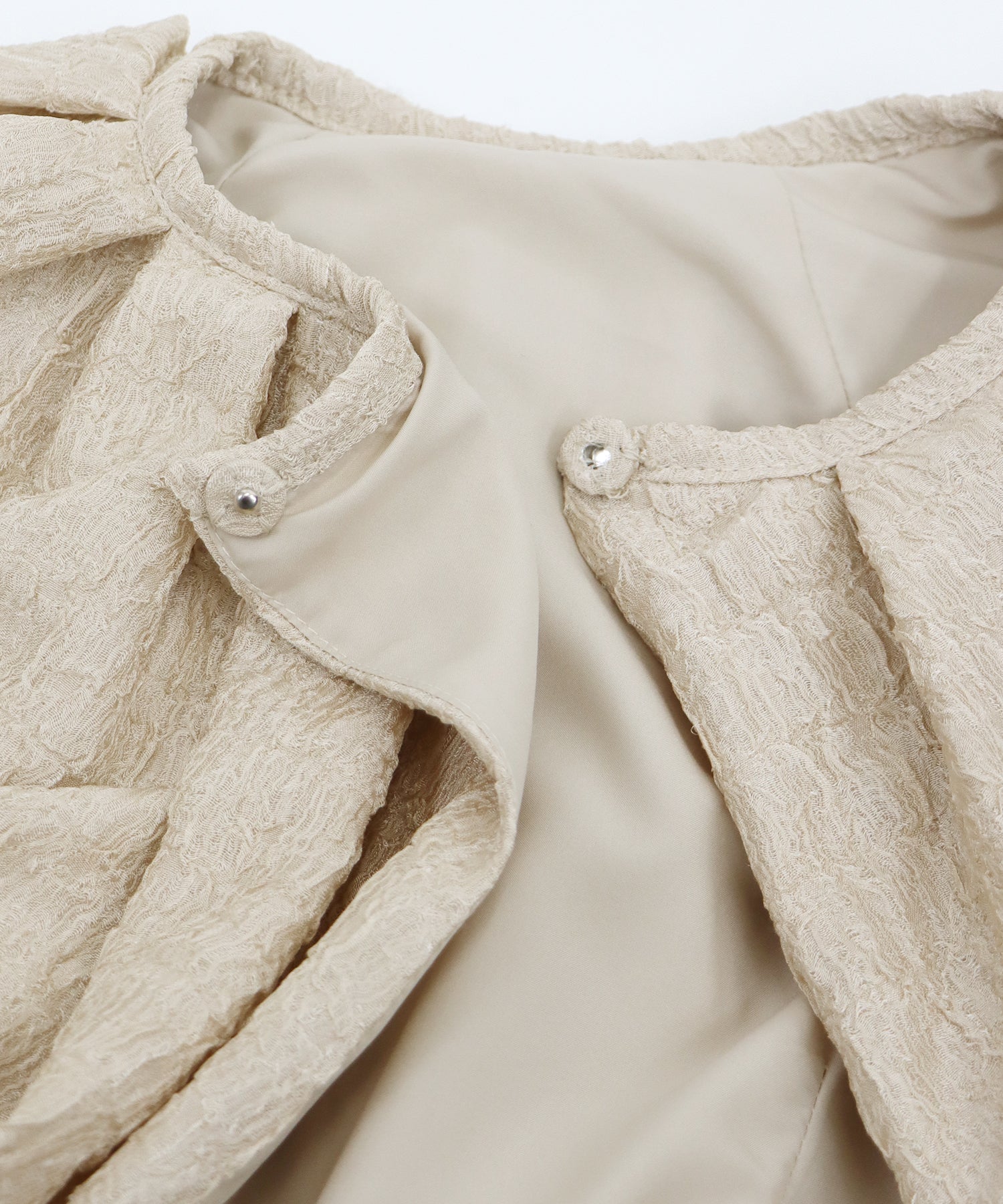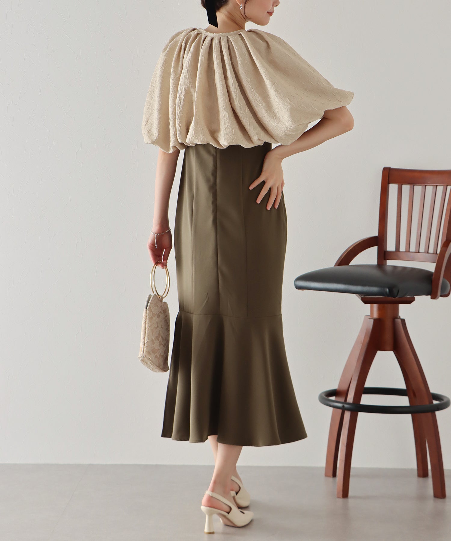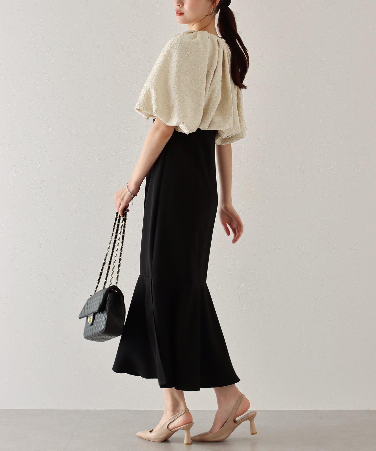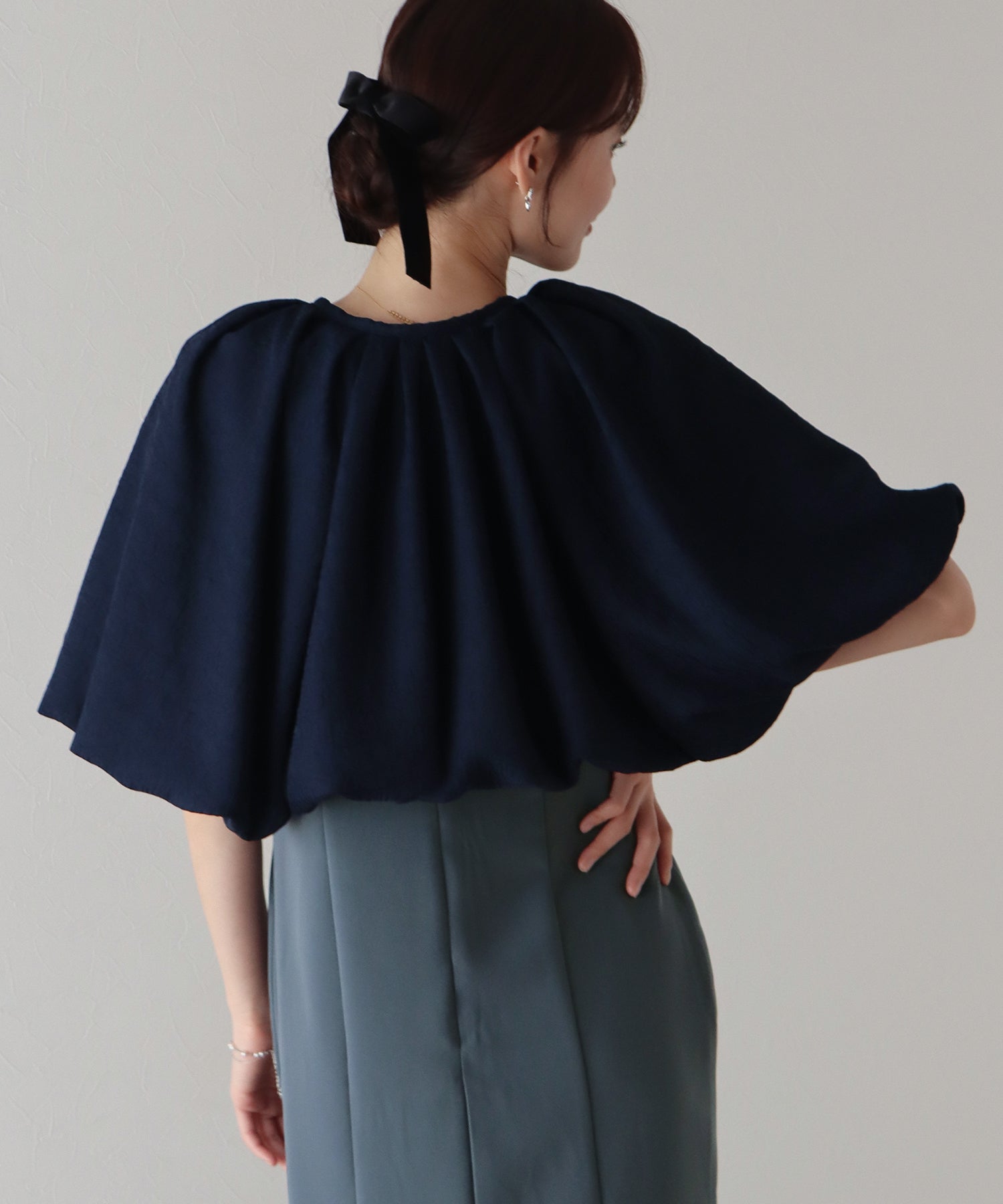 ボレロはたっぷりギャザーのボリューム感が美しいバルーンシルエットでふんわりと仕上げました。 カーディガンのように袖を通して羽織り、フロントボタンで留めることでずり落ちることを気にせず着用していただけます。 ワンピースはタイトすぎないマーメイドシルエットなので着るだけで女性らしい印象を与えてくれます。 背中に並べたパールボタンがポイントになり、1枚で着ても上品で華やかな印象に。 セットでの着用はもちろん、セパレート使いでデイリーにもオケージョンにも様々なシーンで活躍するセットアイテムです。