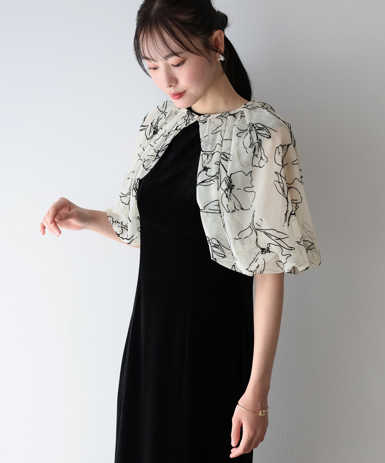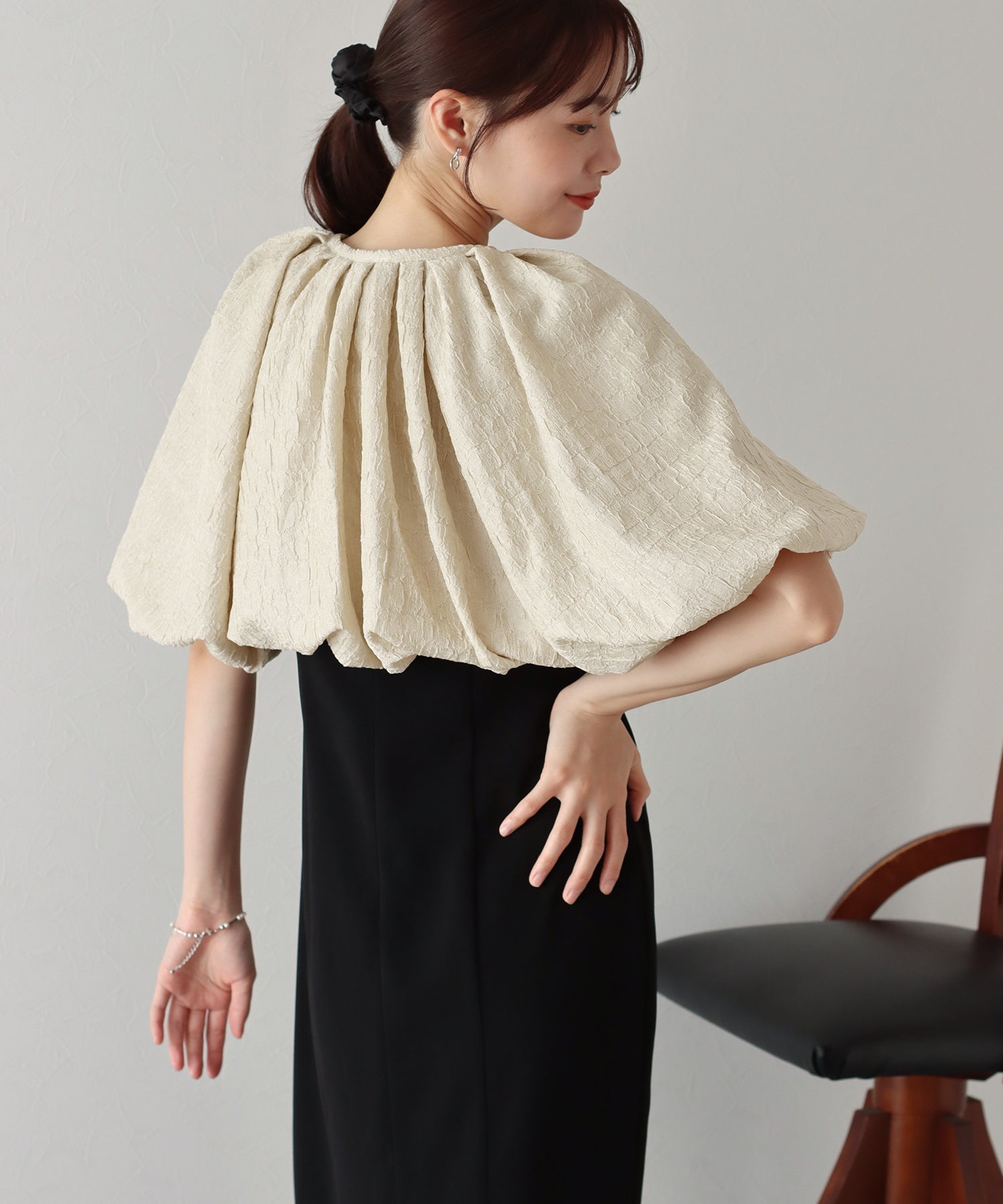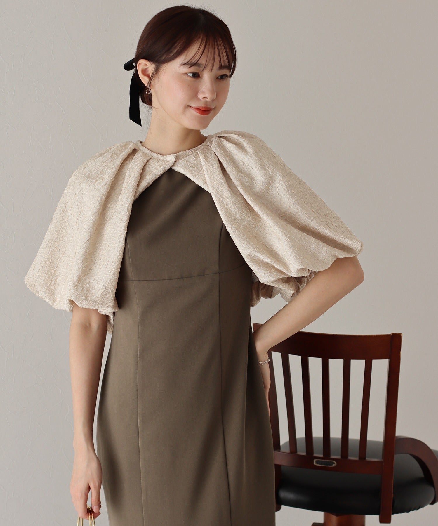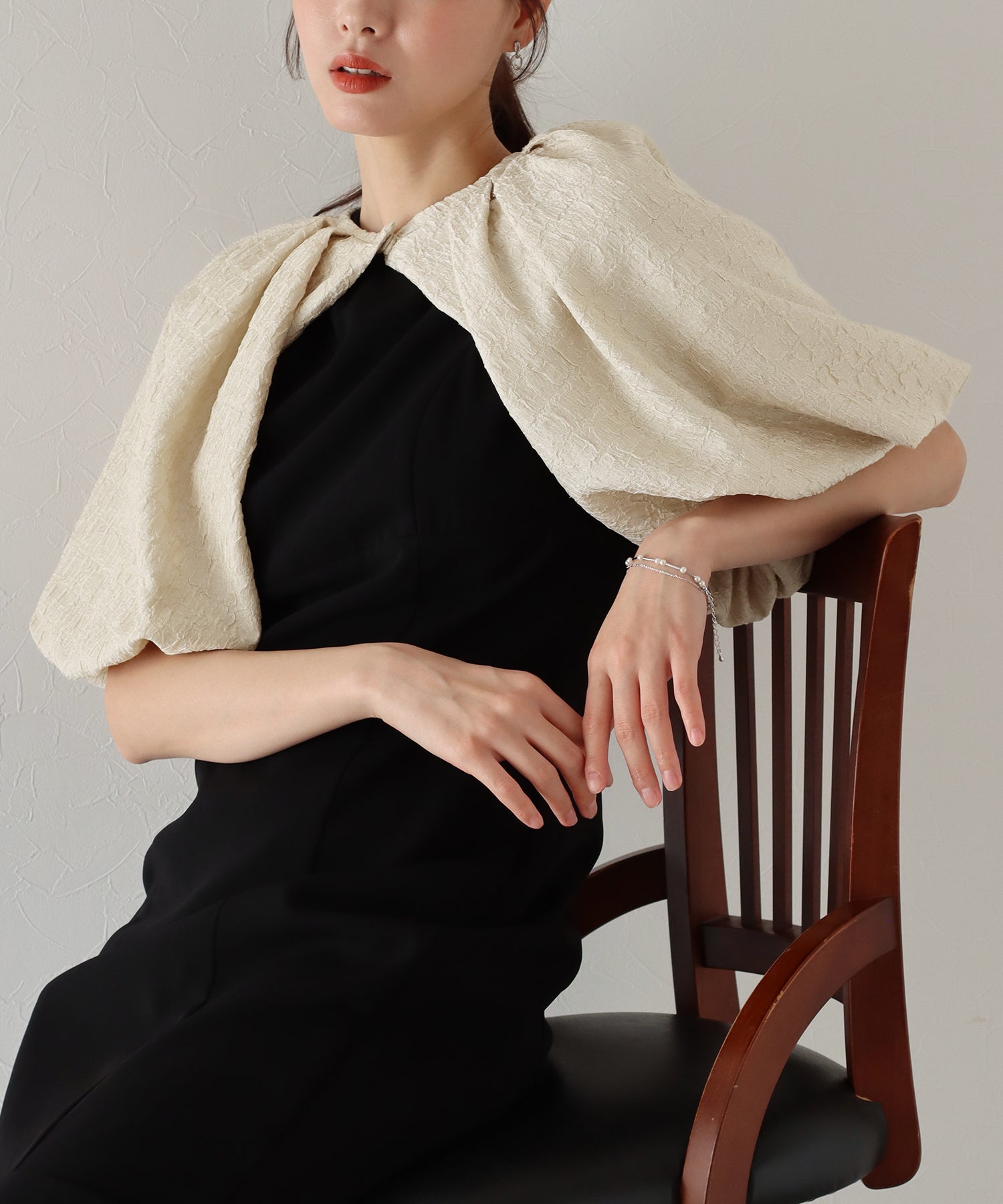 ?POINT バルーン袖が目を惹くショート丈のボレロとワンピースのシルエットでメリハリがつきすっきり見えるパーティードレス。 セット使いでも、単品使いもできるマルチウェイで使えるセットアップ。