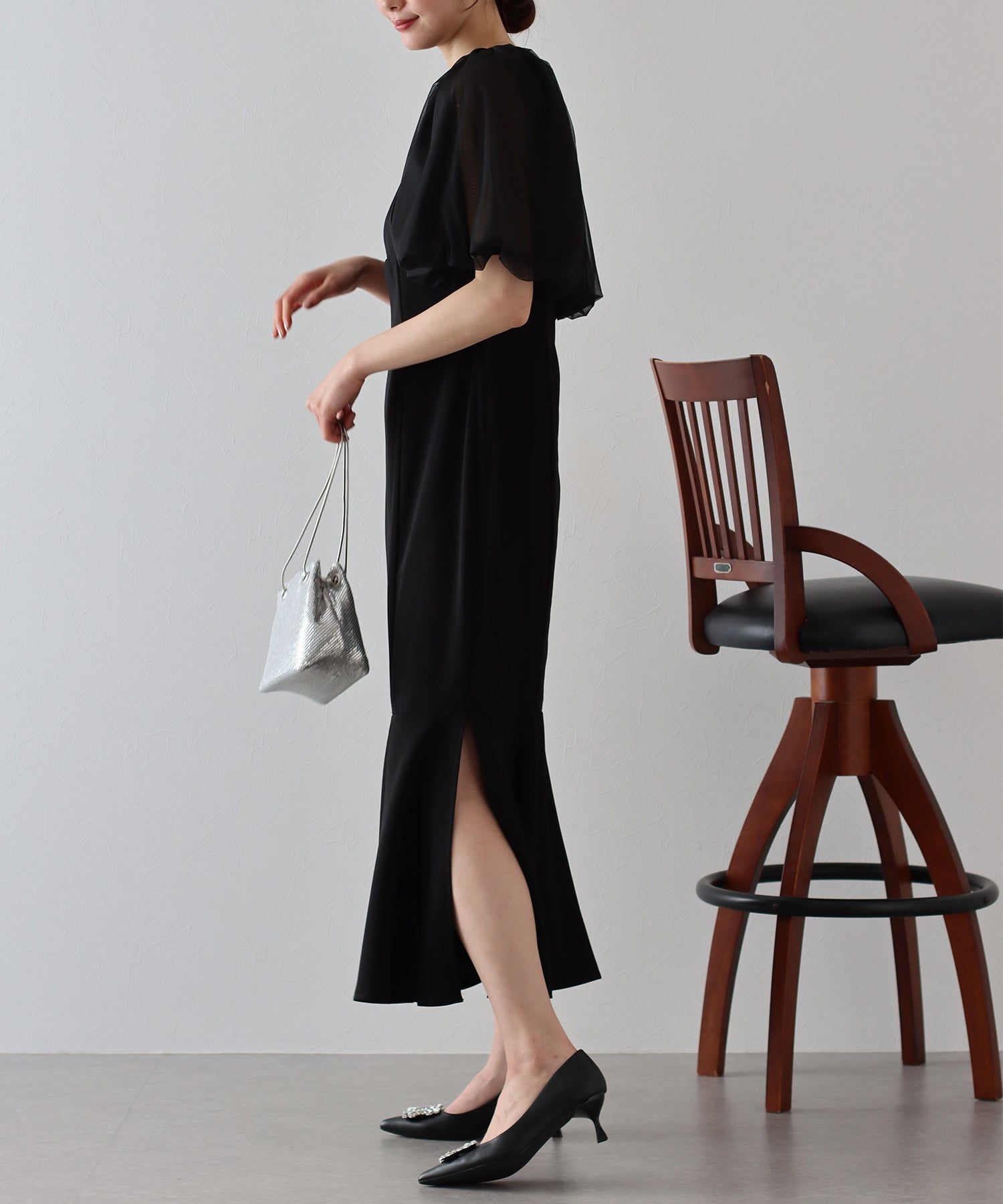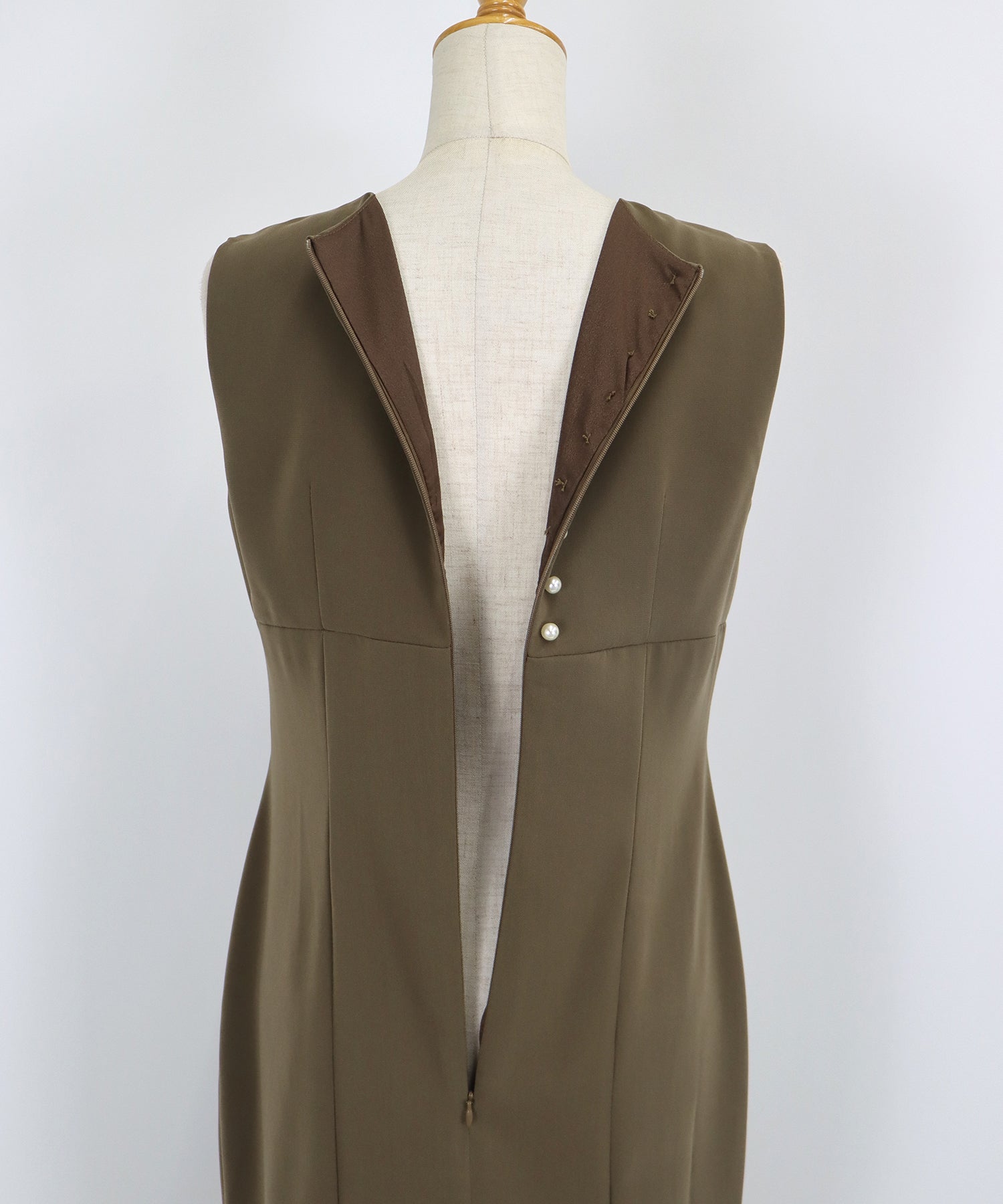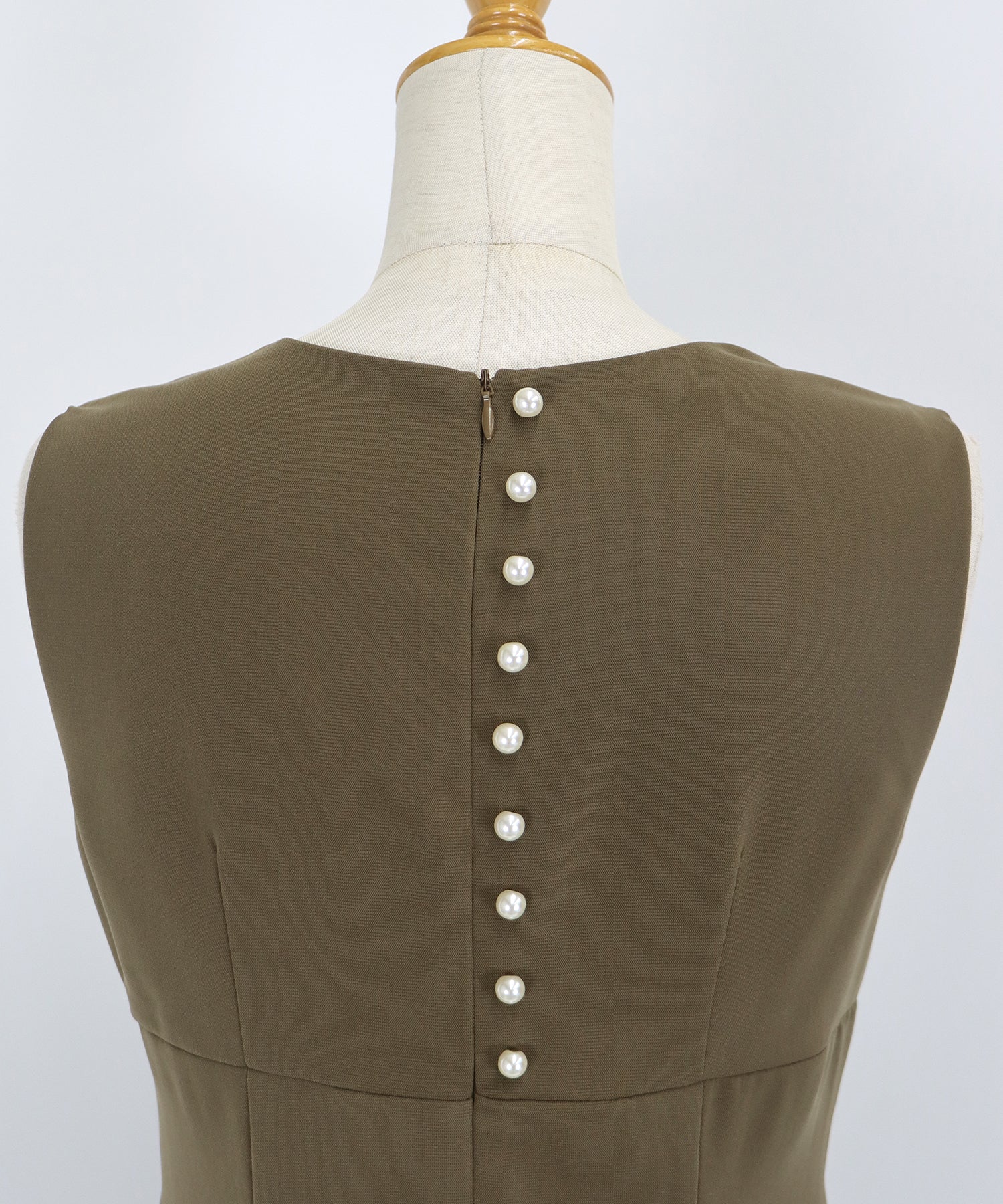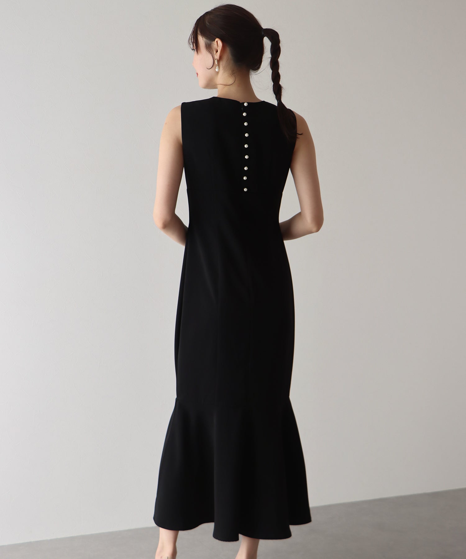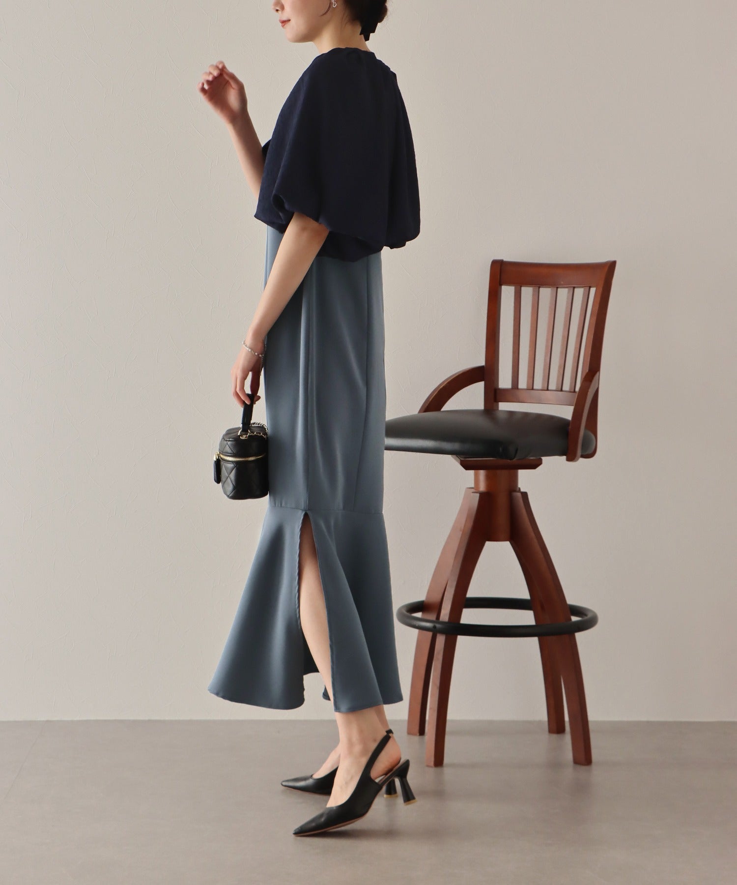 【ワンピース】 マーメイドシルエット 片サイドスリット入り 背中に飾りパール釦 バックファスナー有り 裏地有り