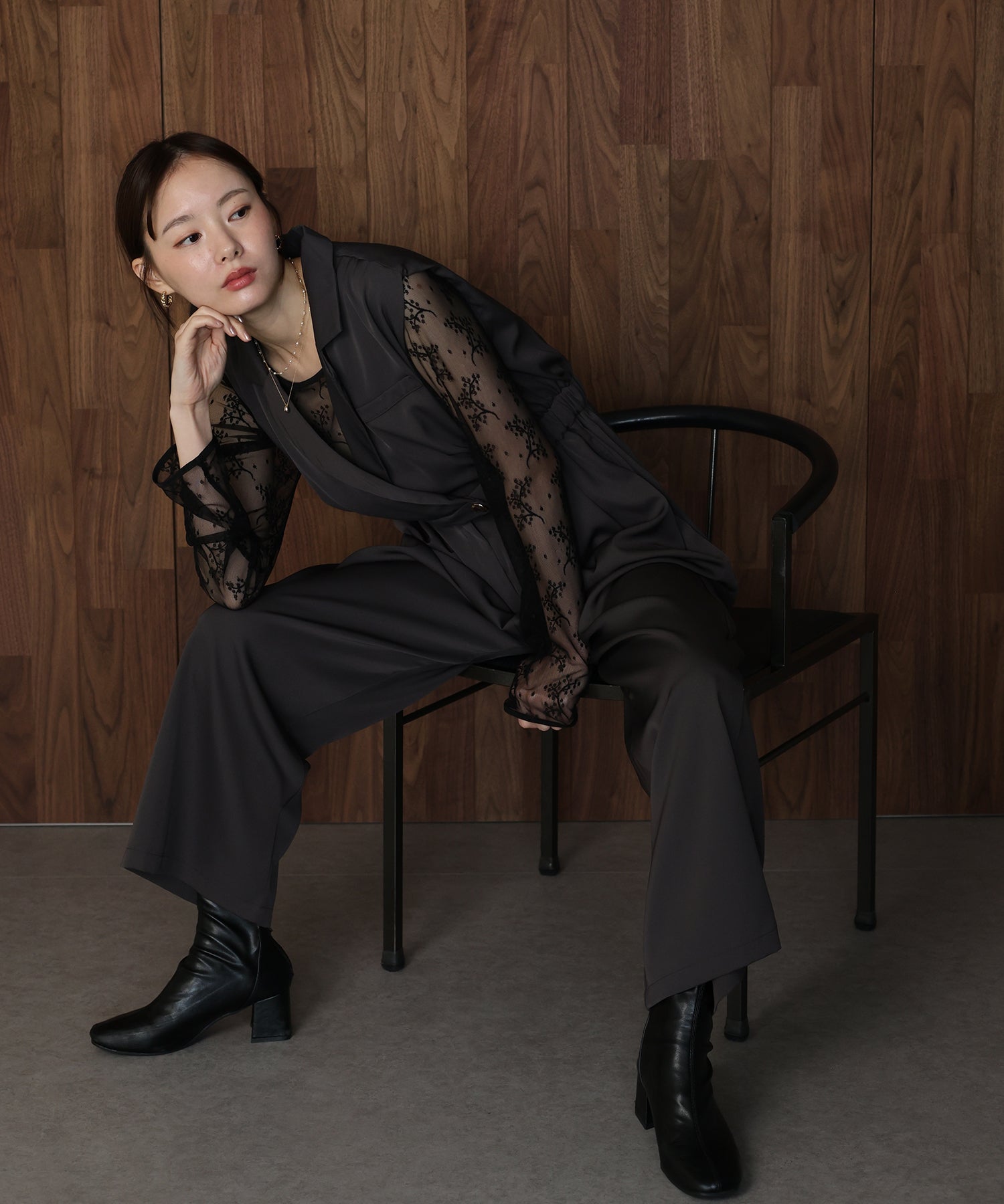 セットのレーストップスは、甘すぎない花柄で大人っぽく着られます。