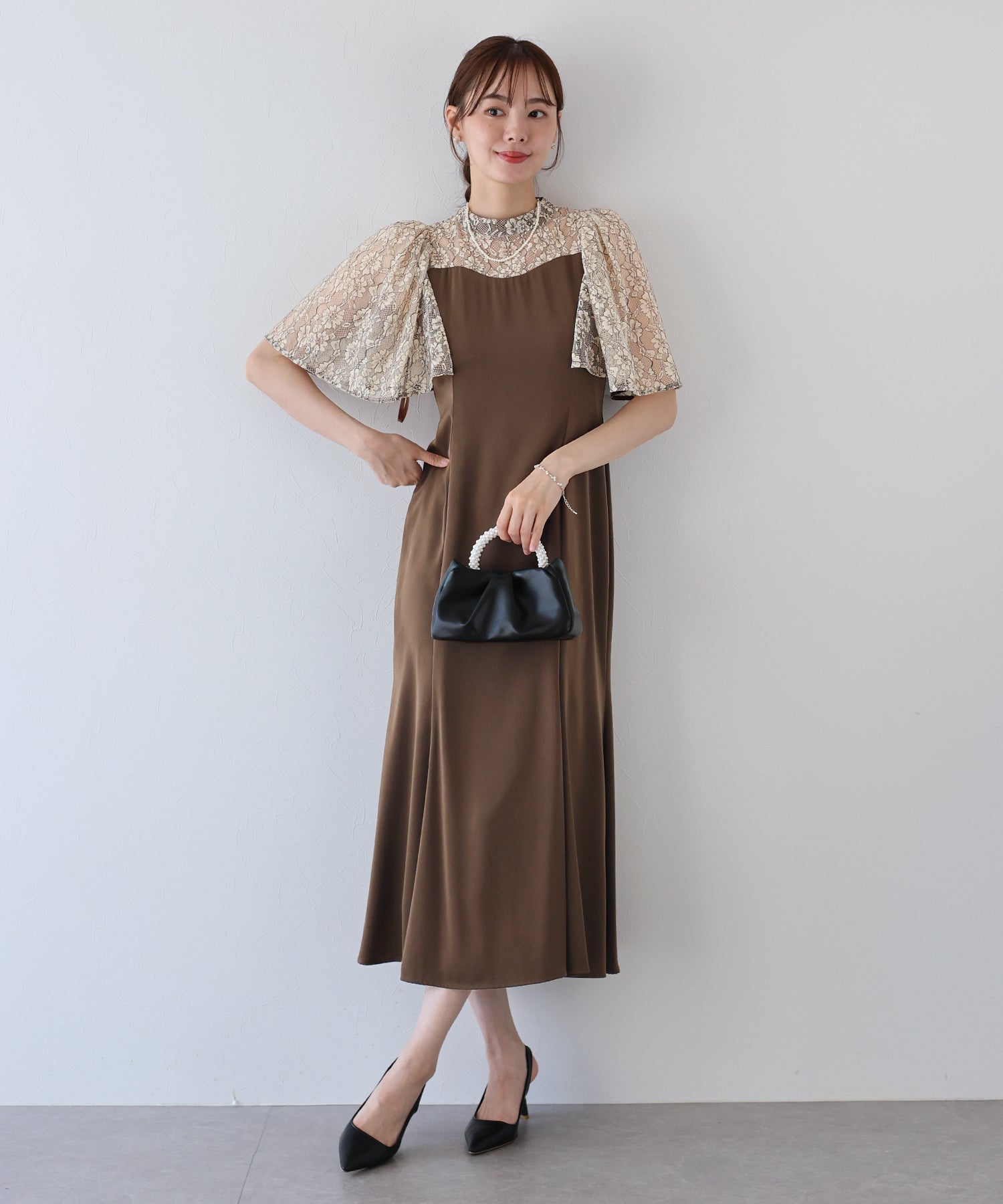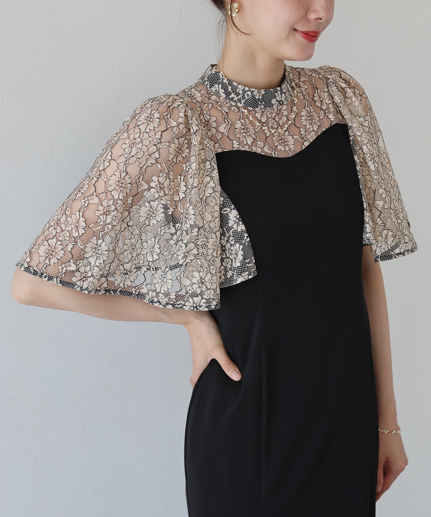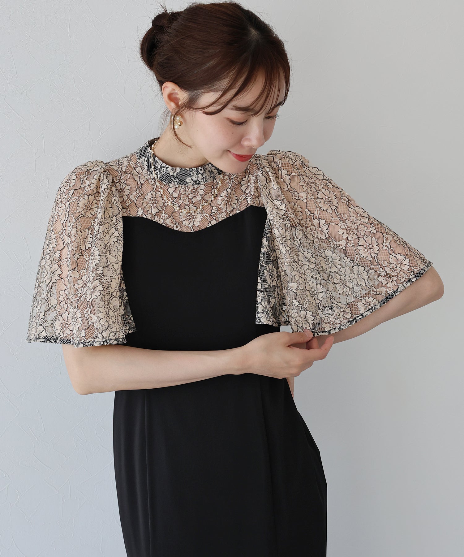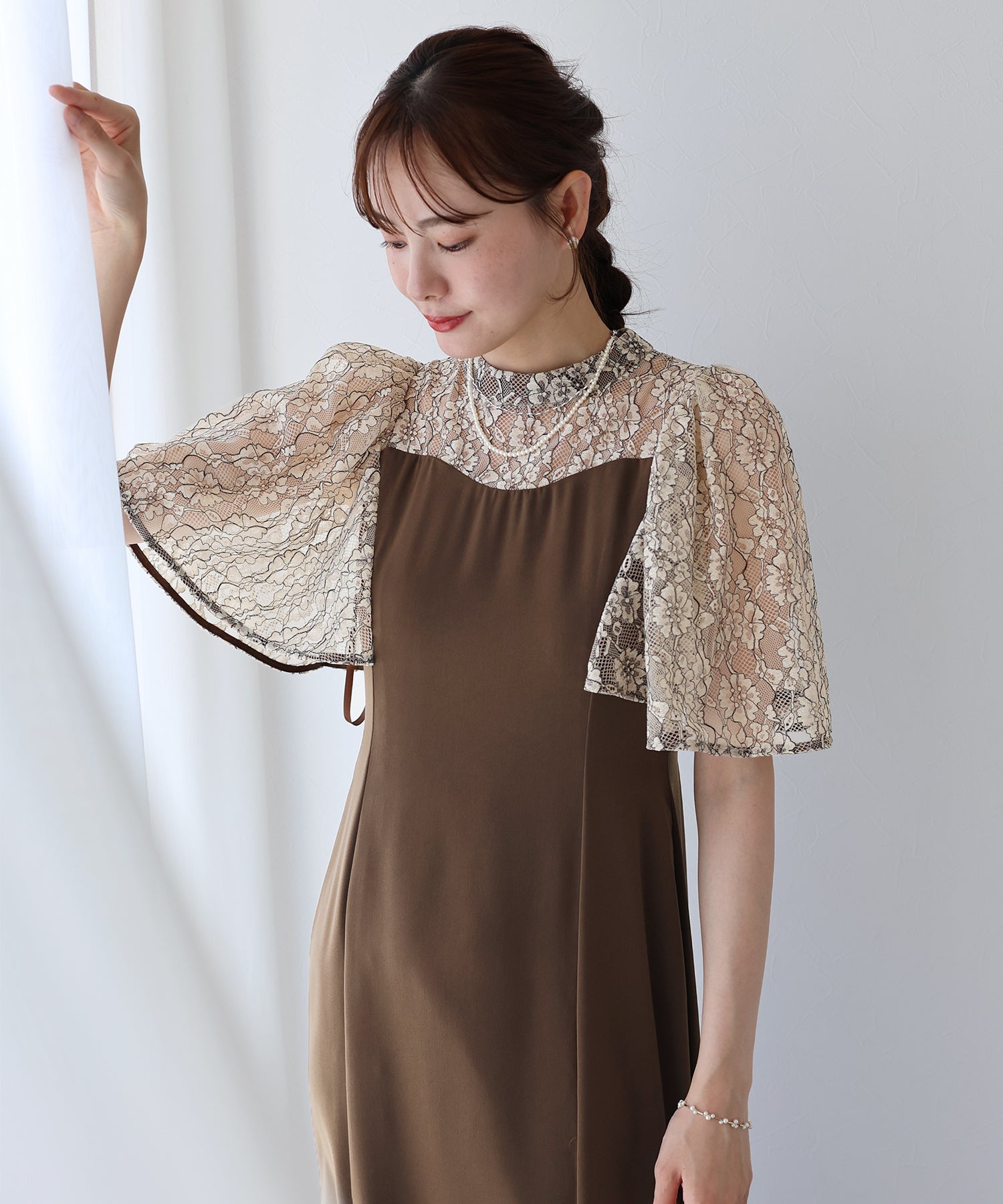 デコルテ部分に透け感のあるレースを使用し、顔回りが華やかな印象に。