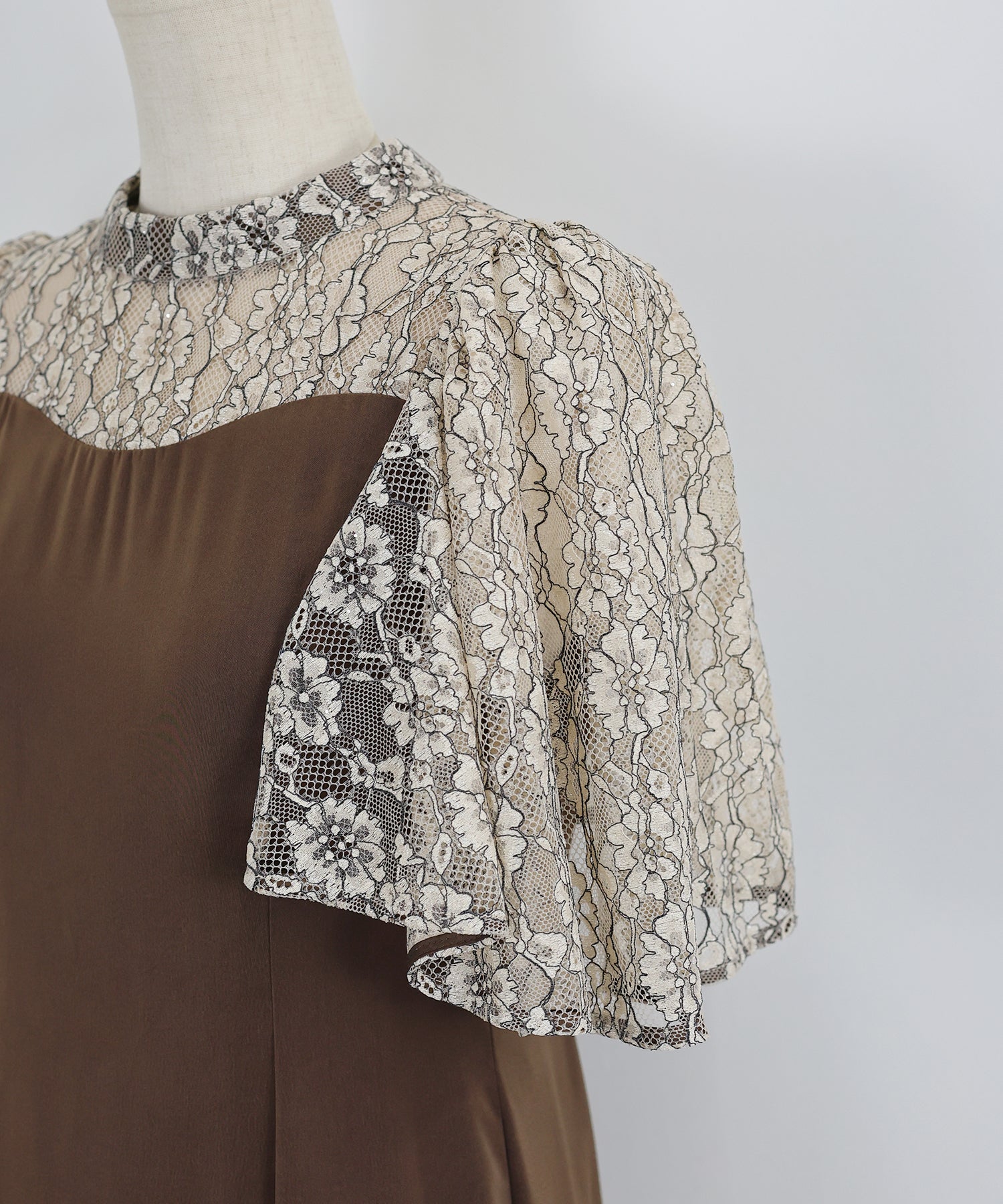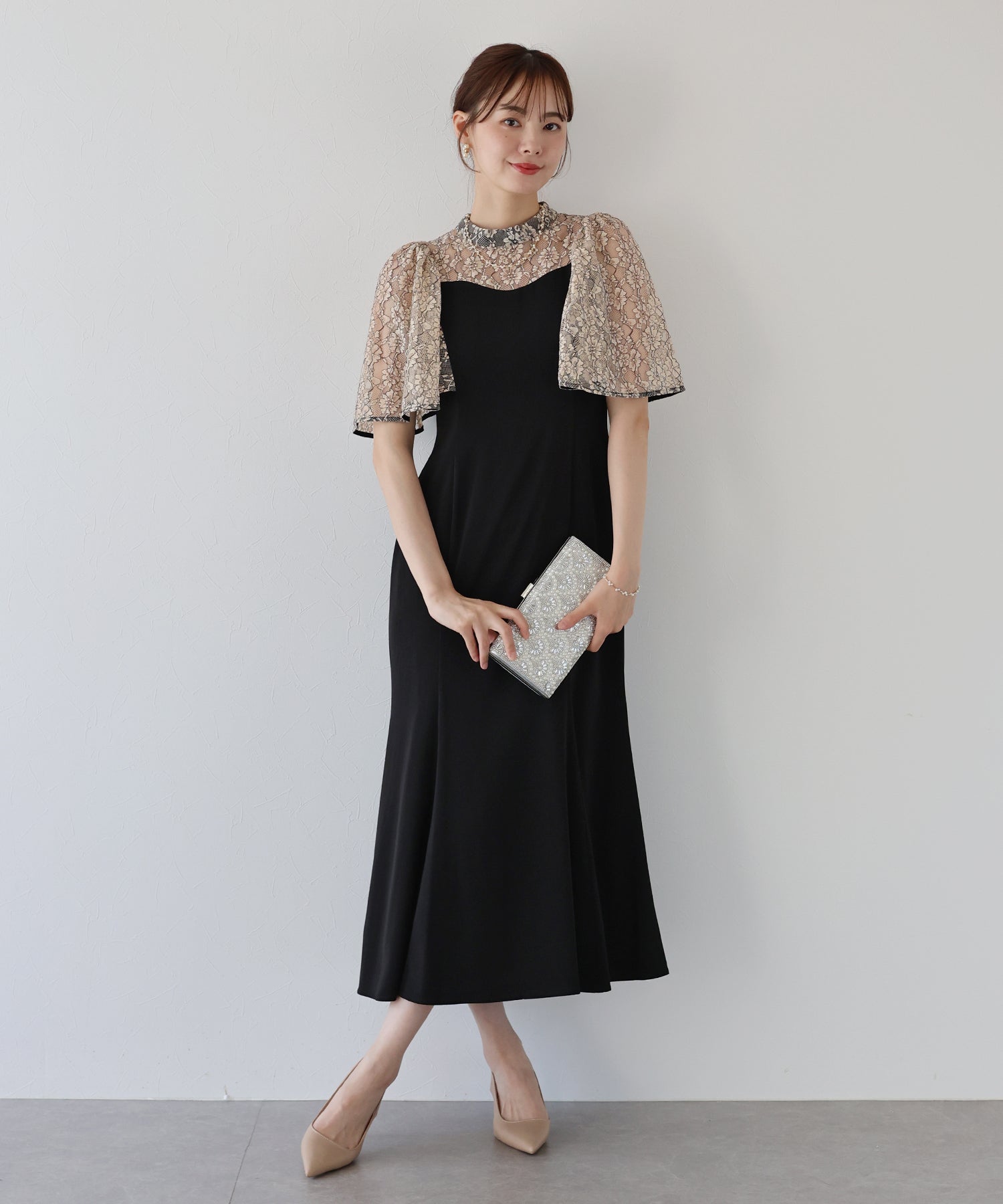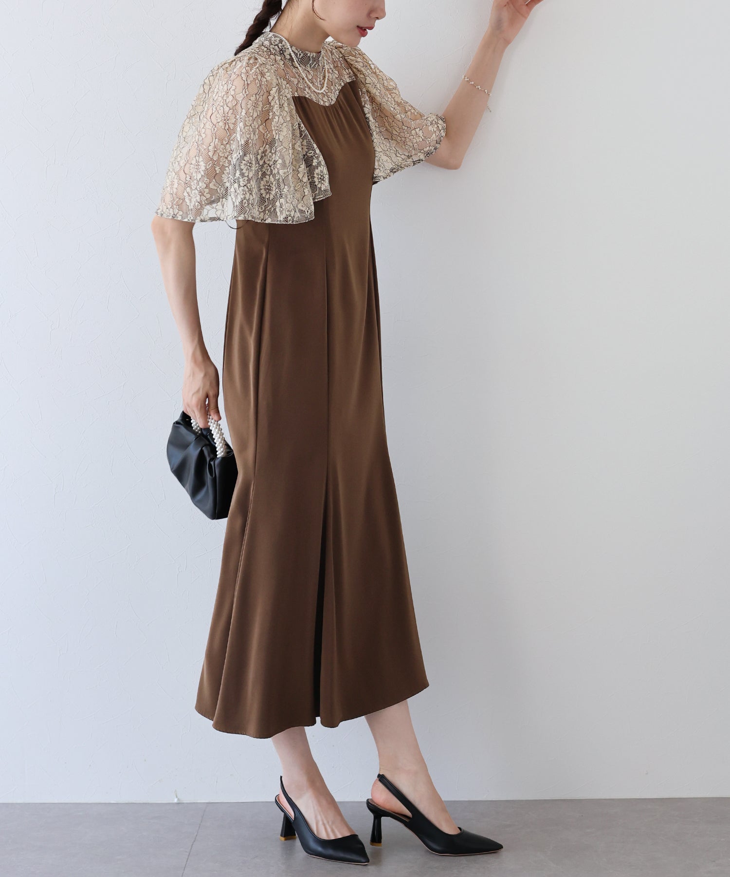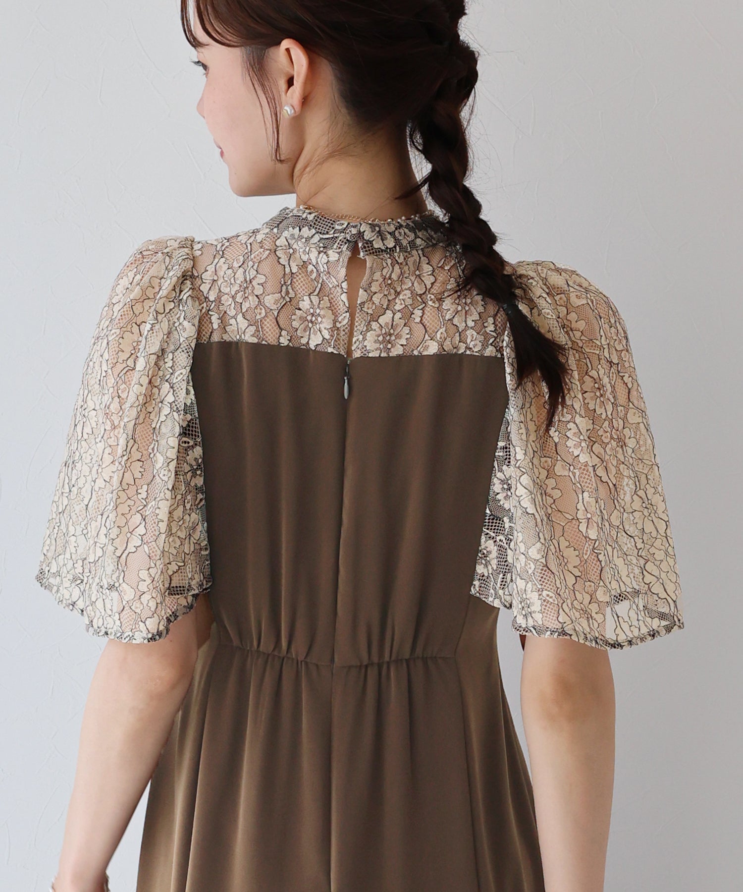 デコルテ部分に透け感のあるレースを使用し、顔回りが華やかな印象に。