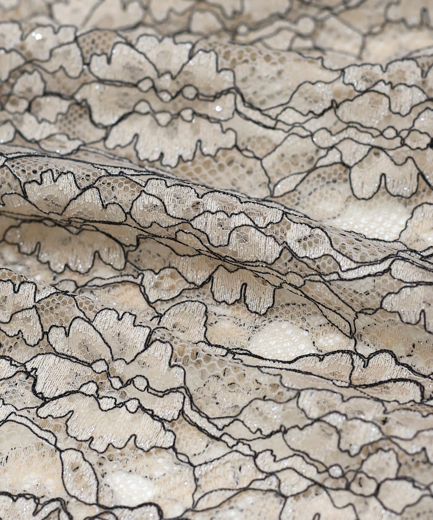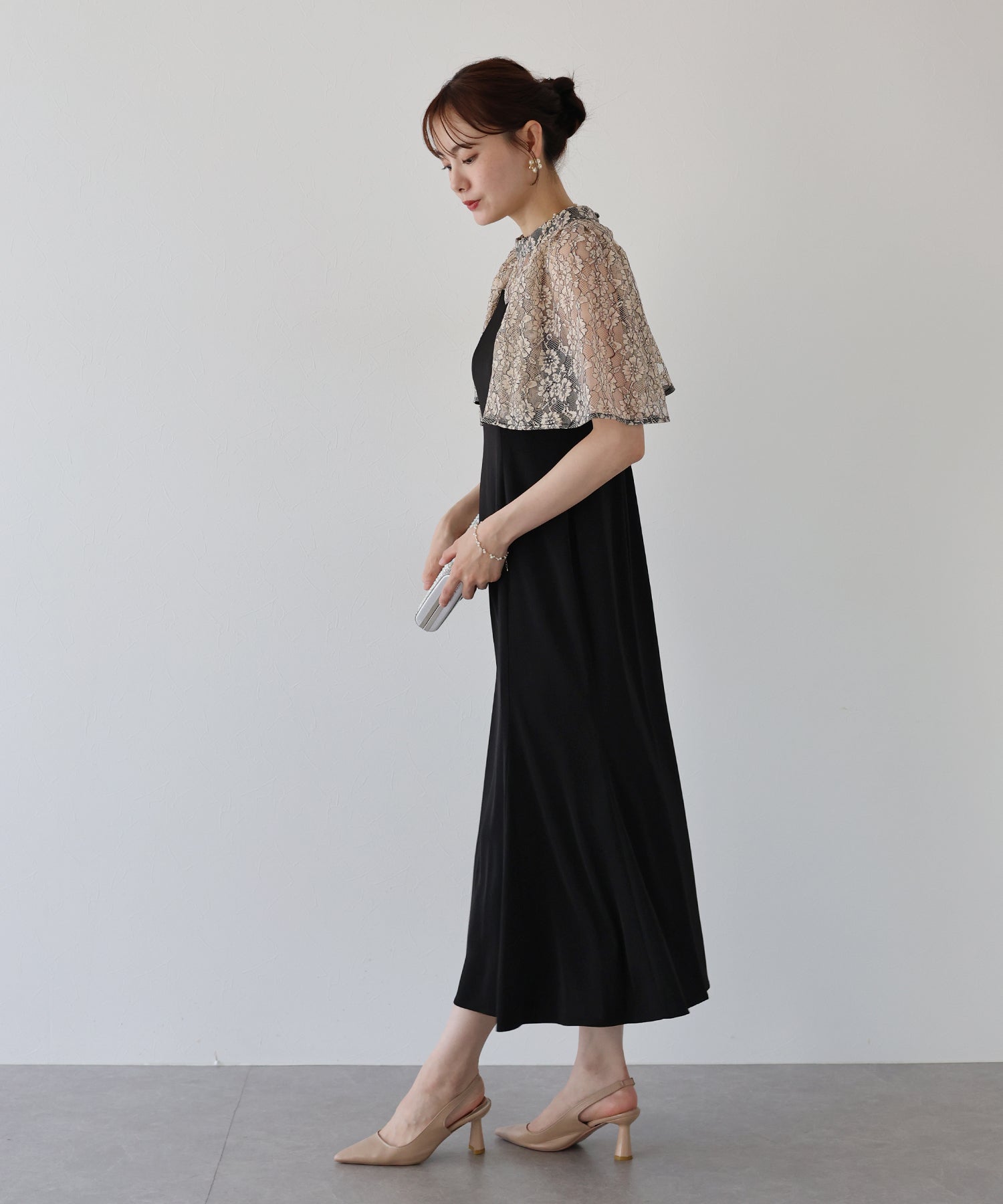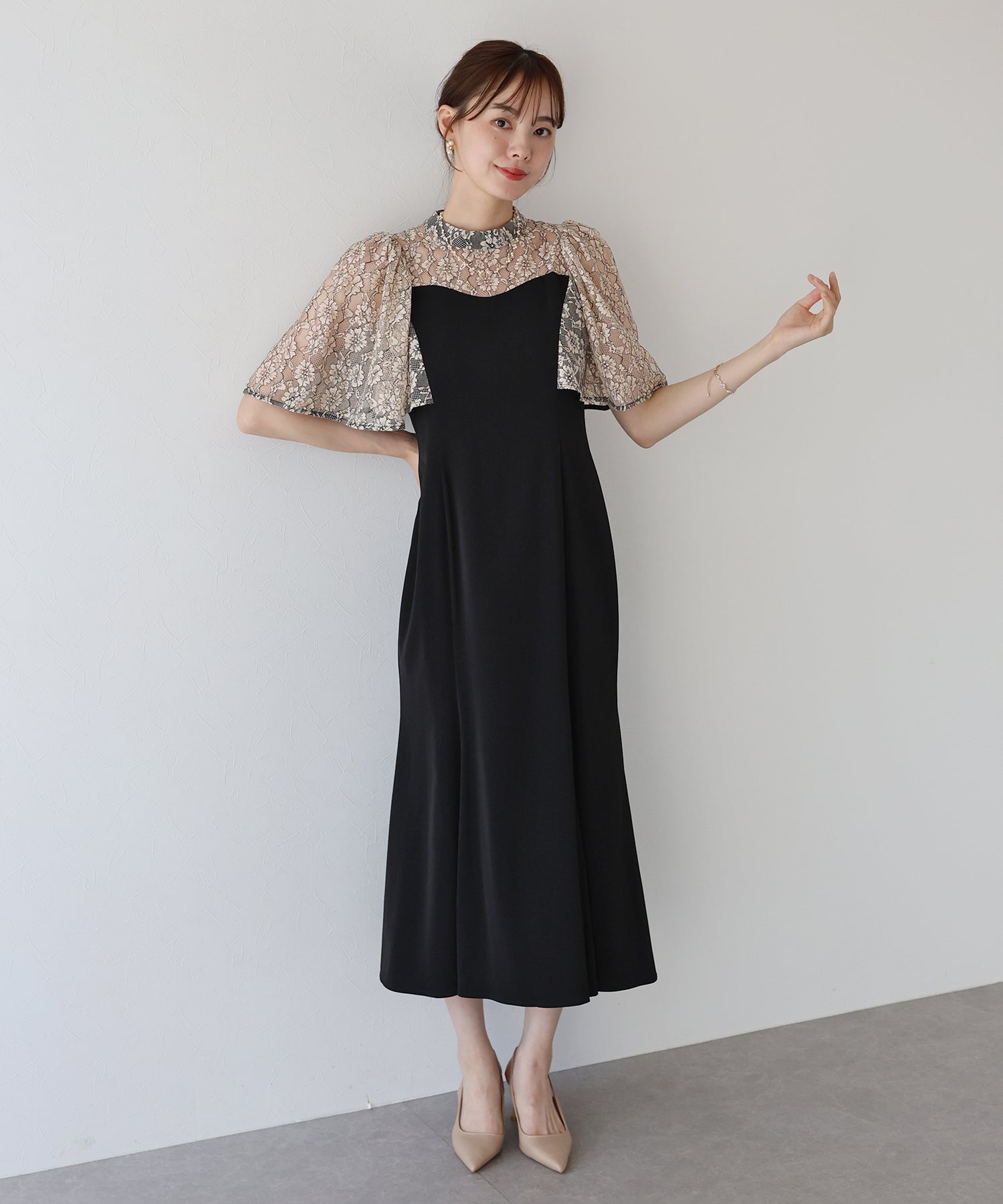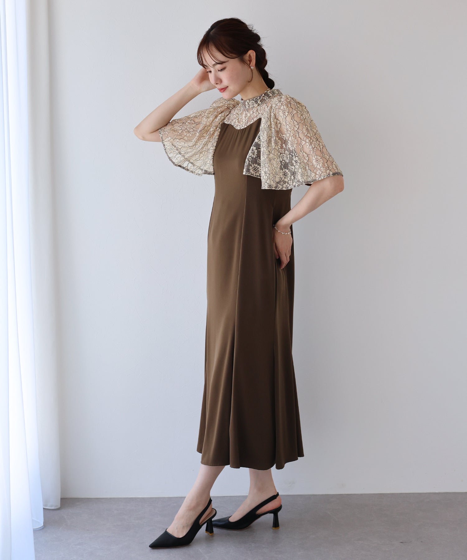 デコルテ部分に透け感のあるレースを使用し、顔回りが華やかな印象に。