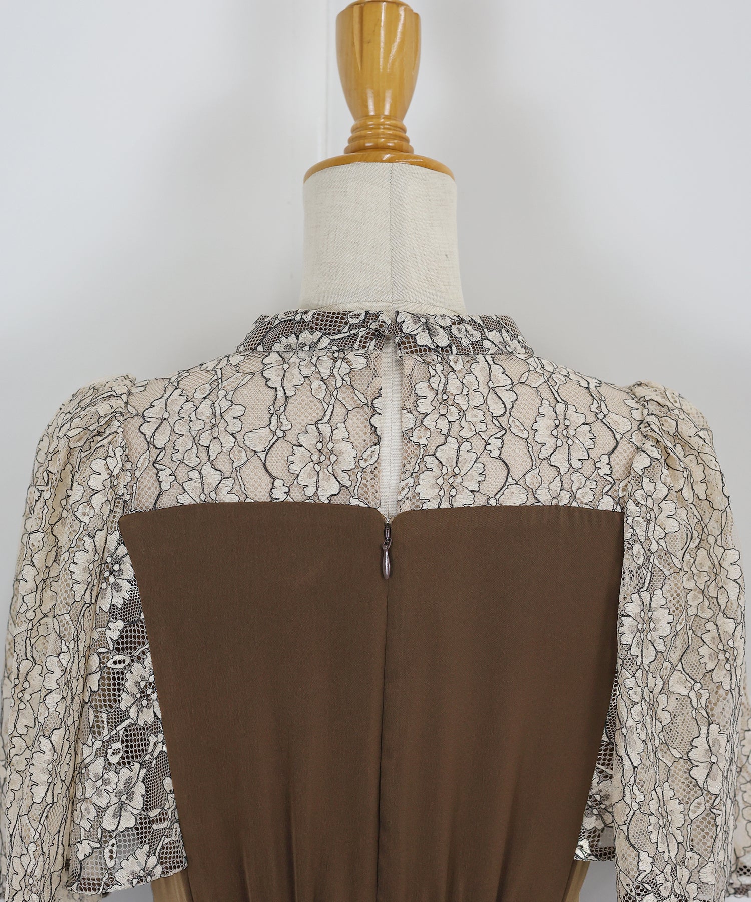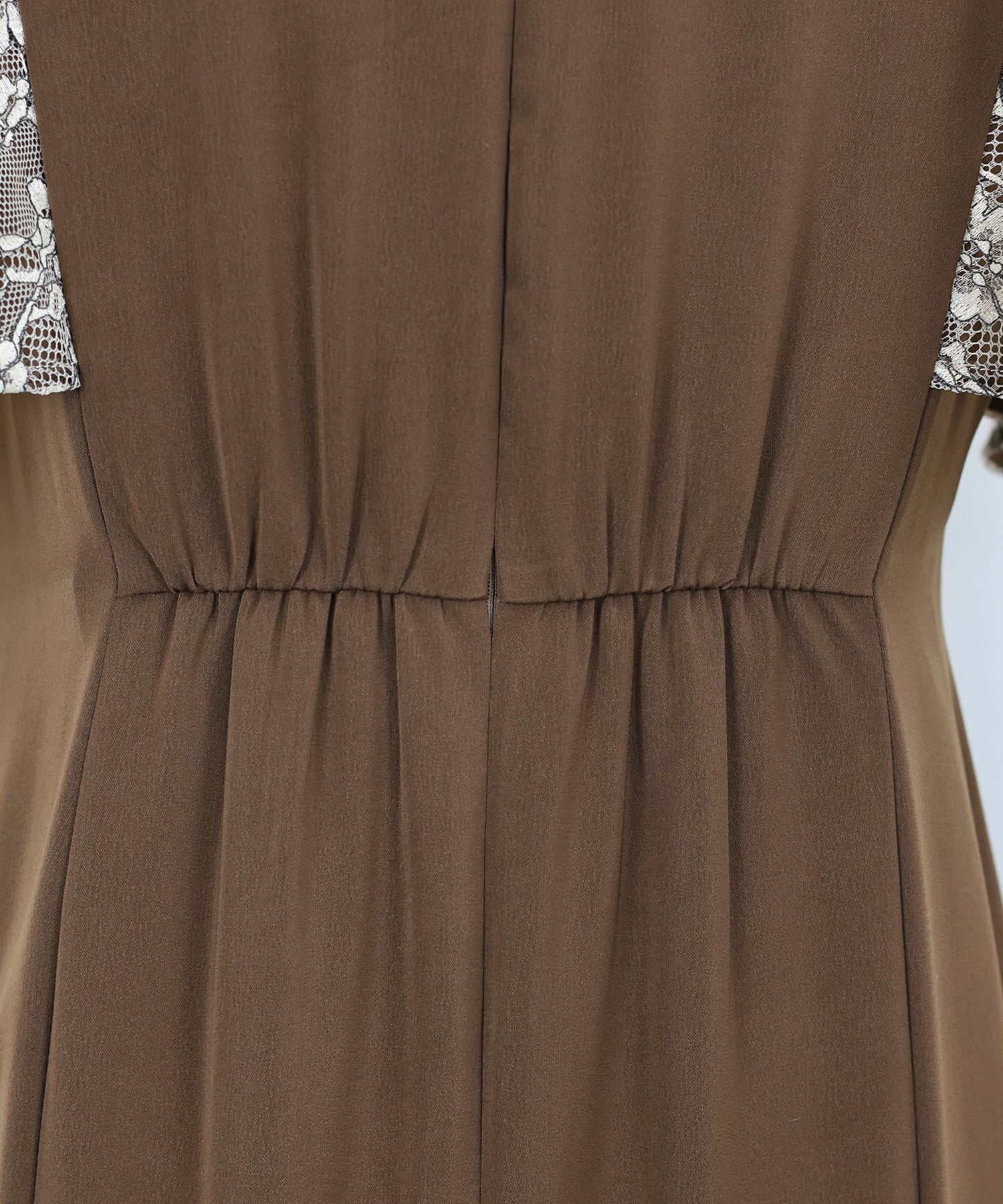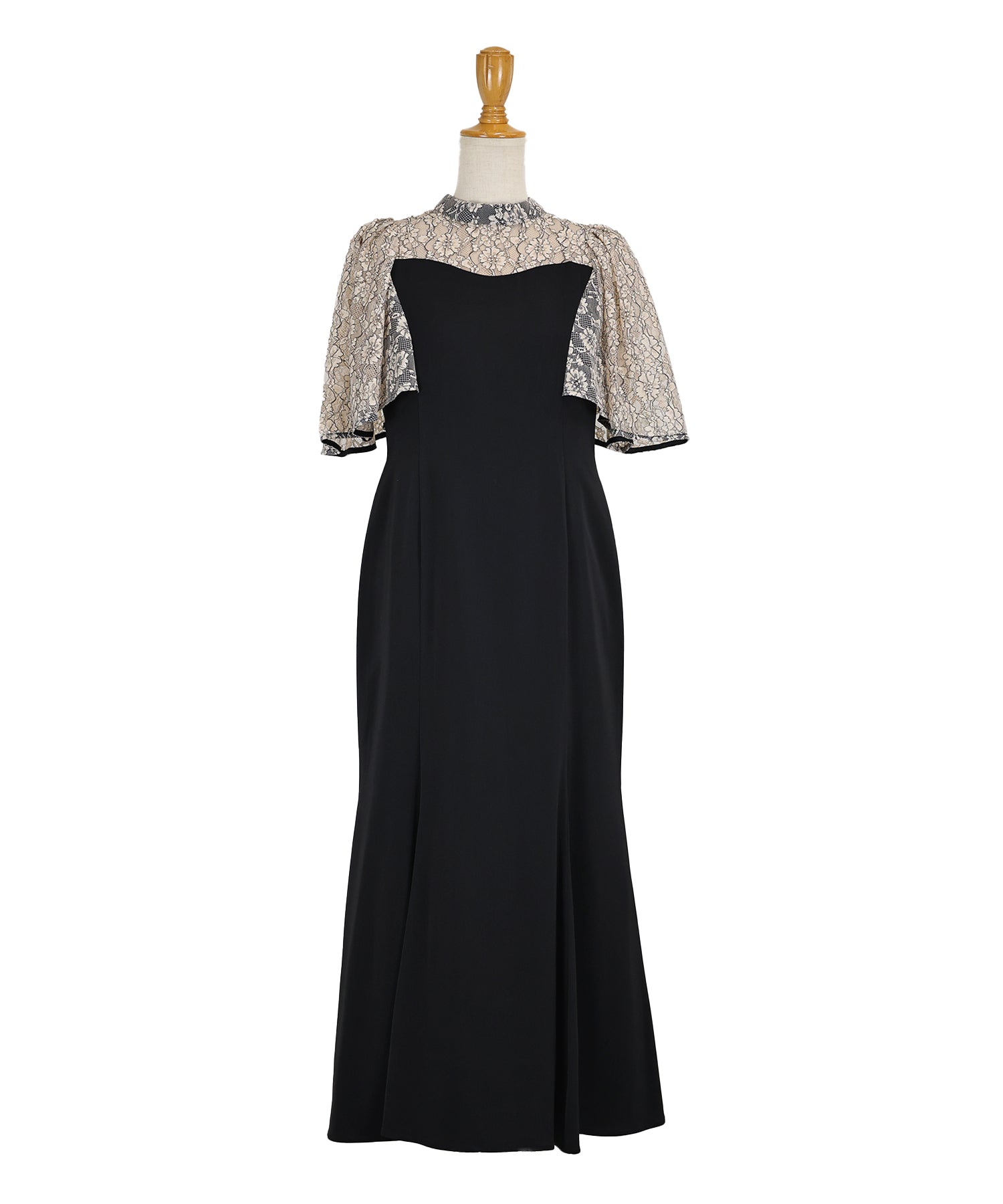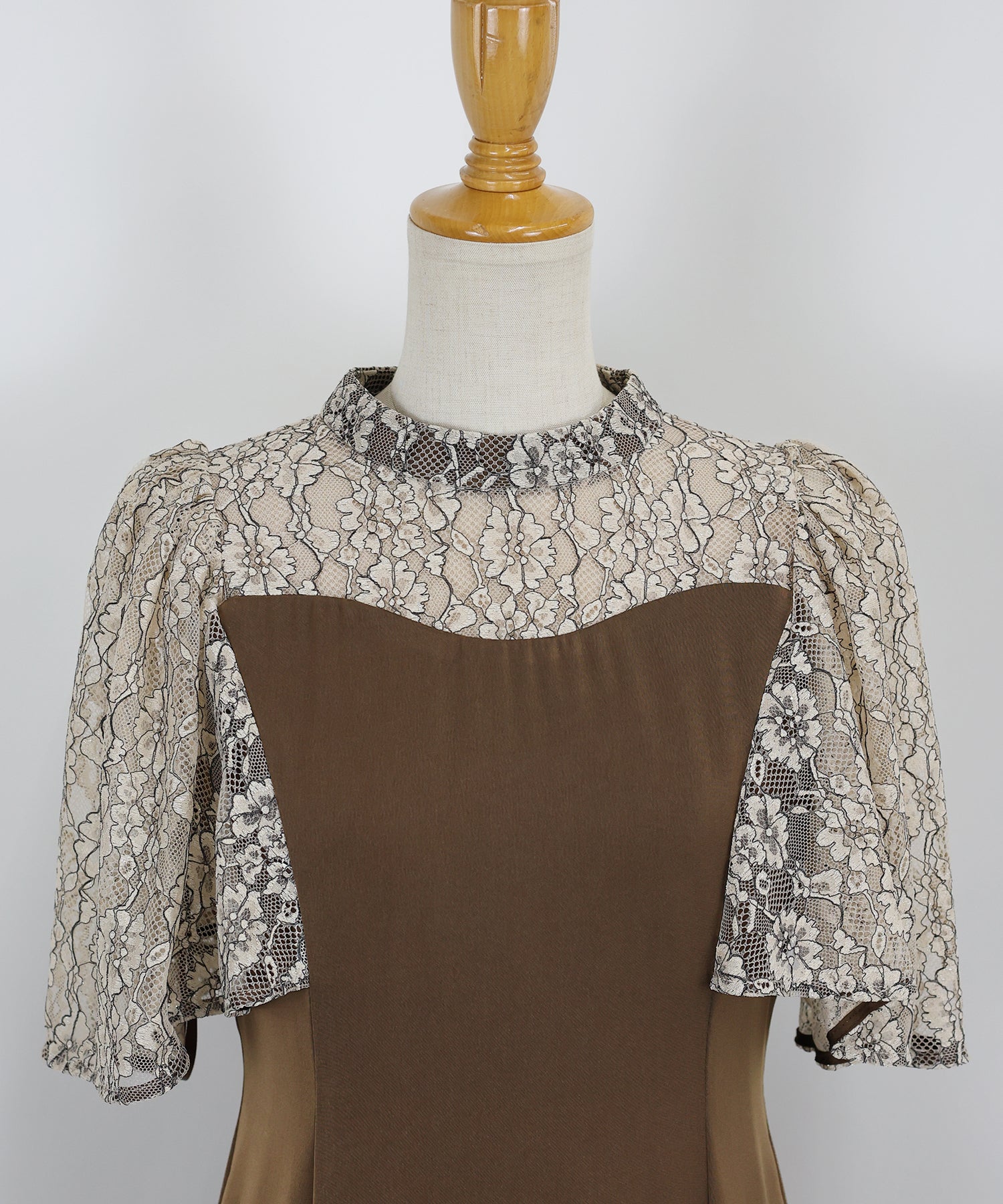 デコルテ部分に透け感のあるレースを使用し、顔回りが華やかな印象に。