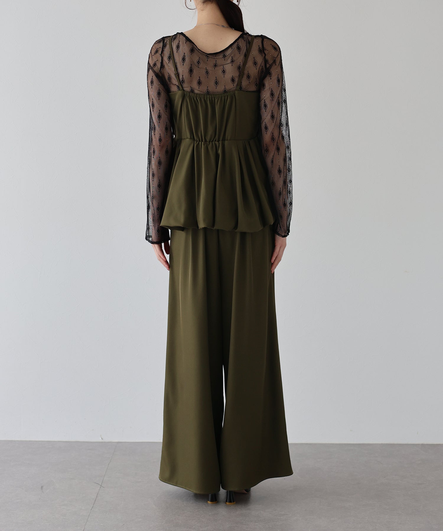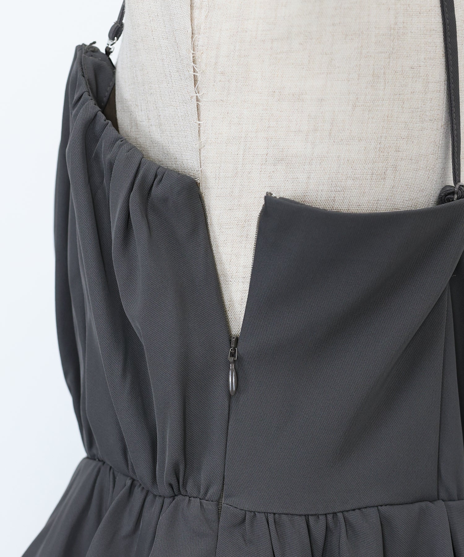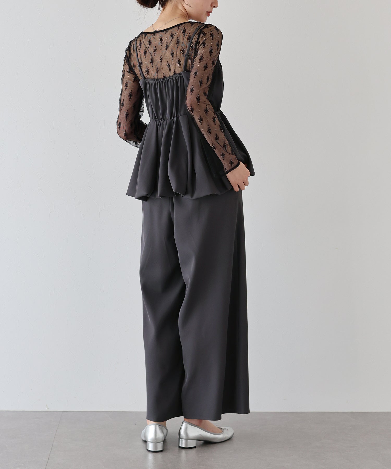 キャミソールは、バルーンシルエットにイレギュラーに入ったランダムタックを施し、空気を含んだようなボリューム感を生み出し、動くたびにふわっと揺れる表情が魅力。