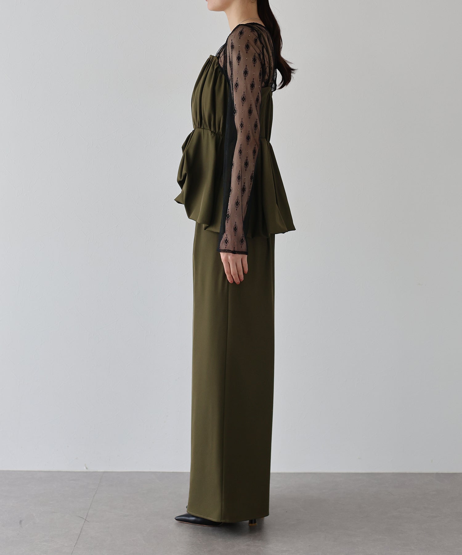 立体的なペプラムシルエットで、気になるウエストまわりを自然にカバーしながら、スタイルアップ効果も◎