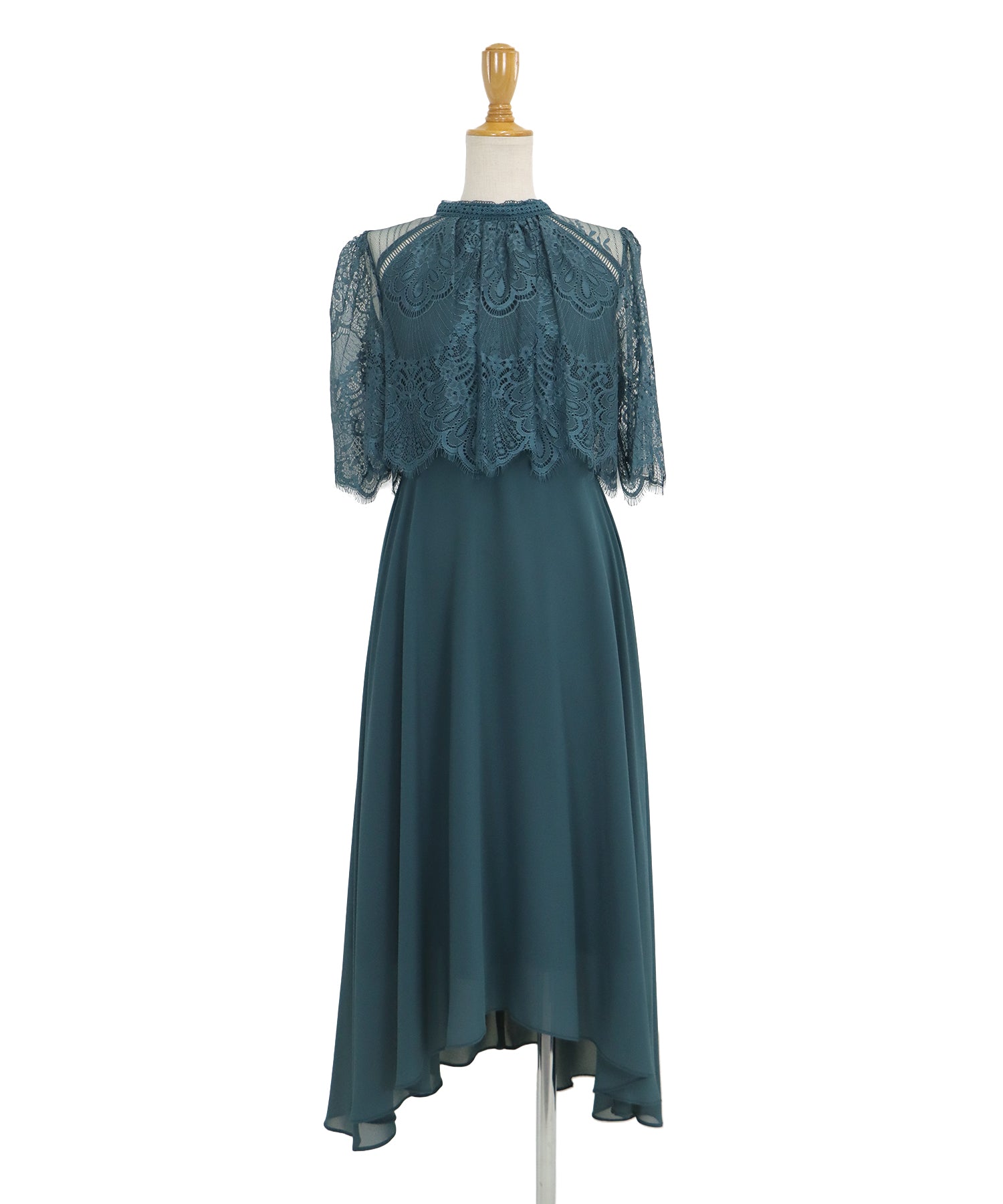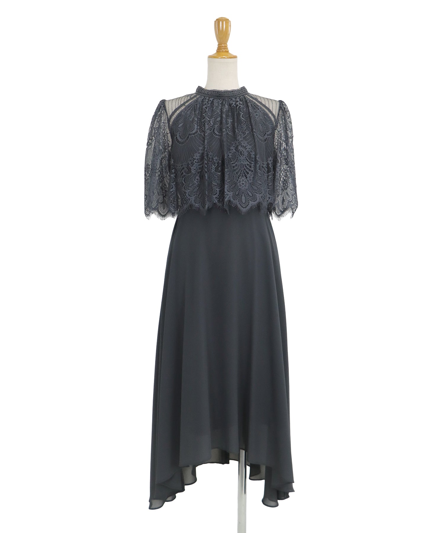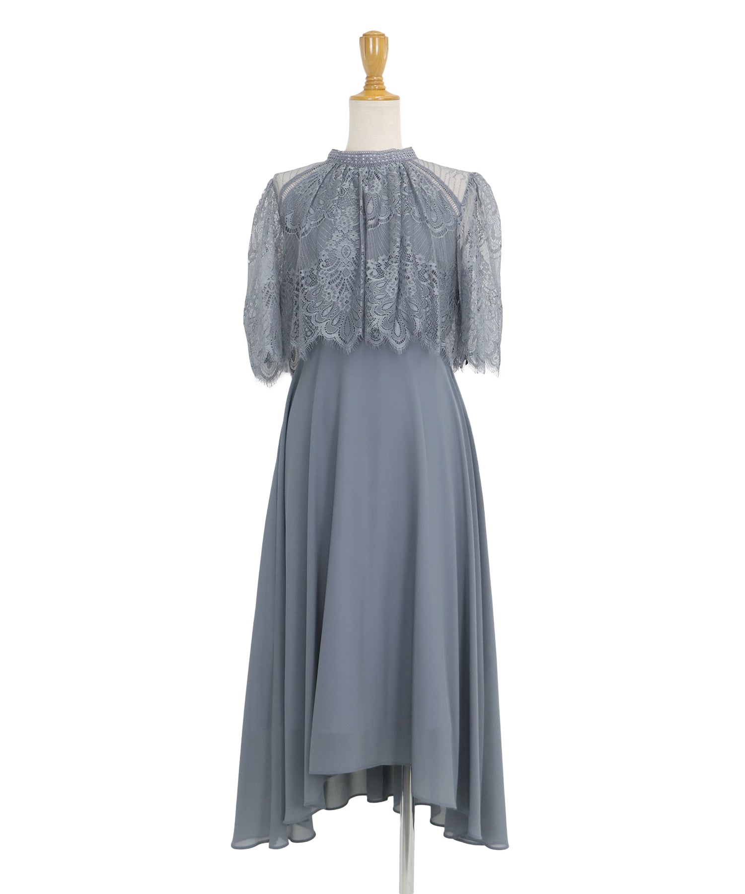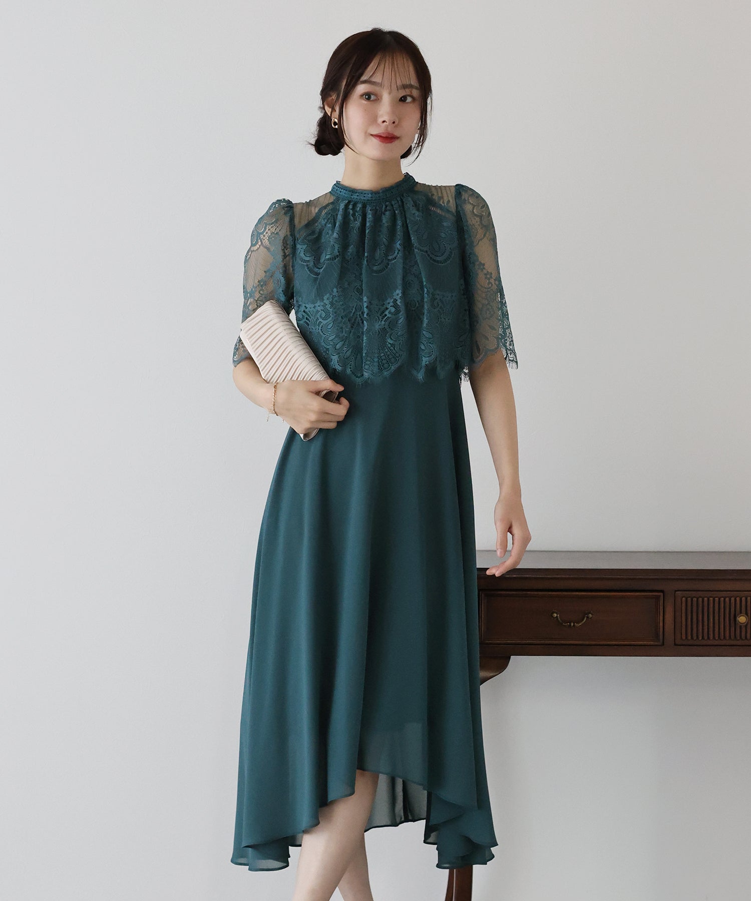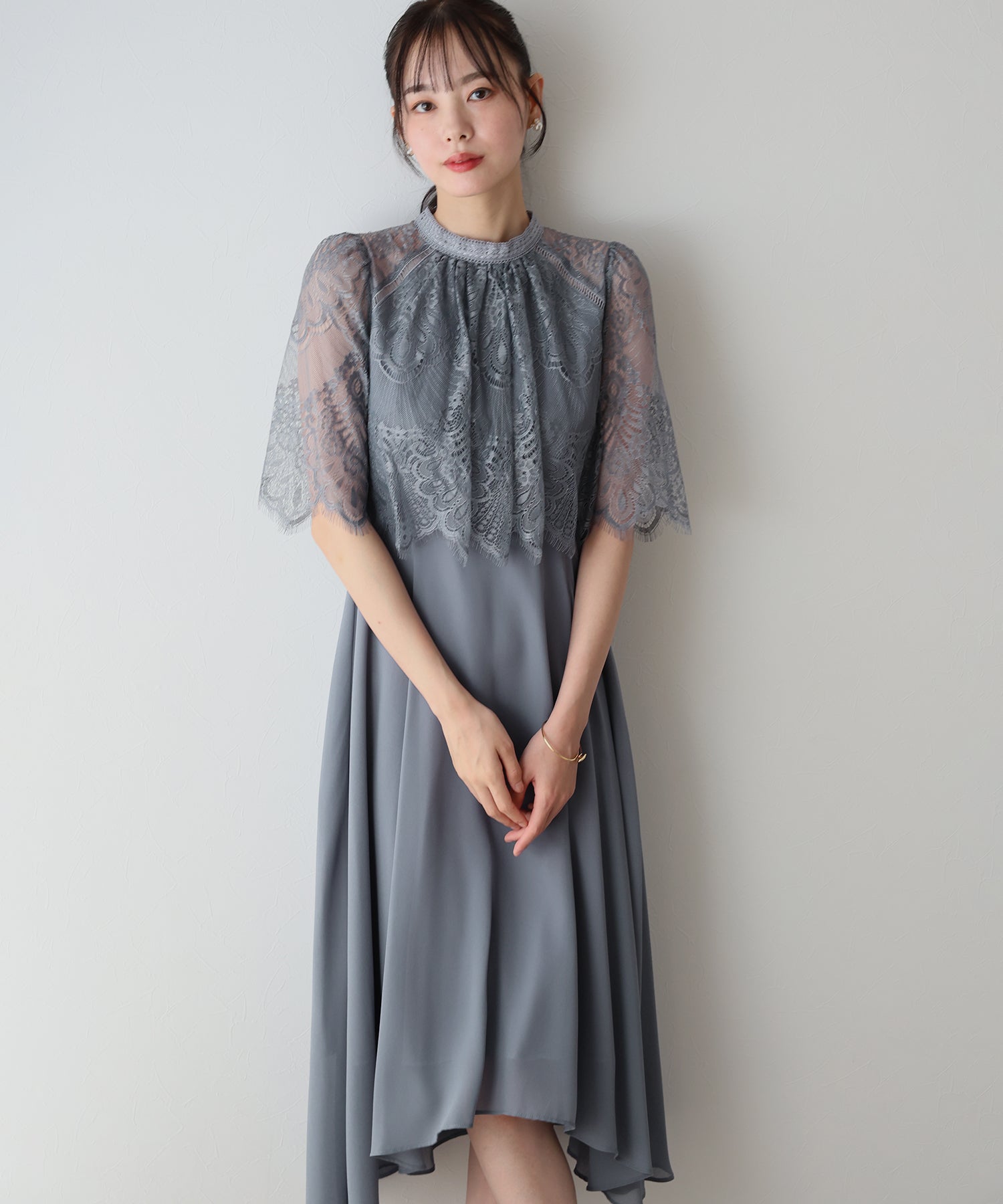 レースの組み合わせが上品なパーティーワンピース?結婚式ワンピース ?POINT 繊細なレースと清楚なボトルネック、スカートは分量を多めに取ったフレアシルエットドレス。 気になる部分をさりげなくカバーしつつ、おしゃれ感なディテールをたっぷり施しました。 レーススリーブは肘丈くらいの程よい長さで、可愛いだけでなく 二の腕などの気になる部分をカバーできるのも◎ ボトルネックで露出を抑えてあるので、大人の女性のムードにぴったり。 さりげなく透けるデコルテ部分で、「抜け感」をプラス。 スカート部分は、フレアロングスカートが足の動きに合わせ様々な表情を作り出します。 前後で丈の違うフィッシュテールタイプなので 可愛らしさに加えエレガントな雰囲気も感じられるドレスです。