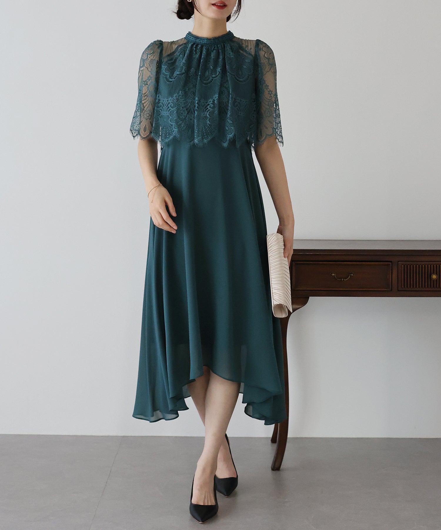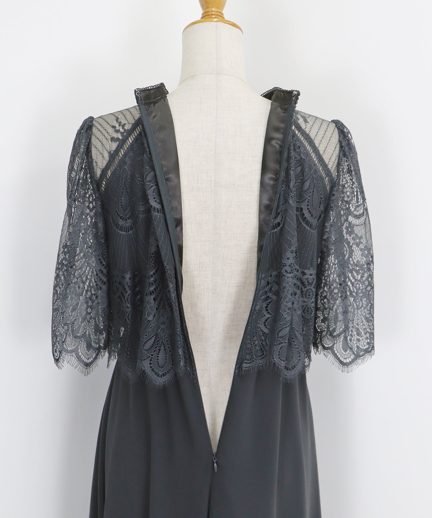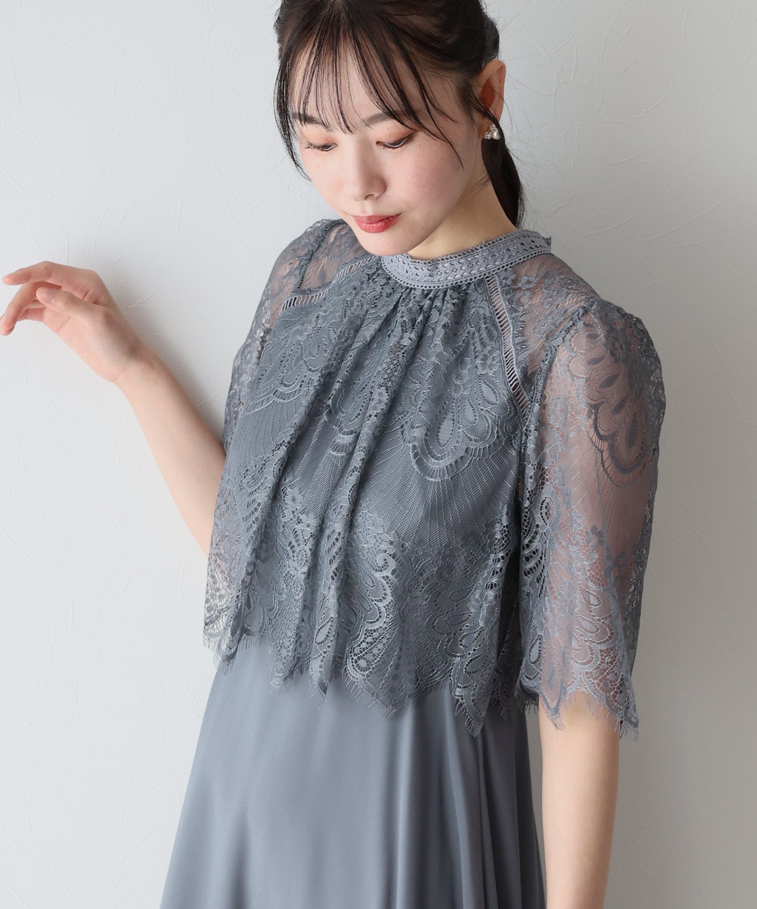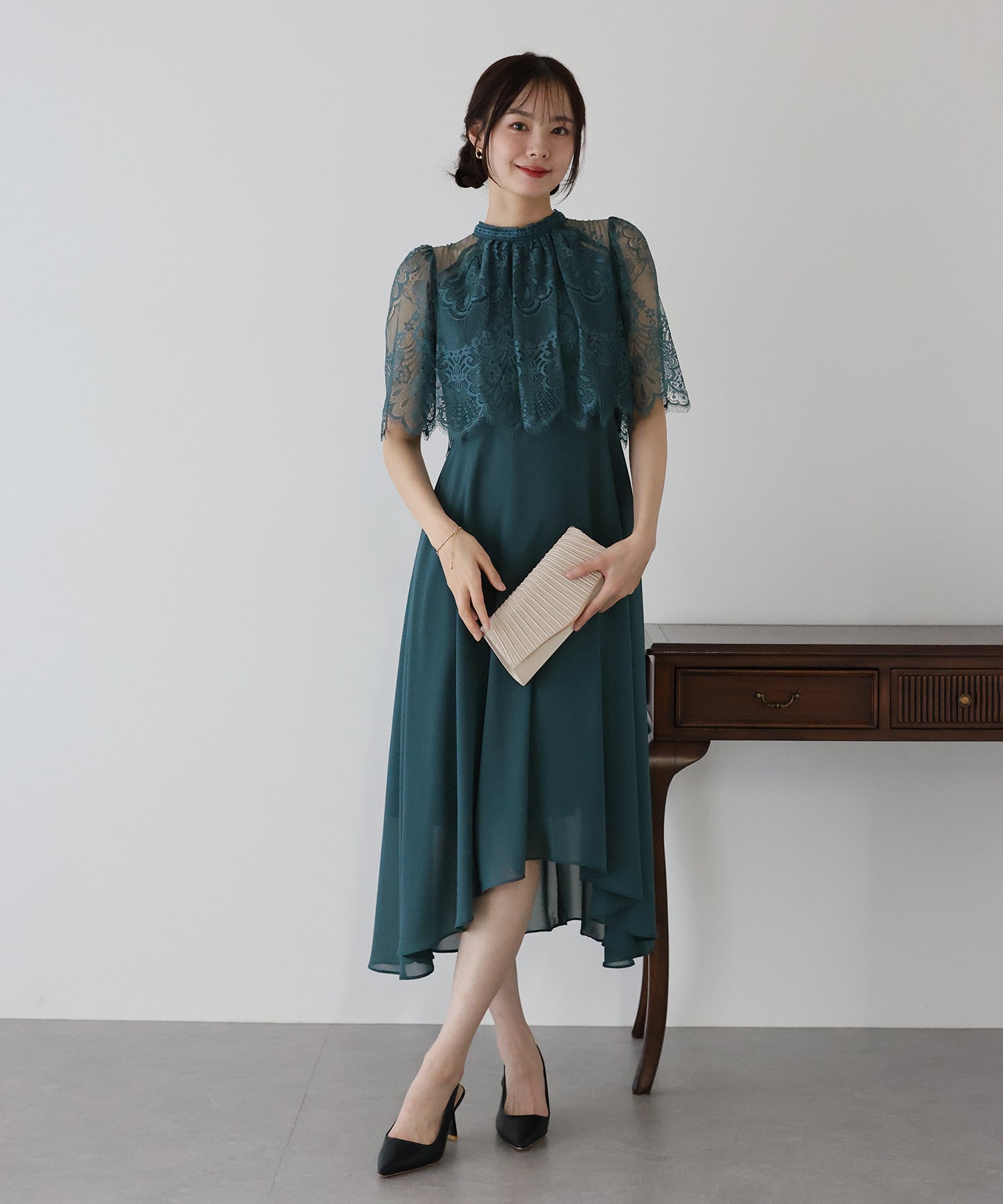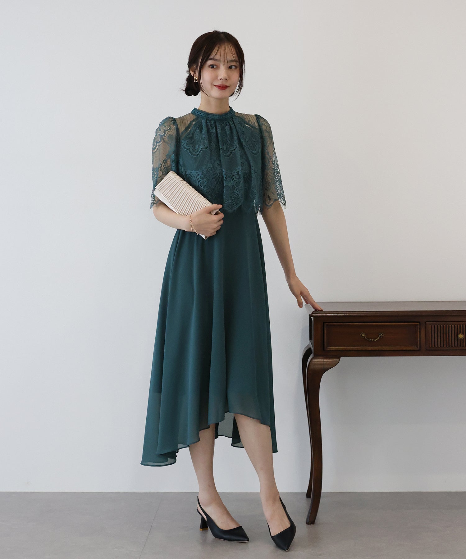 レースの組み合わせが上品なパーティーワンピース?結婚式ワンピース ?POINT 繊細なレースと清楚なボトルネック、スカートは分量を多めに取ったフレアシルエットドレス。 気になる部分をさりげなくカバーしつつ、おしゃれ感なディテールをたっぷり施しました。 レーススリーブは肘丈くらいの程よい長さで、可愛いだけでなく 二の腕などの気になる部分をカバーできるのも◎ ボトルネックで露出を抑えてあるので、大人の女性のムードにぴったり。 さりげなく透けるデコルテ部分で、「抜け感」をプラス。 スカート部分は、フレアロングスカートが足の動きに合わせ様々な表情を作り出します。 前後で丈の違うフィッシュテールタイプなので 可愛らしさに加えエレガントな雰囲気も感じられるドレスです。