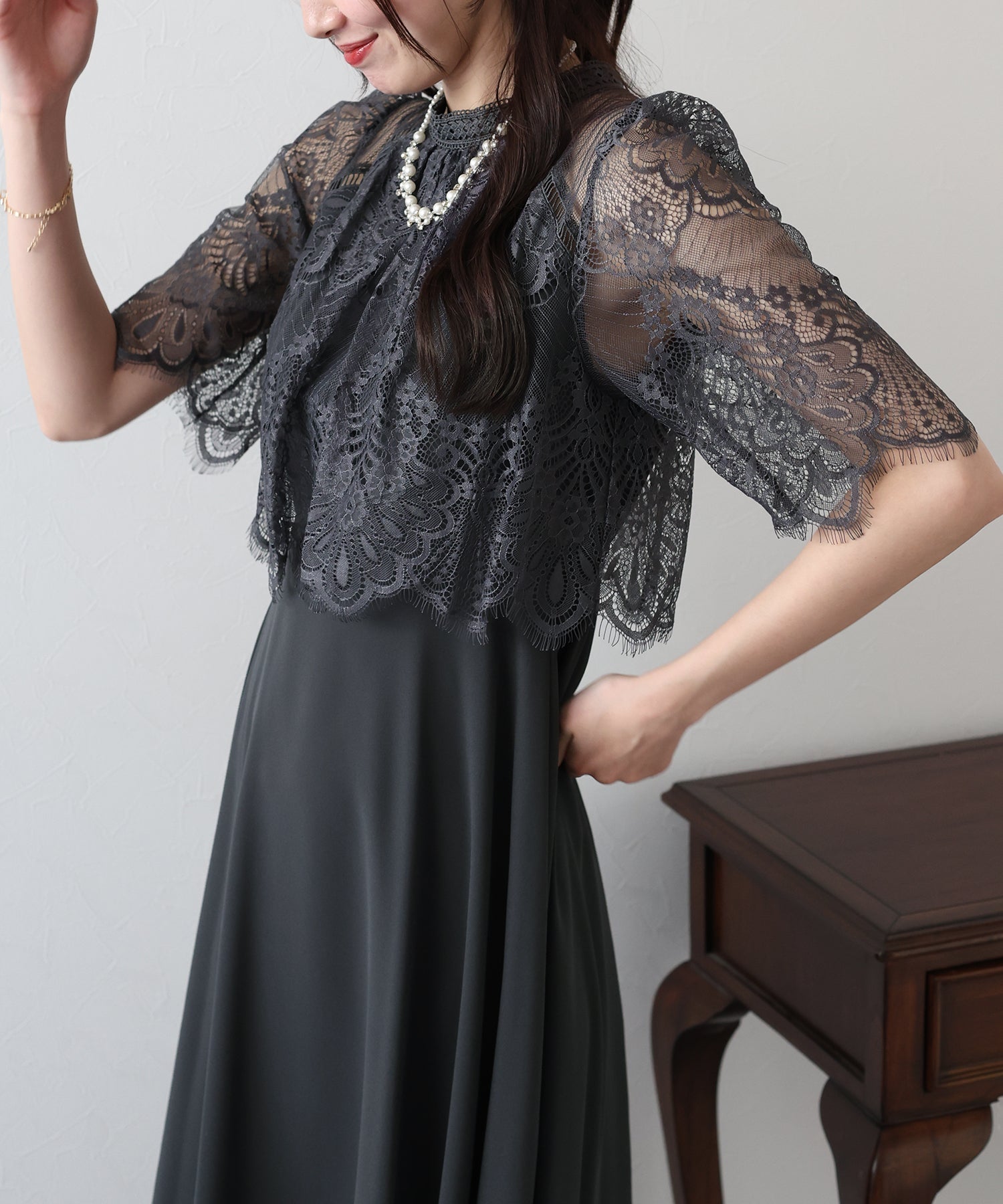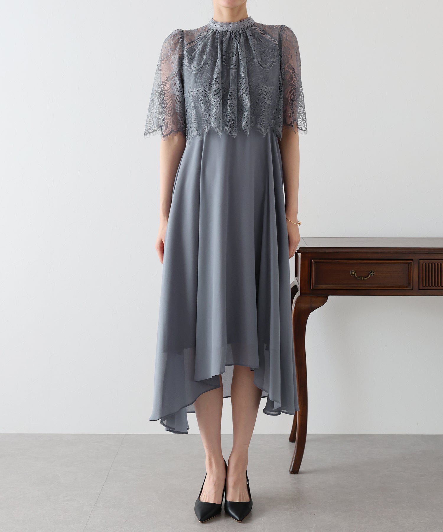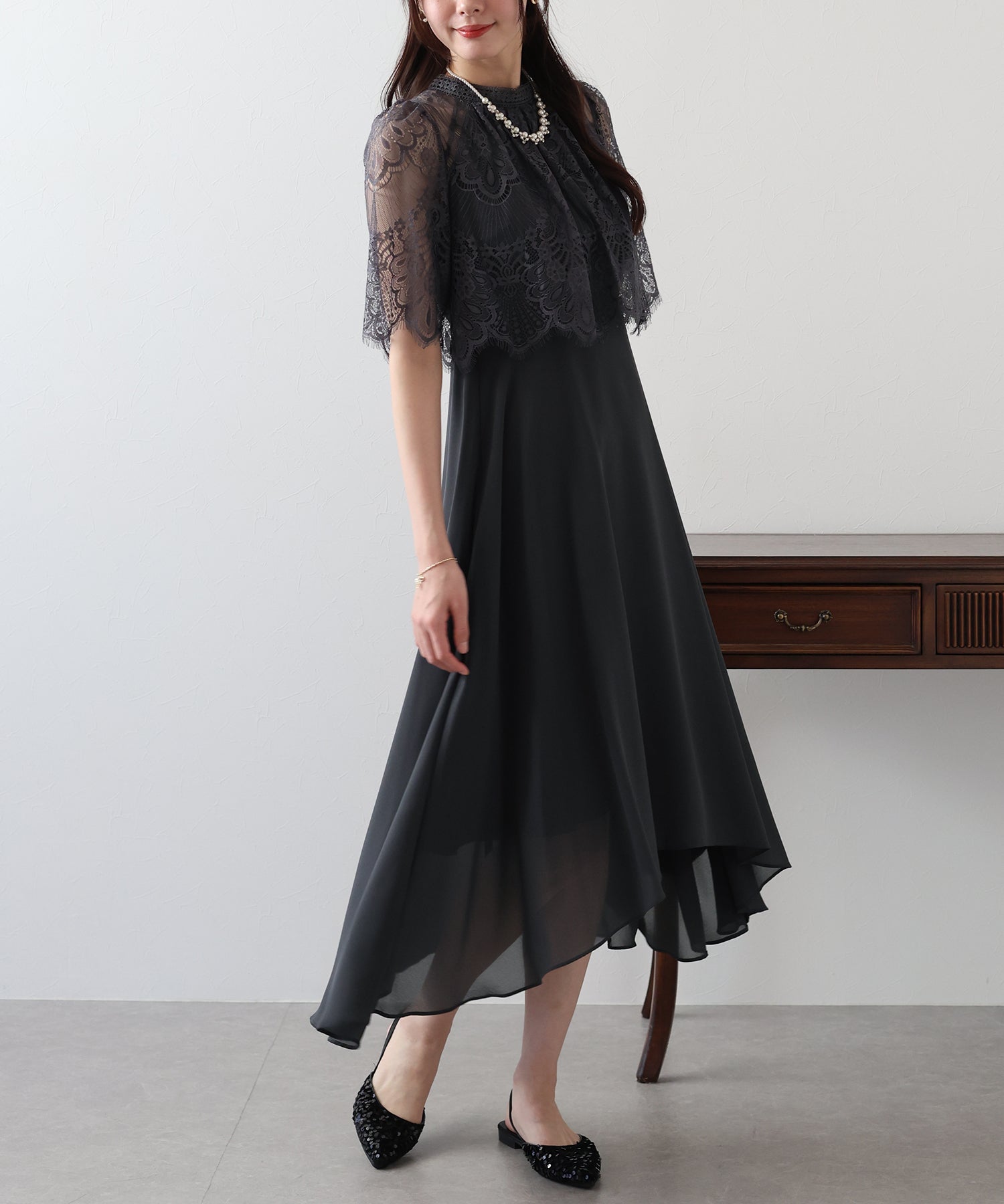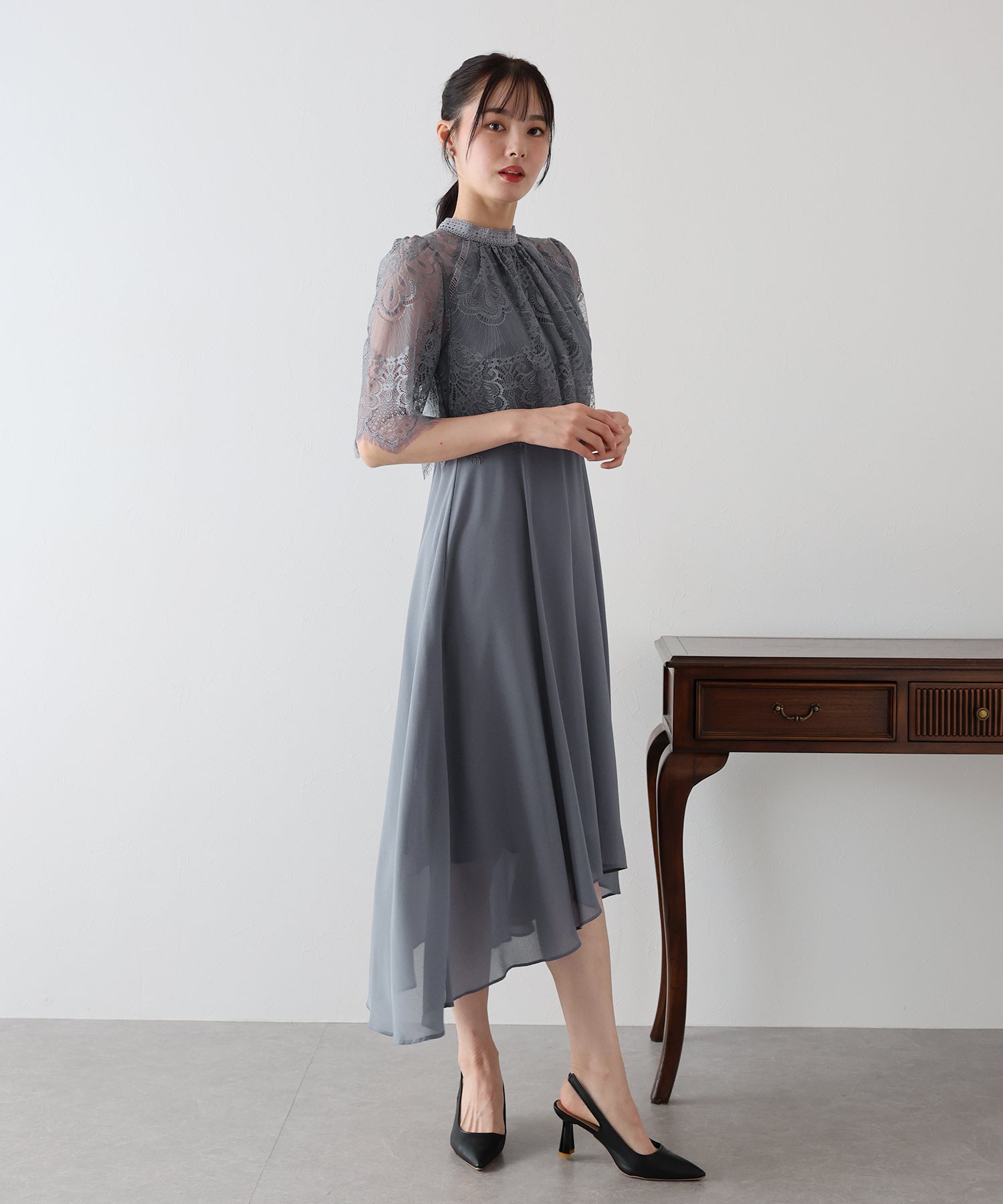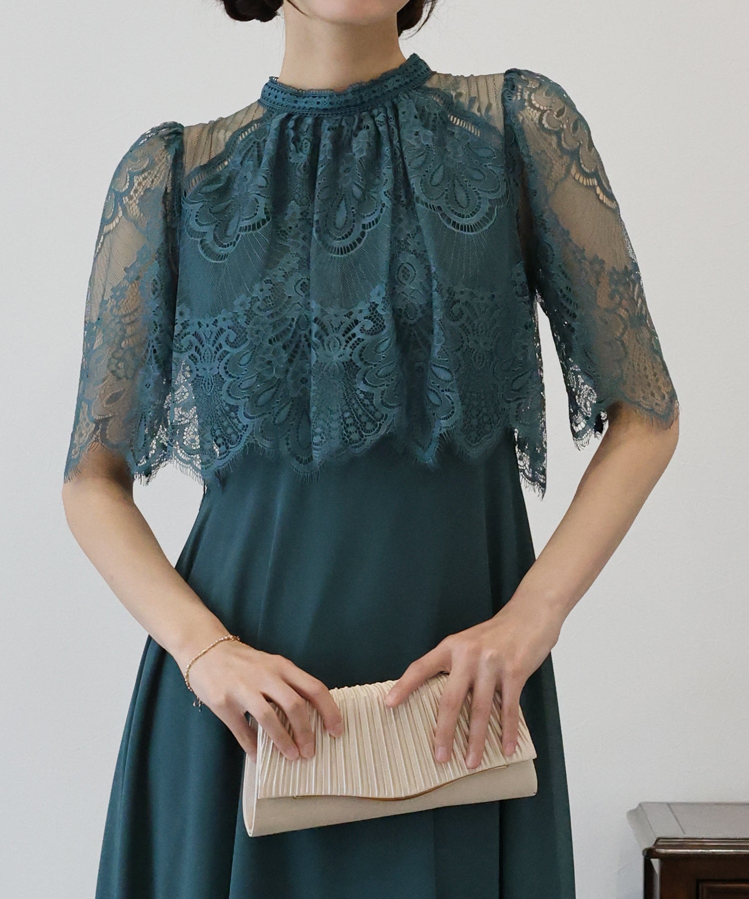 レースの組み合わせが上品なパーティーワンピース?結婚式ワンピース ?POINT 繊細なレースと清楚なボトルネック、スカートは分量を多めに取ったフレアシルエットドレス。 気になる部分をさりげなくカバーしつつ、おしゃれ感なディテールをたっぷり施しました。 レーススリーブは肘丈くらいの程よい長さで、可愛いだけでなく 二の腕などの気になる部分をカバーできるのも◎ ボトルネックで露出を抑えてあるので、大人の女性のムードにぴったり。 さりげなく透けるデコルテ部分で、「抜け感」をプラス。 スカート部分は、フレアロングスカートが足の動きに合わせ様々な表情を作り出します。 前後で丈の違うフィッシュテールタイプなので 可愛らしさに加えエレガントな雰囲気も感じられるドレスです。