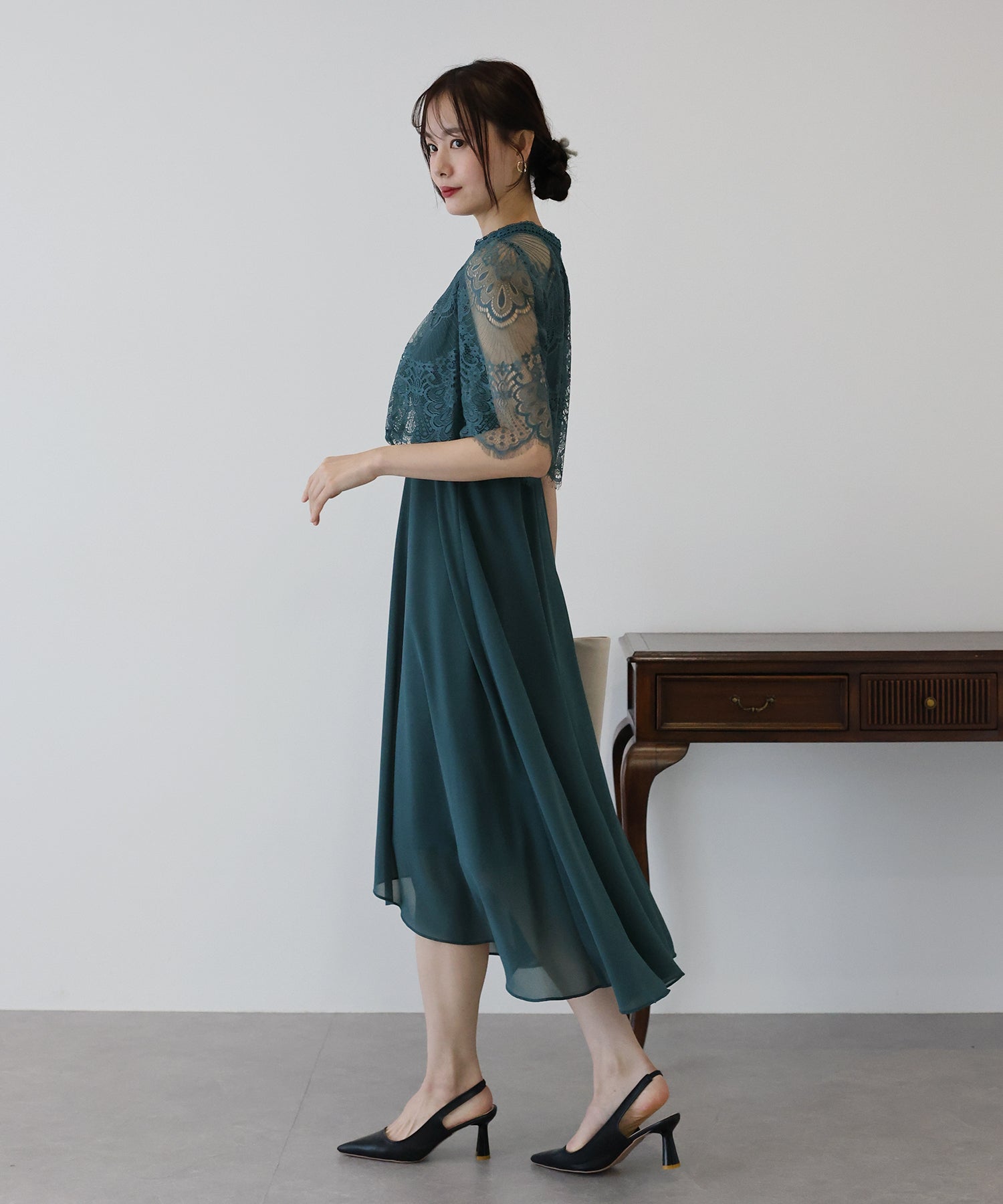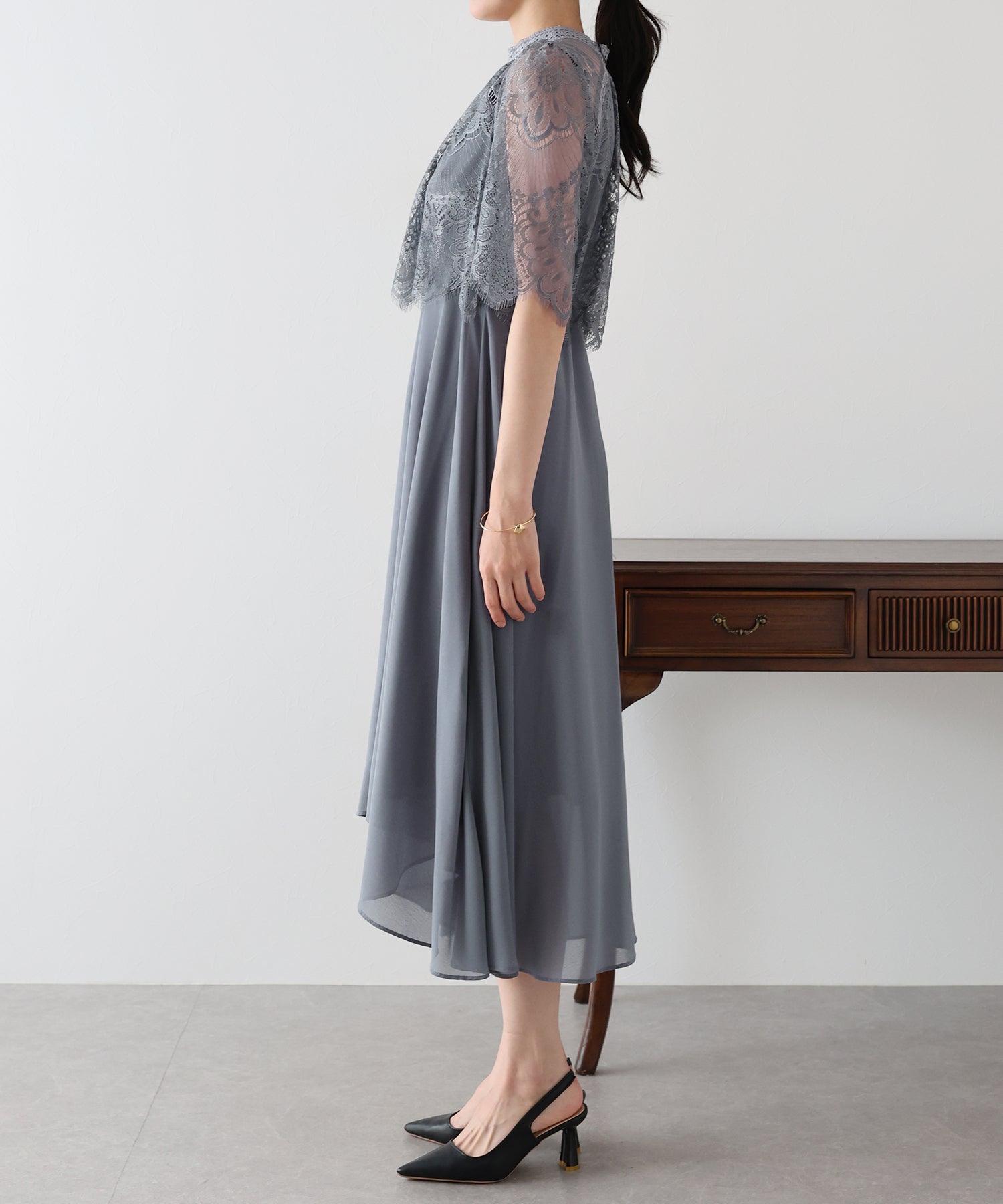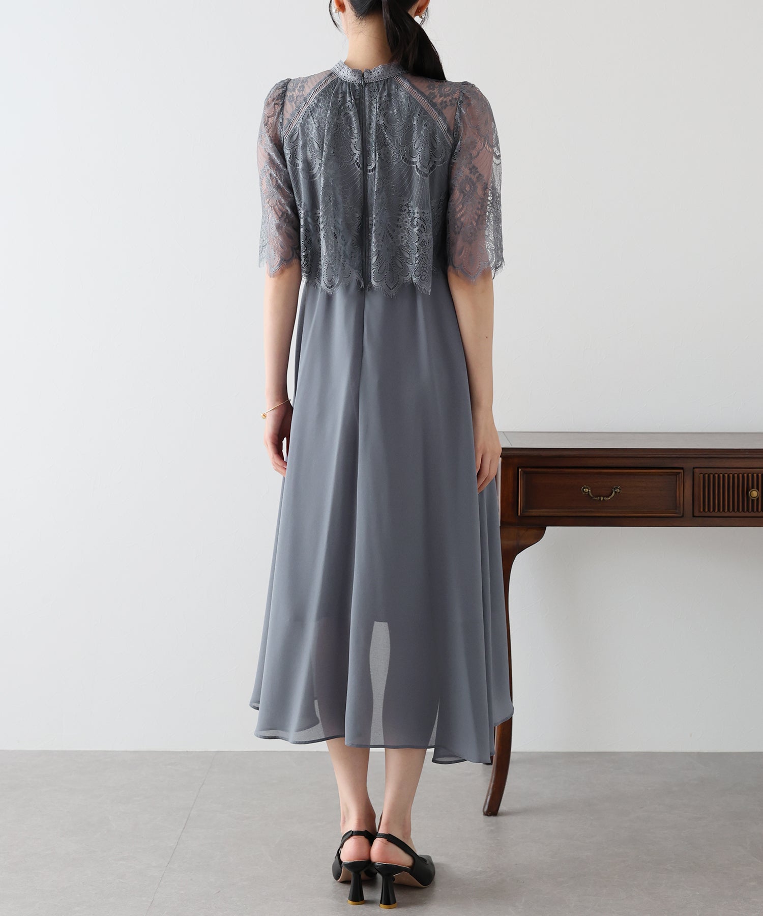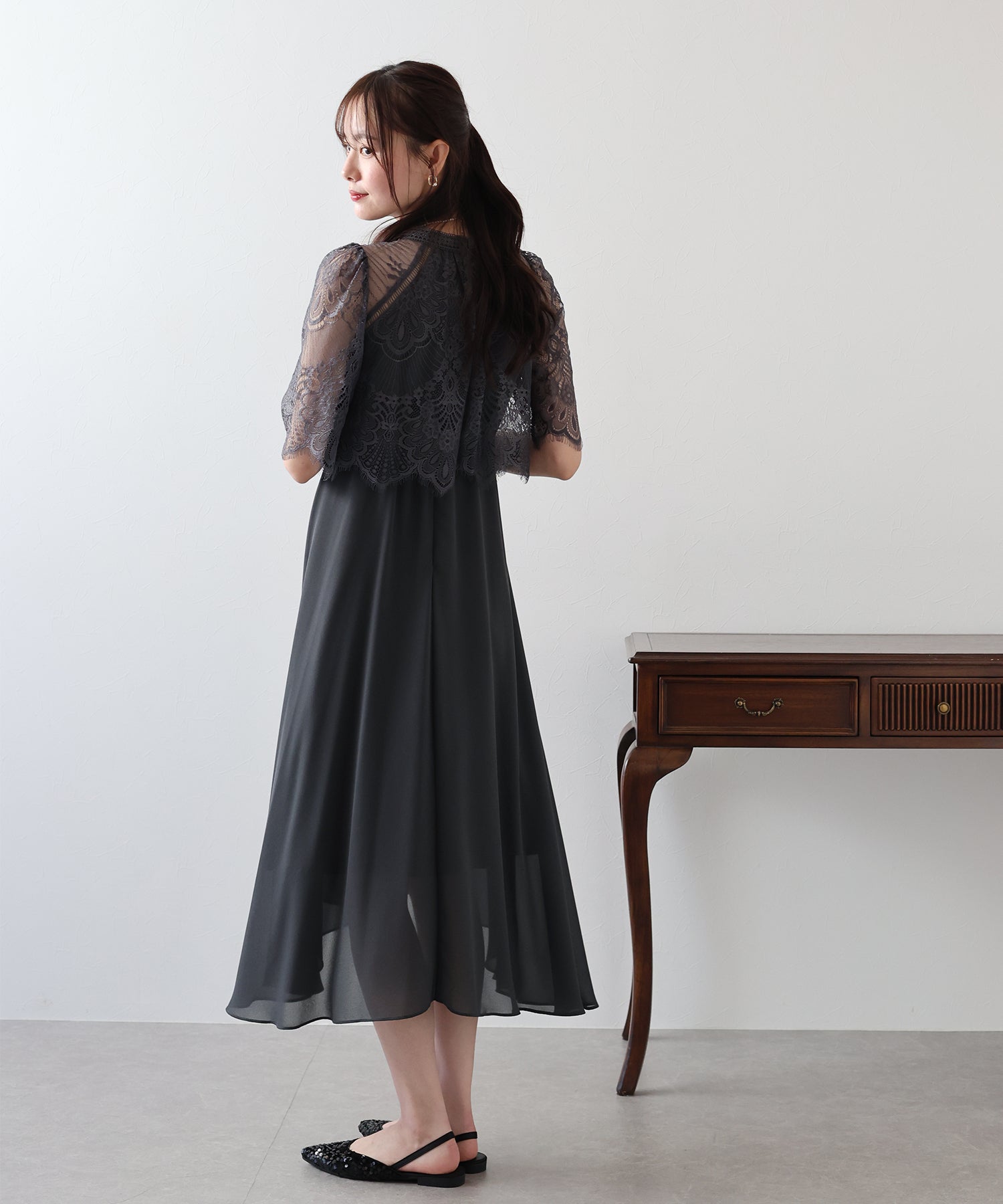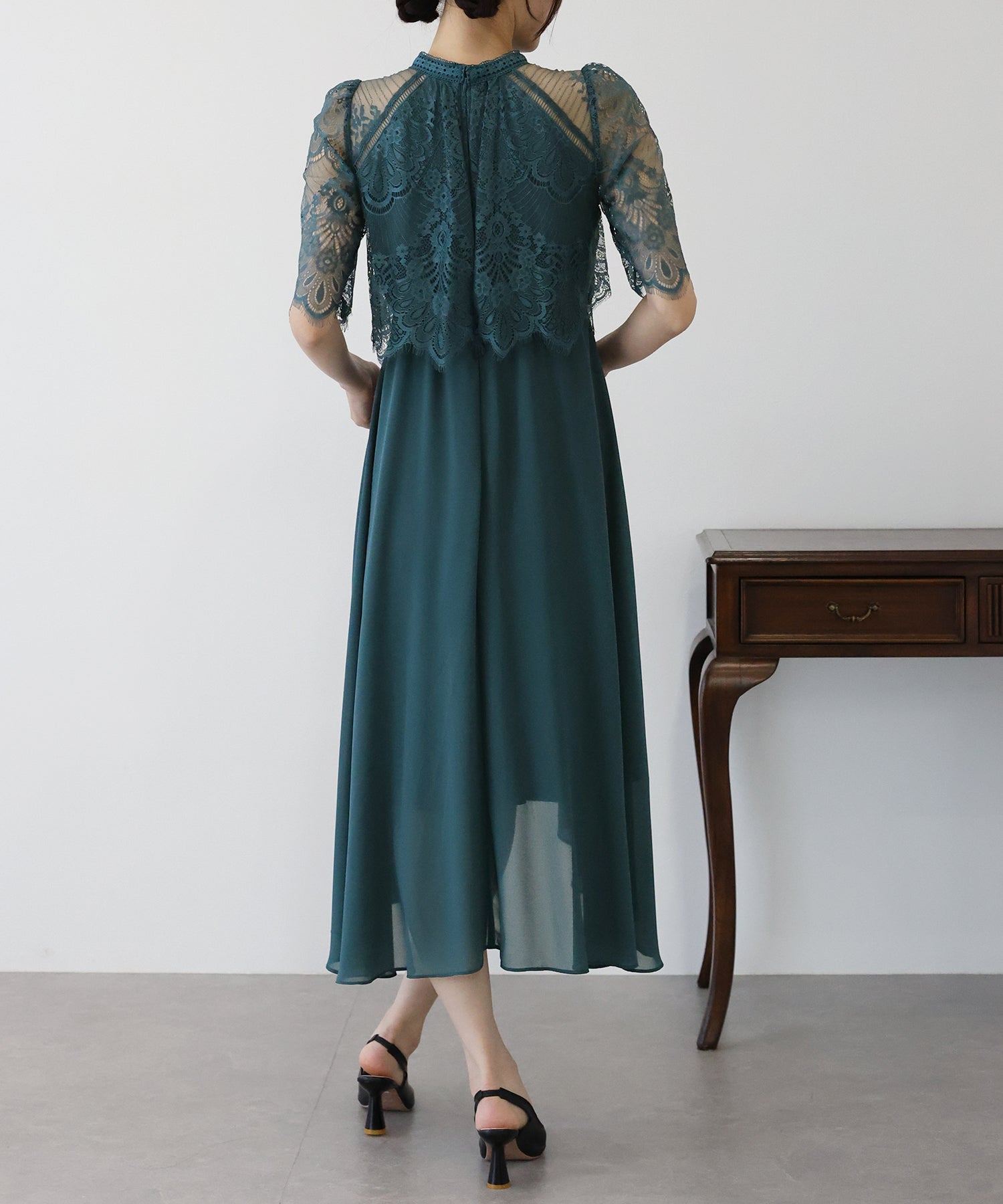 レースの組み合わせが上品なパーティーワンピース?結婚式ワンピース ?POINT 繊細なレースと清楚なボトルネック、スカートは分量を多めに取ったフレアシルエットドレス。 気になる部分をさりげなくカバーしつつ、おしゃれ感なディテールをたっぷり施しました。 レーススリーブは肘丈くらいの程よい長さで、可愛いだけでなく 二の腕などの気になる部分をカバーできるのも◎ ボトルネックで露出を抑えてあるので、大人の女性のムードにぴったり。 さりげなく透けるデコルテ部分で、「抜け感」をプラス。 スカート部分は、フレアロングスカートが足の動きに合わせ様々な表情を作り出します。 前後で丈の違うフィッシュテールタイプなので 可愛らしさに加えエレガントな雰囲気も感じられるドレスです。