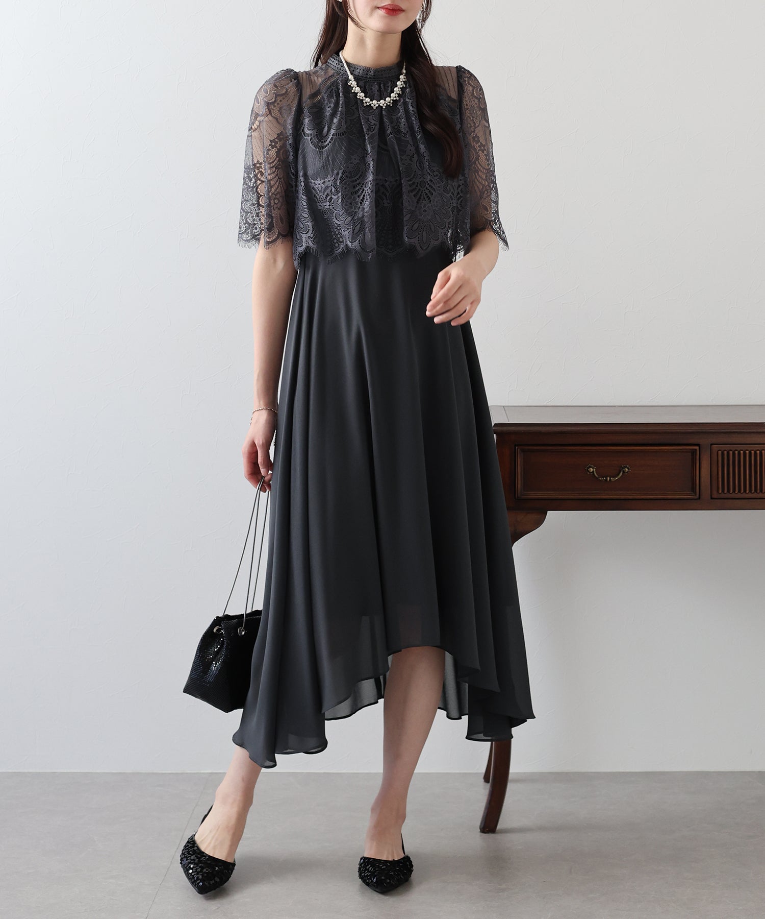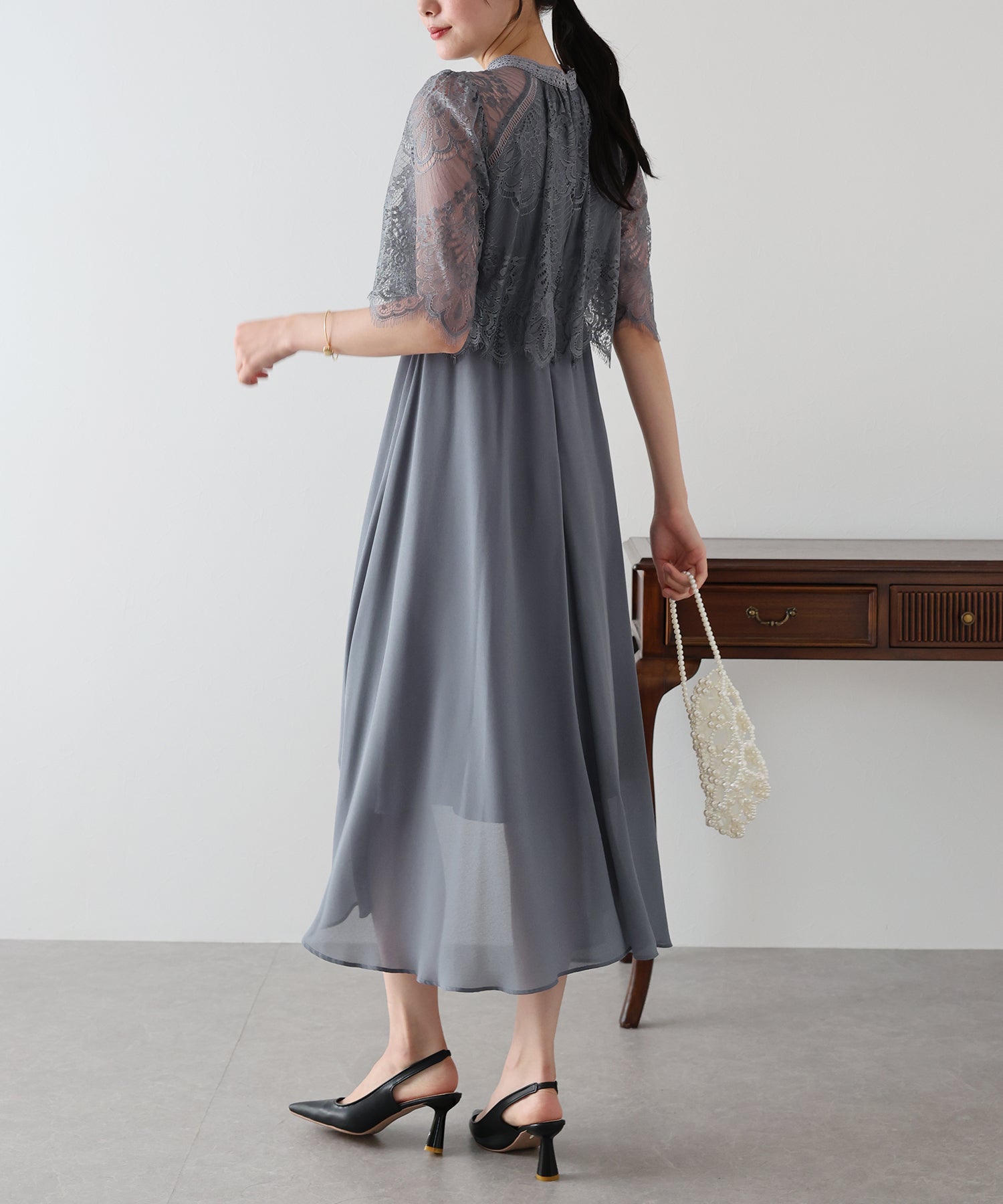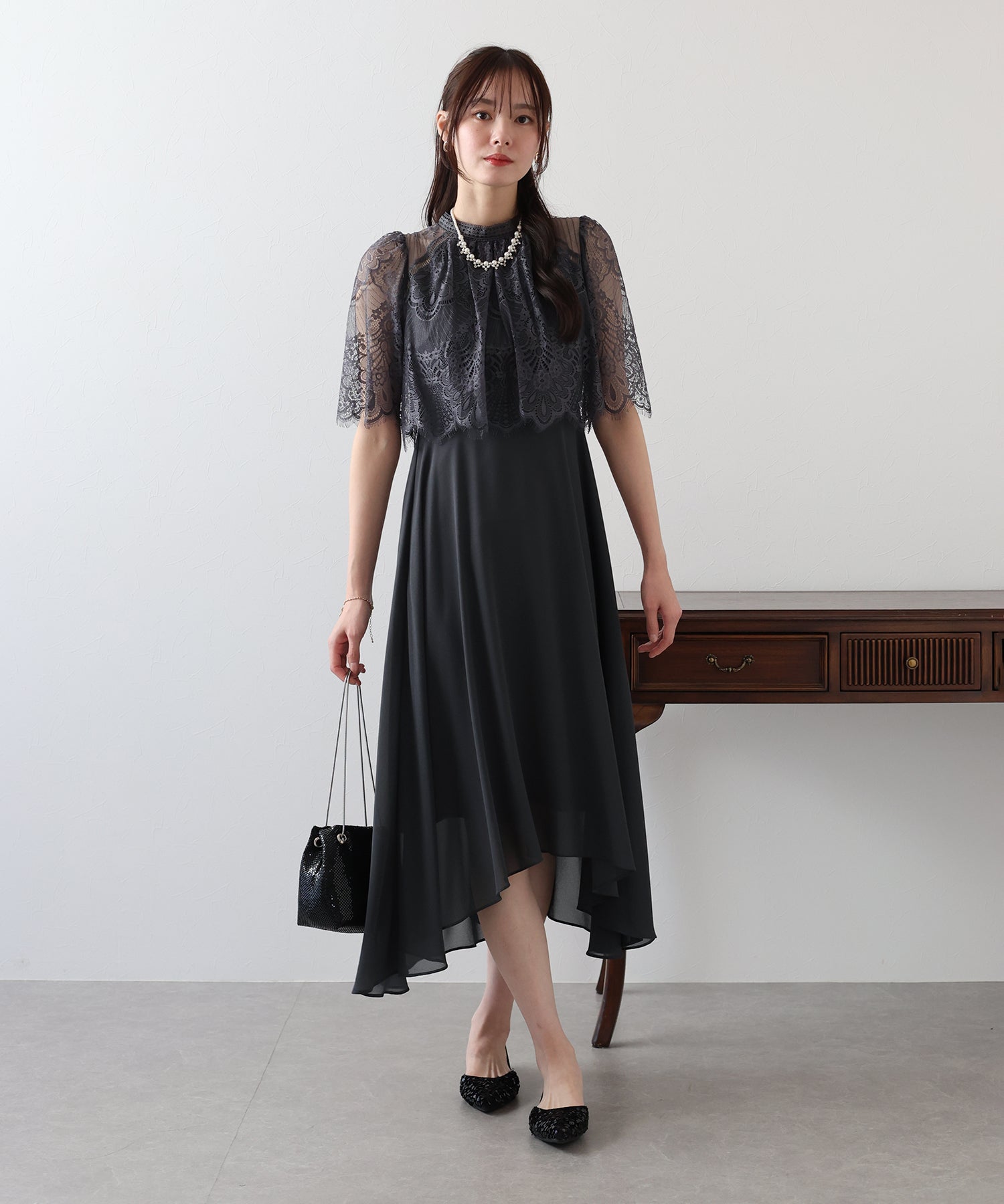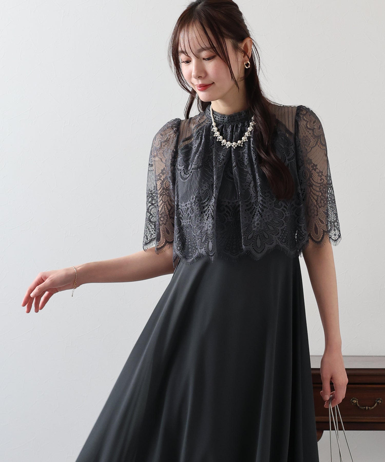 ?STYLING 結婚式の披露宴にはもちろん、二次会などのパーティードレスや謝恩会?同窓会など大切な日にもぴったり。 パーティーシーンではパンプスやミニバッグで小さめにまとめて、 ディナーやお食事会にはワンピース一枚でブーツなどと合わせたコーディネートもおすすめです。