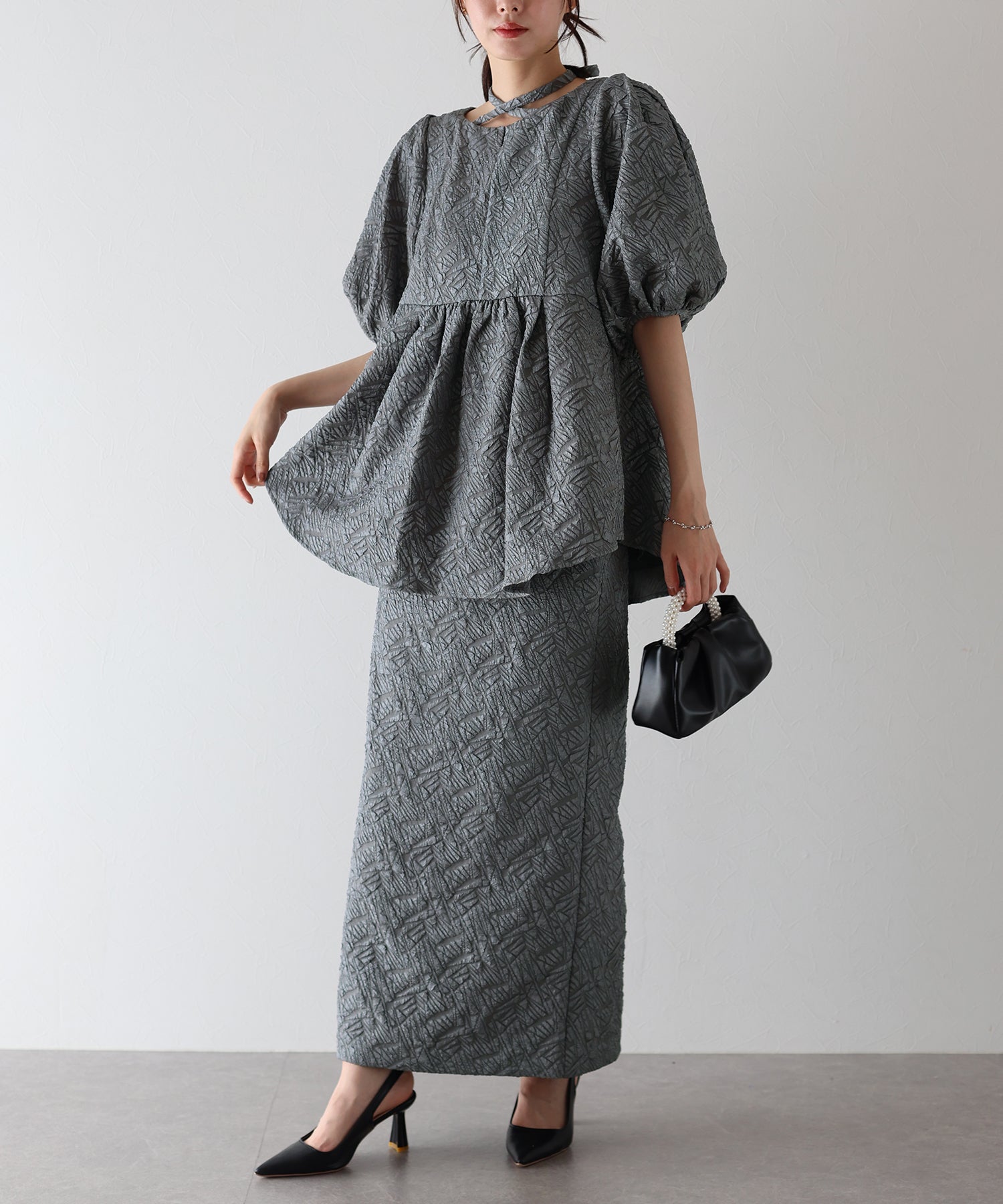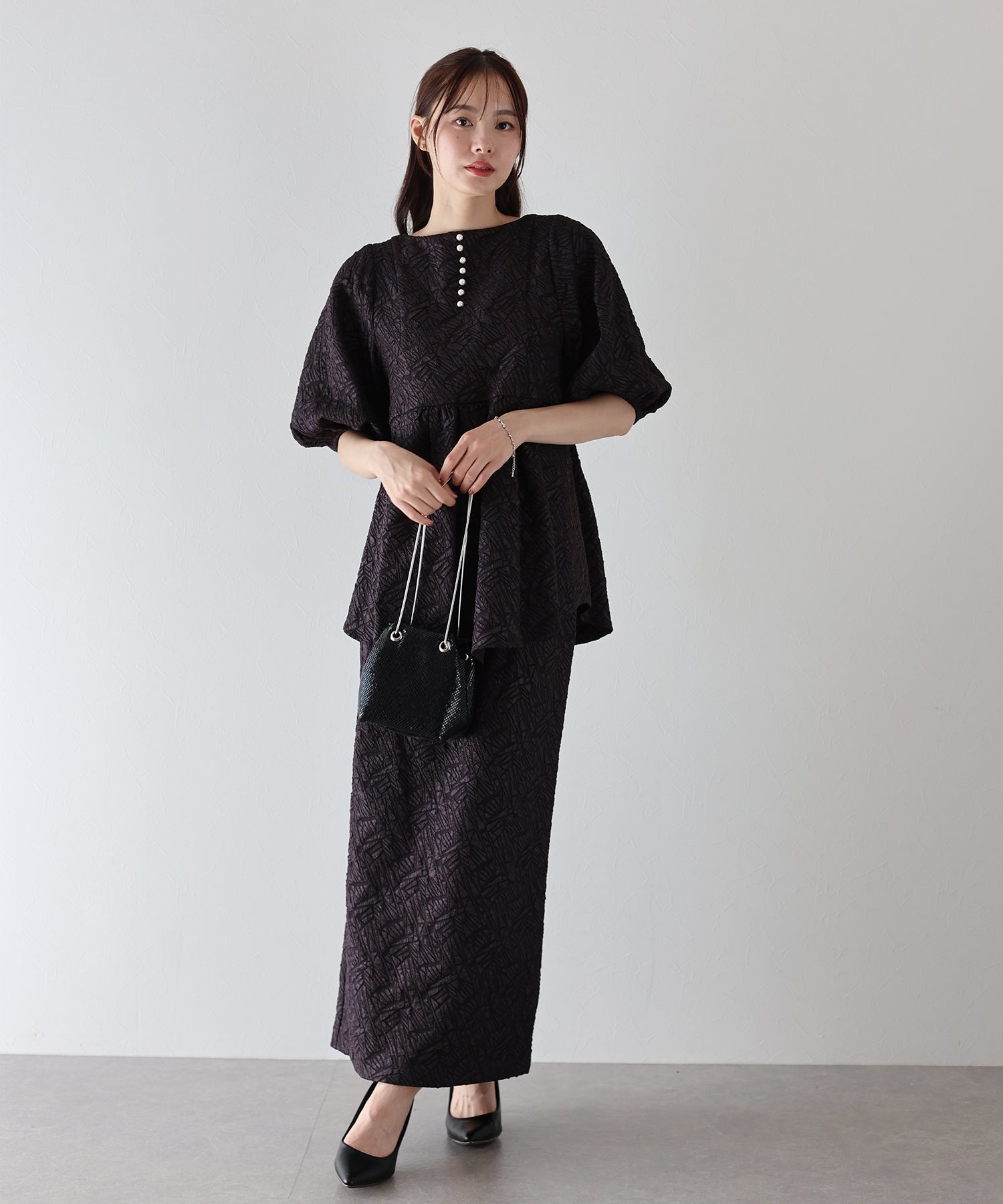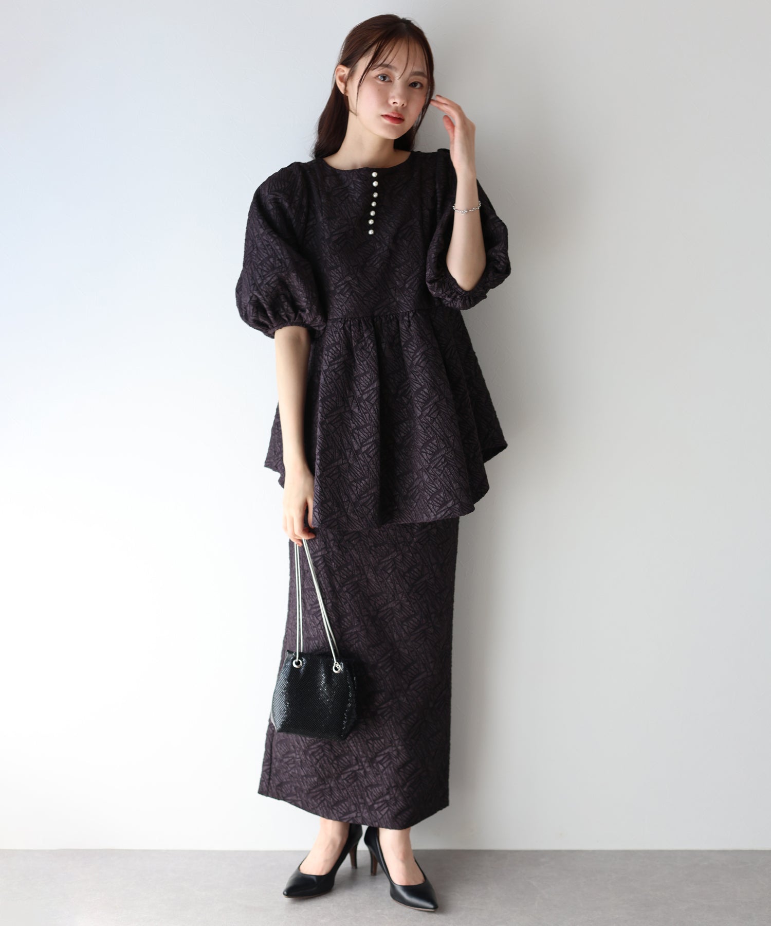 きちんと感を出して着たい結婚式や成人式、謝恩会などのパーティーシーンにはセットアップで着てパンプスやミニバッグと合わせて頂くのがおすすめです。