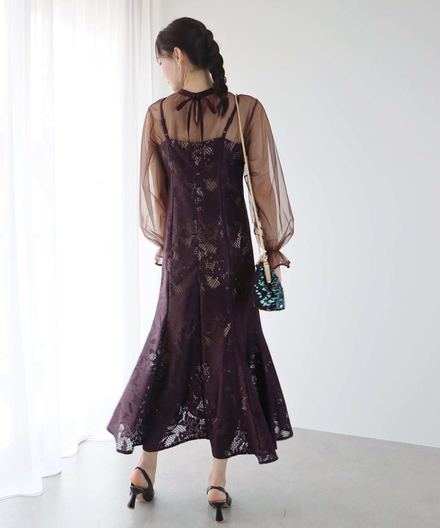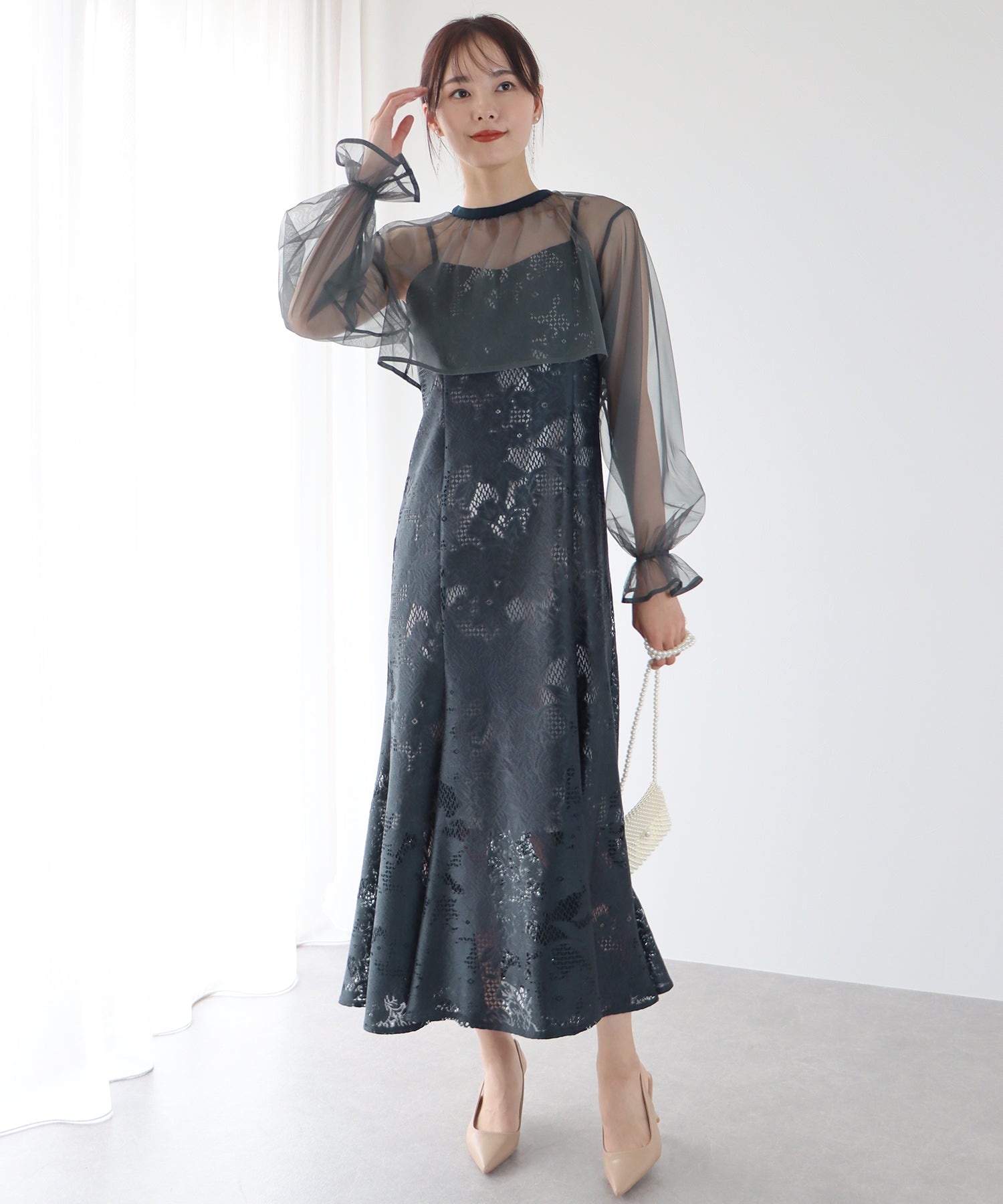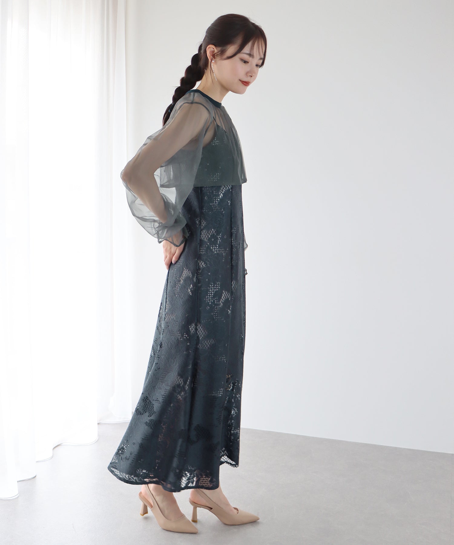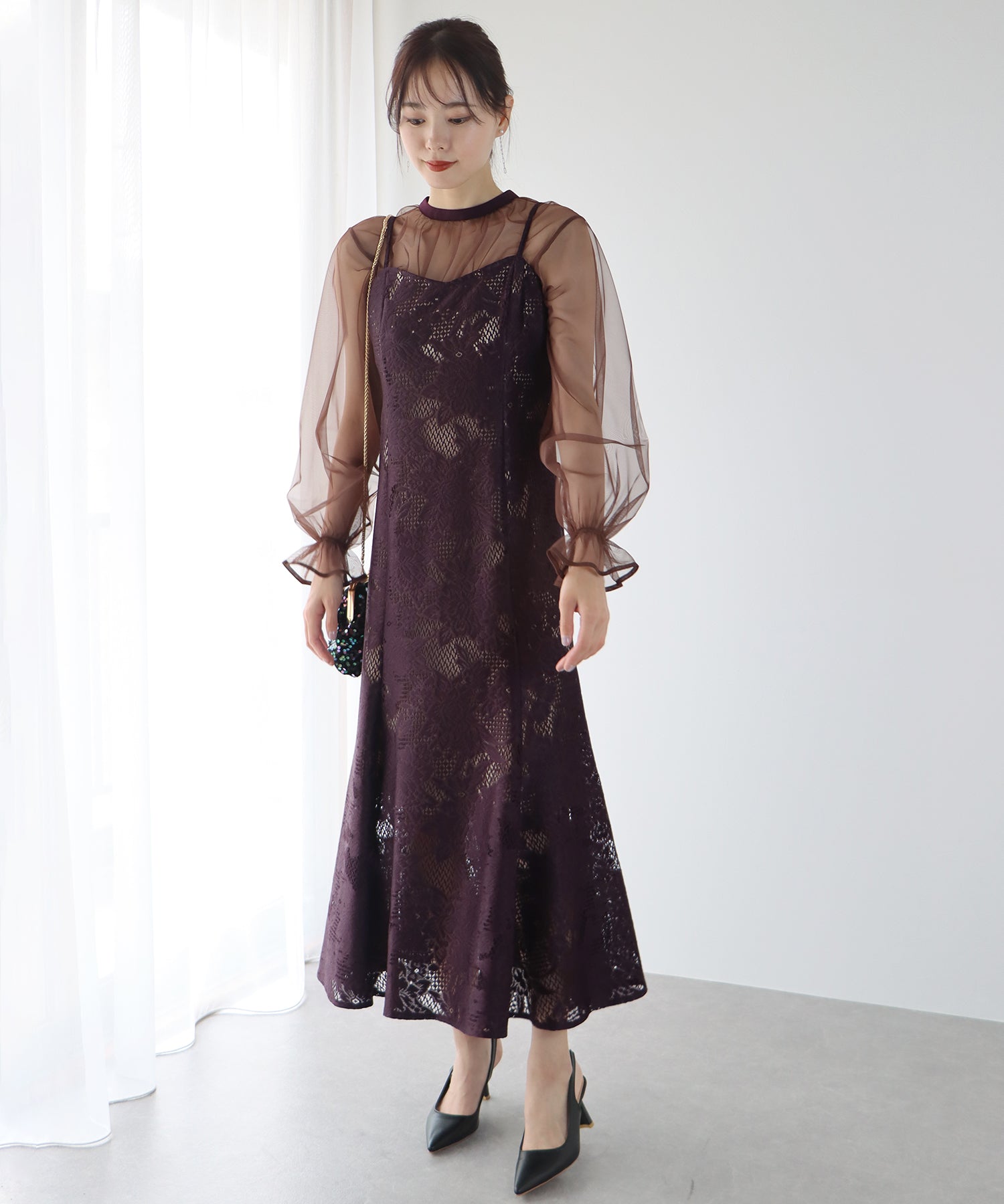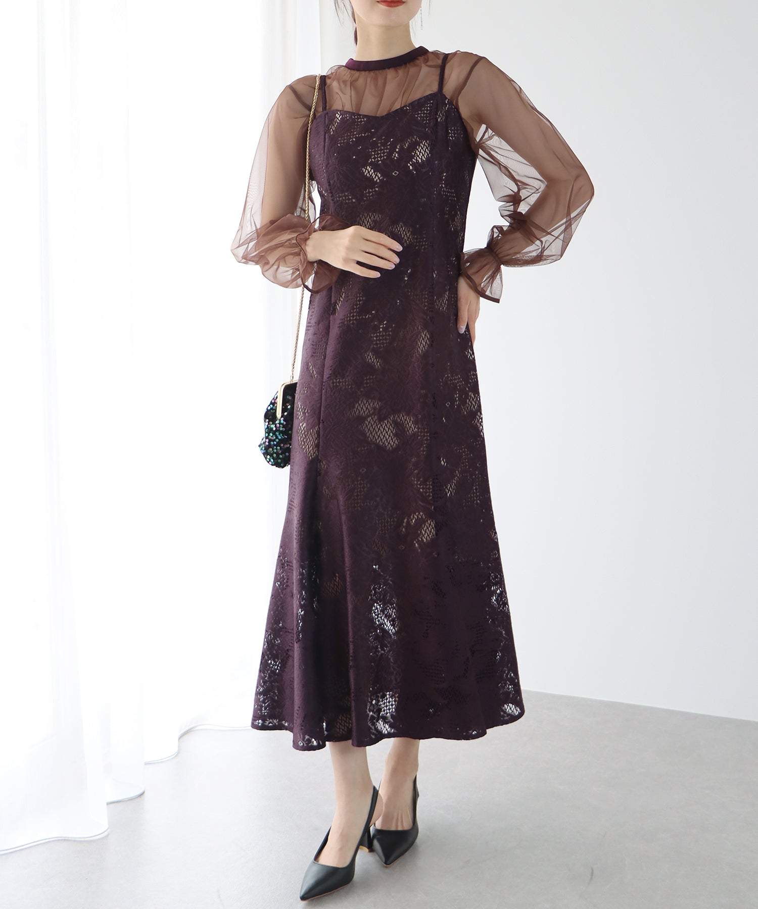 - 【SALE】レーススリットスリーブロング丈パーティードレス