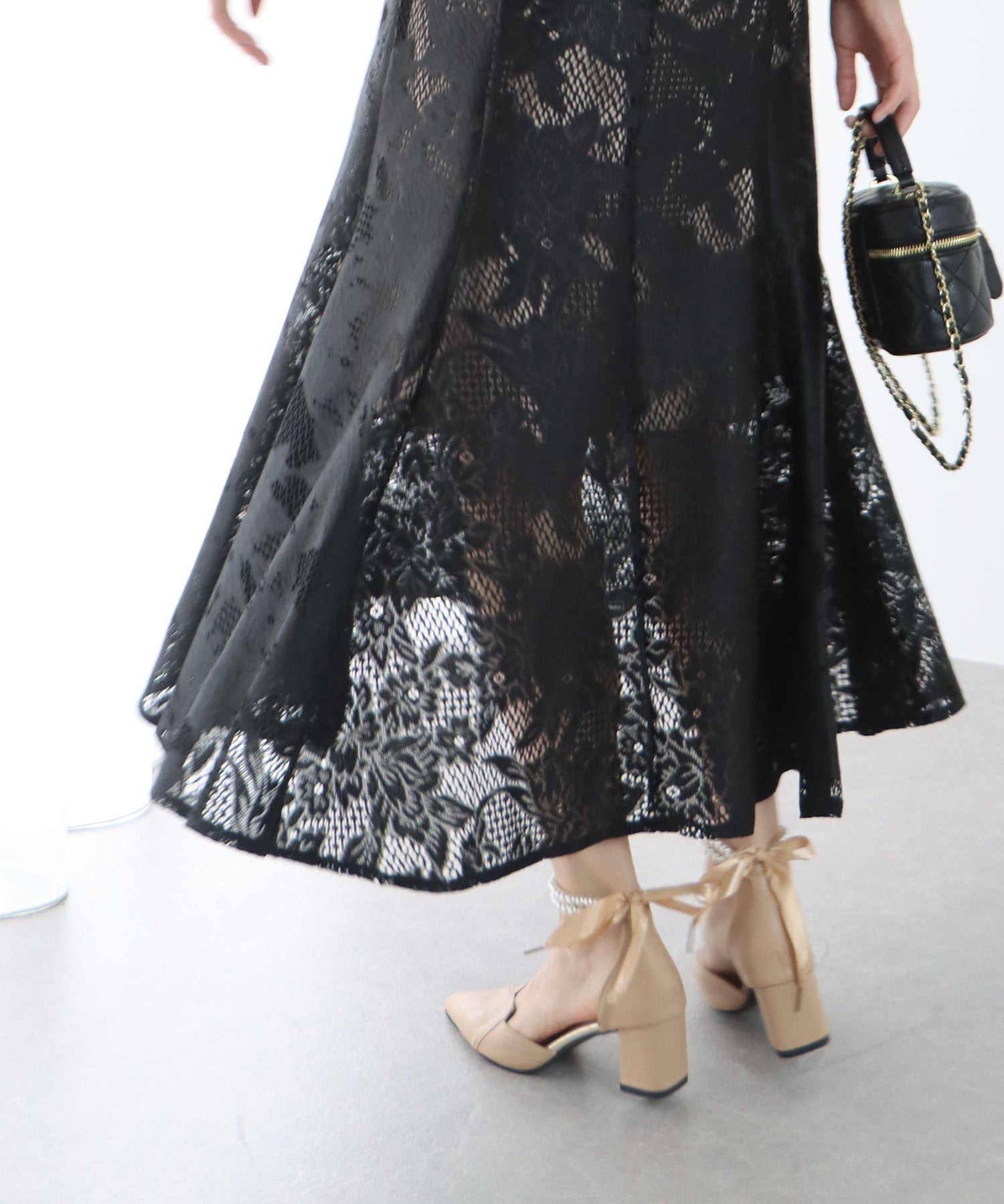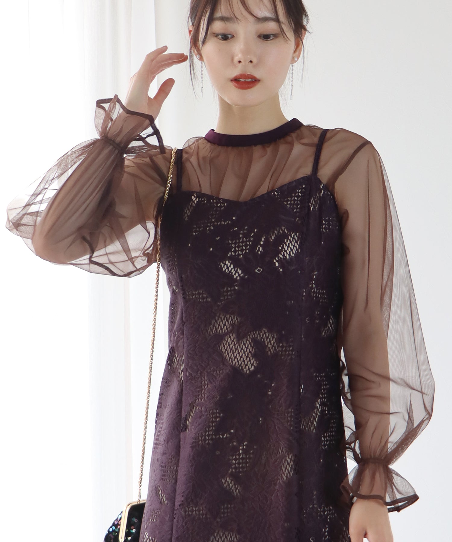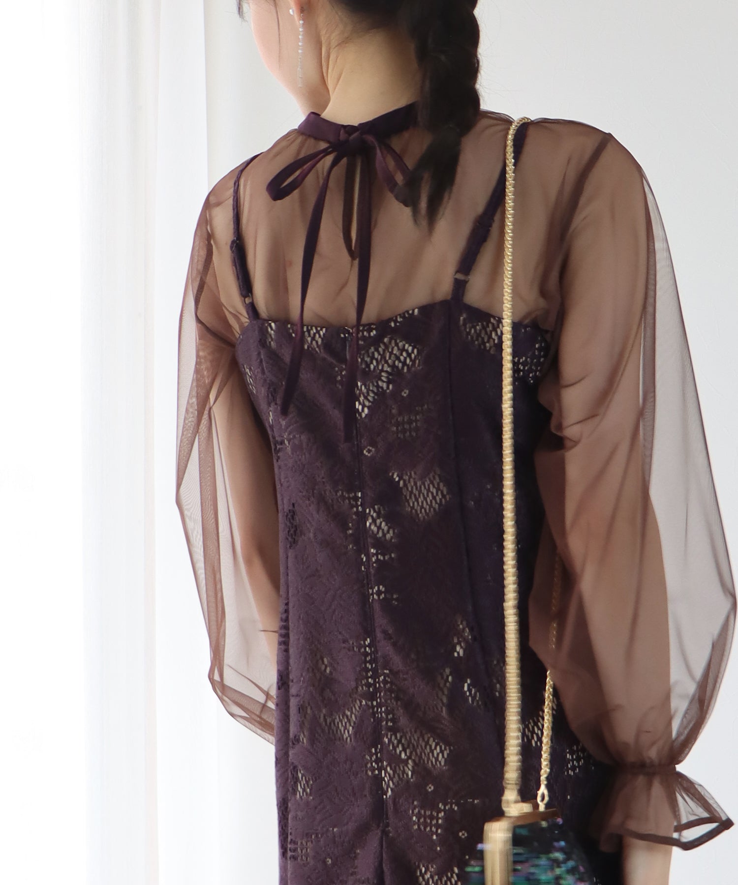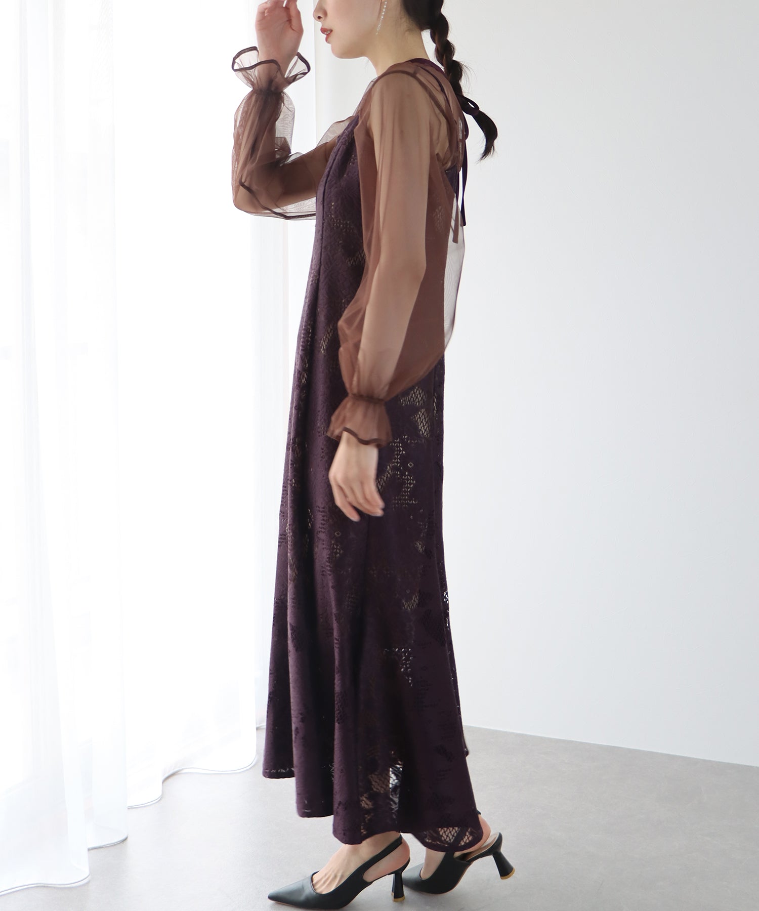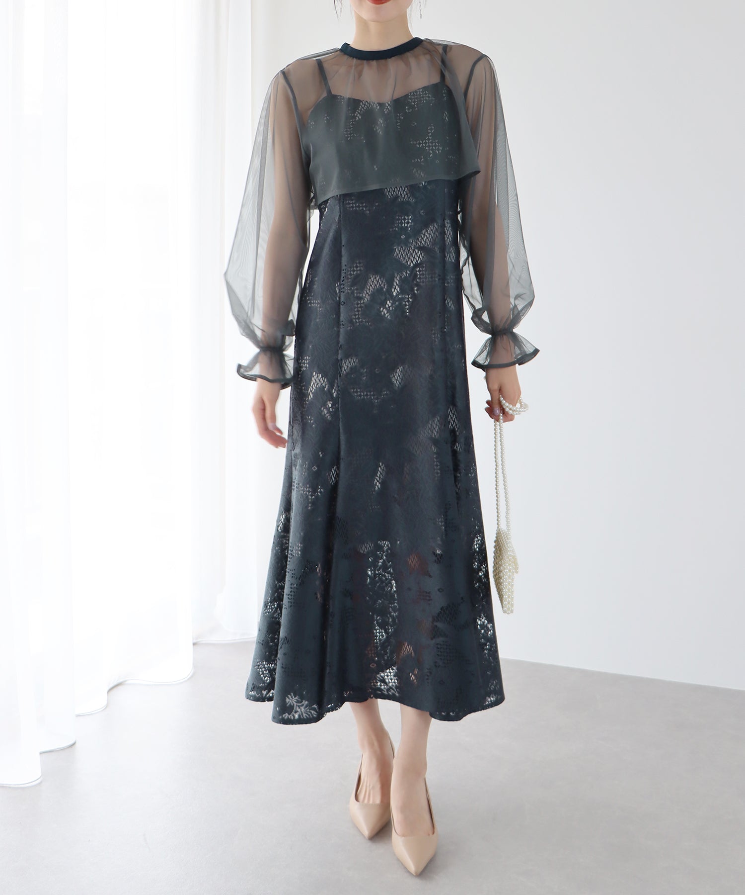 - 【SALE】レーススリットスリーブロング丈パーティードレス