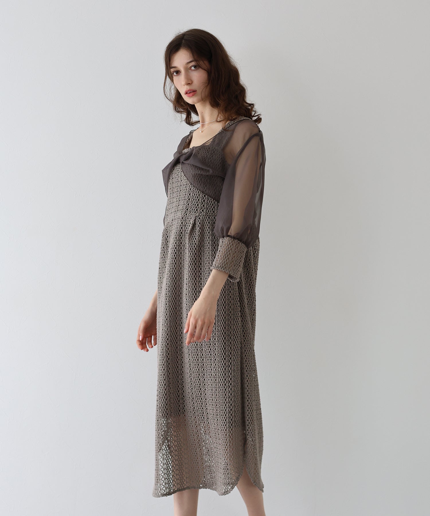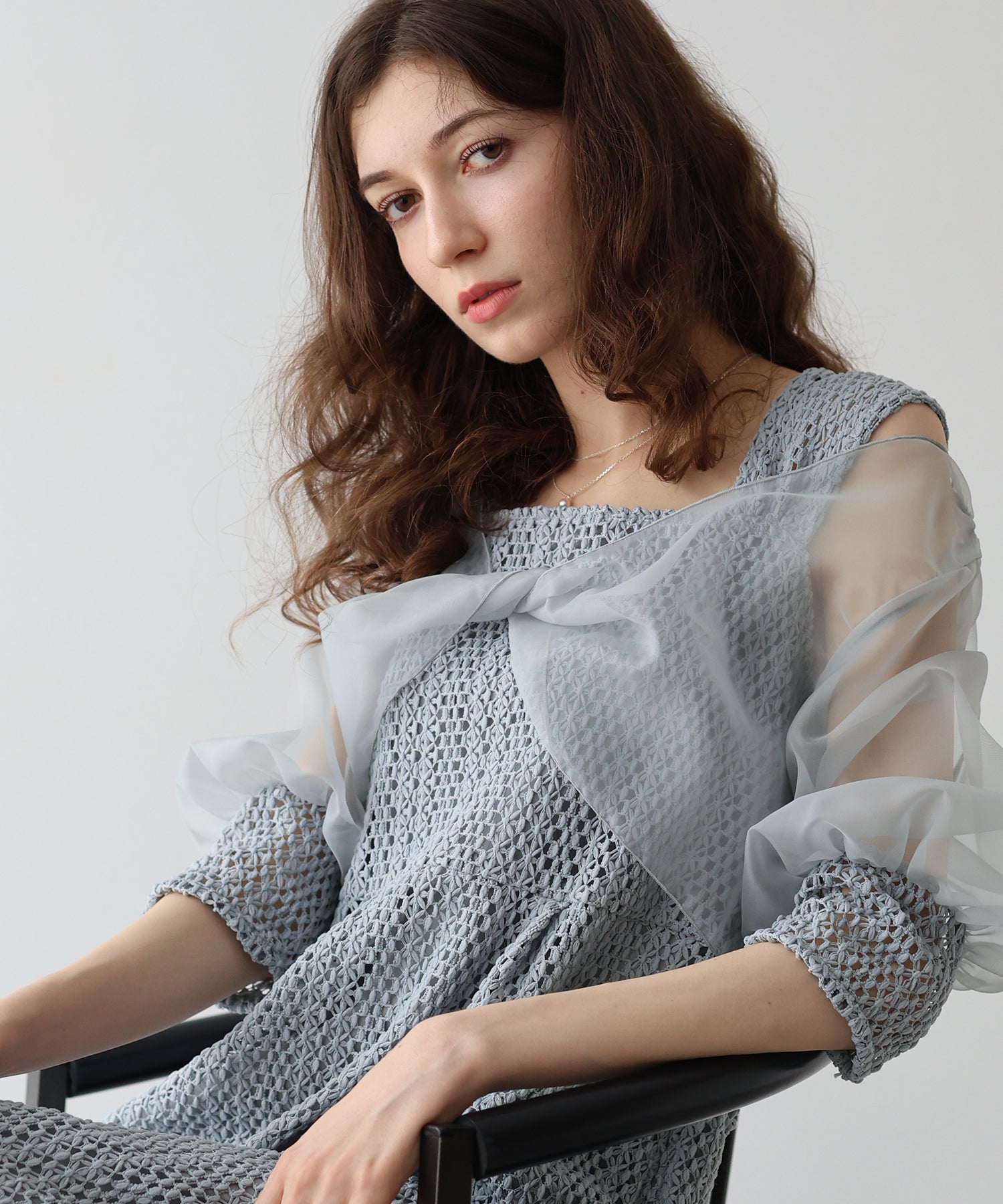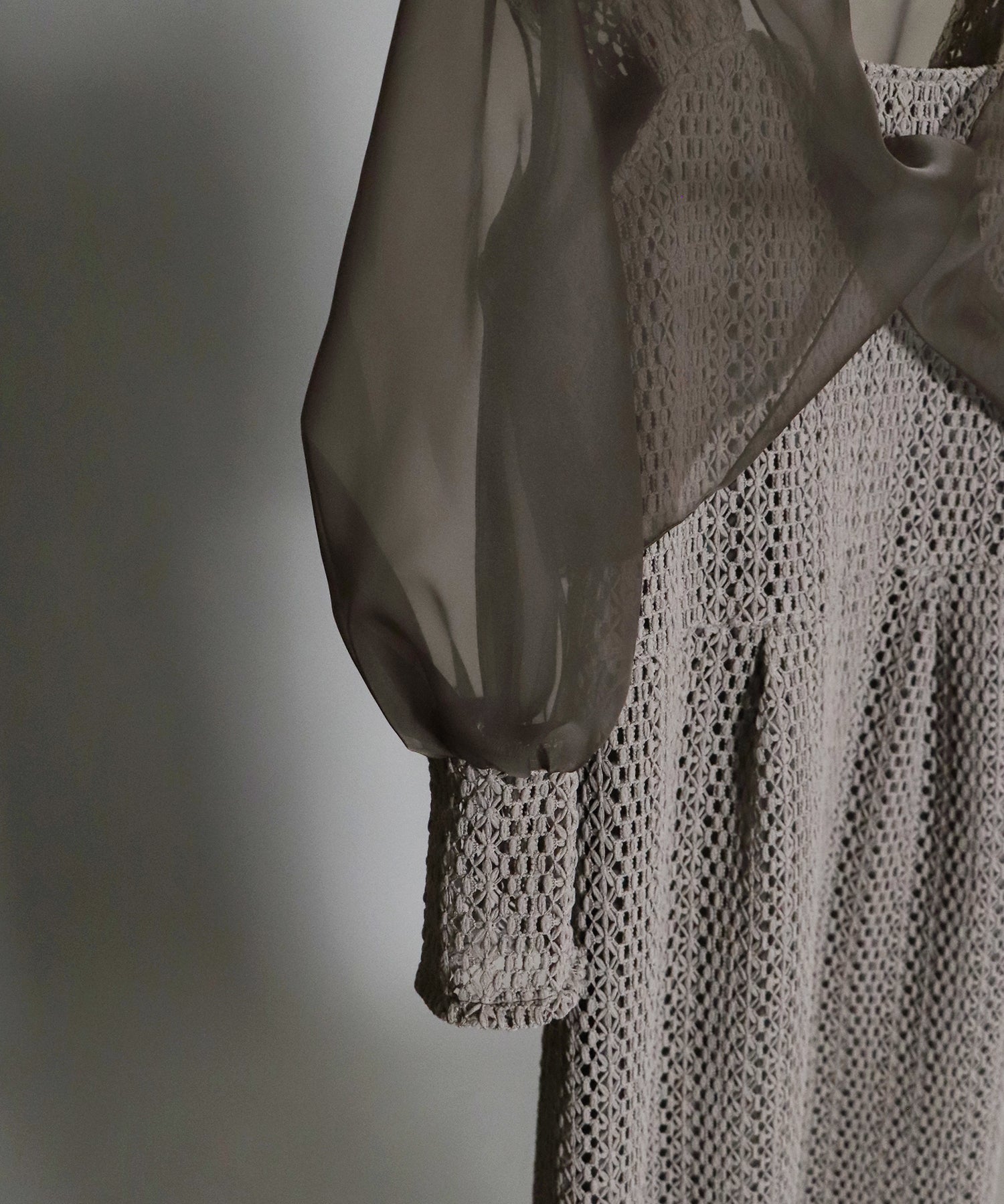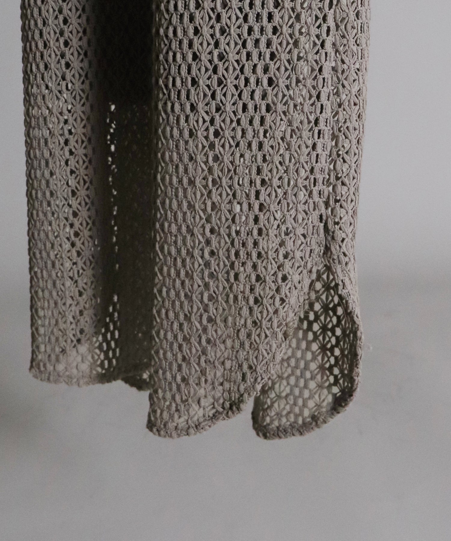 ?FABRIC ワンピースにはローゲージで編んだざっくりとした網み目の手編み風チェーンレースを使用。 一般的なレース機では表現が難しく、特殊な編み機を使用し表面にふんわりとした立体感を持たせているのが特徴です。