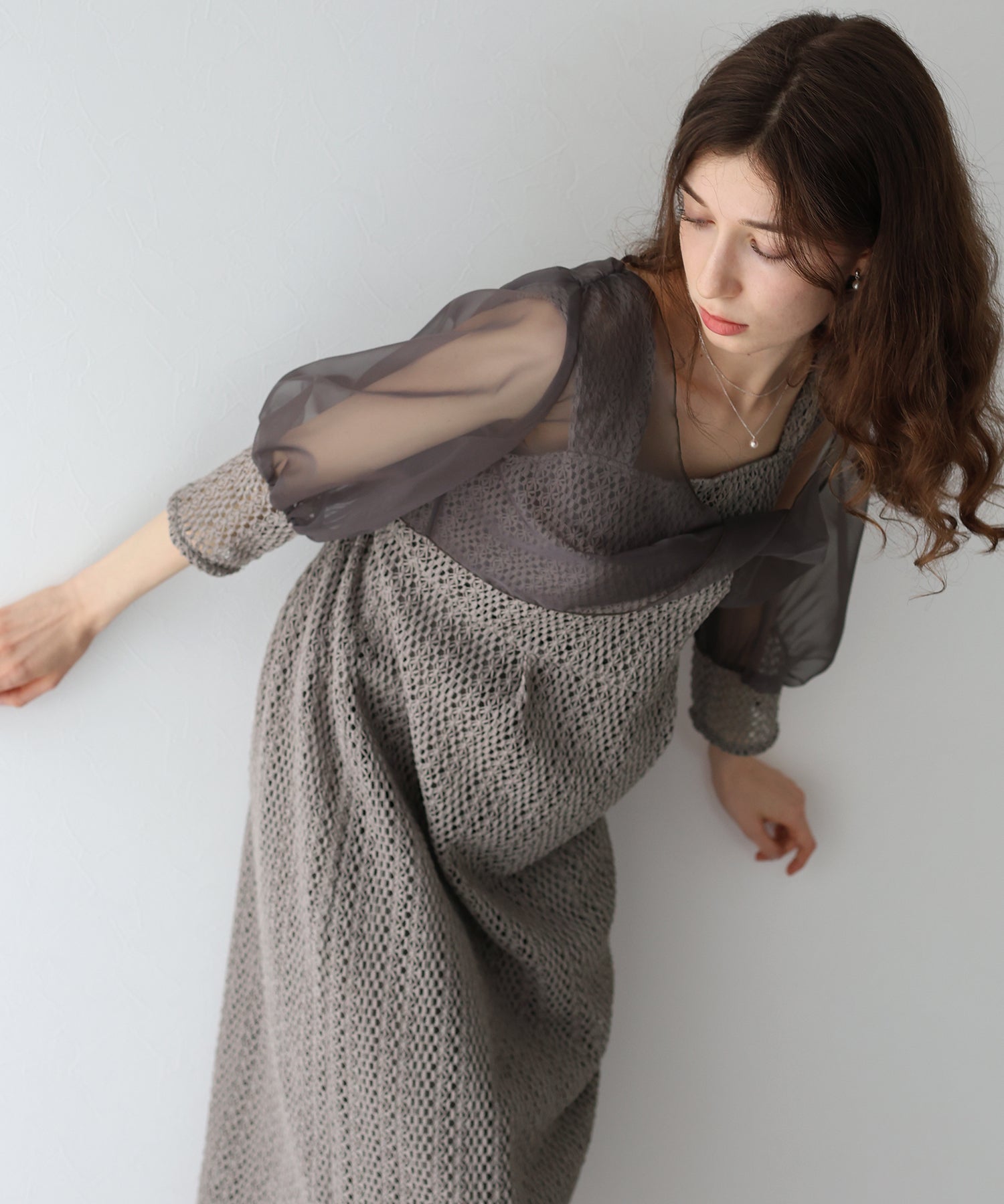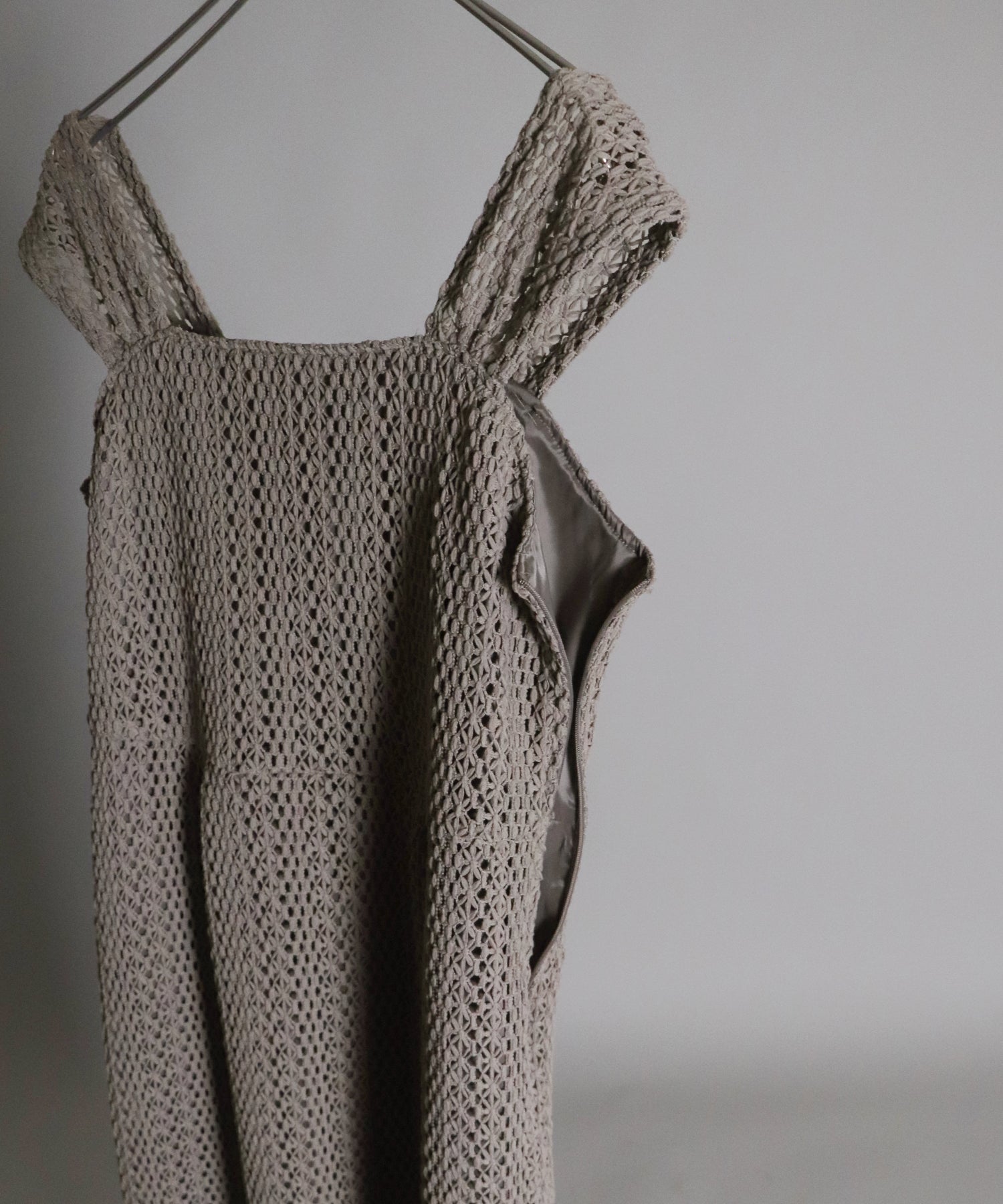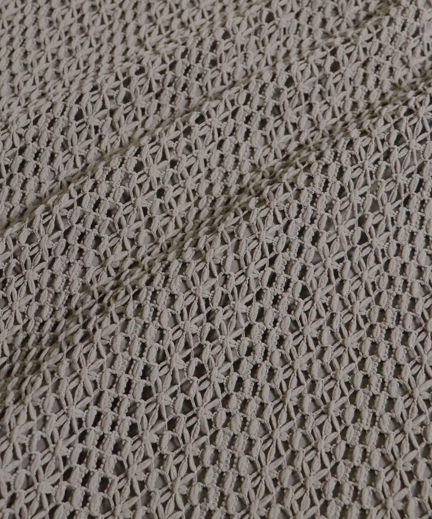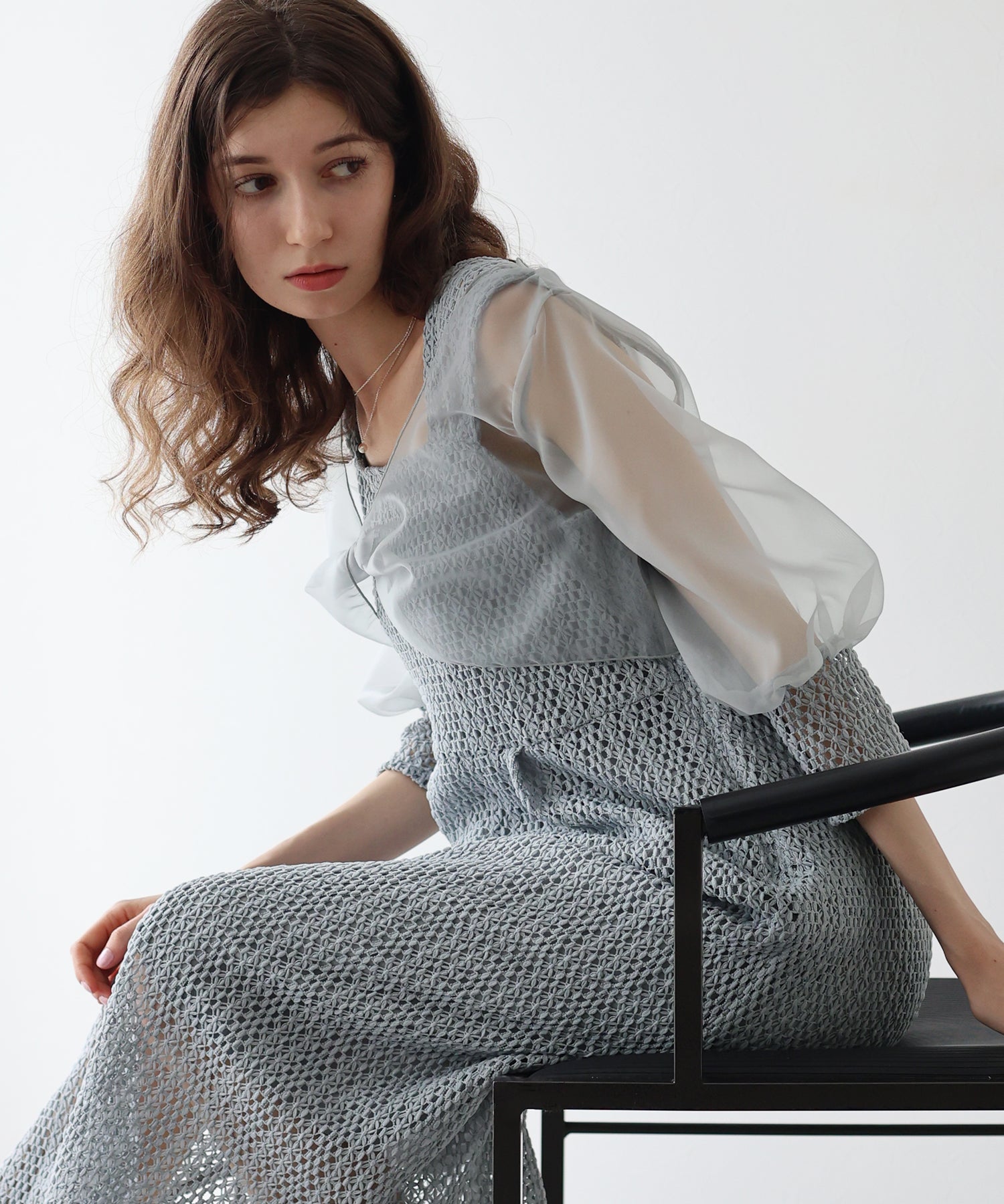 ?FABRIC ワンピースにはローゲージで編んだざっくりとした網み目の手編み風チェーンレースを使用。 一般的なレース機では表現が難しく、特殊な編み機を使用し表面にふんわりとした立体感を持たせているのが特徴です。