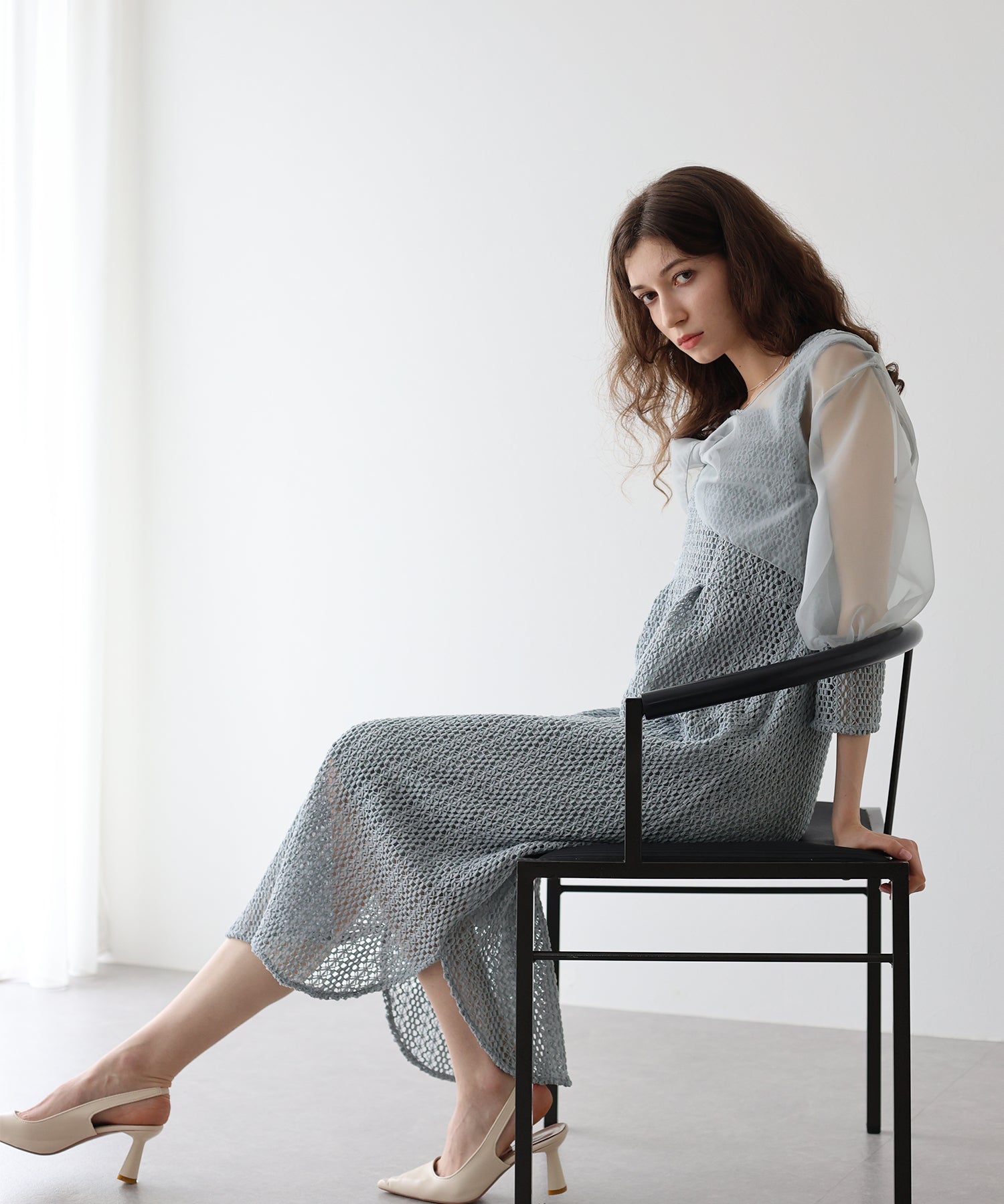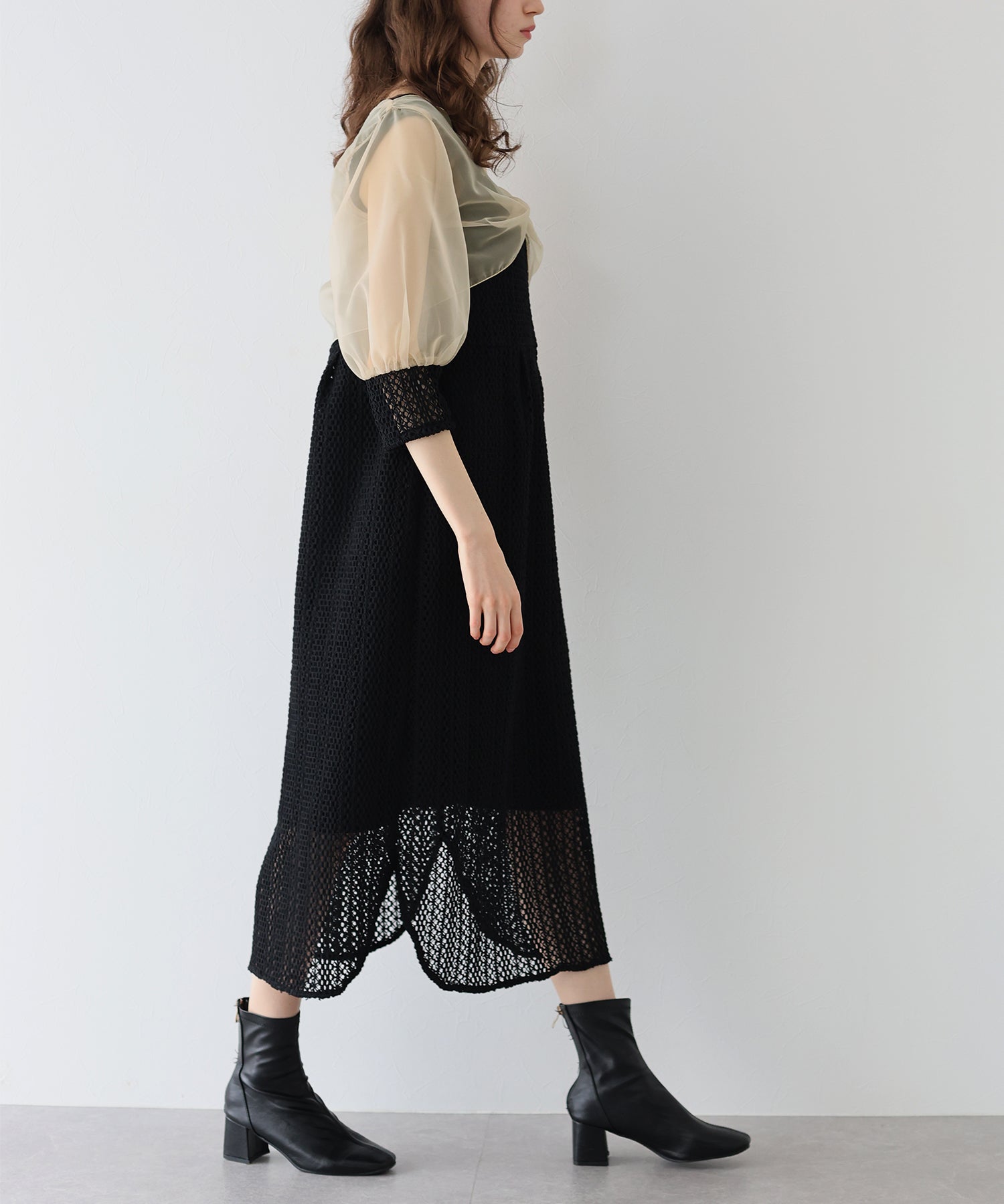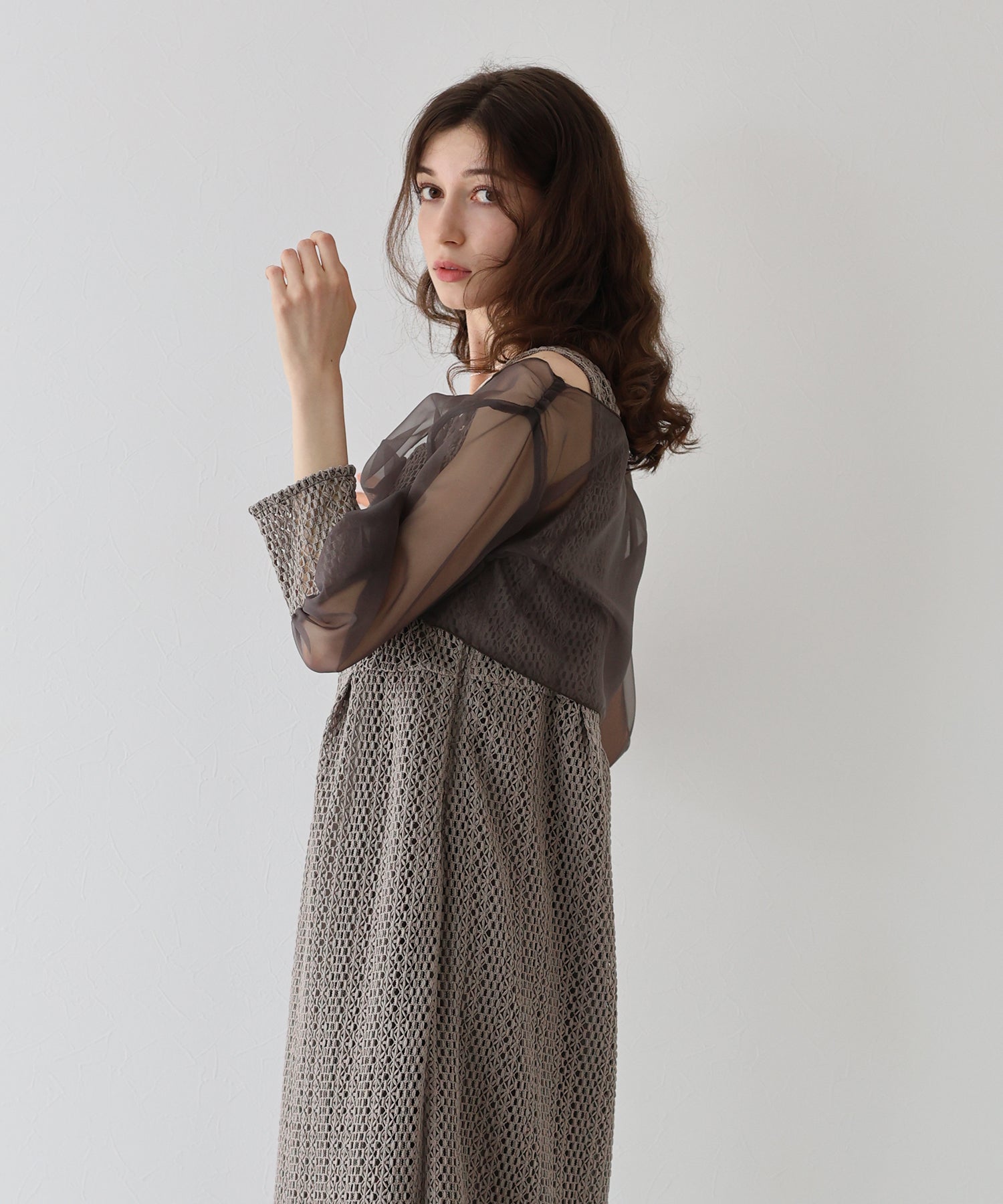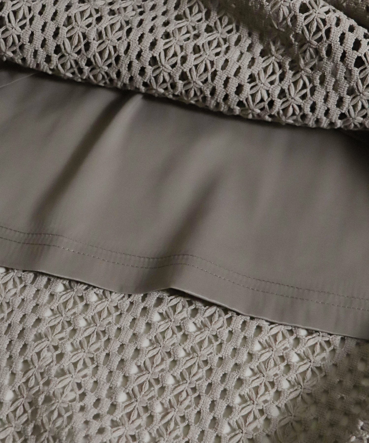 ?FABRIC ワンピースにはローゲージで編んだざっくりとした網み目の手編み風チェーンレースを使用。 一般的なレース機では表現が難しく、特殊な編み機を使用し表面にふんわりとした立体感を持たせているのが特徴です。