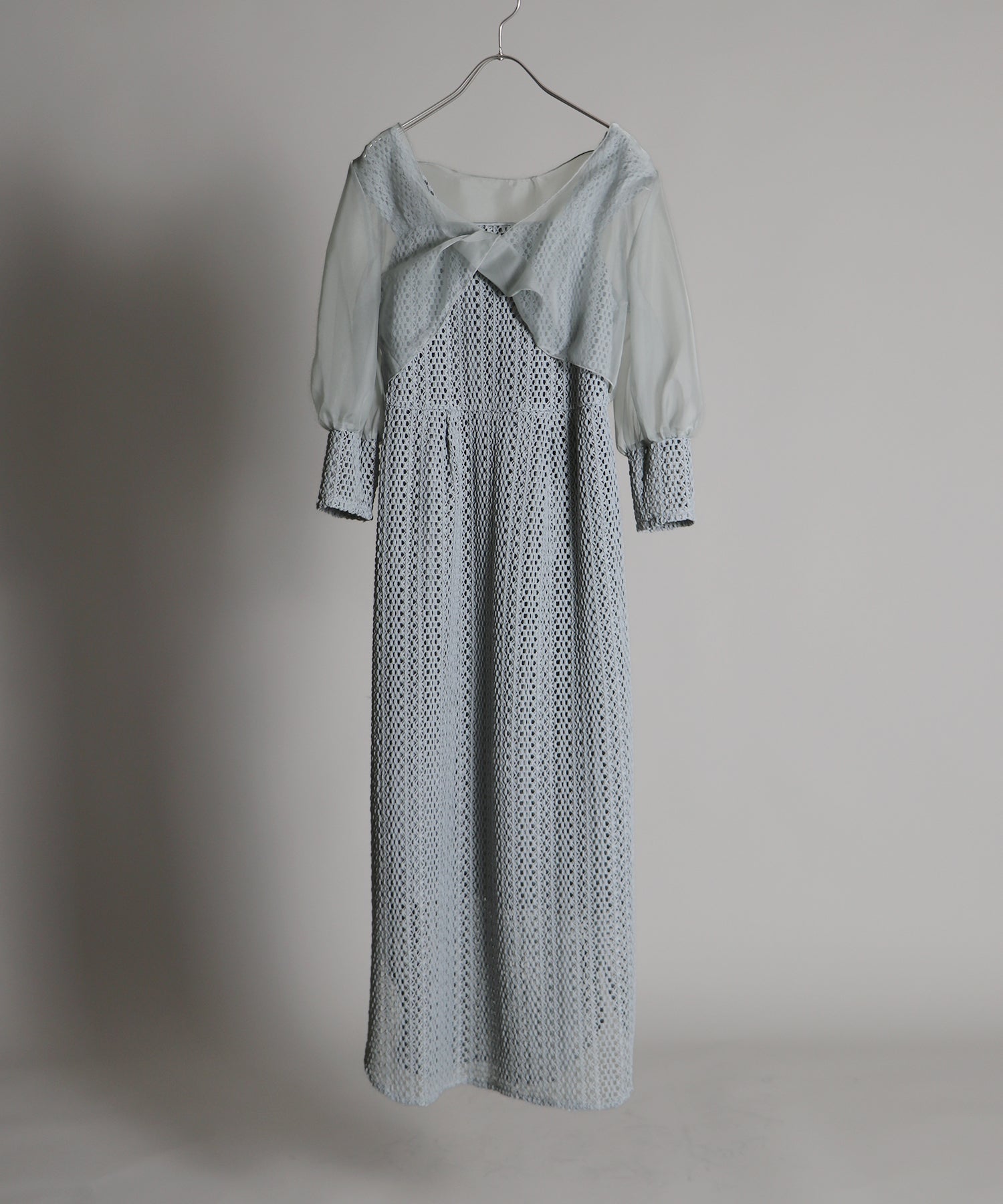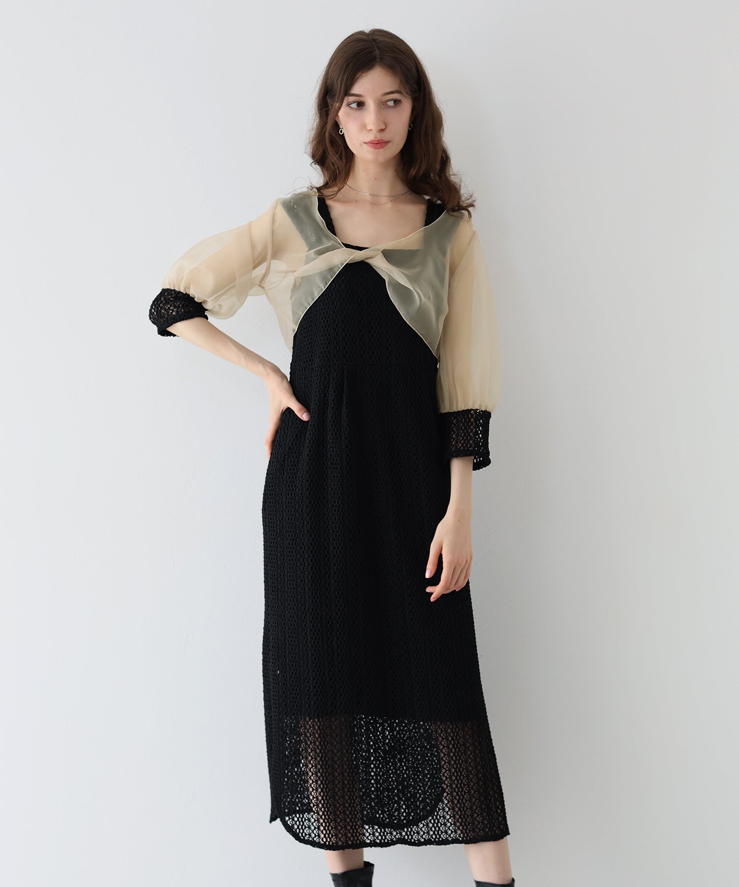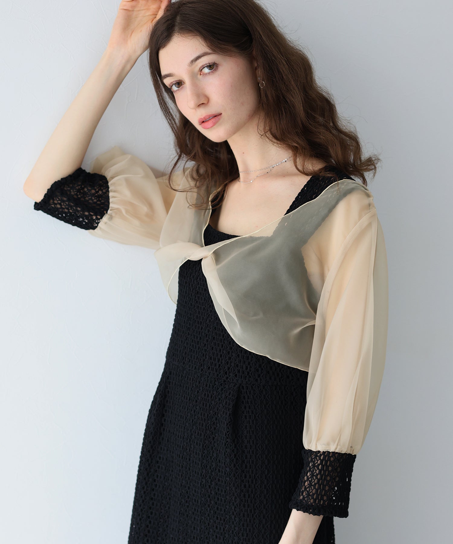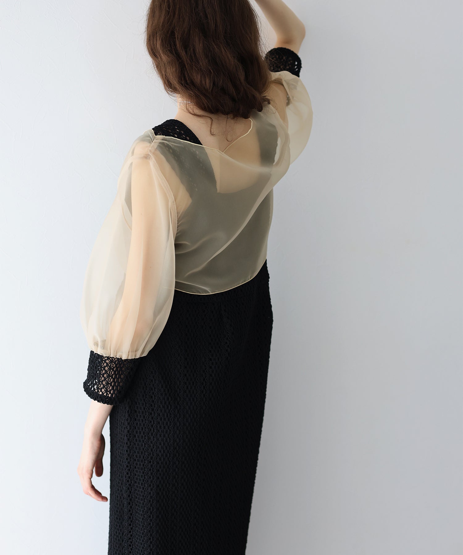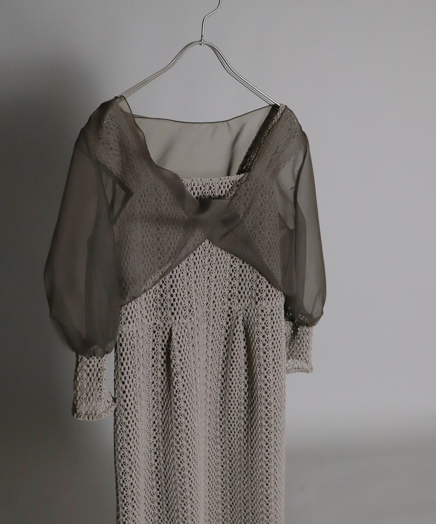 ボレロには光沢を抑えたオーガンジーと、ワンピースと同じレース素材をカフスにドッキングさせました。
