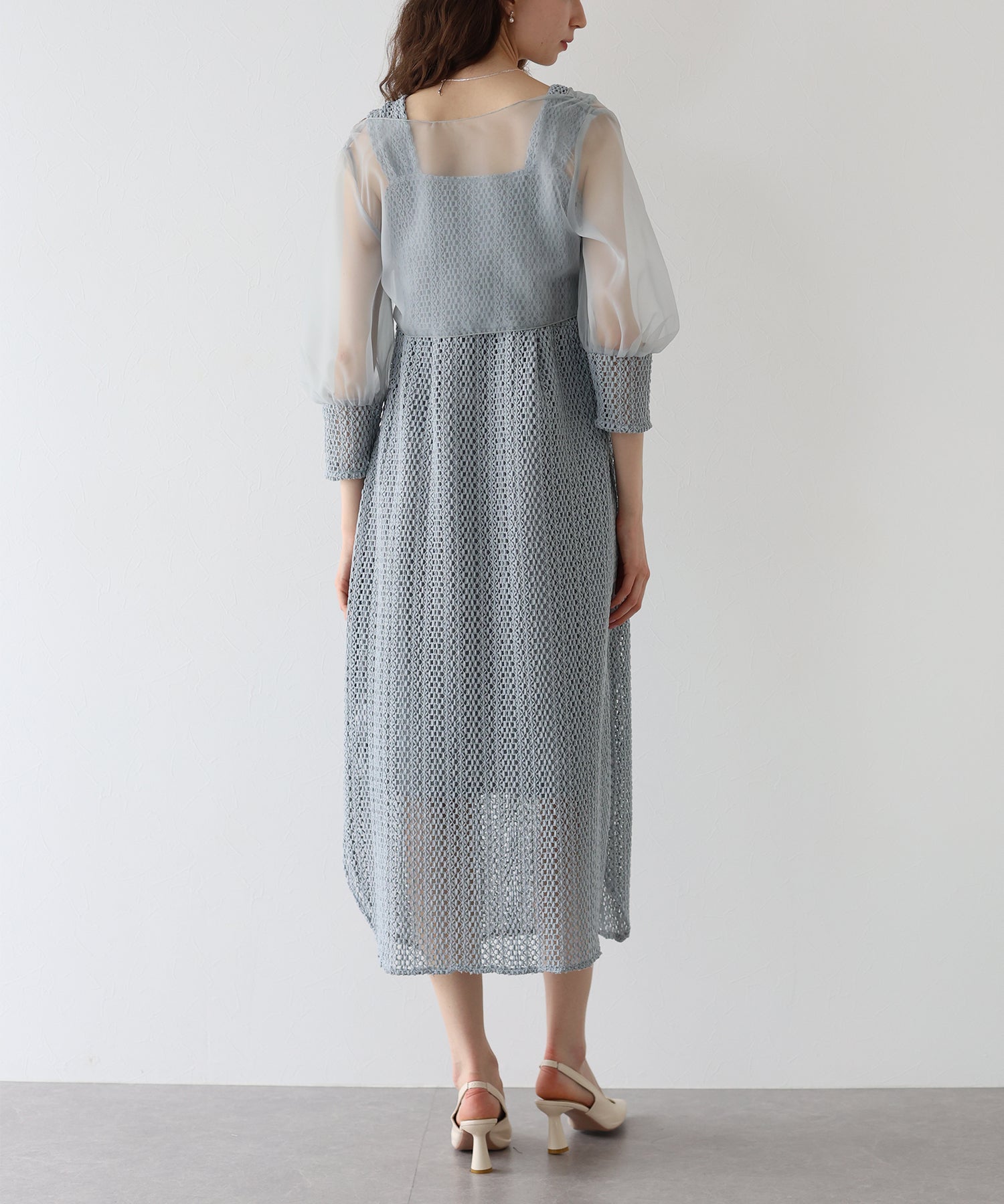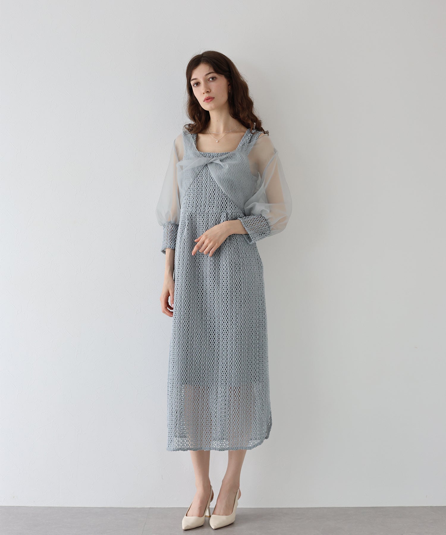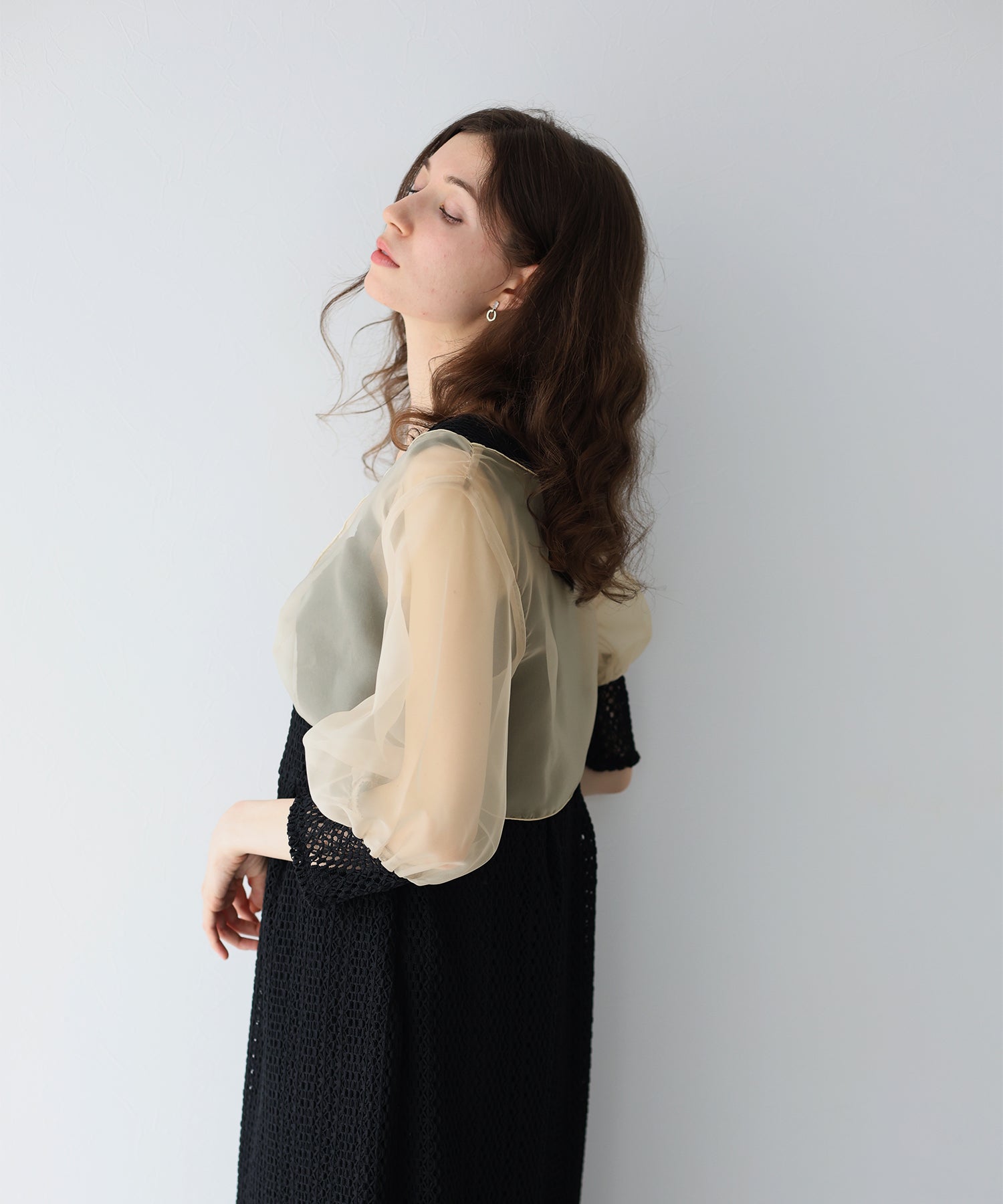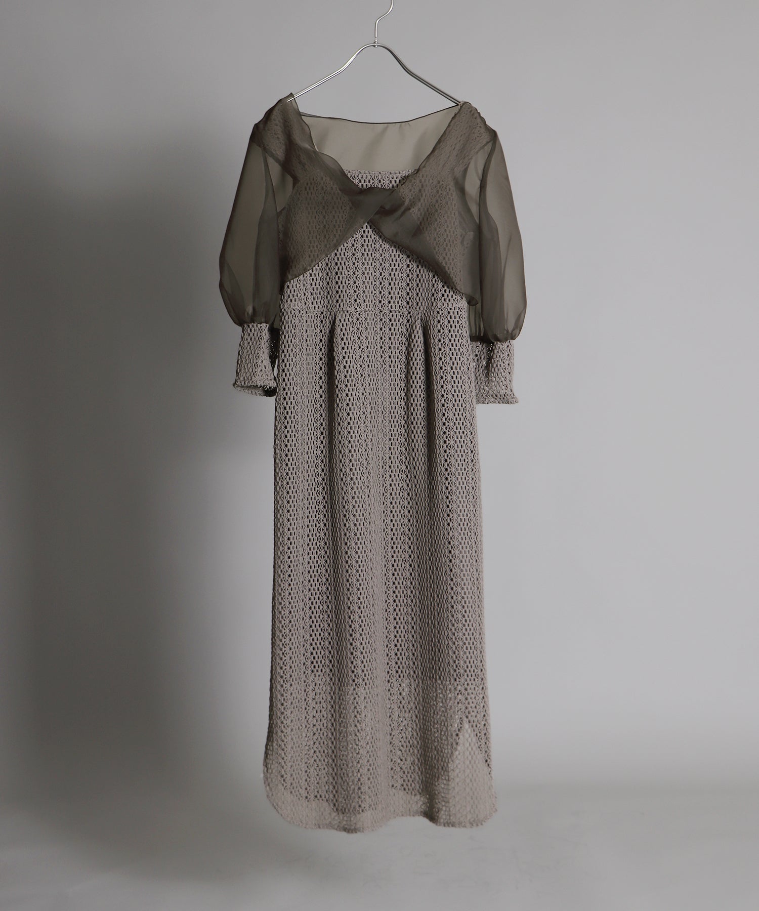 ボレロには光沢を抑えたオーガンジーと、ワンピースと同じレース素材をカフスにドッキングさせました。