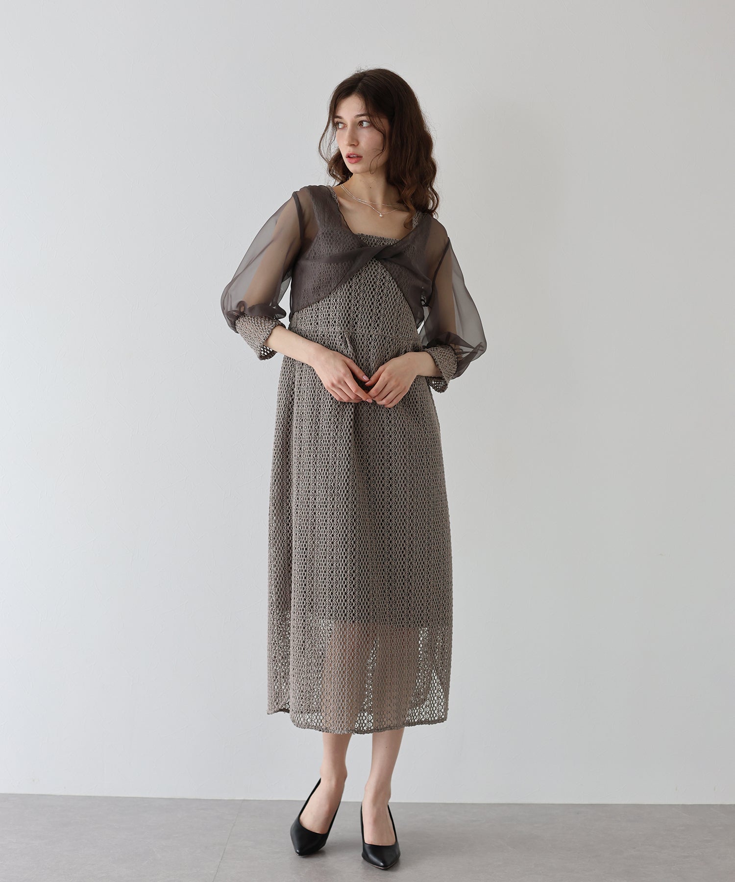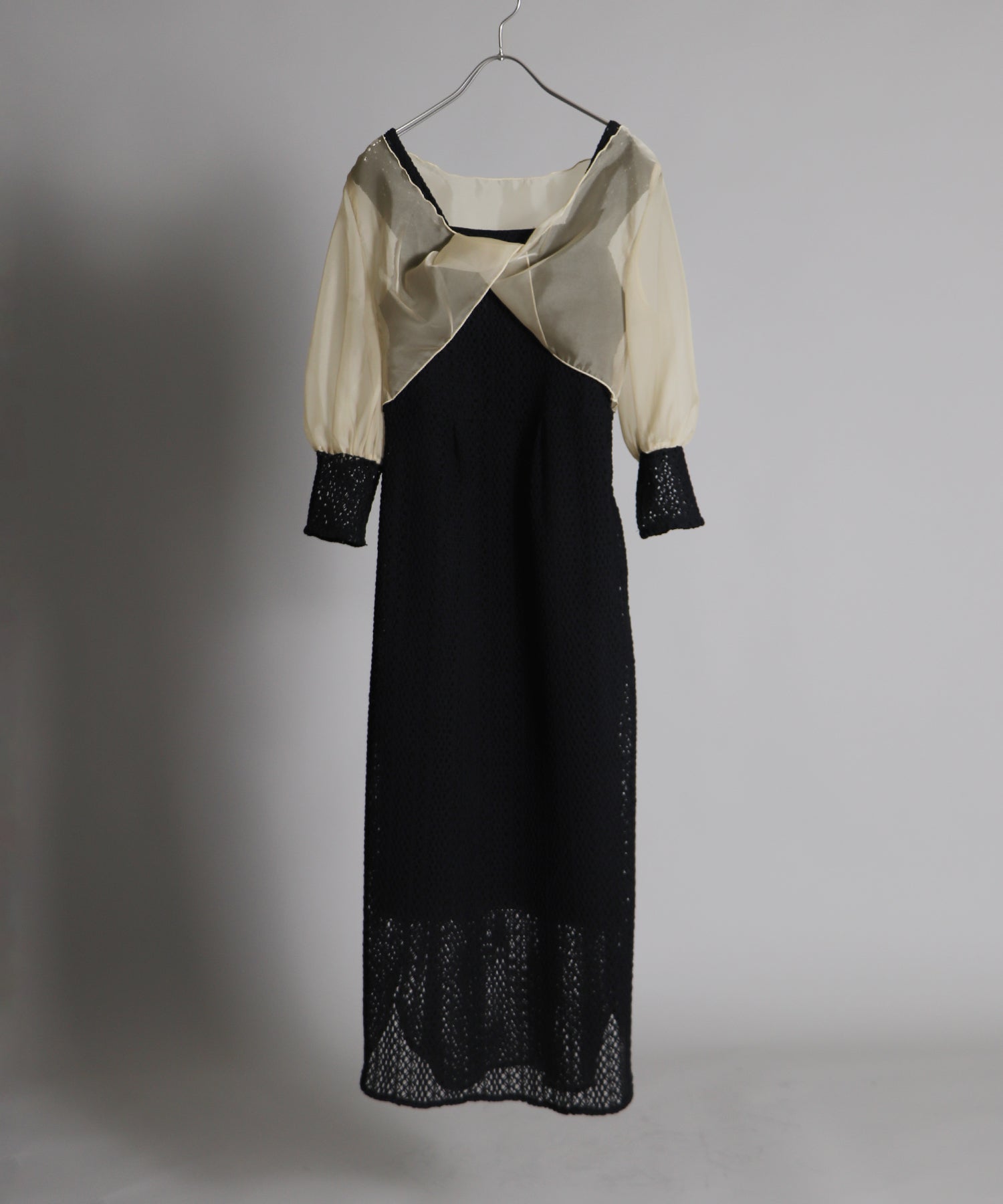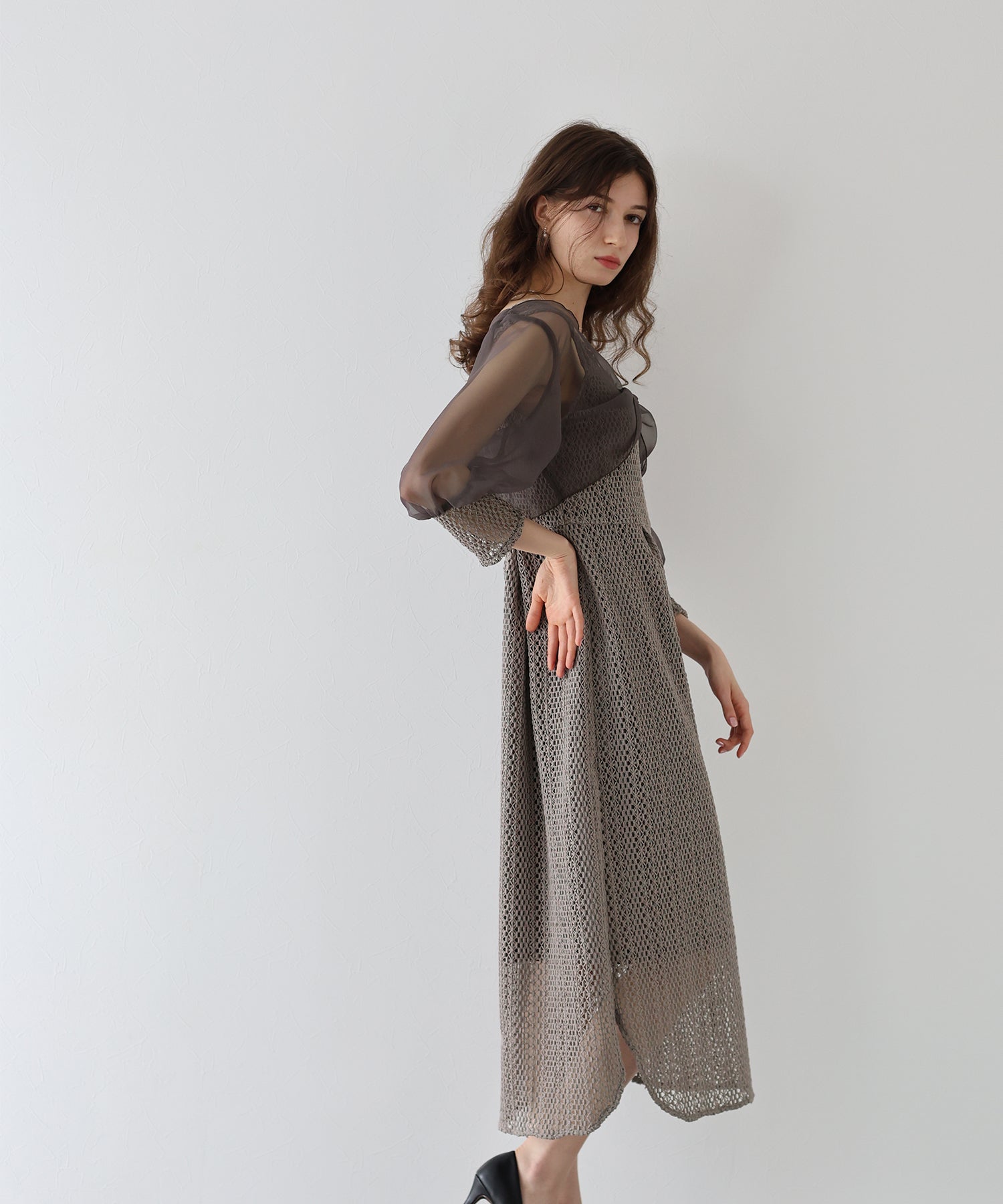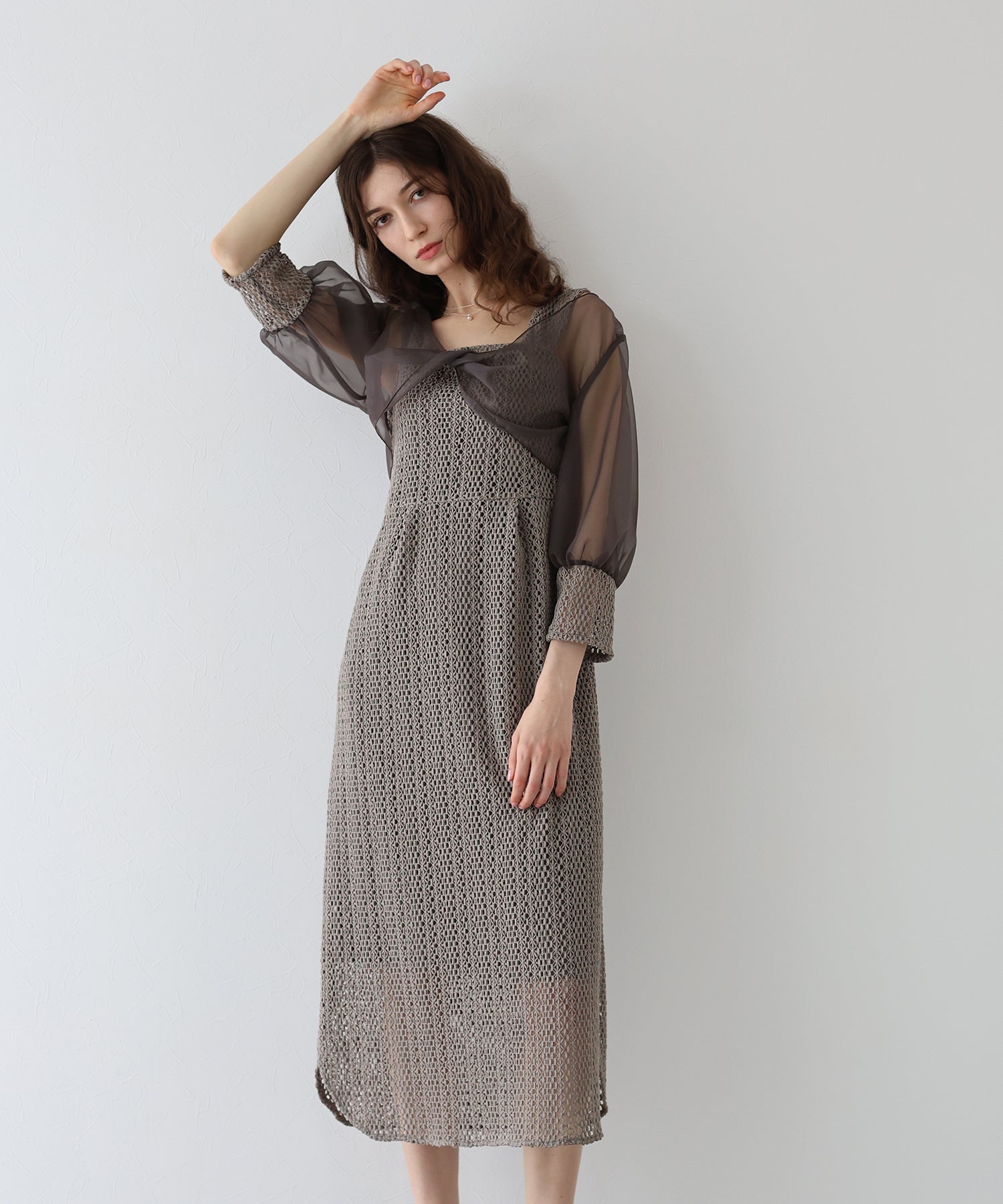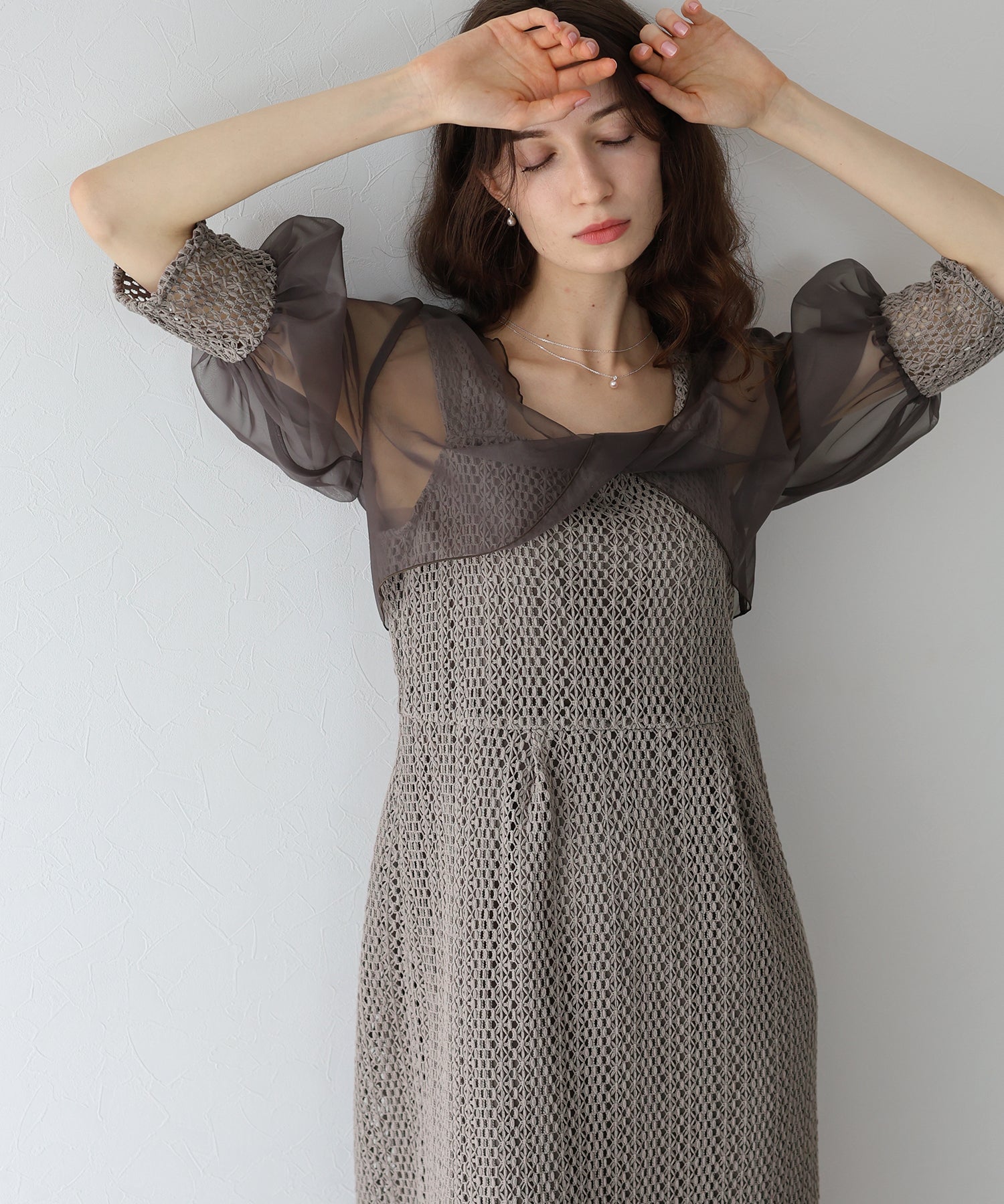 ボレロには光沢を抑えたオーガンジーと、ワンピースと同じレース素材をカフスにドッキングさせました。