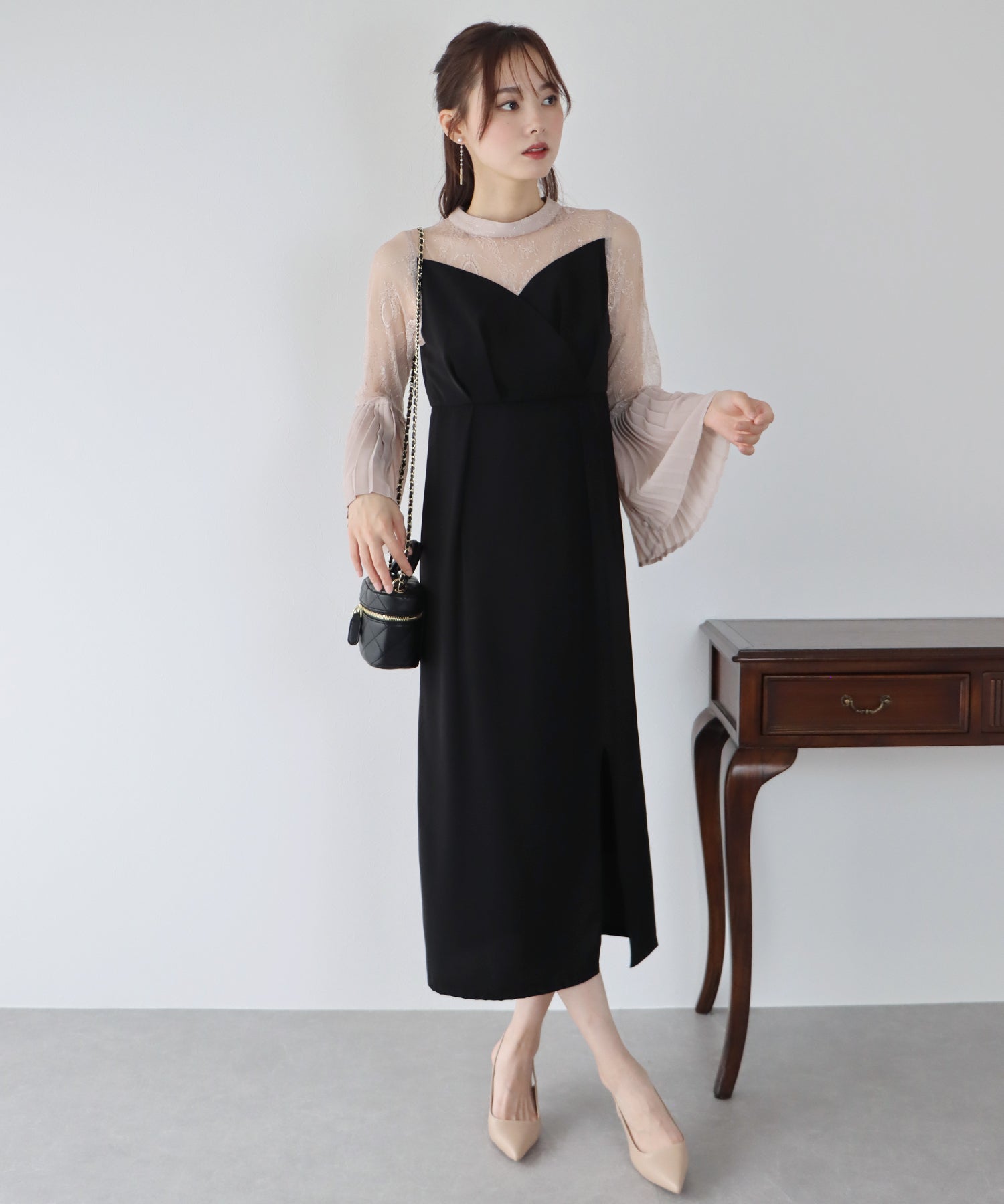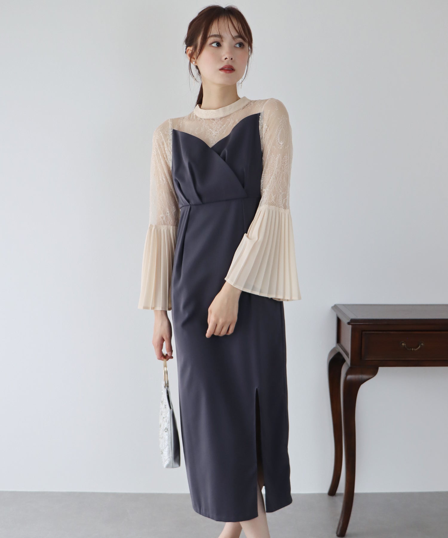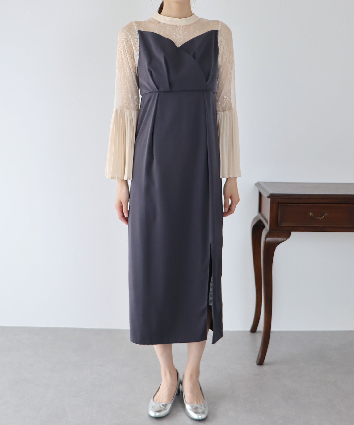 - 【SALE】レーススリットスリーブロング丈パーティードレス