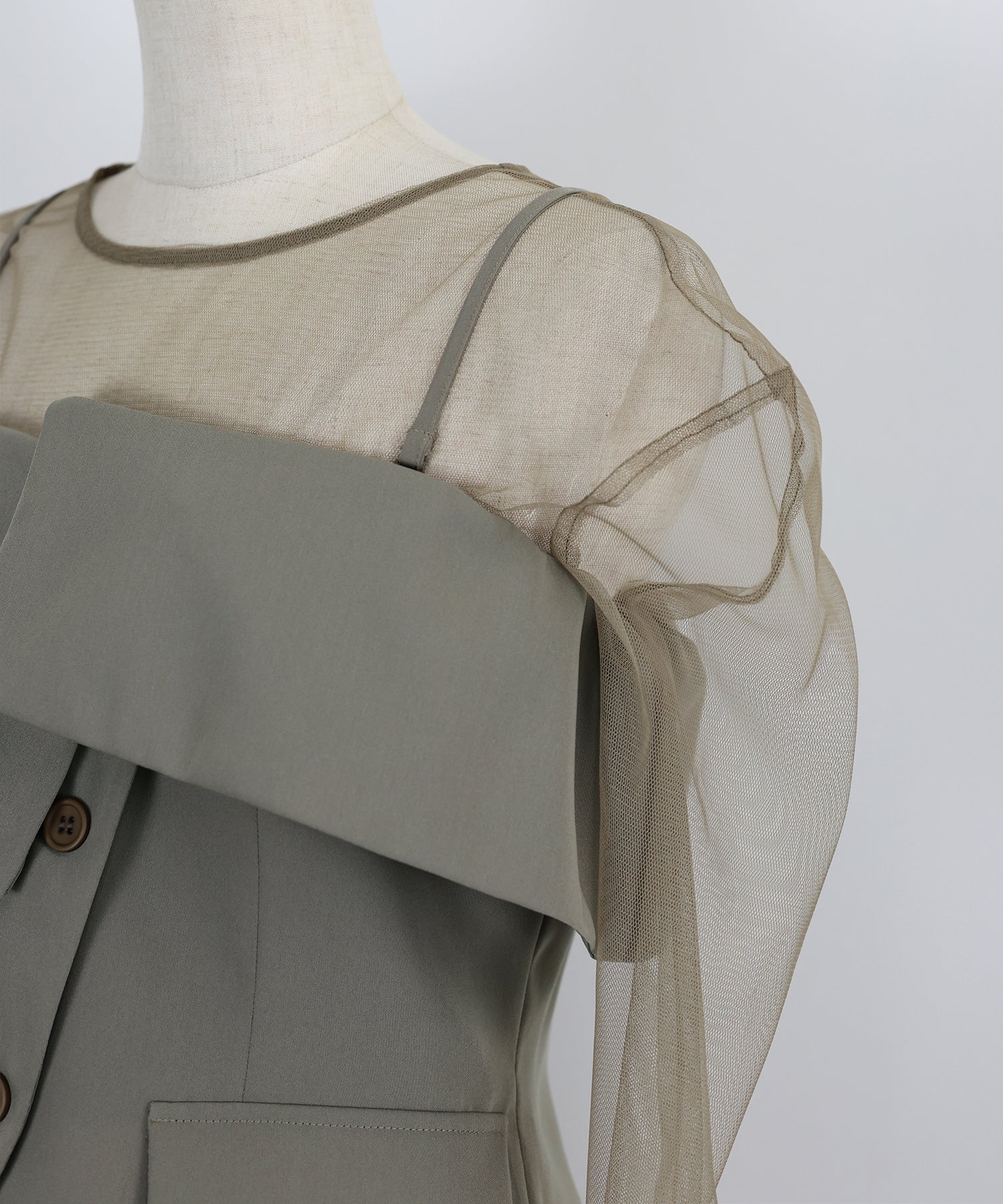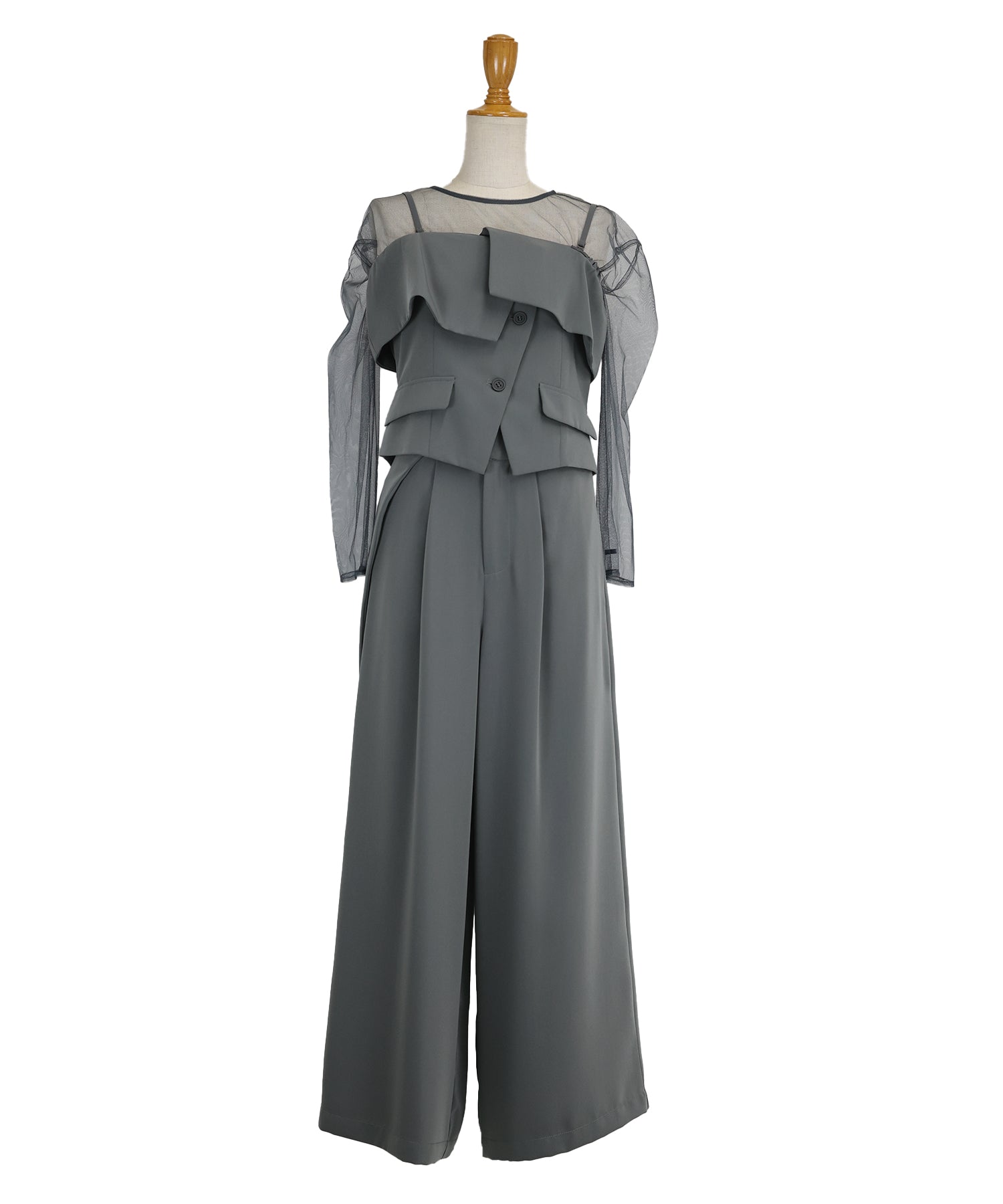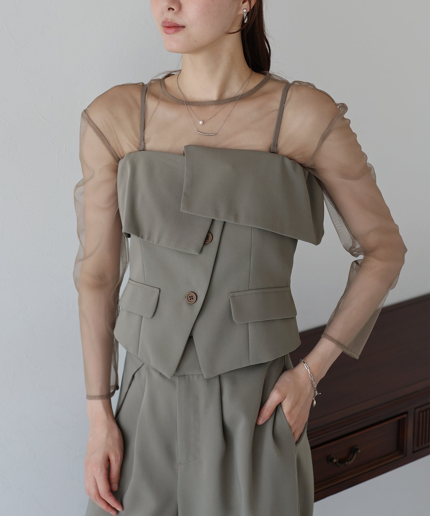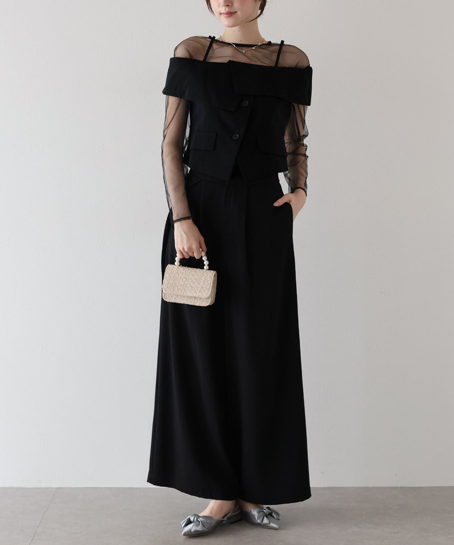 セットの柔らかなチュールトップスを合わせてオールシーズンご着用可能に。