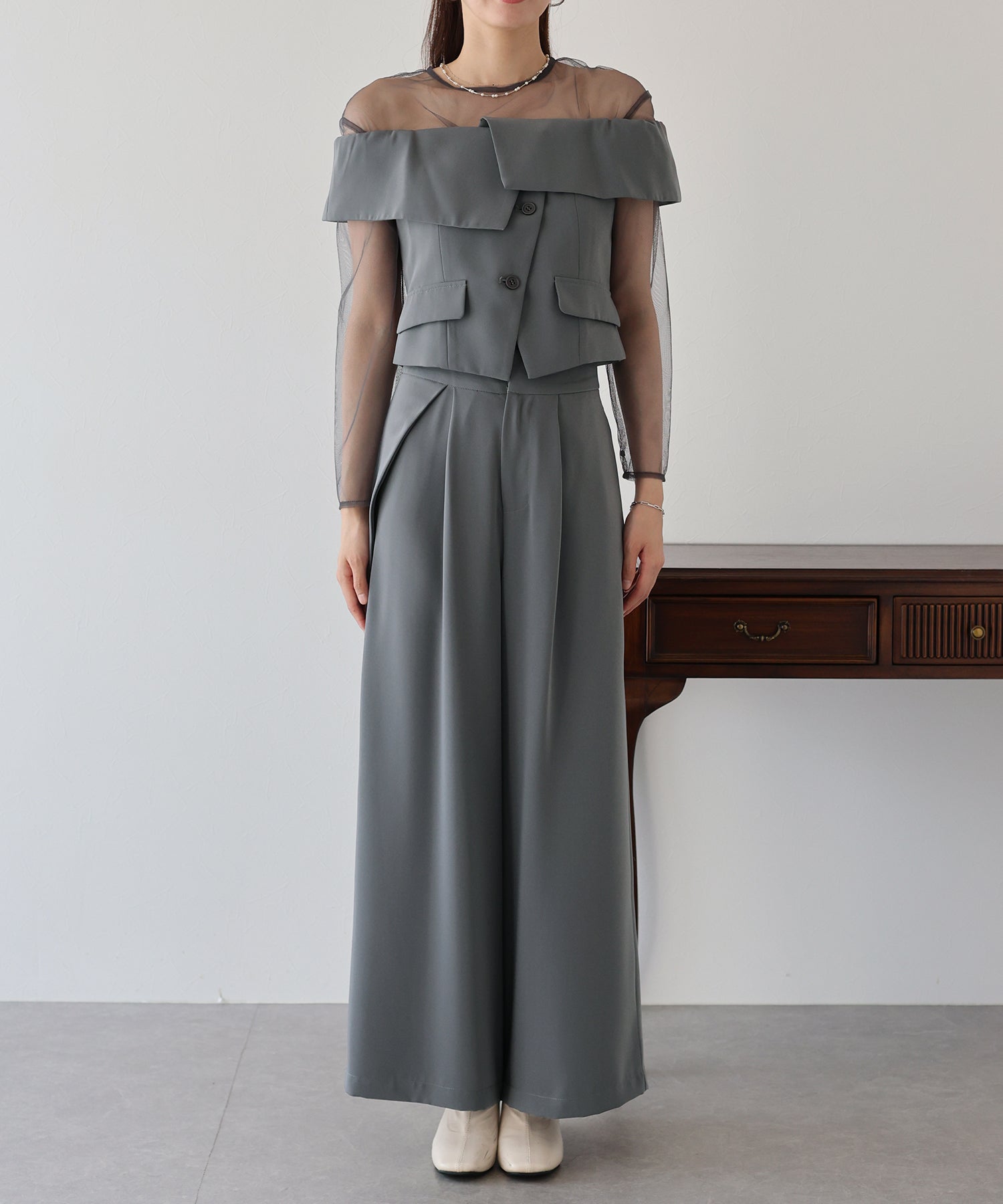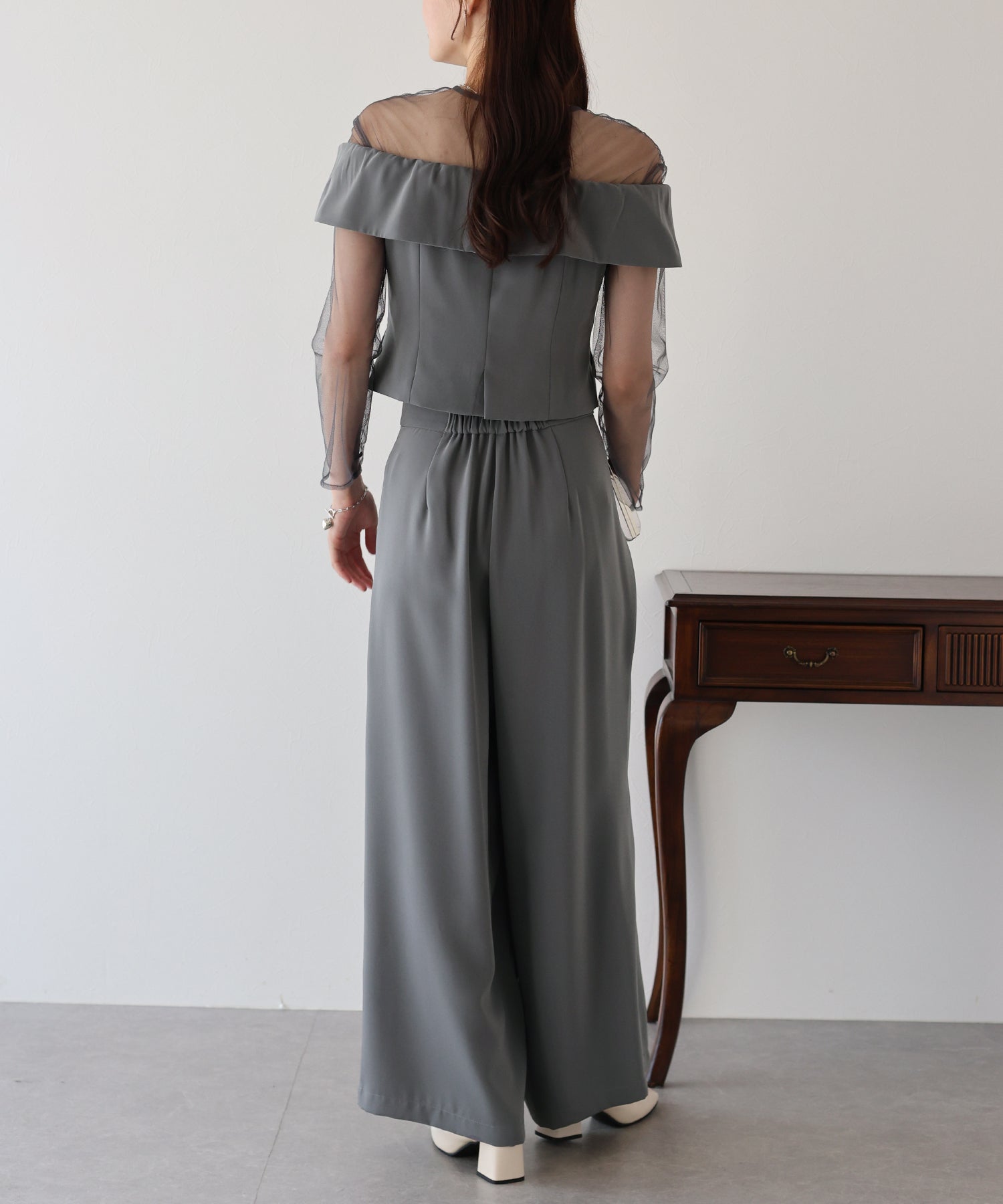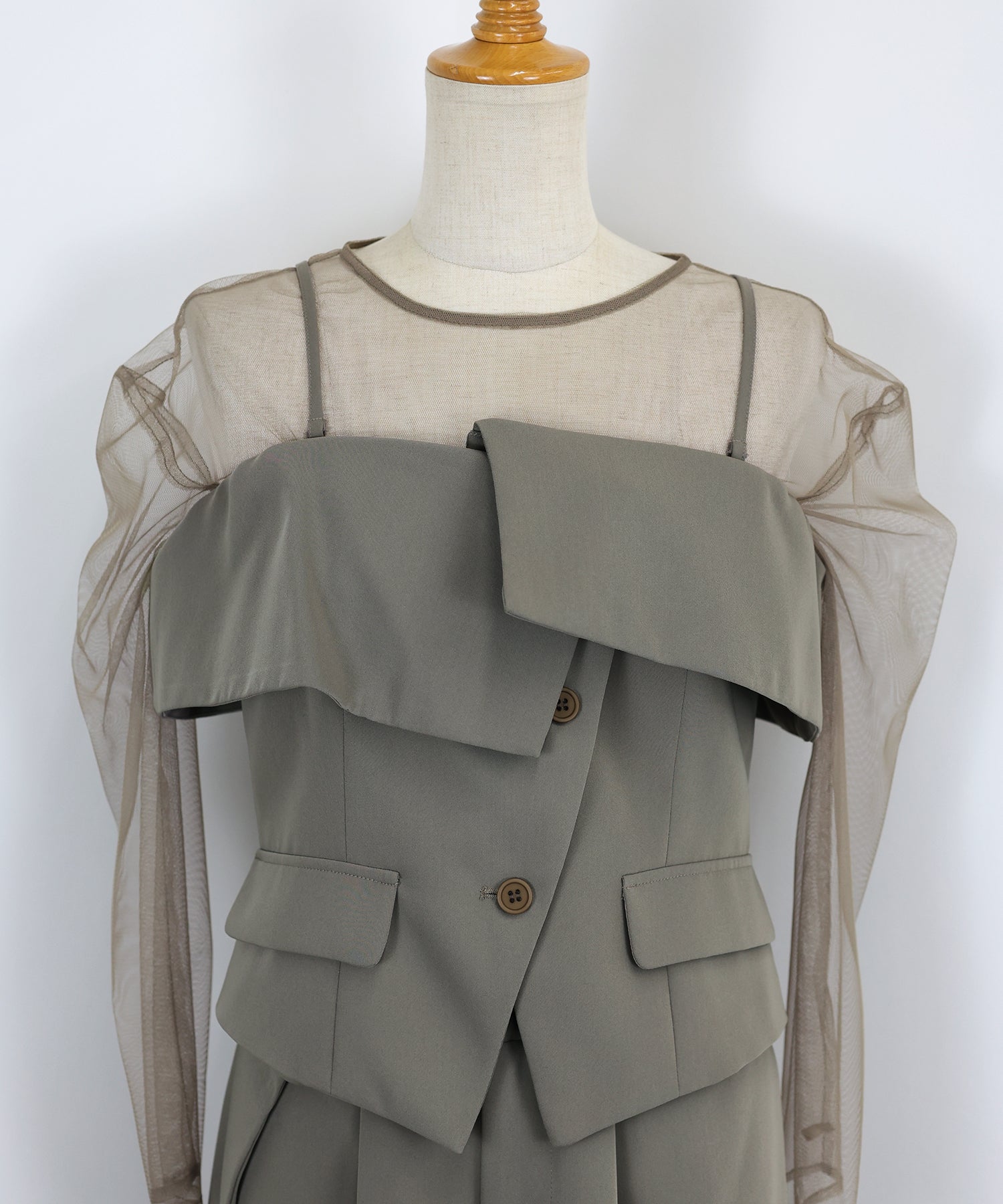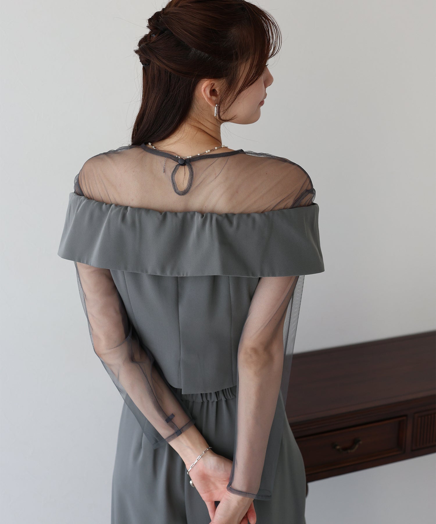 トップスのオフショル部分は襟のようなイレギュラーな細部にこだわり、