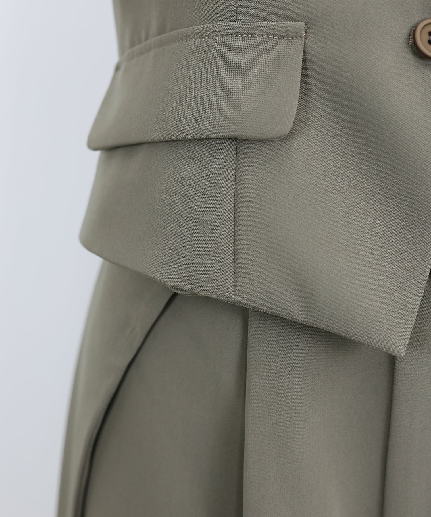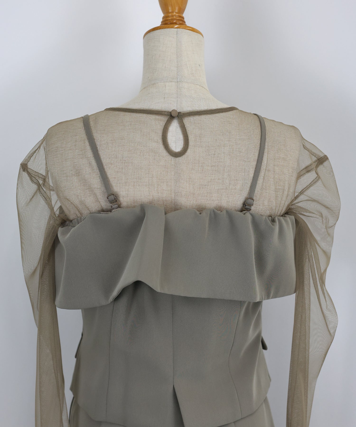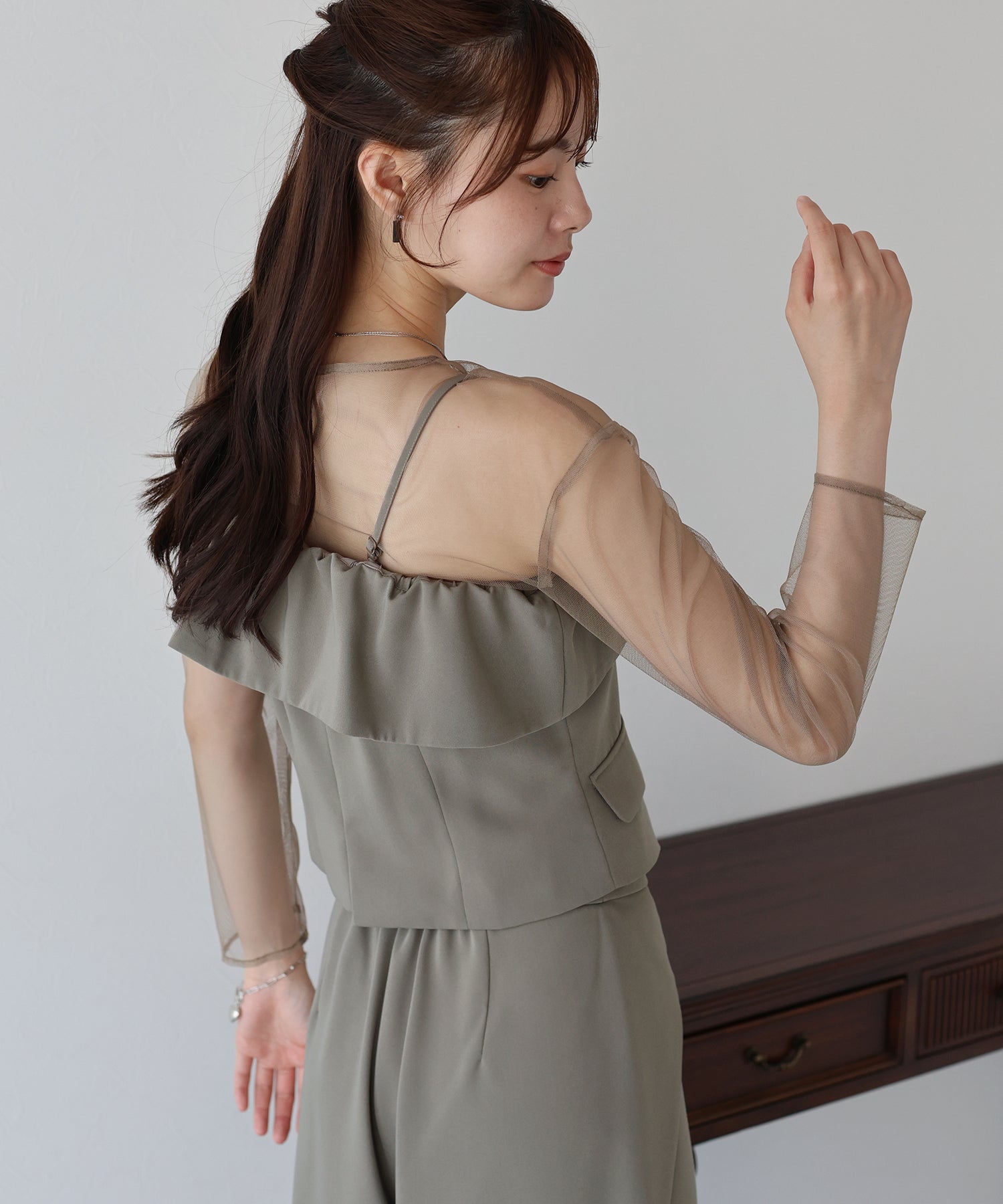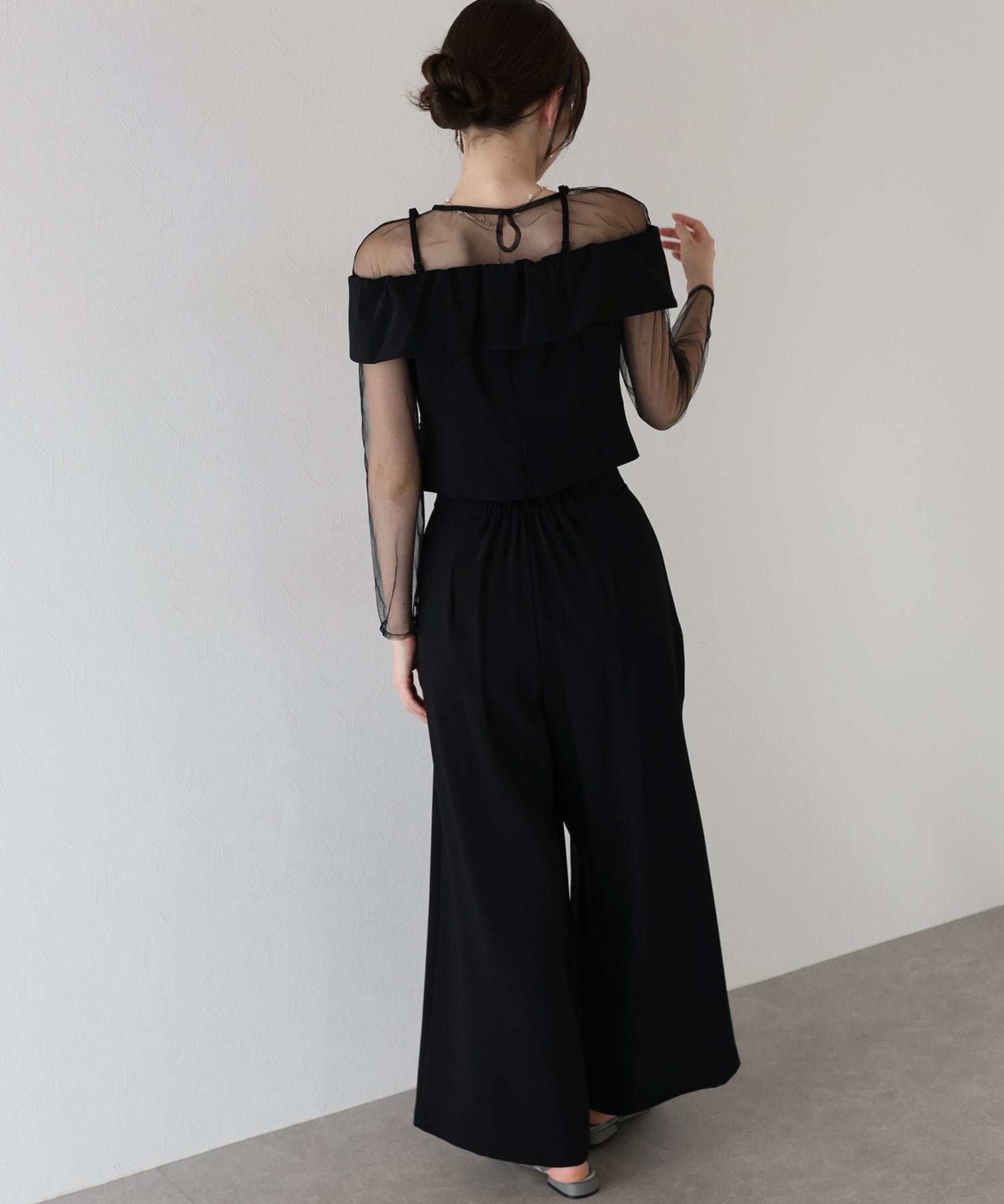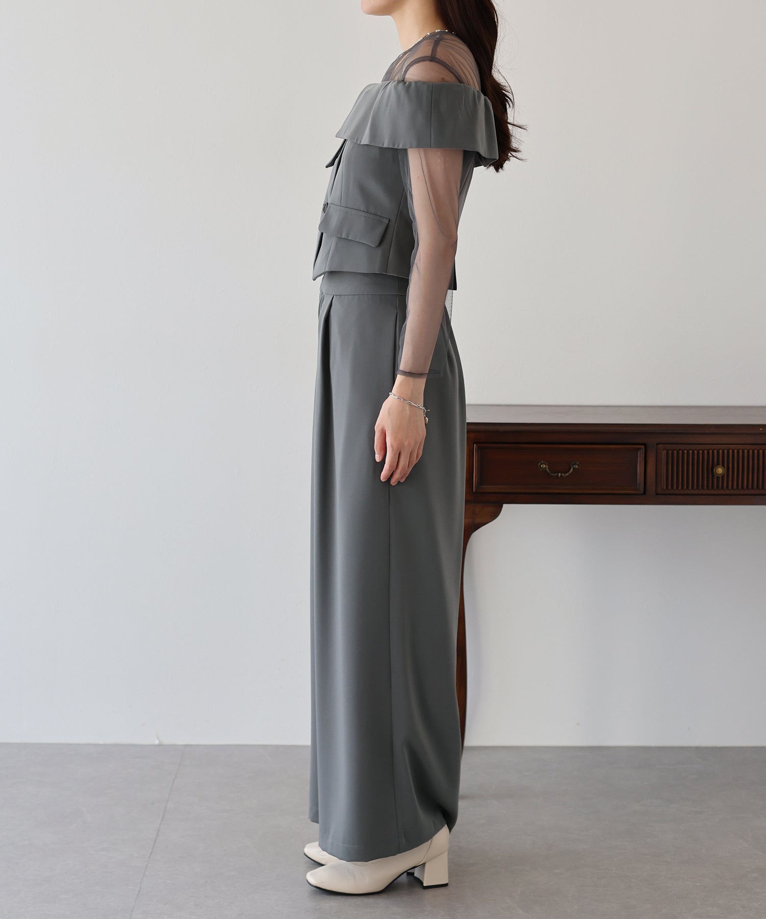 トップスのオフショル部分は襟のようなイレギュラーな細部にこだわり、