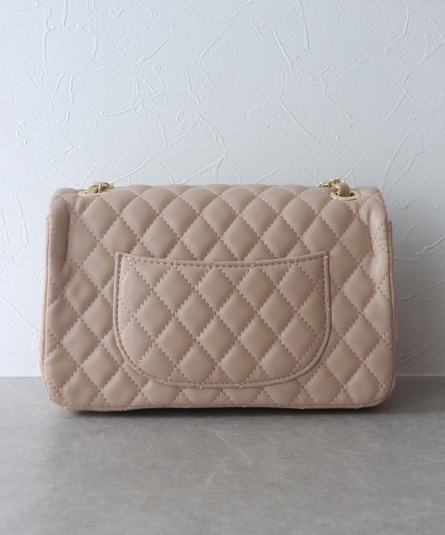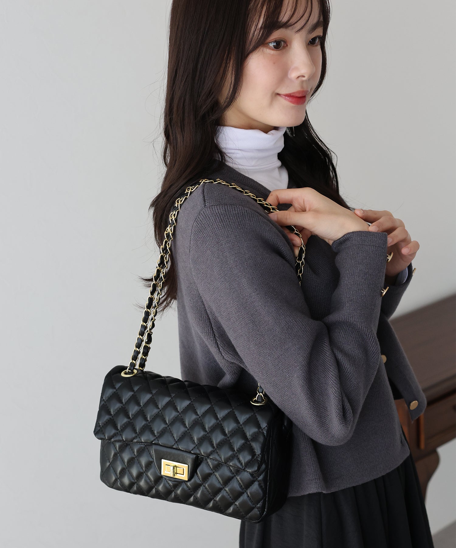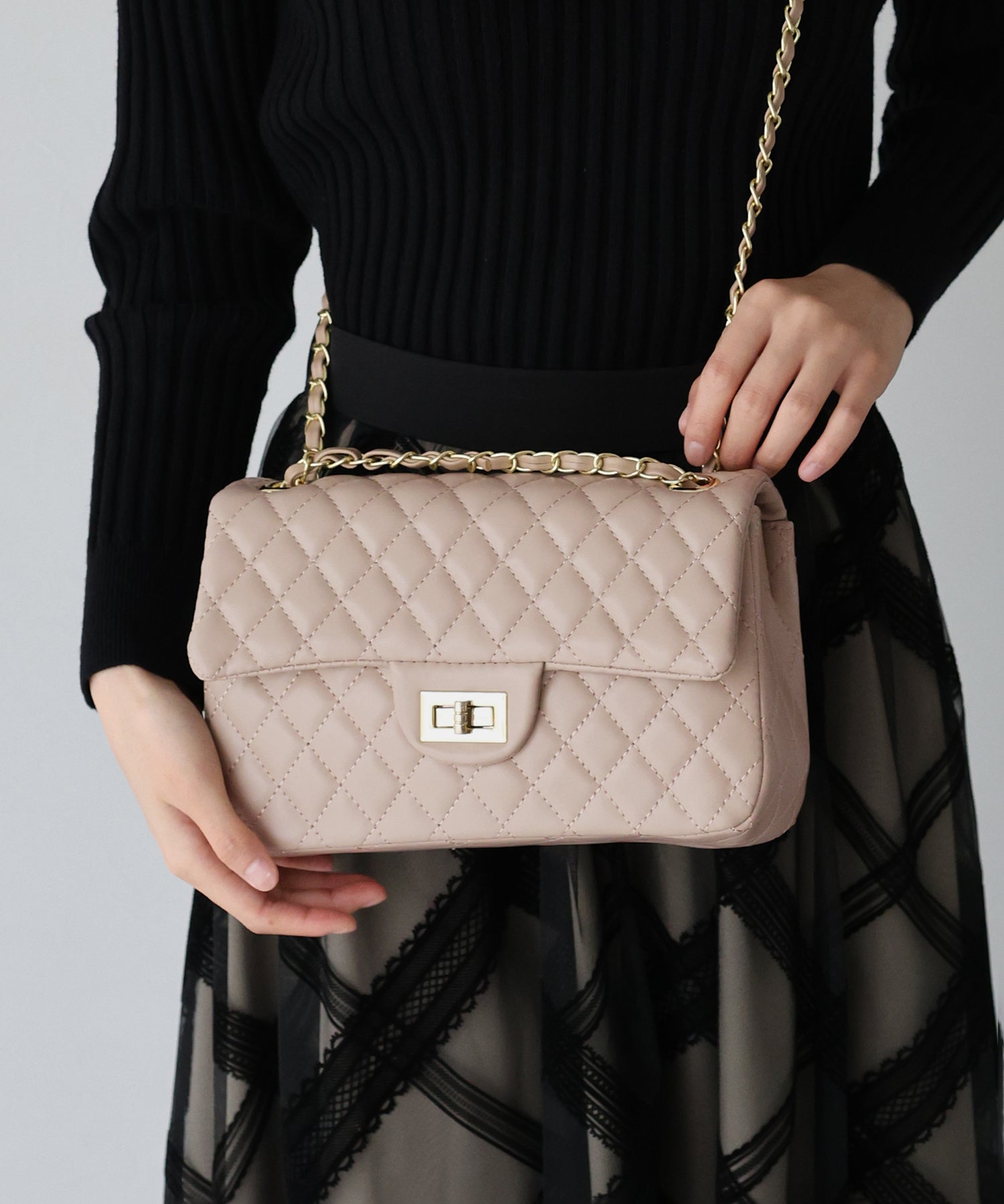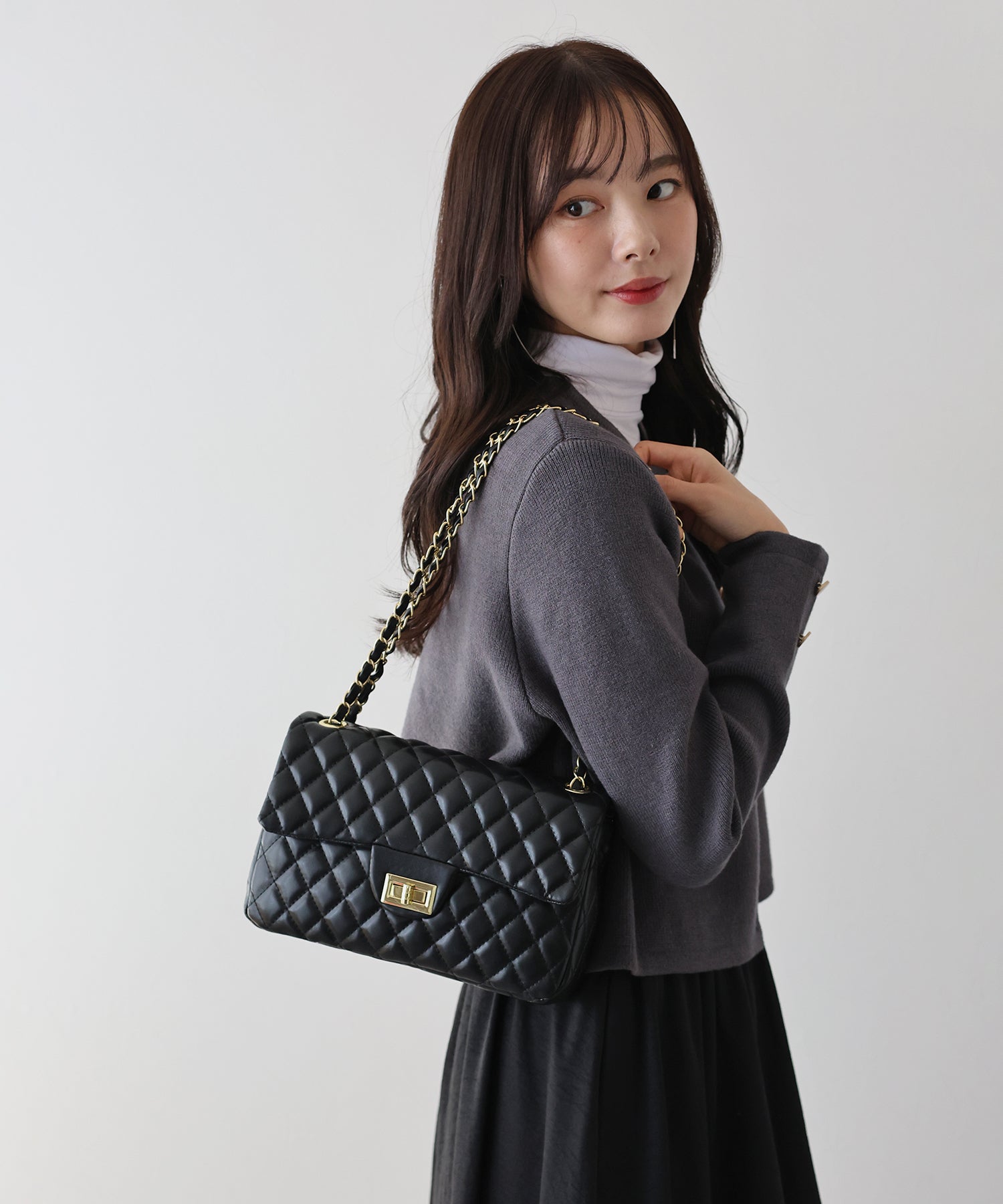 スタイリングのアクセントになるキルティングバッグ ?POINT チェーンショルダーが上品なフラップショルダーバッグ。 フェイクレザーのキルティングとゴールドチェーンが上品な印象。 チェーンを二重にするとショルダー、伸ばすと斜め掛けでお持ちいただける2WAY仕様です。 スマートフォン、財布やハンカチ、リップなど、お出掛けに必要なアイテムも入ります。 後ろにポケットが付いているので、さっと取り出したいICカードなどを入れていただくのに便利です。 シンプルなキルティングのデザインは1つ持っておくと重宝する、トレンドに左右されず長くお使いいただけるアイテムです。