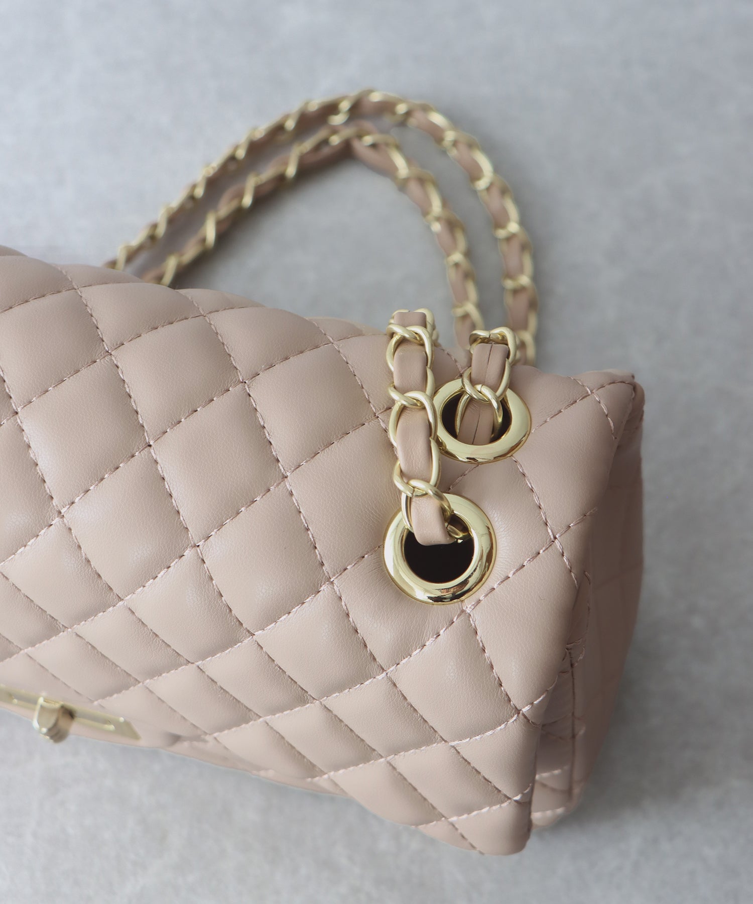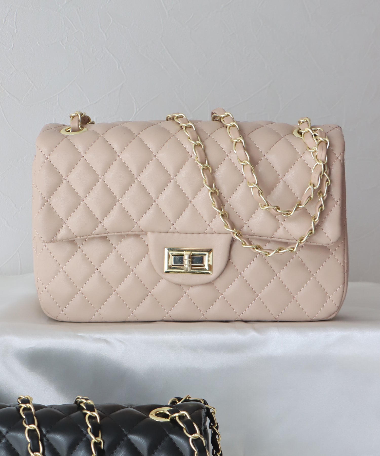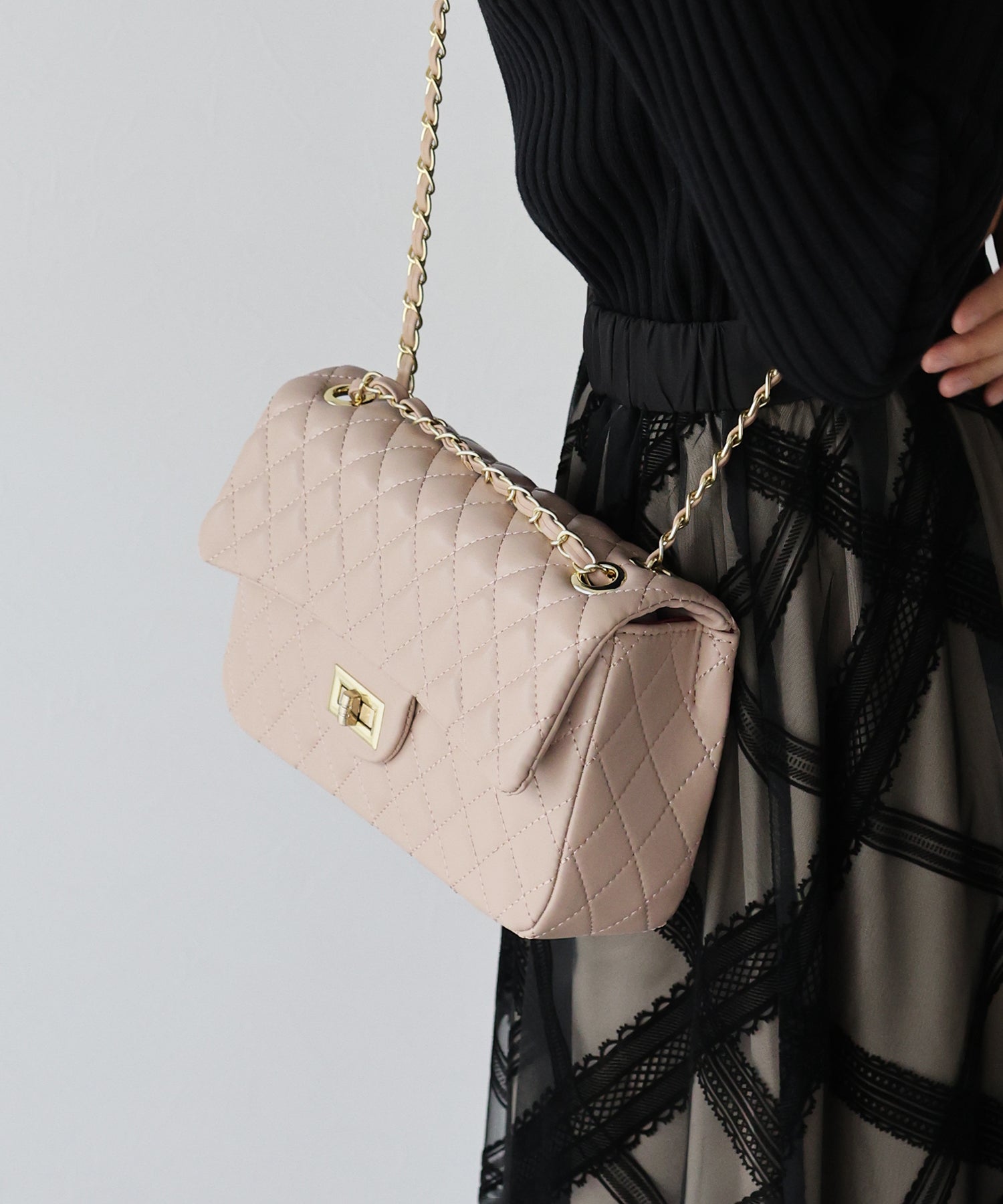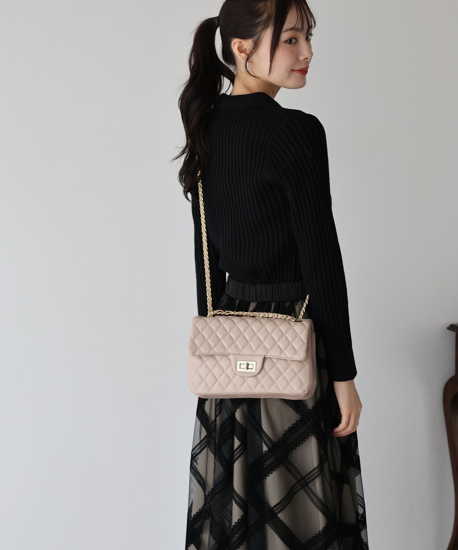 スタイリングのアクセントになるキルティングバッグ ?POINT チェーンショルダーが上品なフラップショルダーバッグ。 フェイクレザーのキルティングとゴールドチェーンが上品な印象。 チェーンを二重にするとショルダー、伸ばすと斜め掛けでお持ちいただける2WAY仕様です。 スマートフォン、財布やハンカチ、リップなど、お出掛けに必要なアイテムも入ります。 後ろにポケットが付いているので、さっと取り出したいICカードなどを入れていただくのに便利です。 シンプルなキルティングのデザインは1つ持っておくと重宝する、トレンドに左右されず長くお使いいただけるアイテムです。