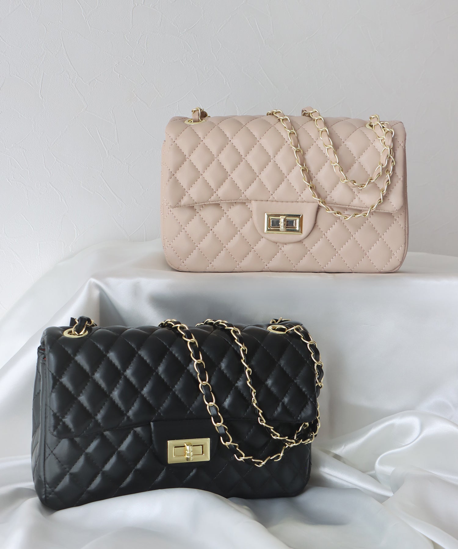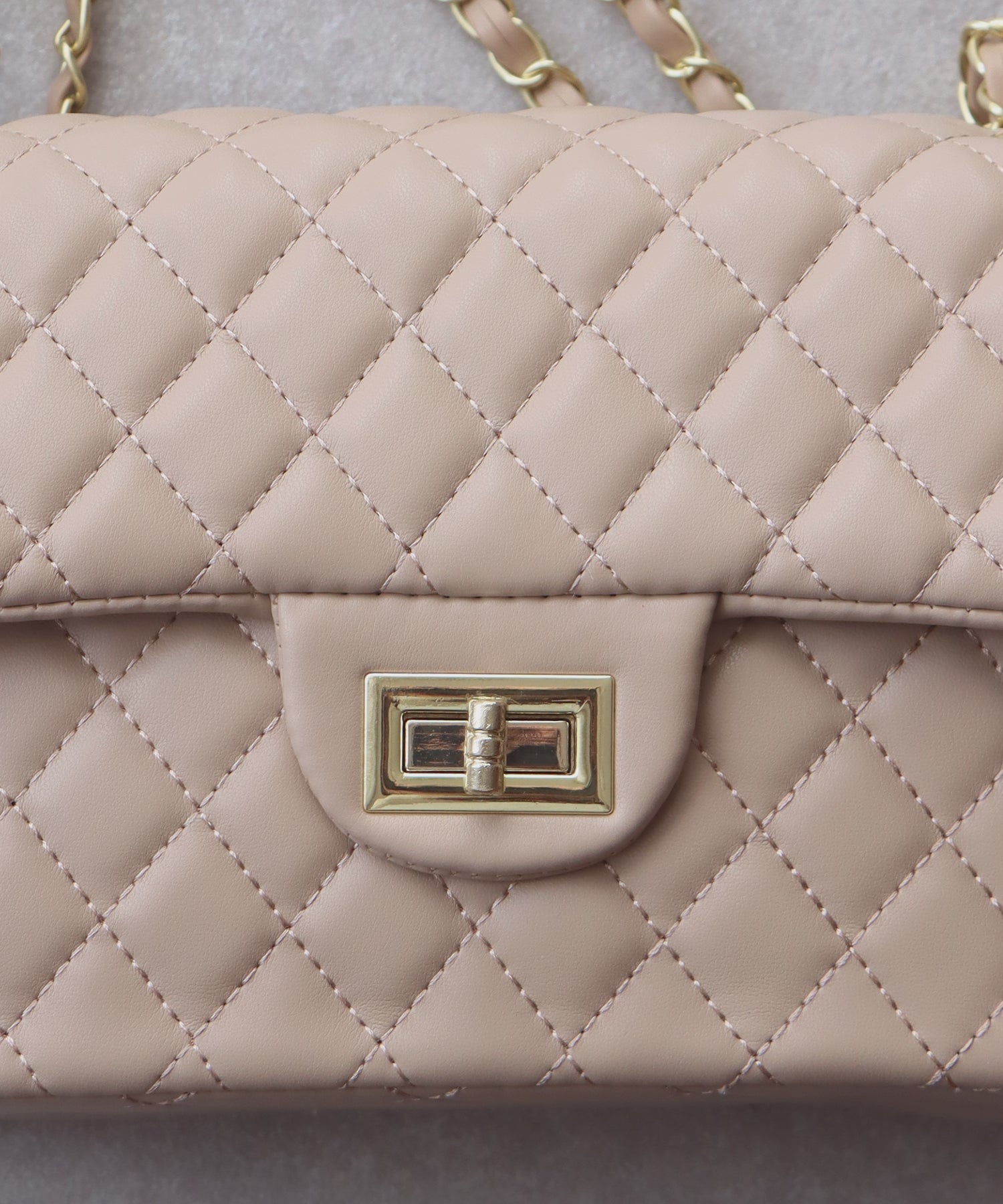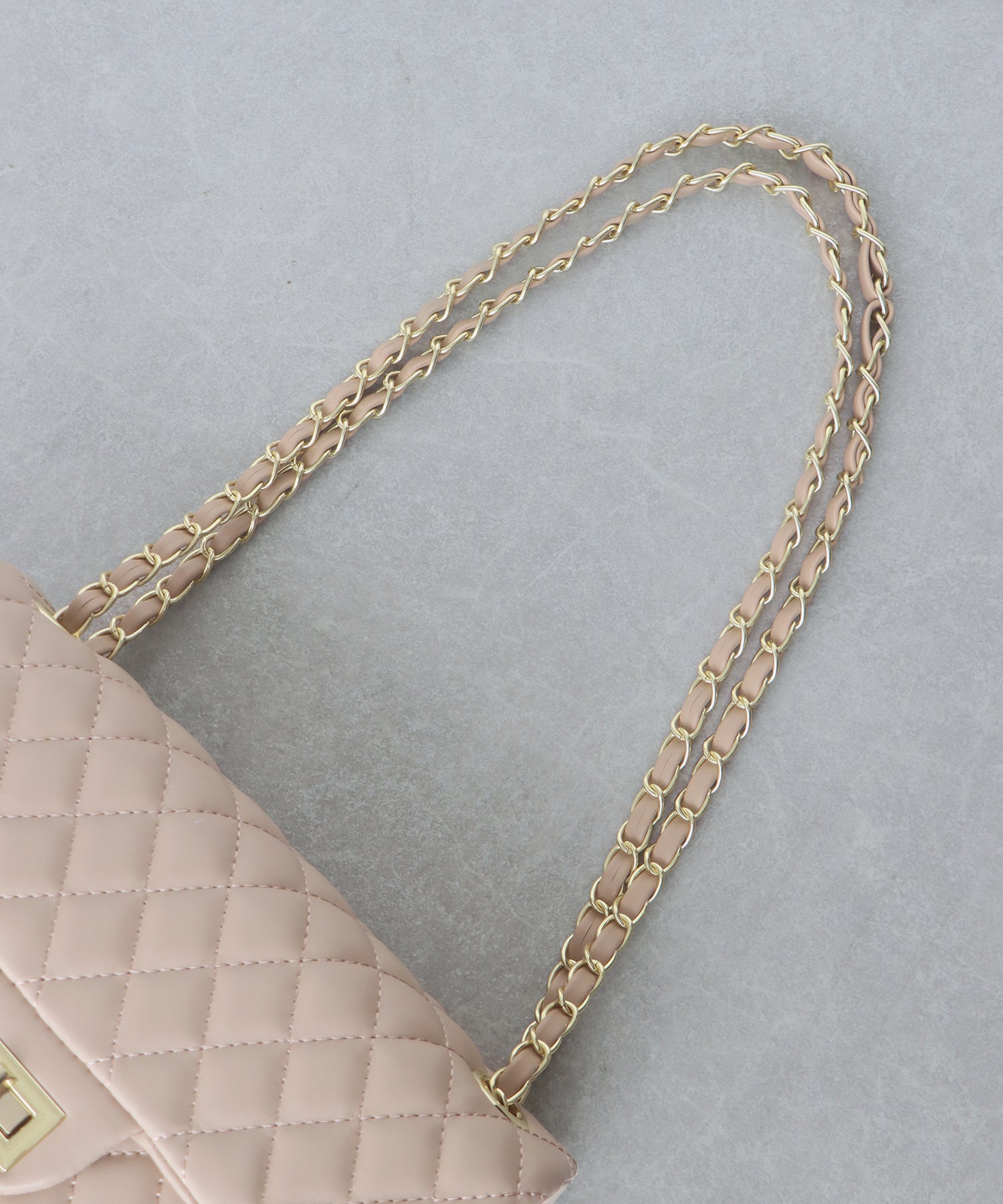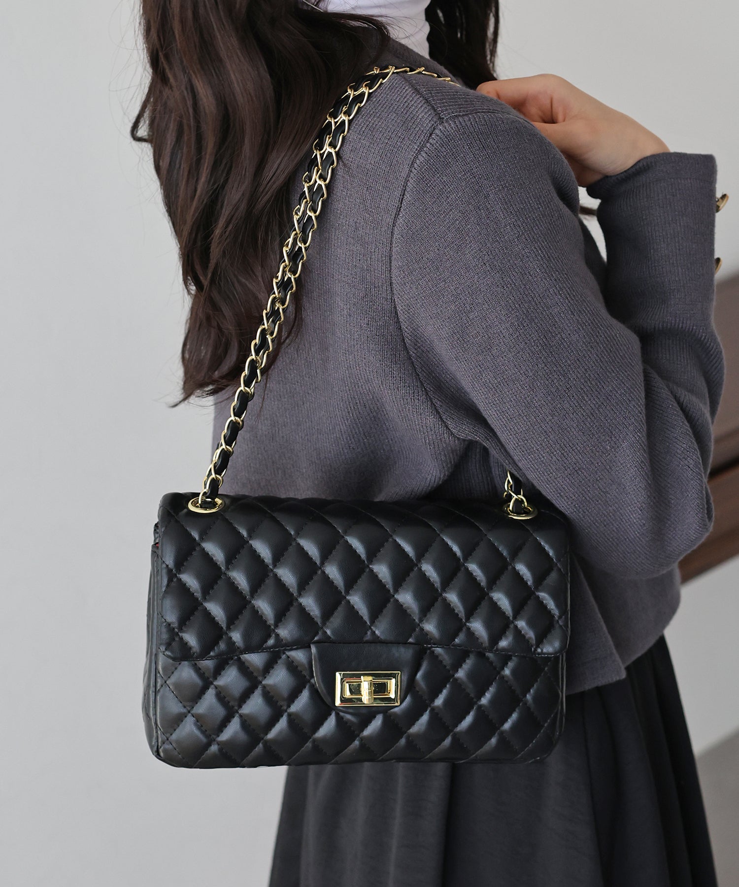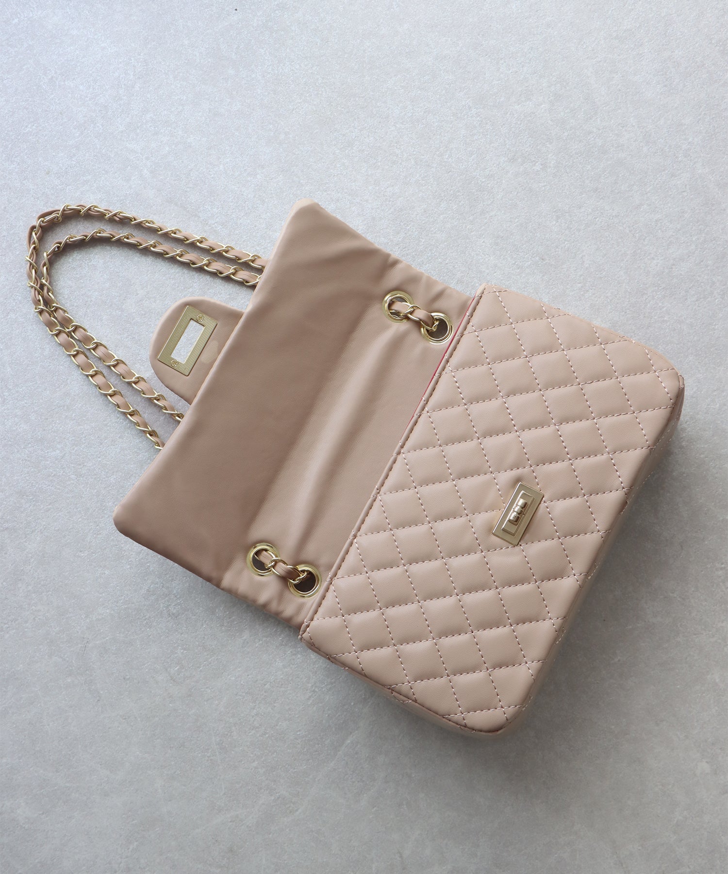 スタイリングのアクセントになるキルティングバッグ ?POINT チェーンショルダーが上品なフラップショルダーバッグ。 フェイクレザーのキルティングとゴールドチェーンが上品な印象。 チェーンを二重にするとショルダー、伸ばすと斜め掛けでお持ちいただける2WAY仕様です。 スマートフォン、財布やハンカチ、リップなど、お出掛けに必要なアイテムも入ります。 後ろにポケットが付いているので、さっと取り出したいICカードなどを入れていただくのに便利です。 シンプルなキルティングのデザインは1つ持っておくと重宝する、トレンドに左右されず長くお使いいただけるアイテムです。