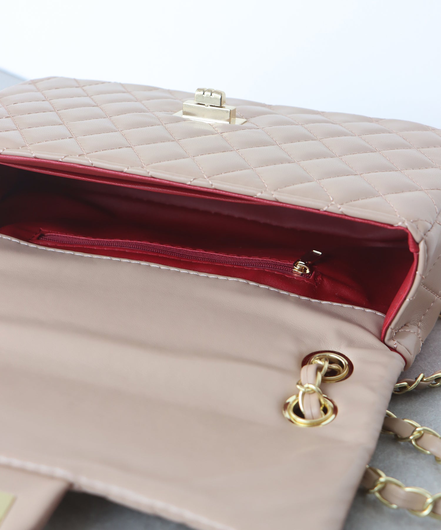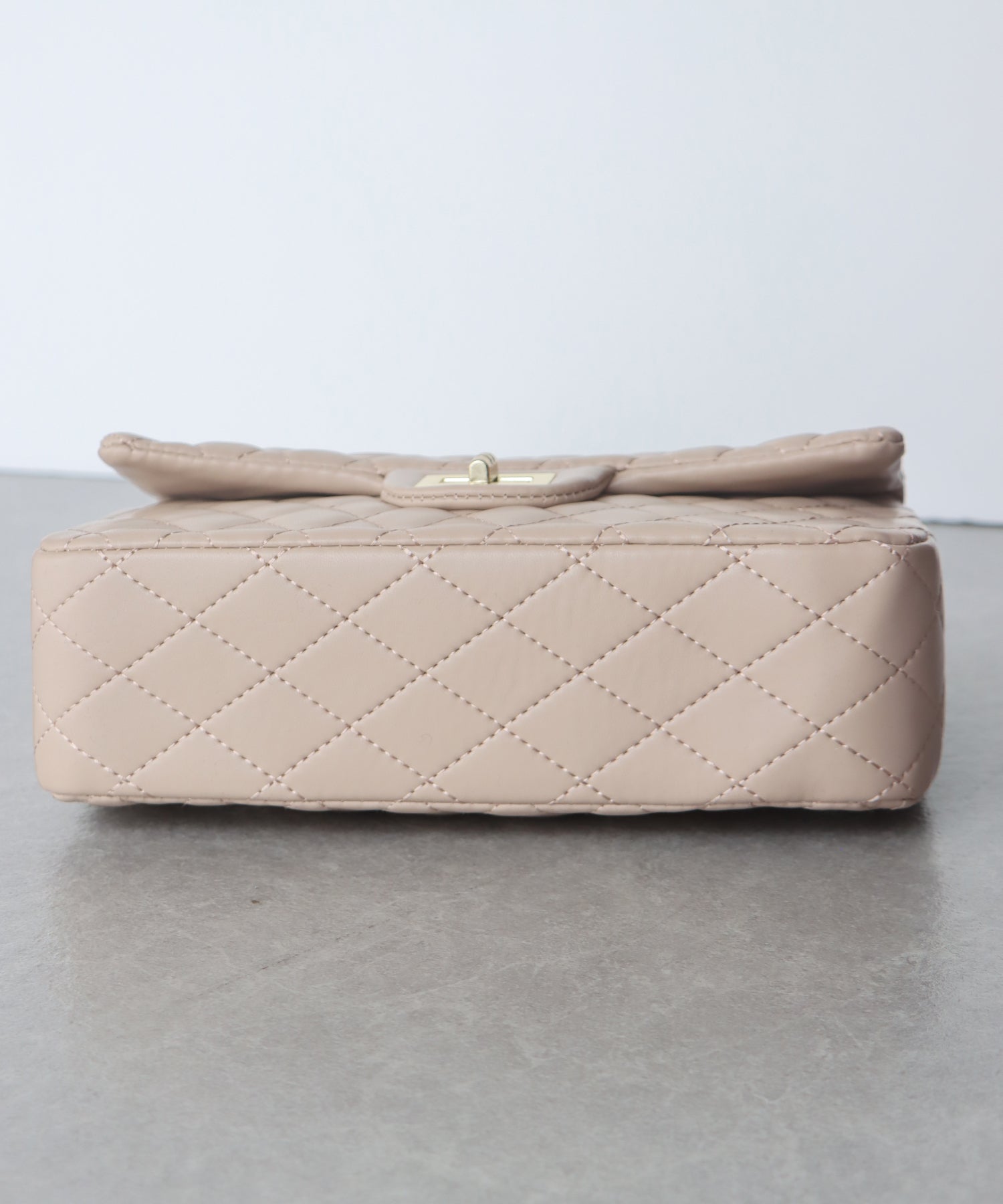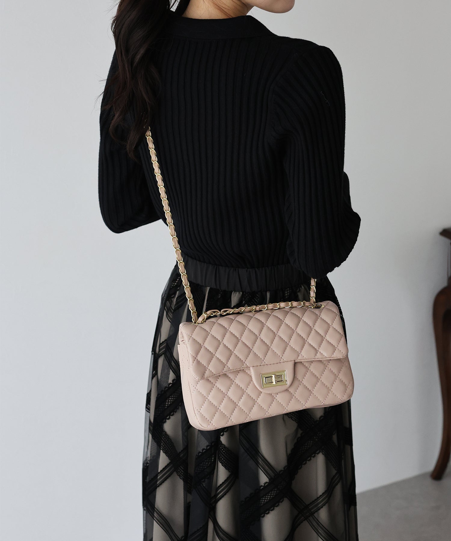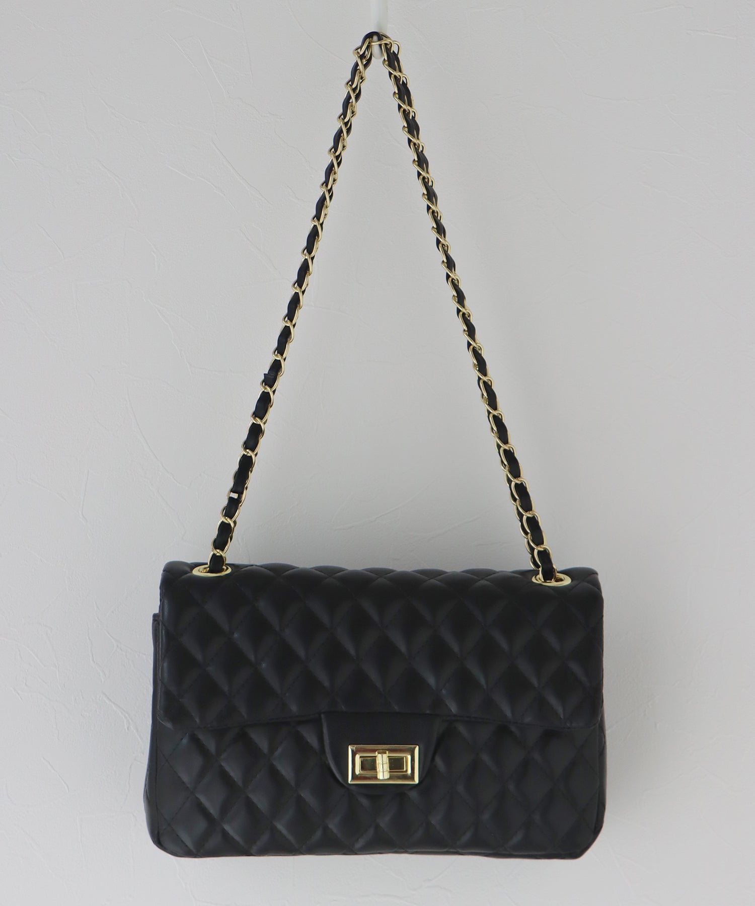 スタイリングのアクセントになるキルティングバッグ ?POINT チェーンショルダーが上品なフラップショルダーバッグ。 フェイクレザーのキルティングとゴールドチェーンが上品な印象。 チェーンを二重にするとショルダー、伸ばすと斜め掛けでお持ちいただける2WAY仕様です。 スマートフォン、財布やハンカチ、リップなど、お出掛けに必要なアイテムも入ります。 後ろにポケットが付いているので、さっと取り出したいICカードなどを入れていただくのに便利です。 シンプルなキルティングのデザインは1つ持っておくと重宝する、トレンドに左右されず長くお使いいただけるアイテムです。