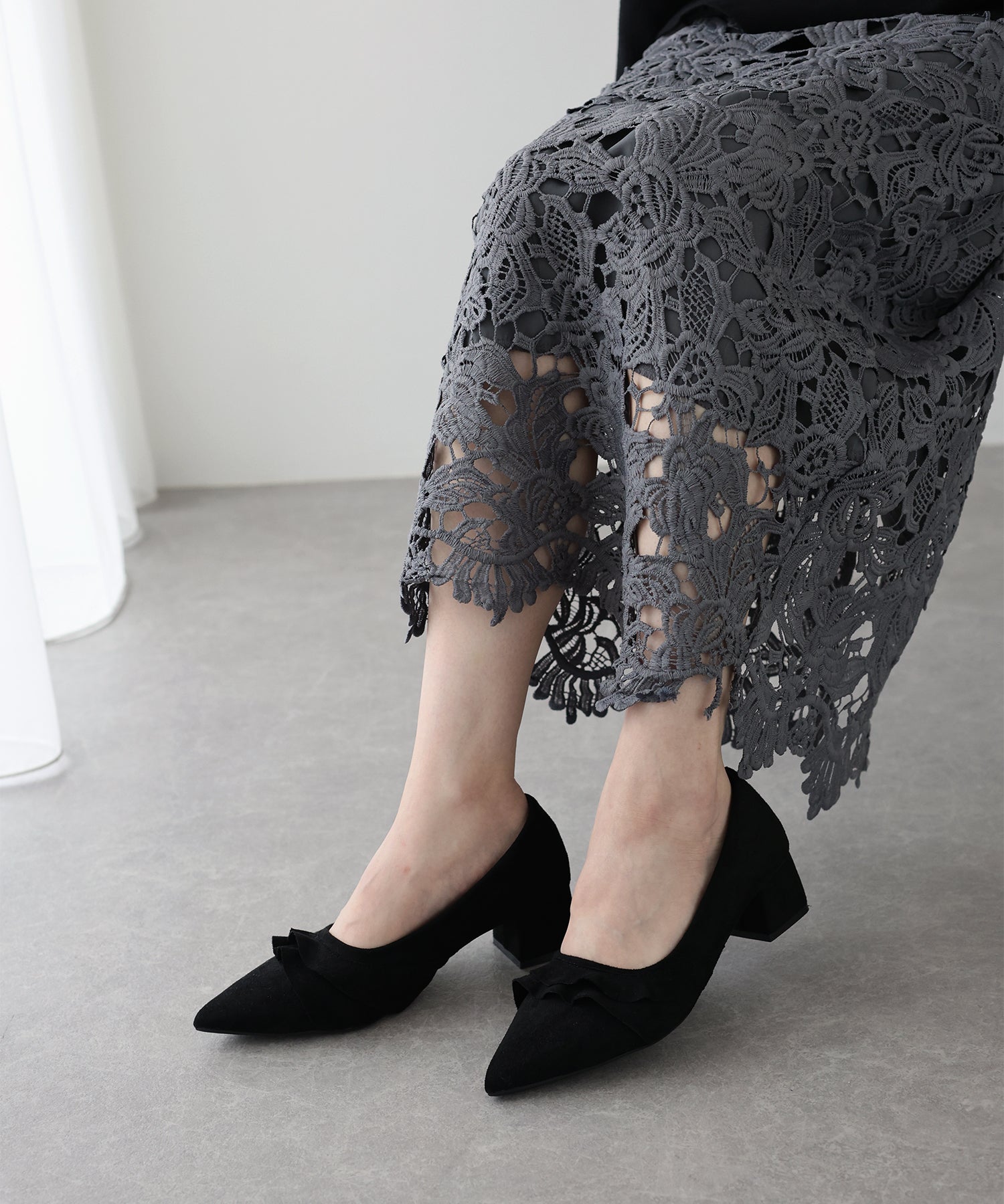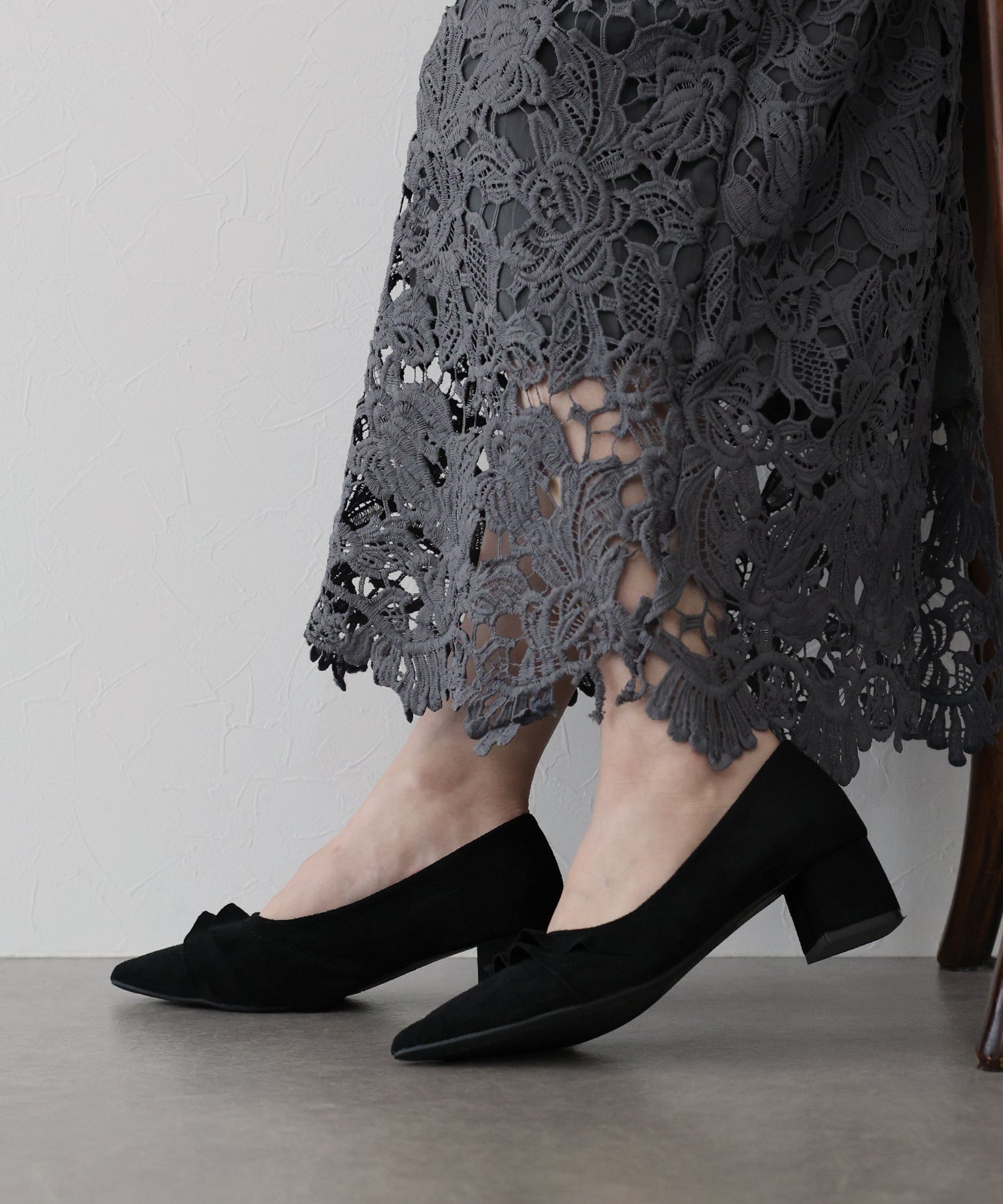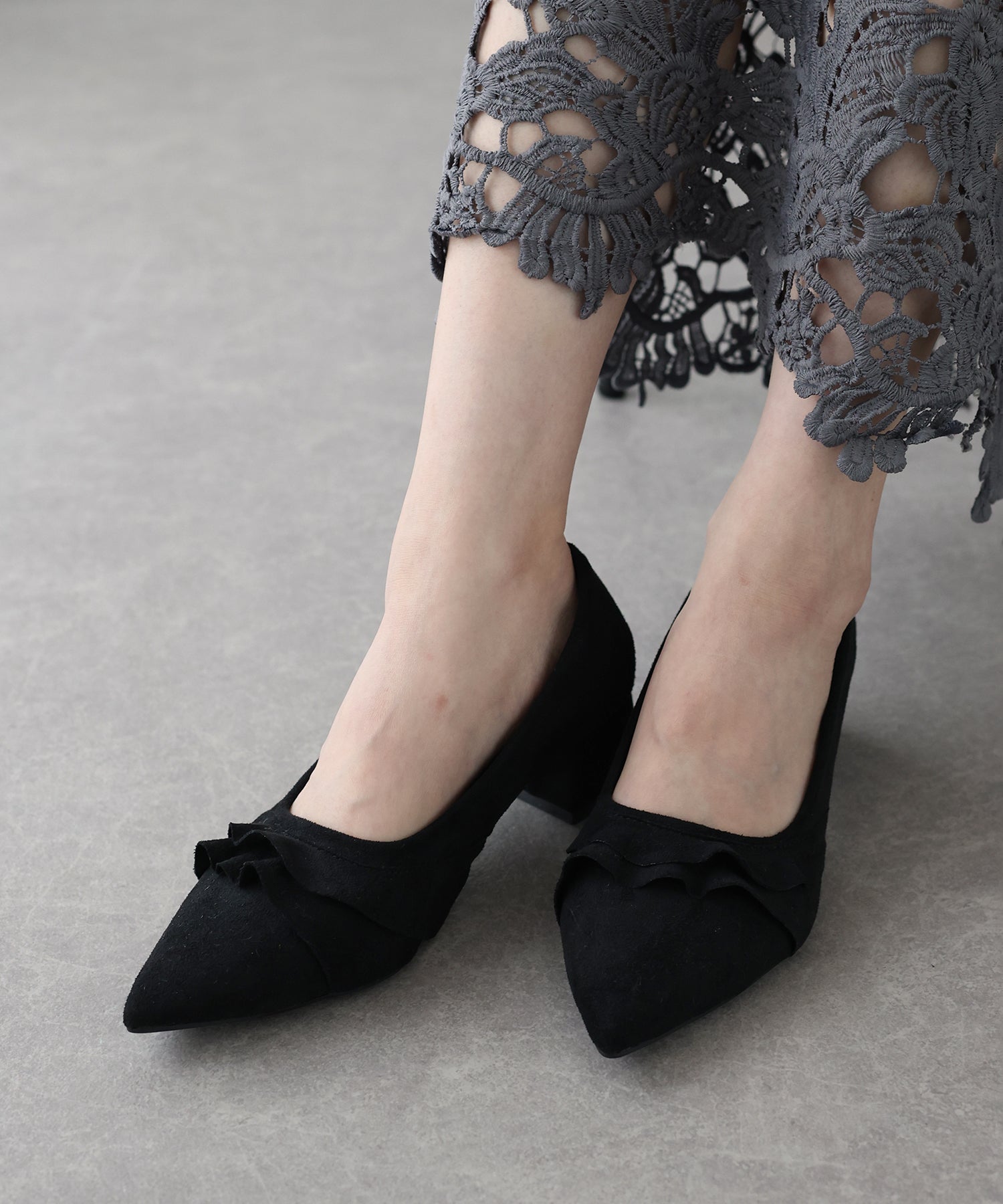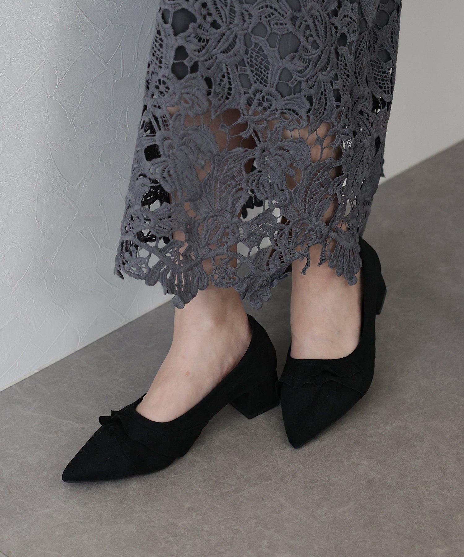 レースデザインがコーデのポイントになるパンプス ?POINT 立体感のあるレースがキュートでコーディネートにこなれ感を出してくれるパンプス。 すっきりとしたシルエットのポインテッドトゥで脚をより綺麗に見せます。 スウェード調素材が履くだけで秋冬のムードを高めてくれるシーズンライクなアイテムです。 クッション入りで、ボックスヒールなので安定感があり歩きやすいのもうれしいポイント◎ きれいめなデザインなので、デイリー使いだけでなく 通勤シューズとしてやオケージョンシーンにもぴったりです。
