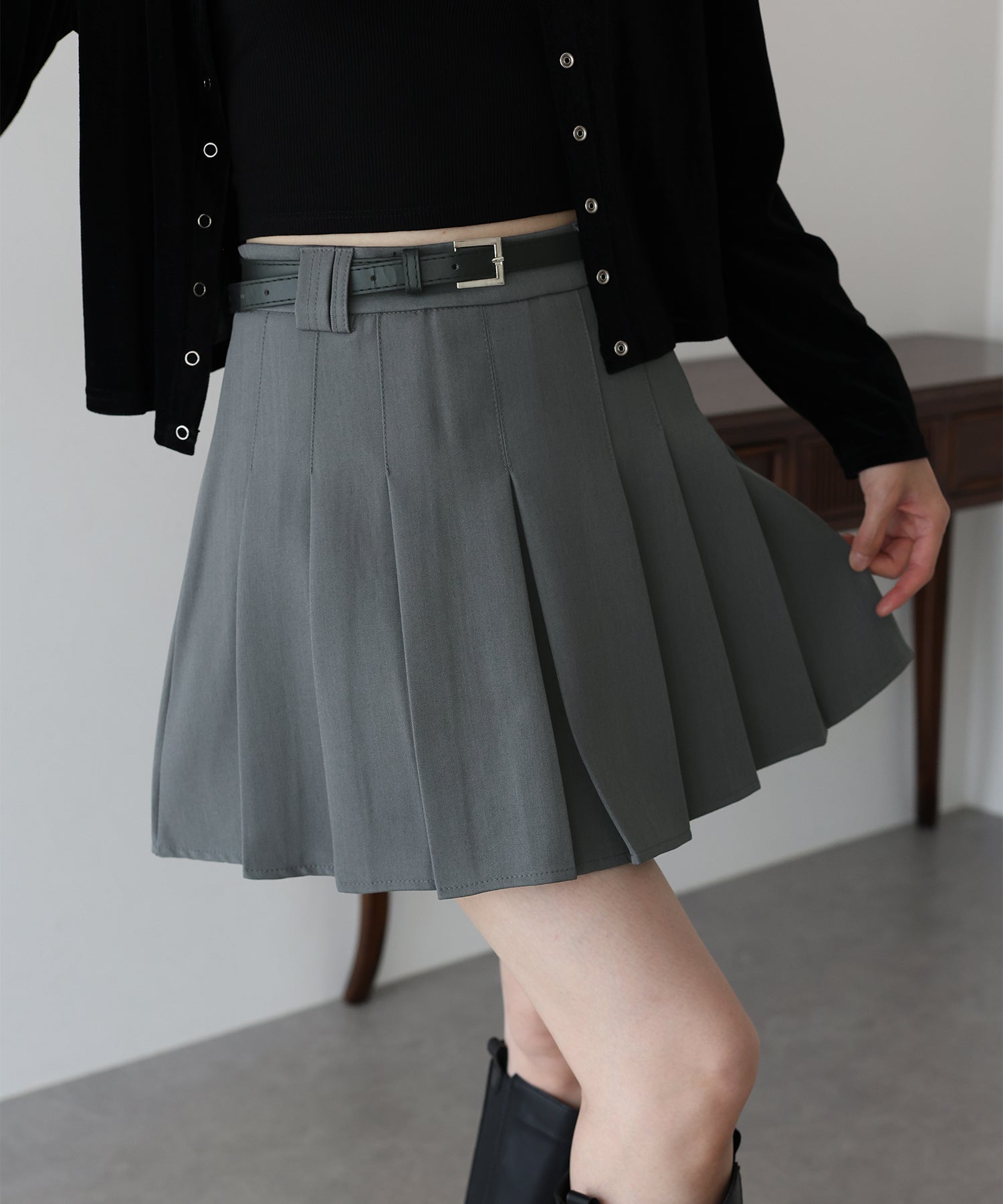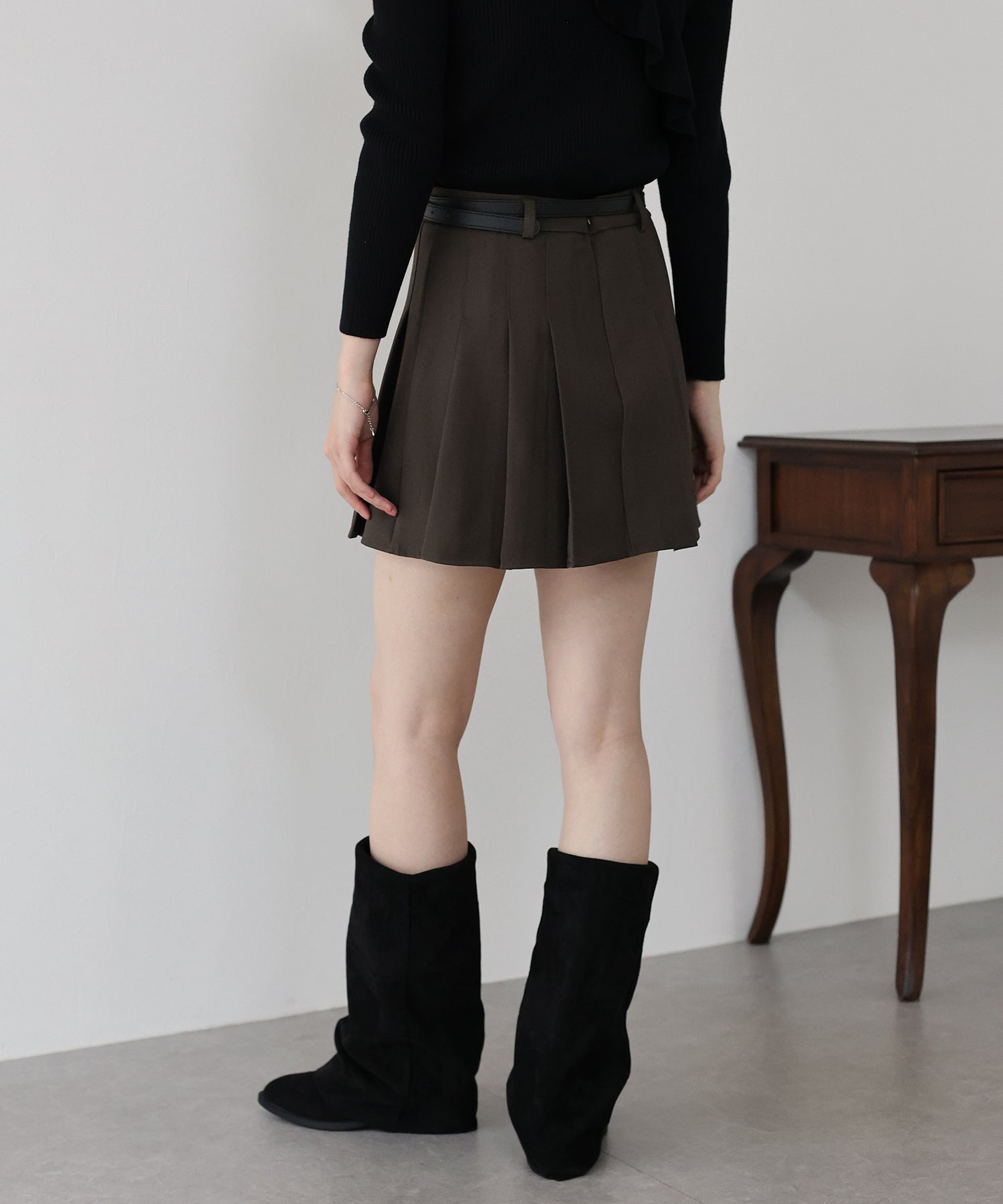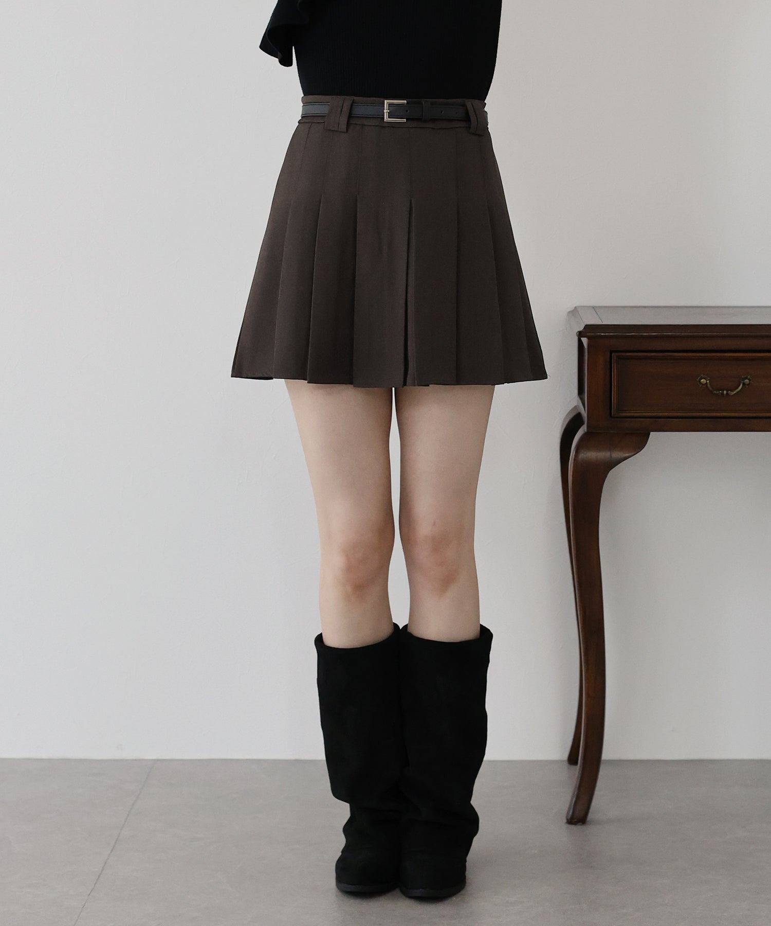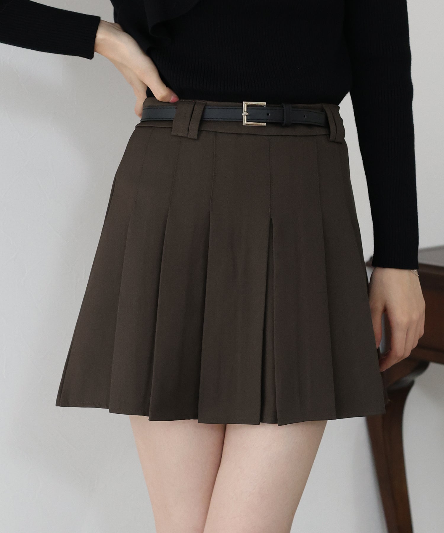 ガーリー×クラシックなミニプリーツスカート ?POINT 幅広なプリーツが今年らしいミニスカート。 Aラインに広がる太めのプリーツでスカートに動きを与え、クラシカル&上品な印象を与えます。 幅の異なるベルトループでさりげなくデザインをプラスしました。 腰回りと太ももの体形カバーをしてくれるので、メリハリが出てスタイリングアップ効果も◎ ベルトがセットになっているのでウエストサイズの微調整も可能です。 カットソーやシャツ、ニットまで幅広いトップスとスタイリングできるのでオールシーズン着回していただけます。