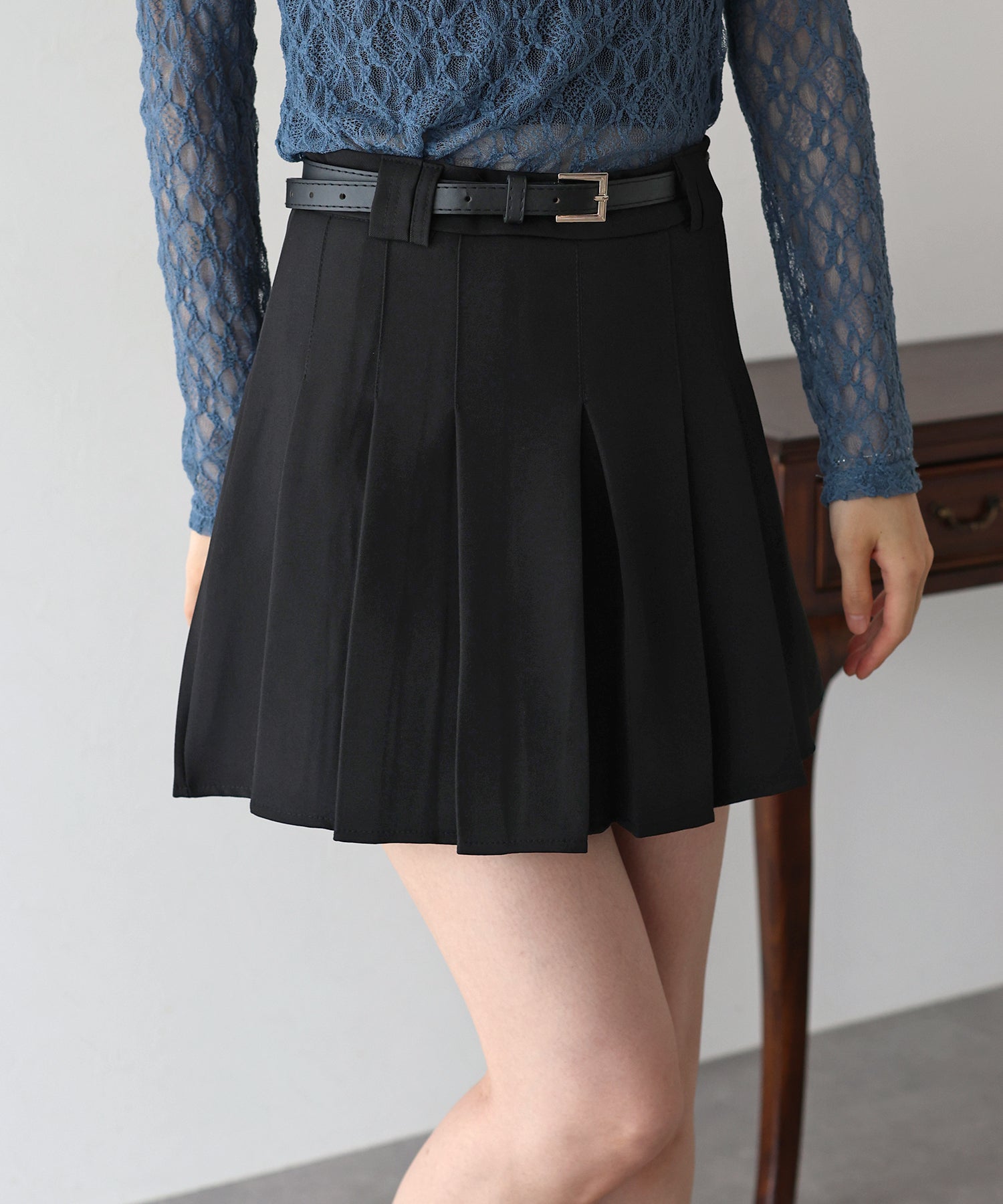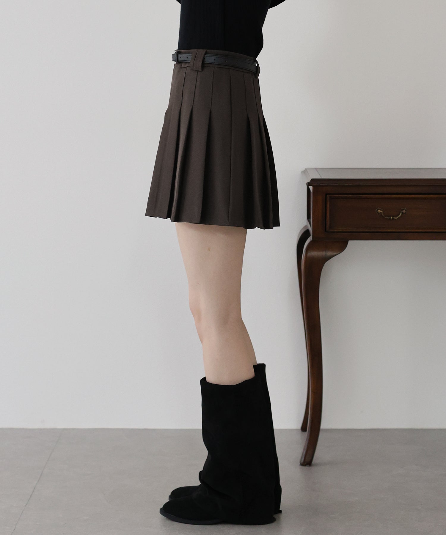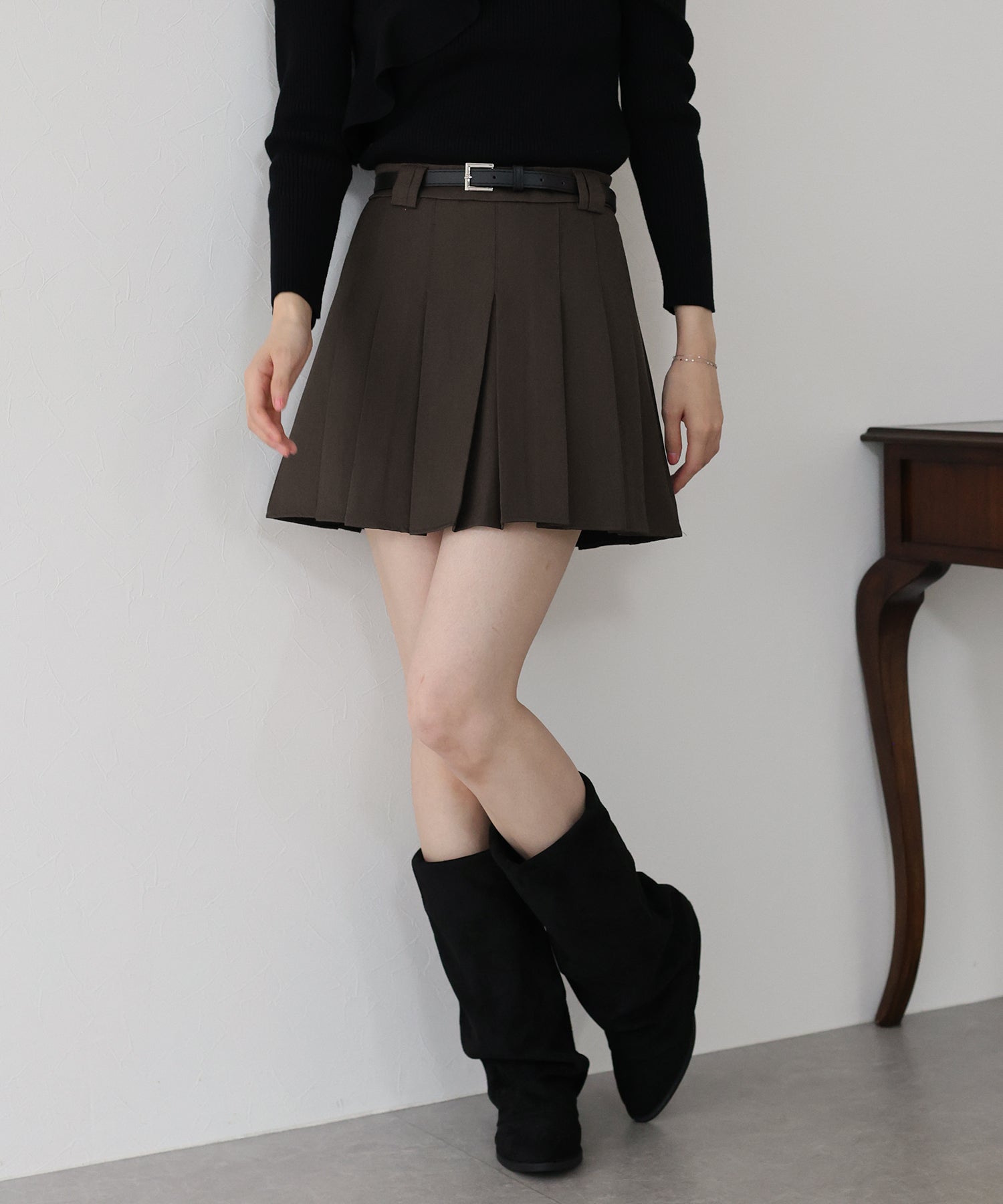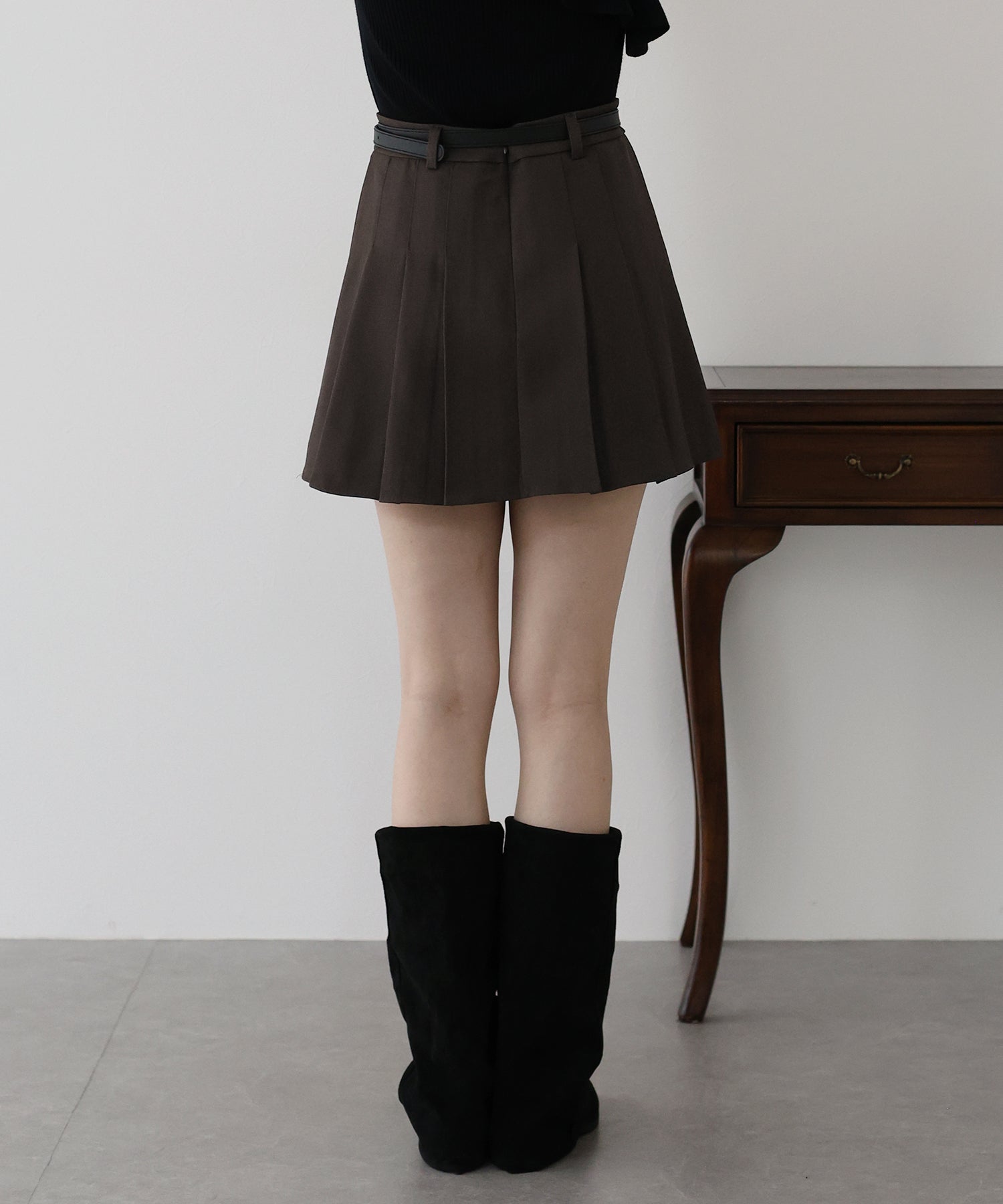 ガーリー×クラシックなミニプリーツスカート ?POINT 幅広なプリーツが今年らしいミニスカート。 Aラインに広がる太めのプリーツでスカートに動きを与え、クラシカル&上品な印象を与えます。 幅の異なるベルトループでさりげなくデザインをプラスしました。 腰回りと太ももの体形カバーをしてくれるので、メリハリが出てスタイリングアップ効果も◎ ベルトがセットになっているのでウエストサイズの微調整も可能です。 カットソーやシャツ、ニットまで幅広いトップスとスタイリングできるのでオールシーズン着回していただけます。