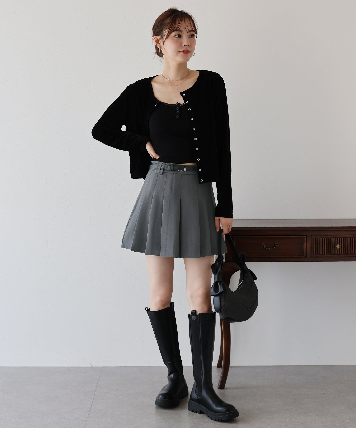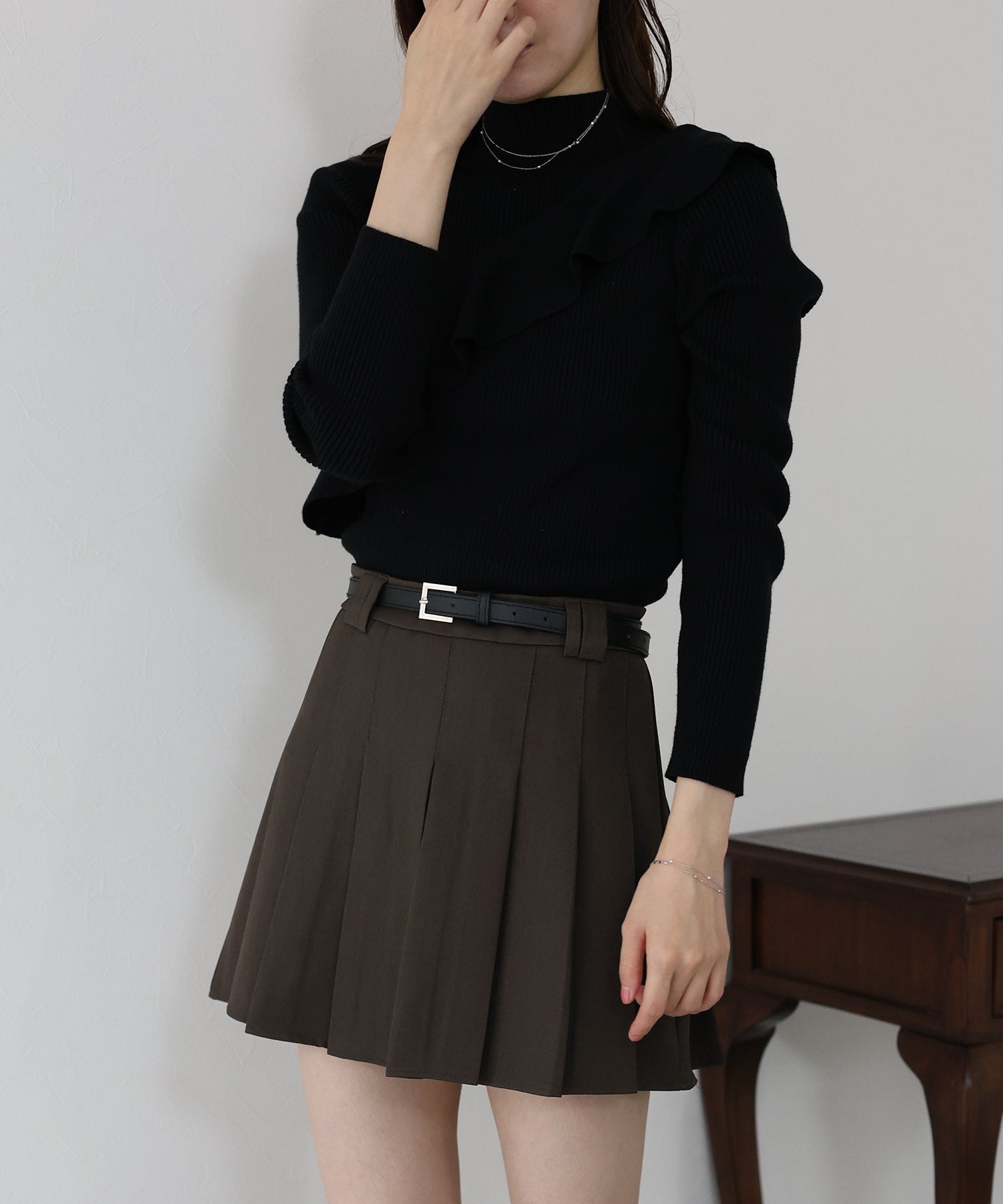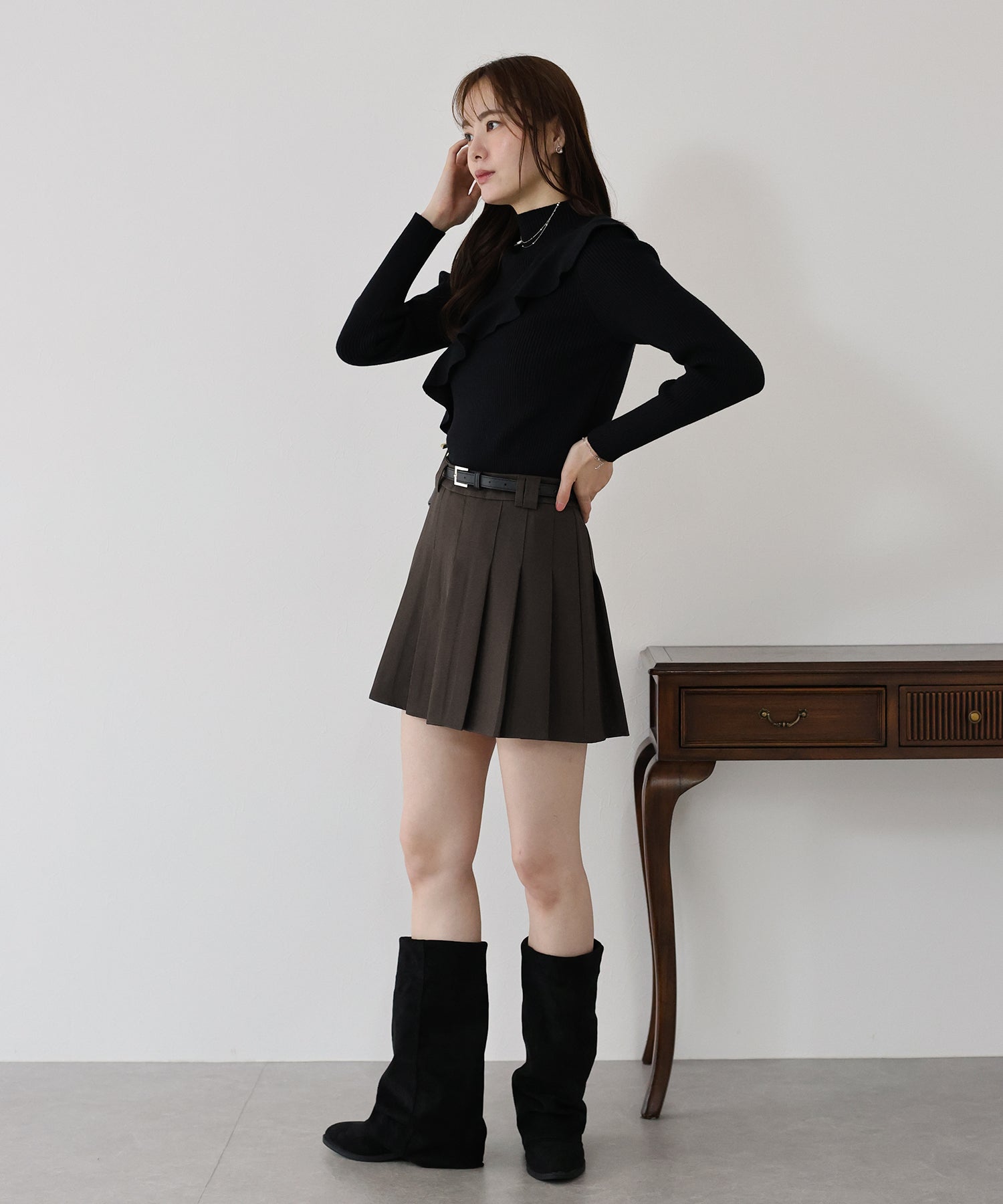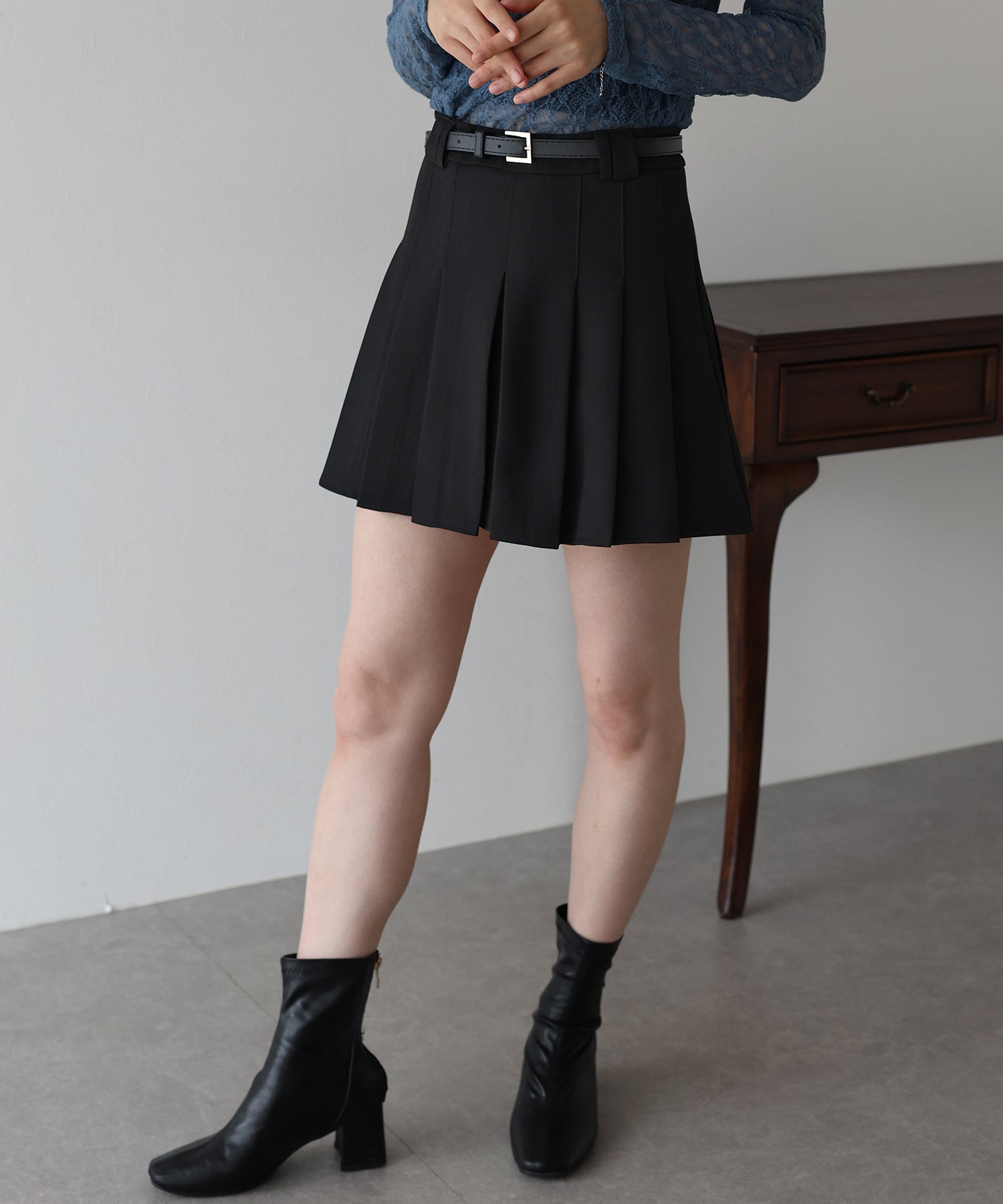 ガーリー×クラシックなミニプリーツスカート ?POINT 幅広なプリーツが今年らしいミニスカート。 Aラインに広がる太めのプリーツでスカートに動きを与え、クラシカル&上品な印象を与えます。 幅の異なるベルトループでさりげなくデザインをプラスしました。 腰回りと太ももの体形カバーをしてくれるので、メリハリが出てスタイリングアップ効果も◎ ベルトがセットになっているのでウエストサイズの微調整も可能です。 カットソーやシャツ、ニットまで幅広いトップスとスタイリングできるのでオールシーズン着回していただけます。