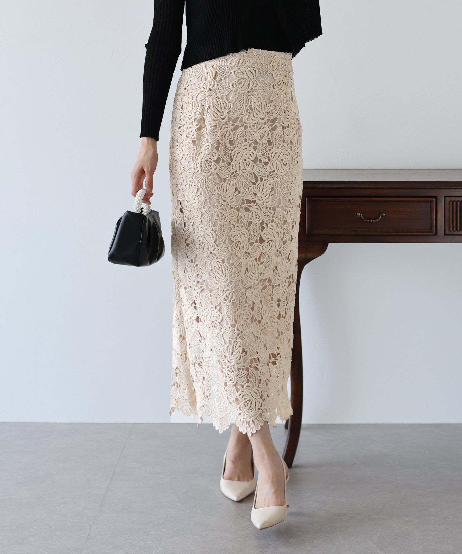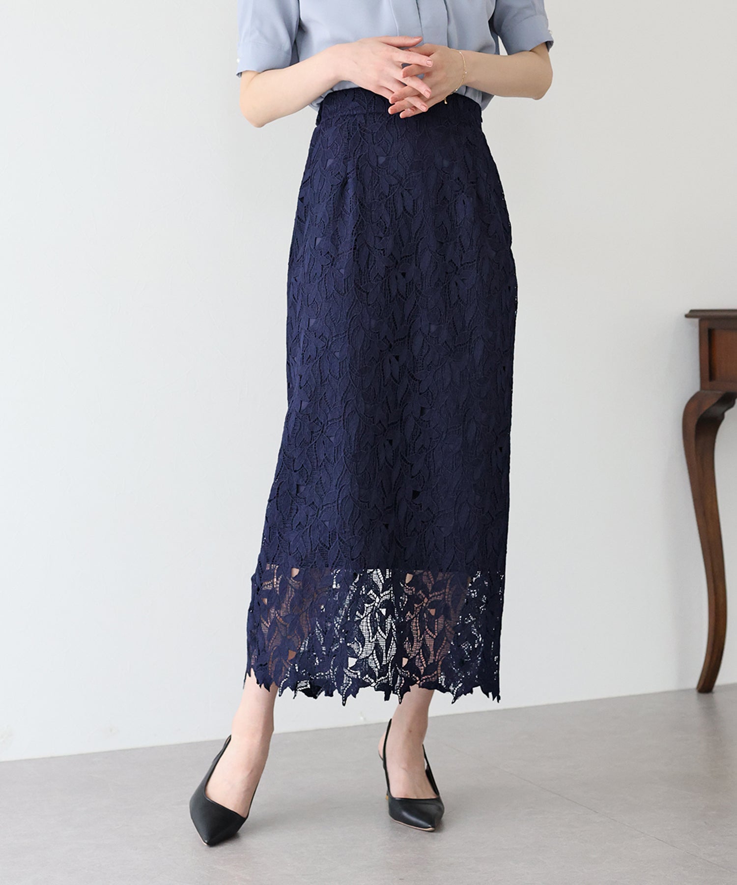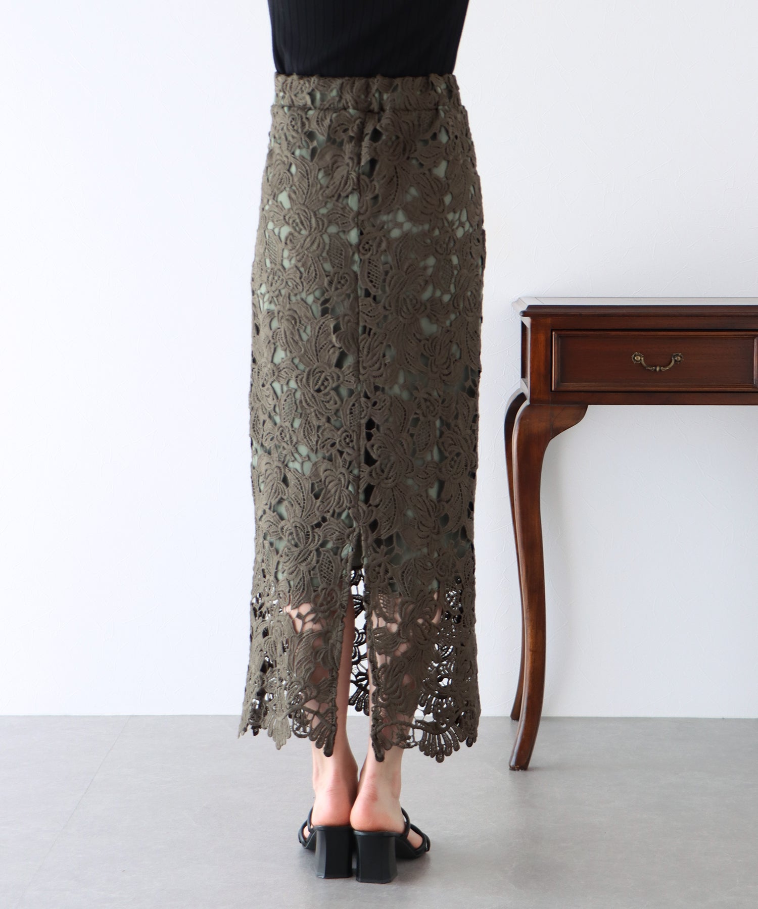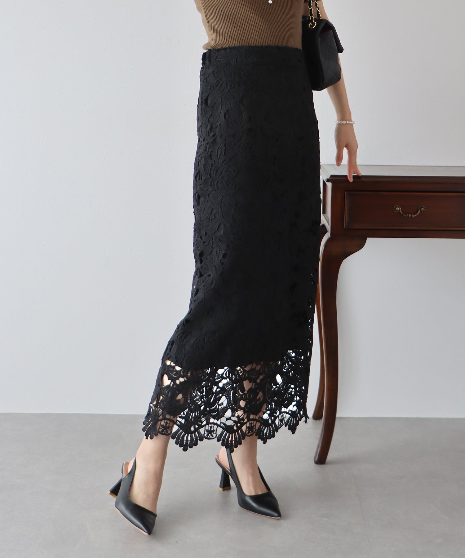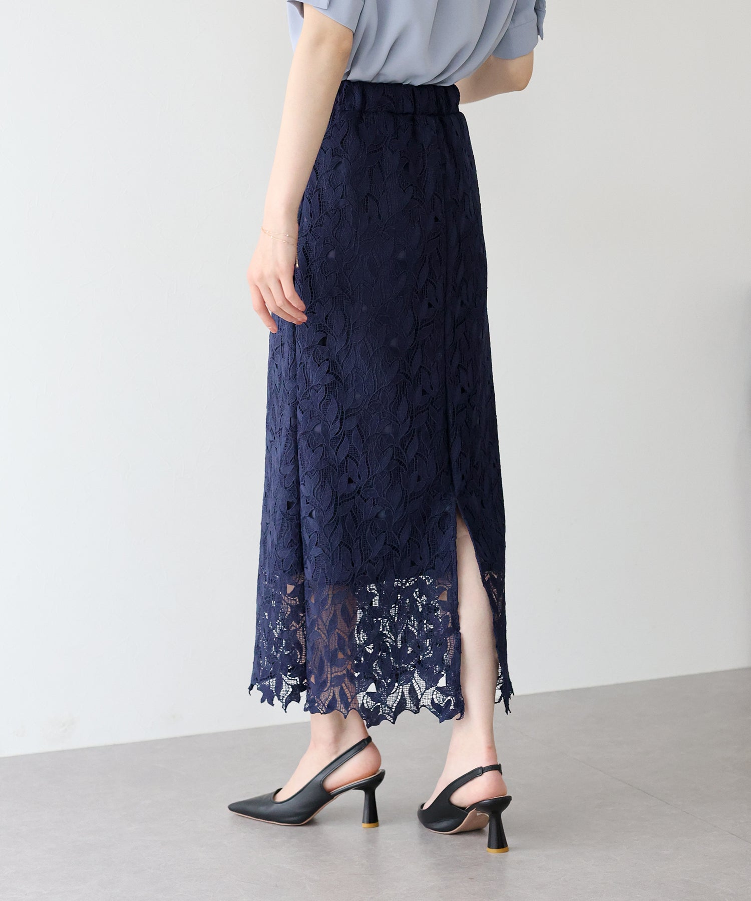 ?POINT 大人っぽく着こなせるタイトラインの総レーススカート。 ウエストはゴムが入っているので着心地も良く、 すっきりとしたIライン&ハイウエストで美脚効果&腰回りのラインもカバーしてくれます。 裾はレースの雰囲気を活かした透け感のあるスカラップで軽やかな足元に。ON/OFF問わず着まわせる万能アイテムです。