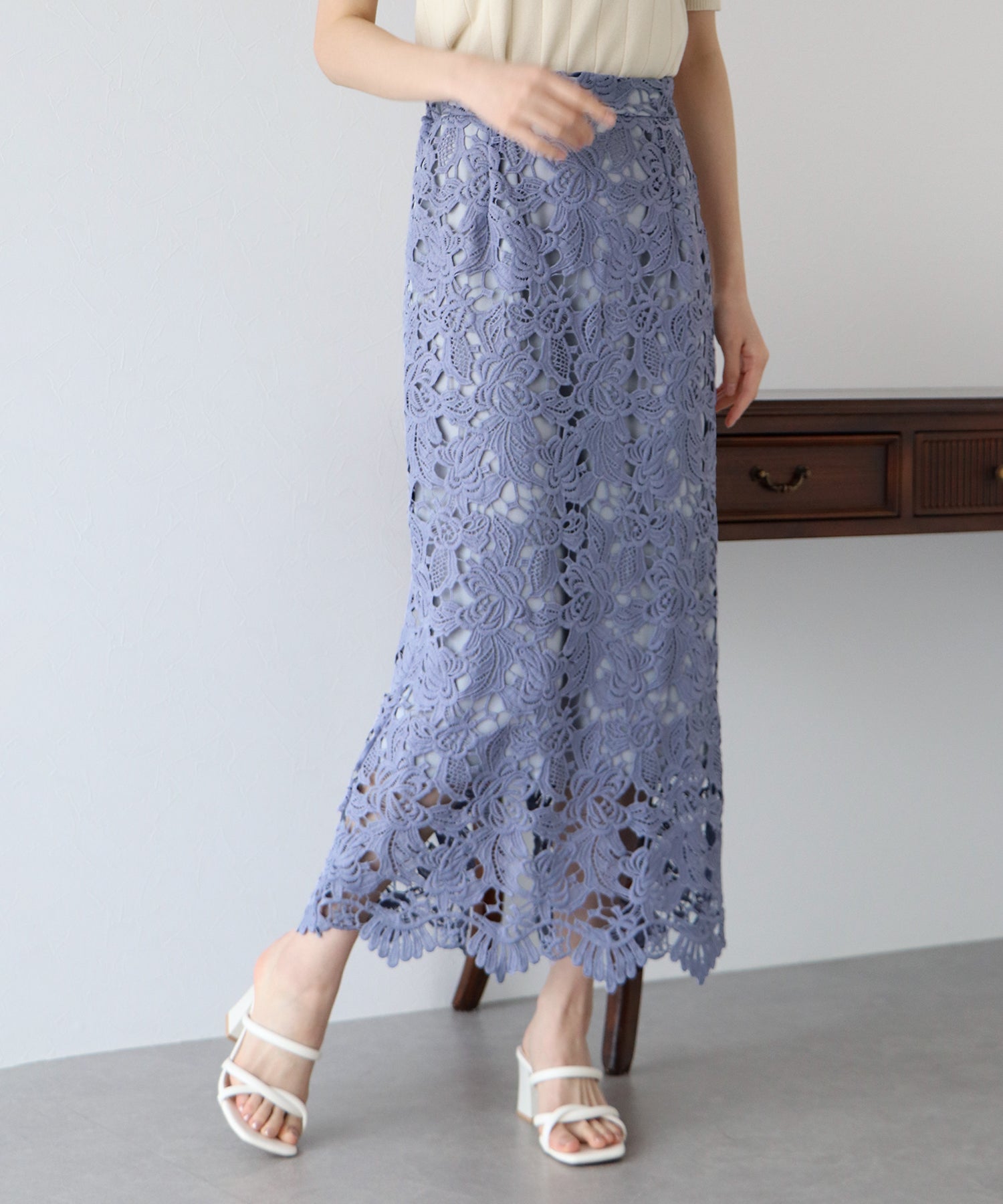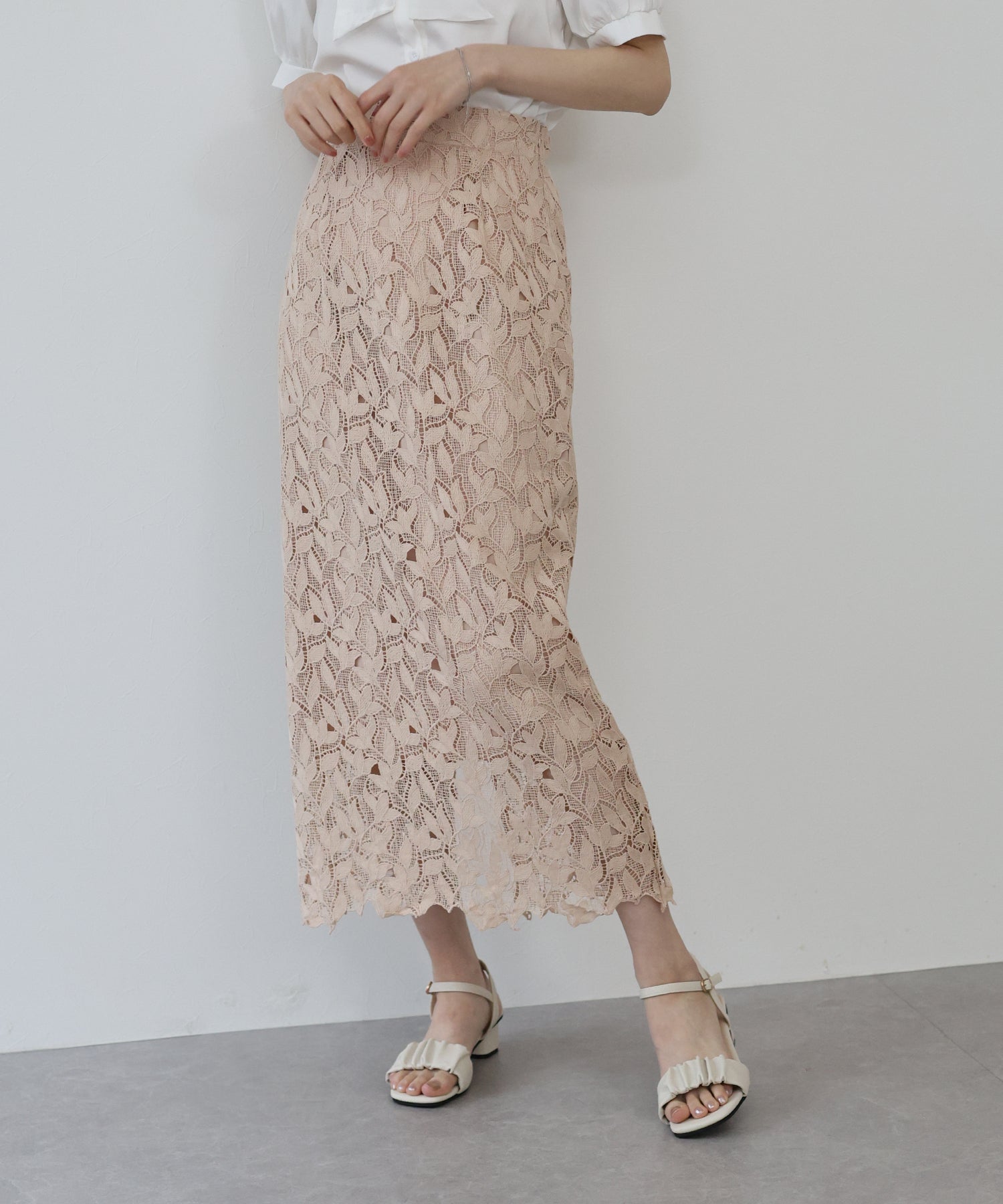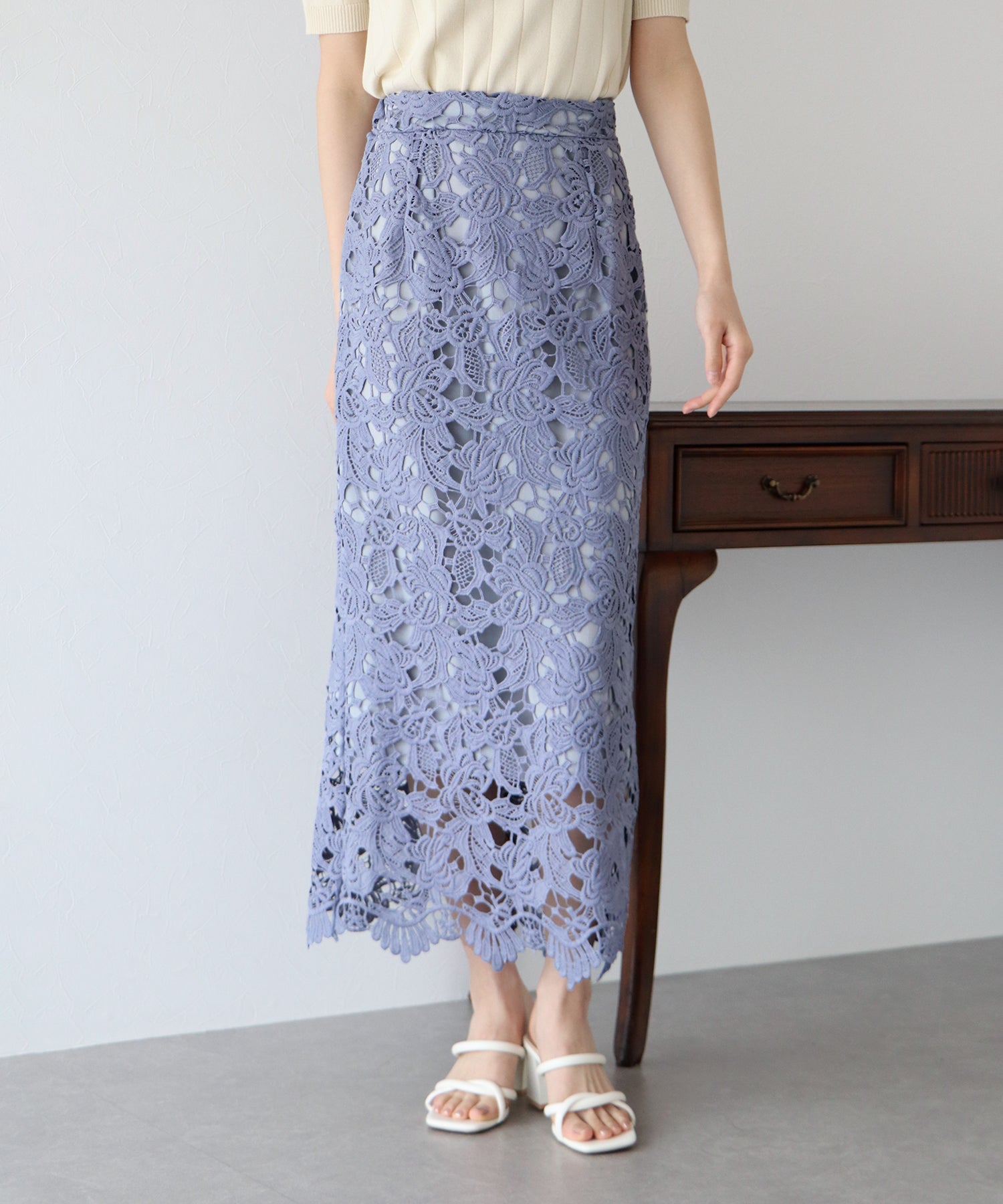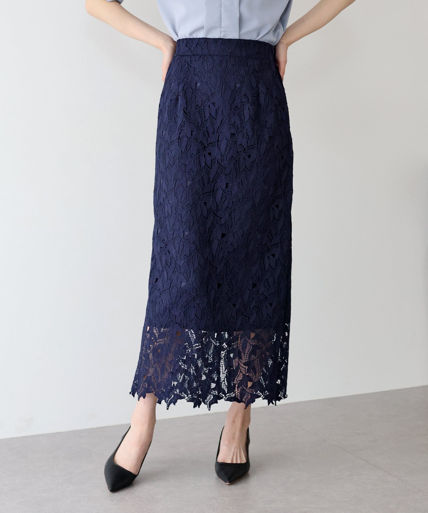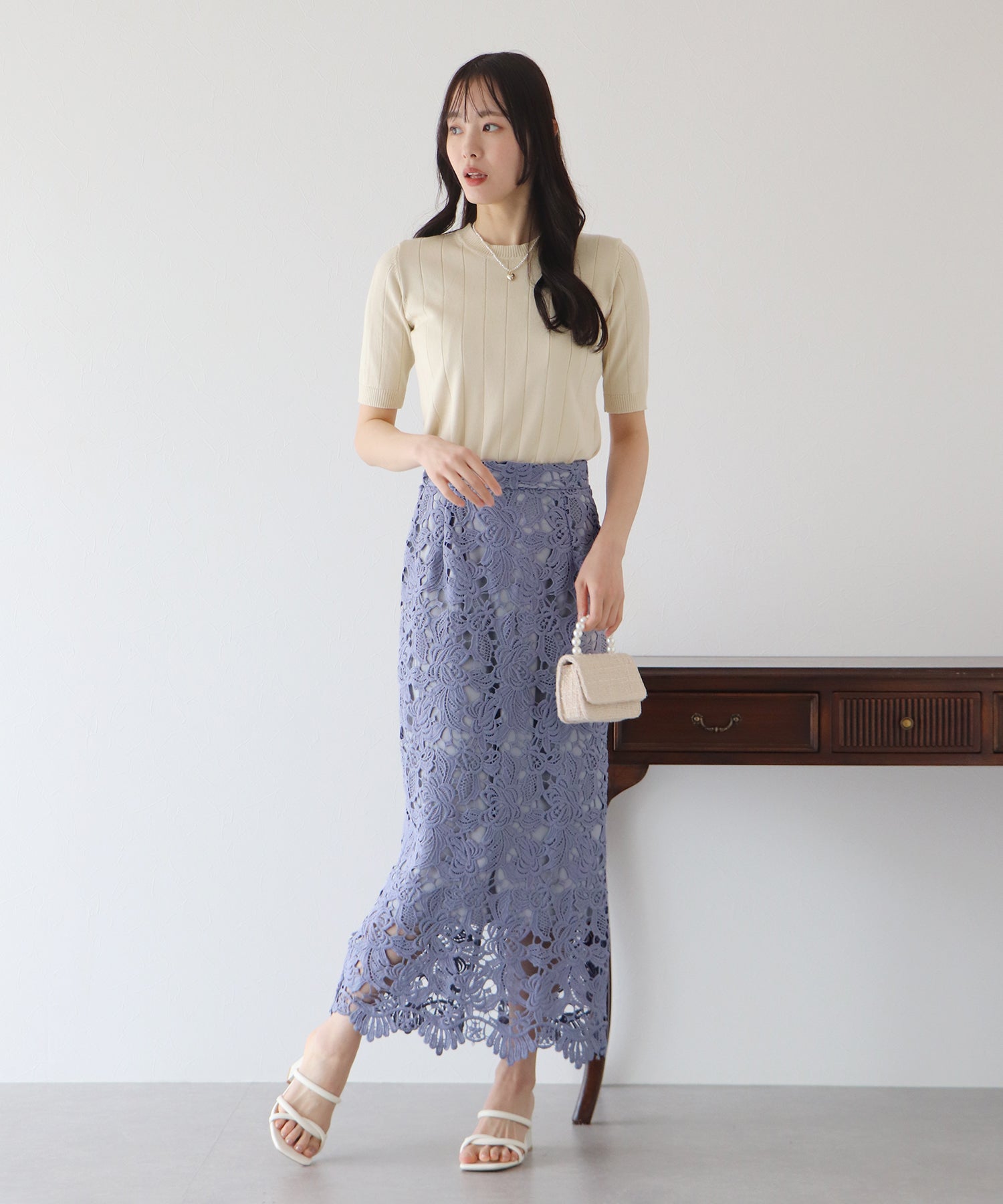 ?POINT 大人っぽく着こなせるタイトラインの総レーススカート。 ウエストはゴムが入っているので着心地も良く、 すっきりとしたIライン&ハイウエストで美脚効果&腰回りのラインもカバーしてくれます。 裾はレースの雰囲気を活かした透け感のあるスカラップで軽やかな足元に。ON/OFF問わず着まわせる万能アイテムです。